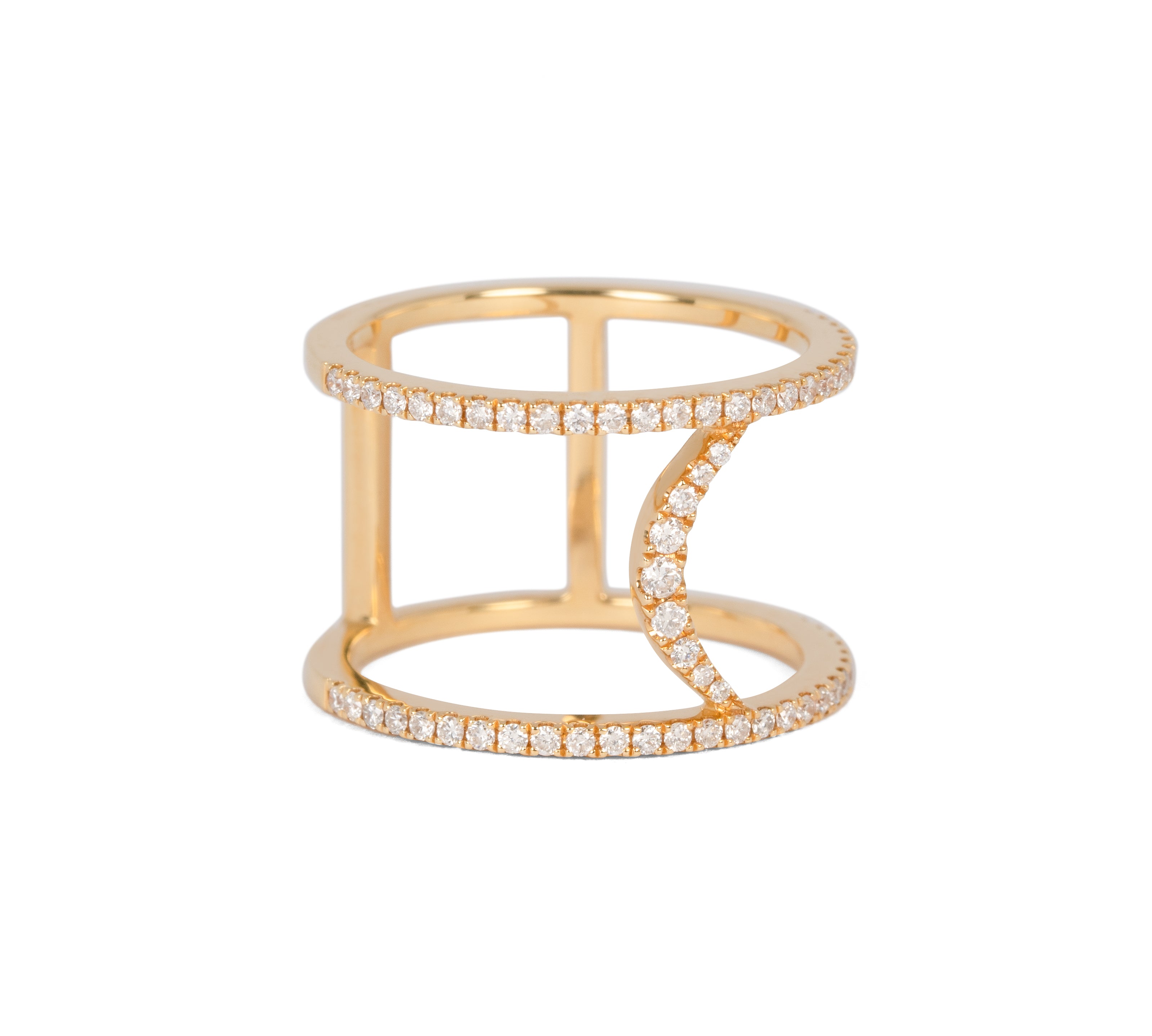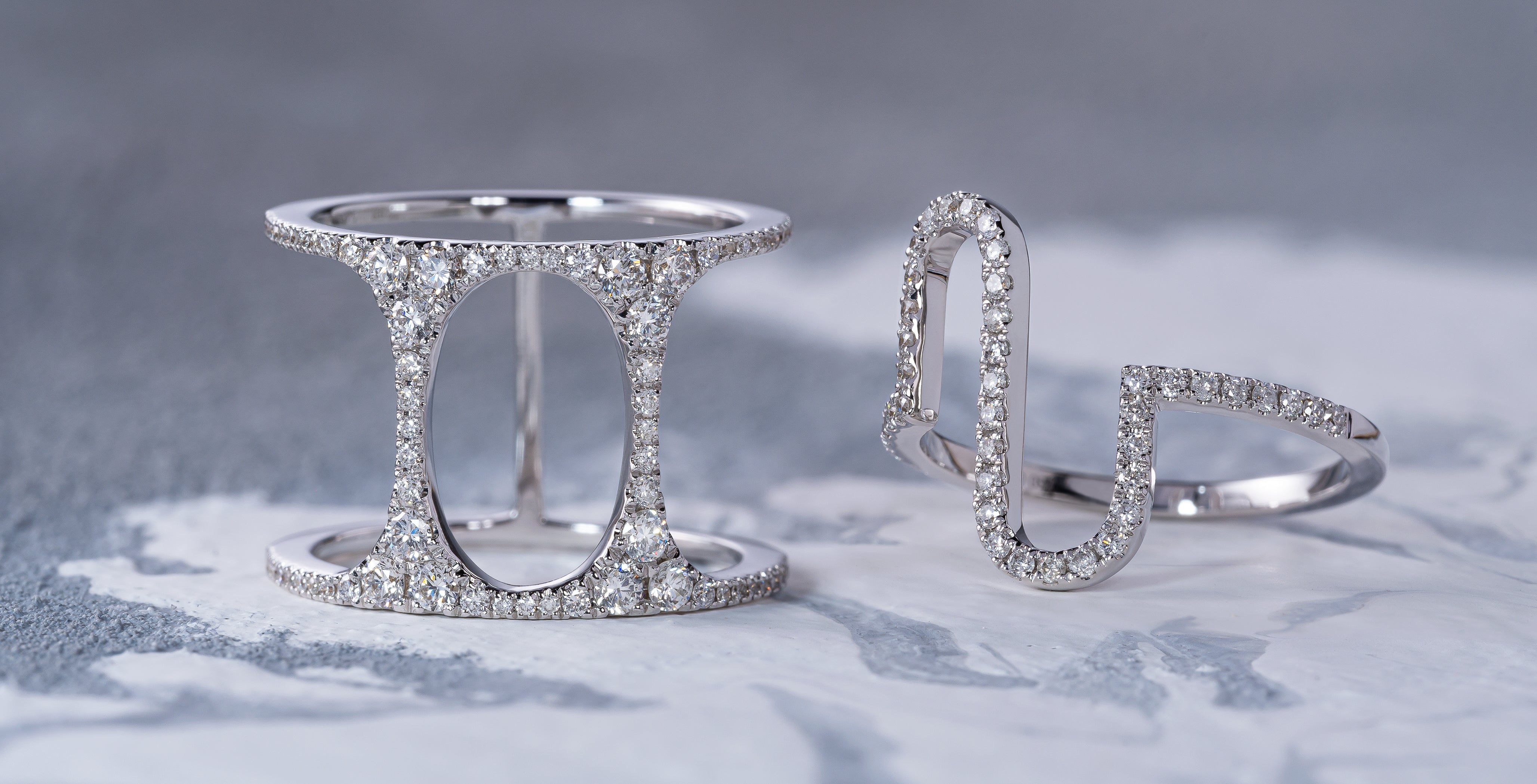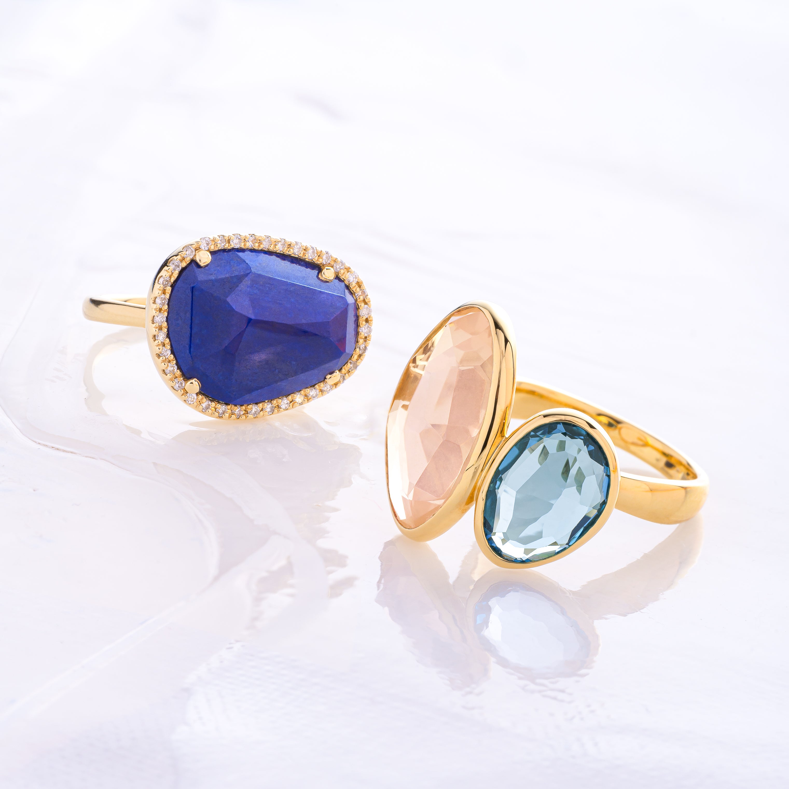 ファンシーカットの宝石を2石使用してデザインしたリングコレクション。ルビーやダイヤモンドなどの貴石を使用しながら、デイリーに身につけていただけるモダンで抜け感のあるデザインに仕立てました。