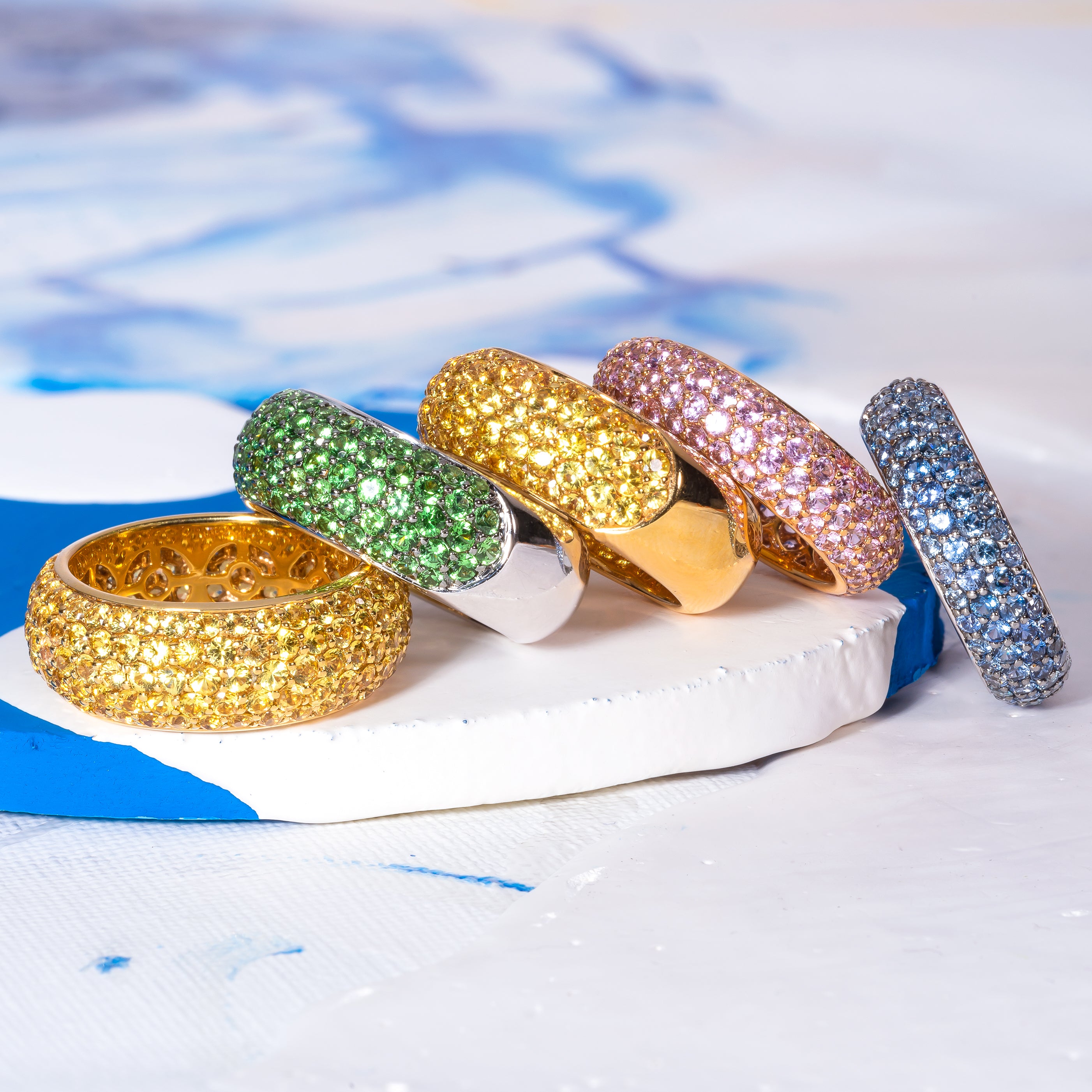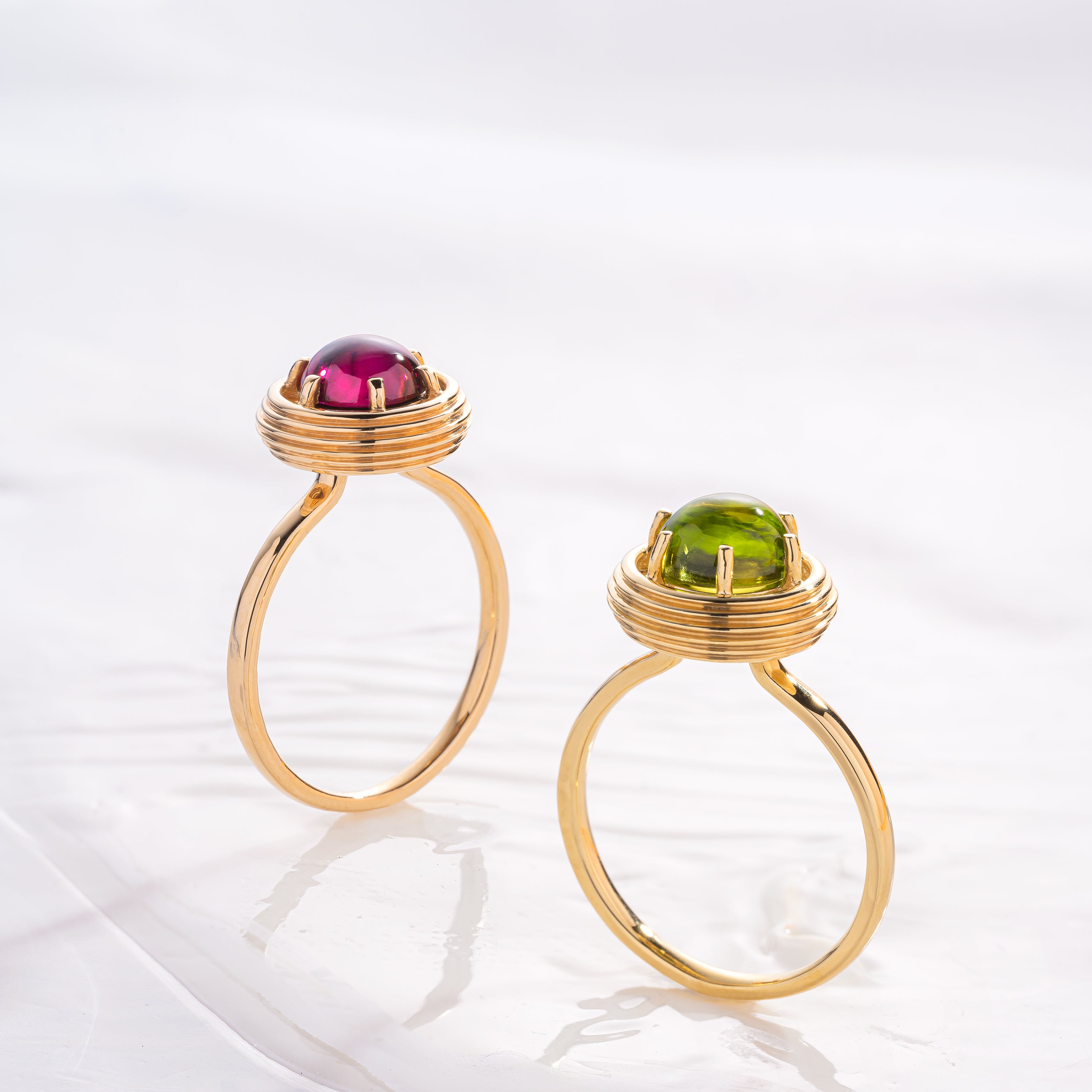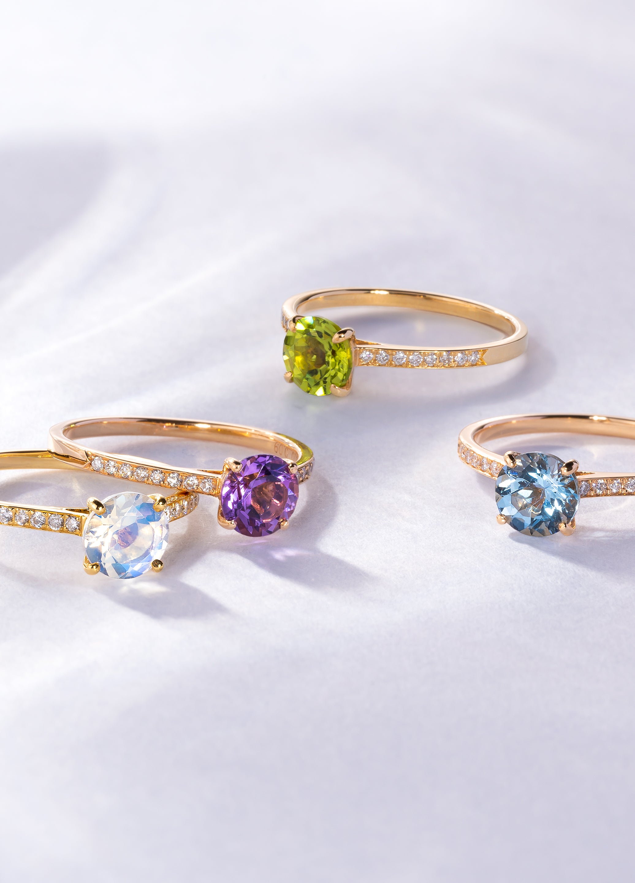 正面から見ると吸い込まれそうな美しいラウンドカットのカラーストーン。 その宝石たちが主役として輝くよう、丁寧に仕立てたリングです。 ジュエリーとしての美しさと、幼少期に心ときめかせたキャンディーを思わせる楽しさが共存します。