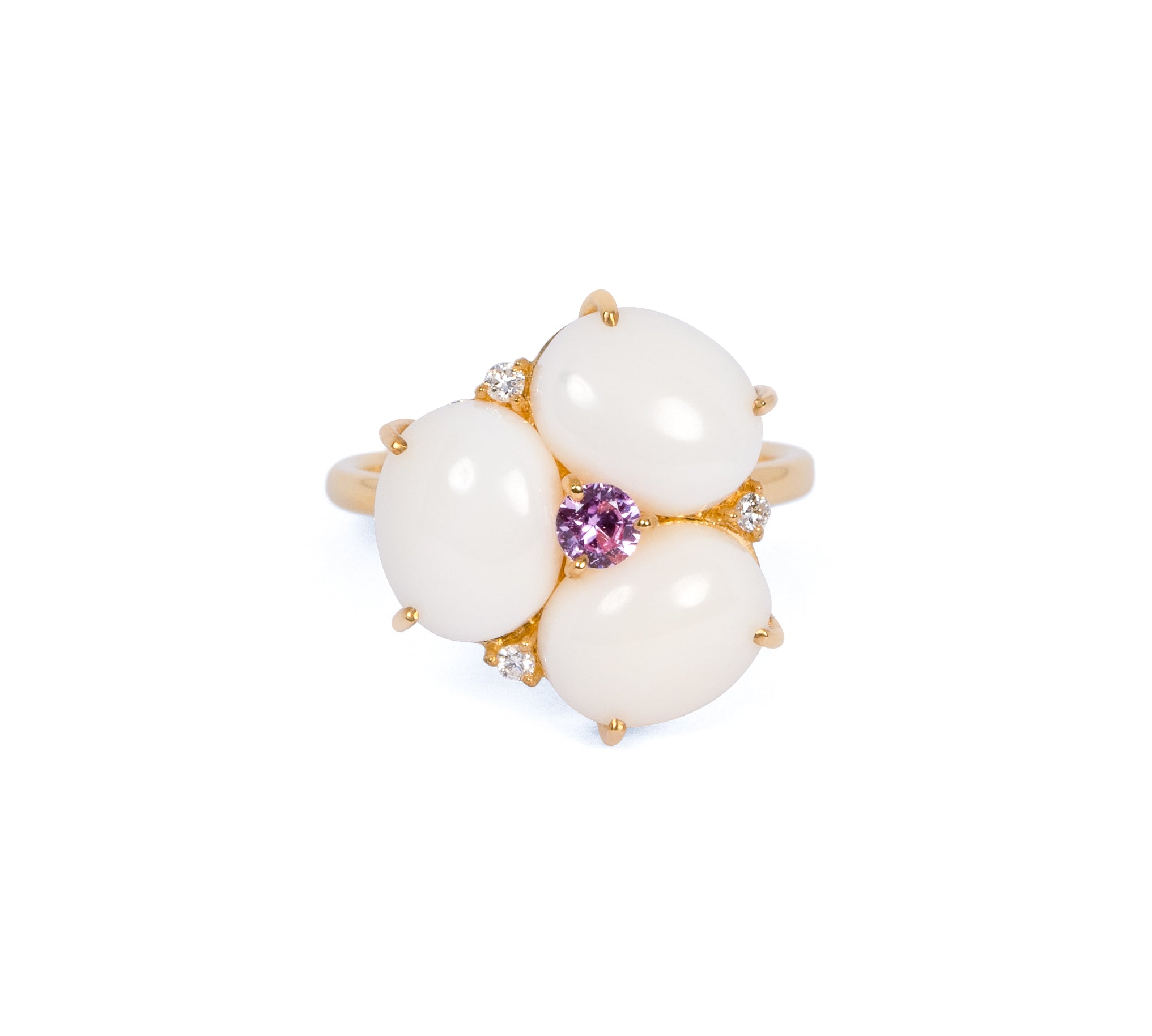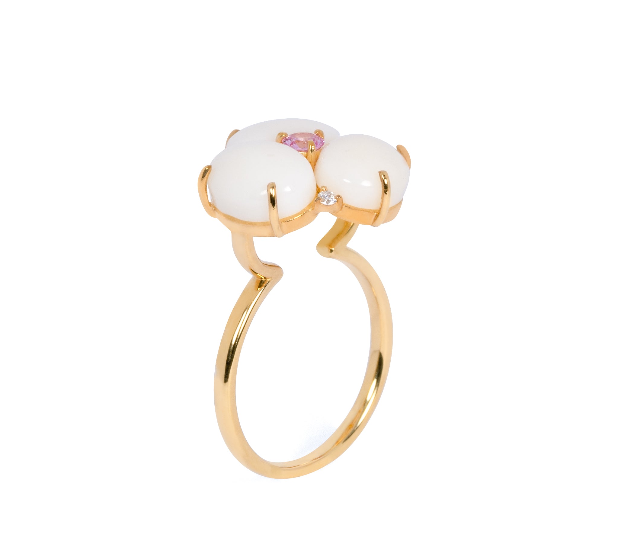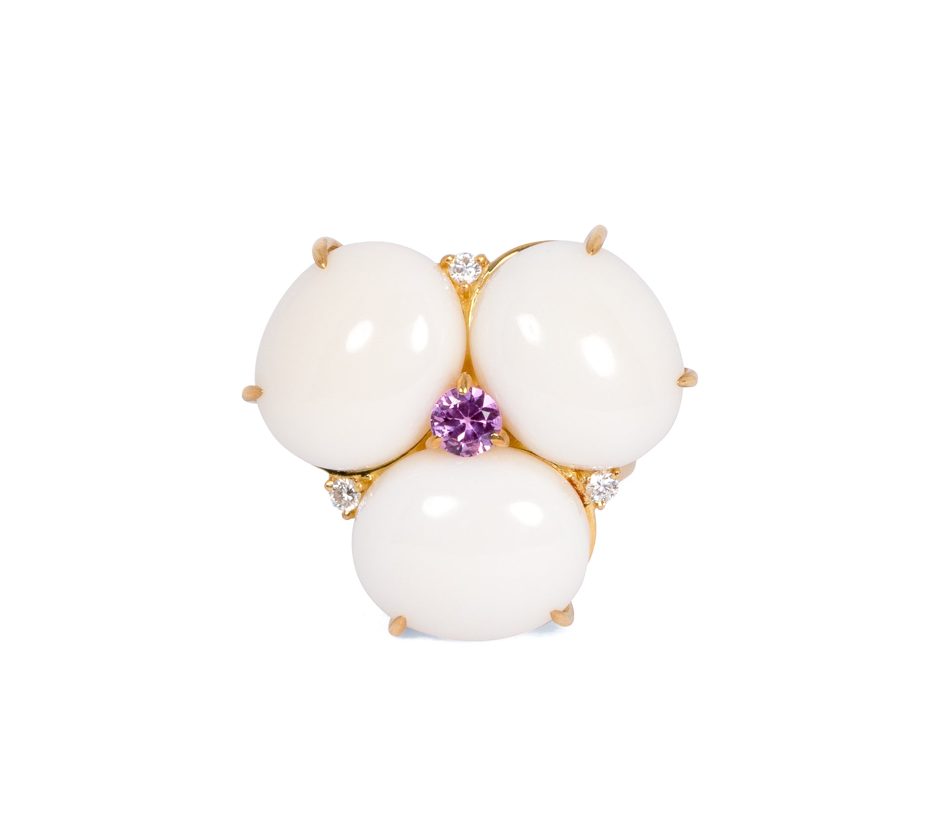 正面から見ると吸い込まれそうな美しいラウンドカットのカラーストーン。 その宝石たちが主役として輝くよう、丁寧に仕立てたリングです。 ジュエリーとしての美しさと、幼少期に心ときめかせたキャンディーを思わせる楽しさが共存します。