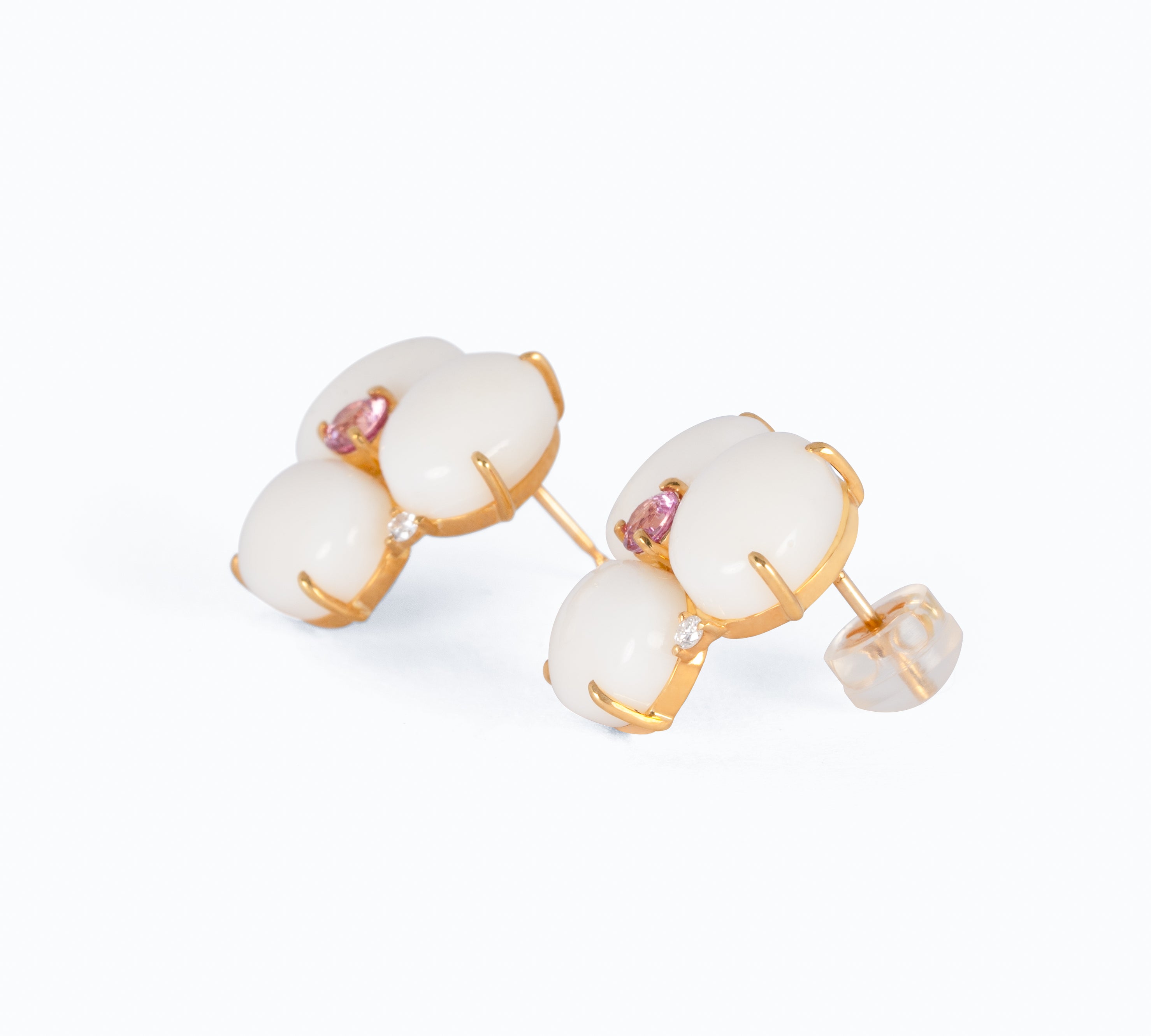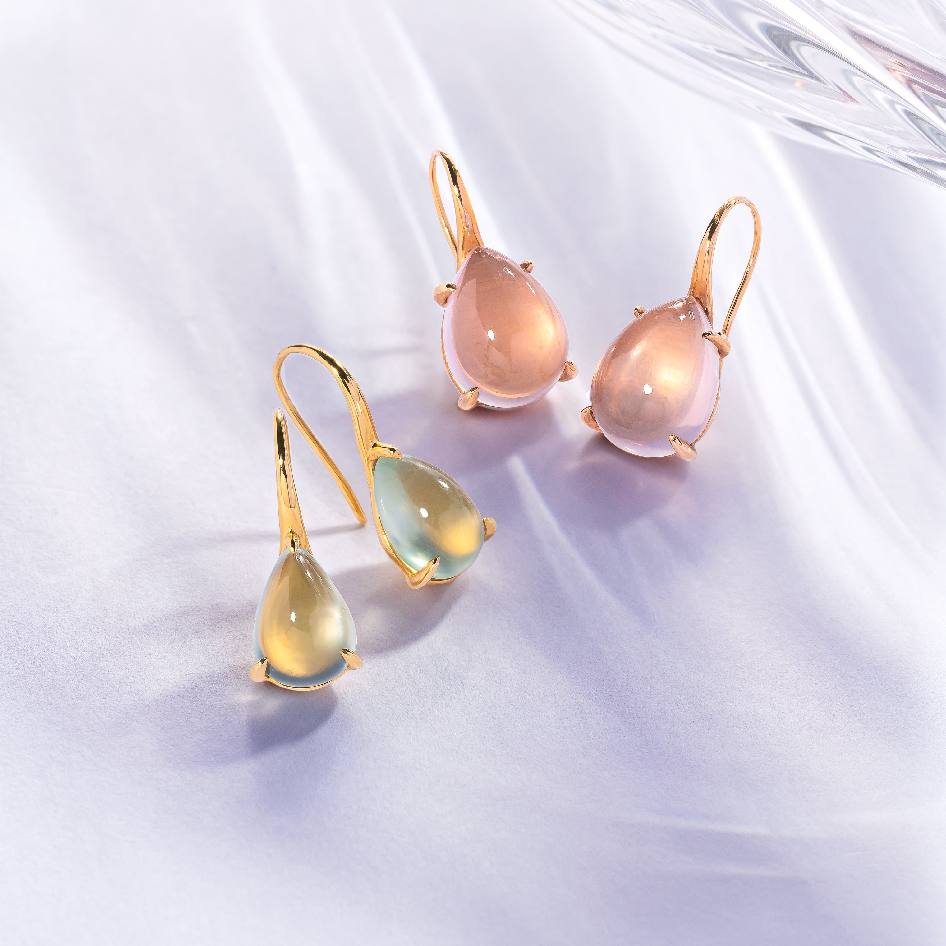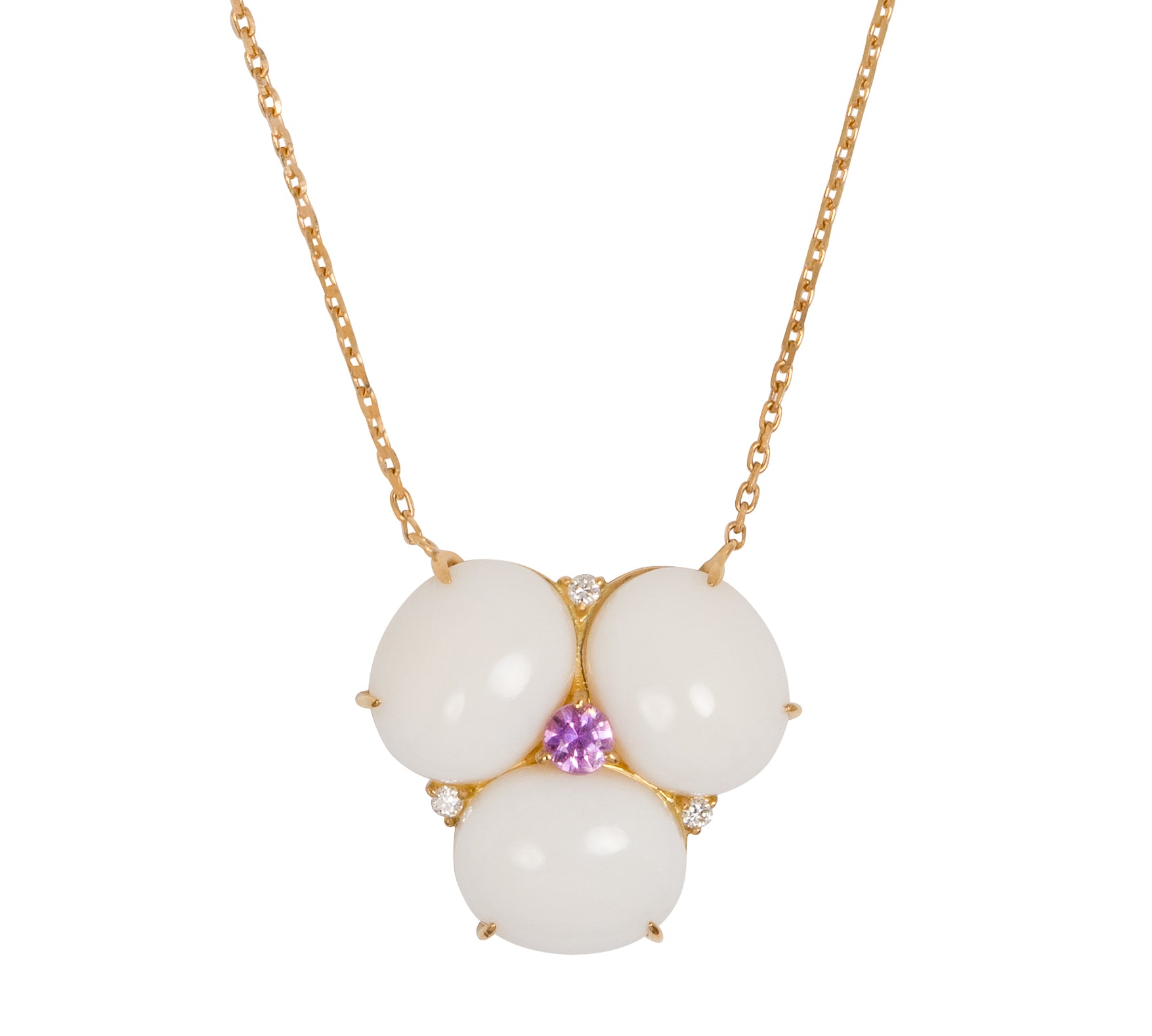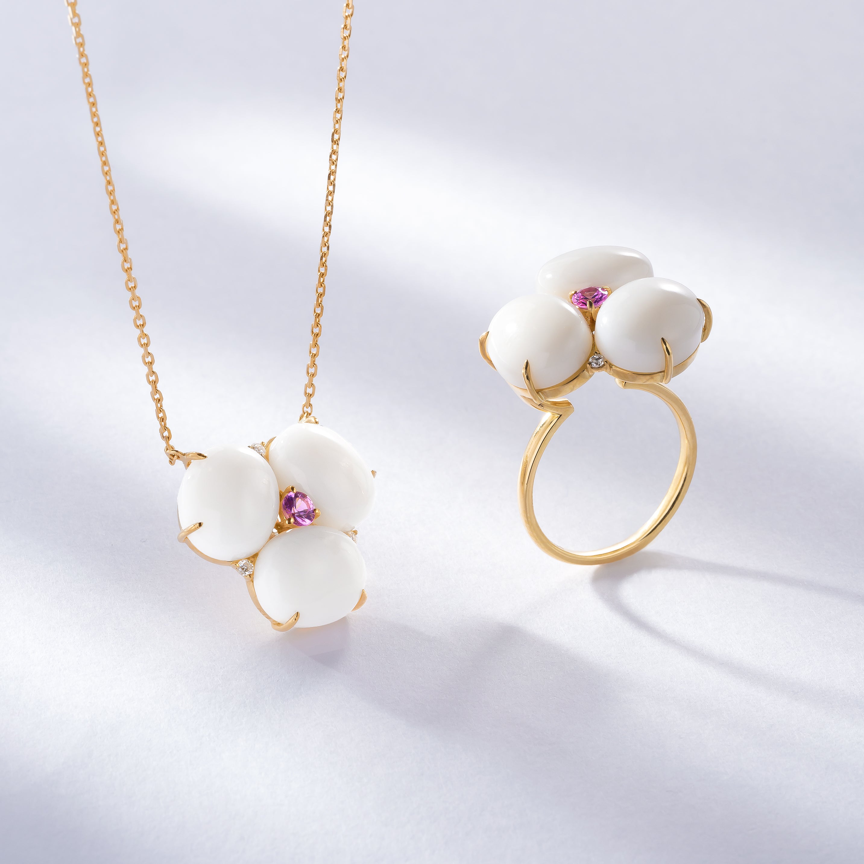 一粒の宝石に寄り添うダイヤモンドが、バレリーナのチュチュのように広がり優美に輝く。希少なセンターストーンを引き立てる上質なダイヤモンドと、さまざまなジュエリーとの多彩なレイヤードで魅せるコレクション。