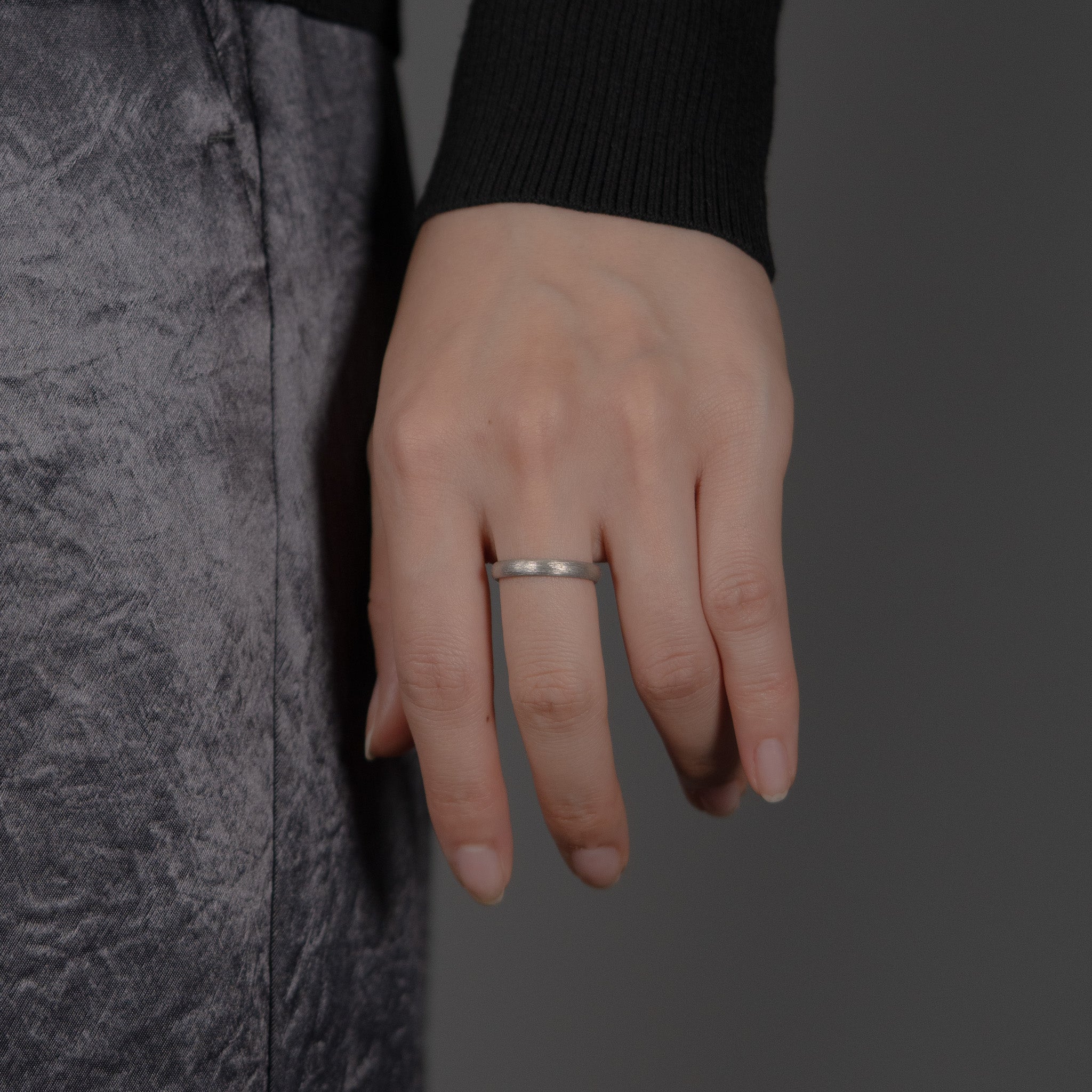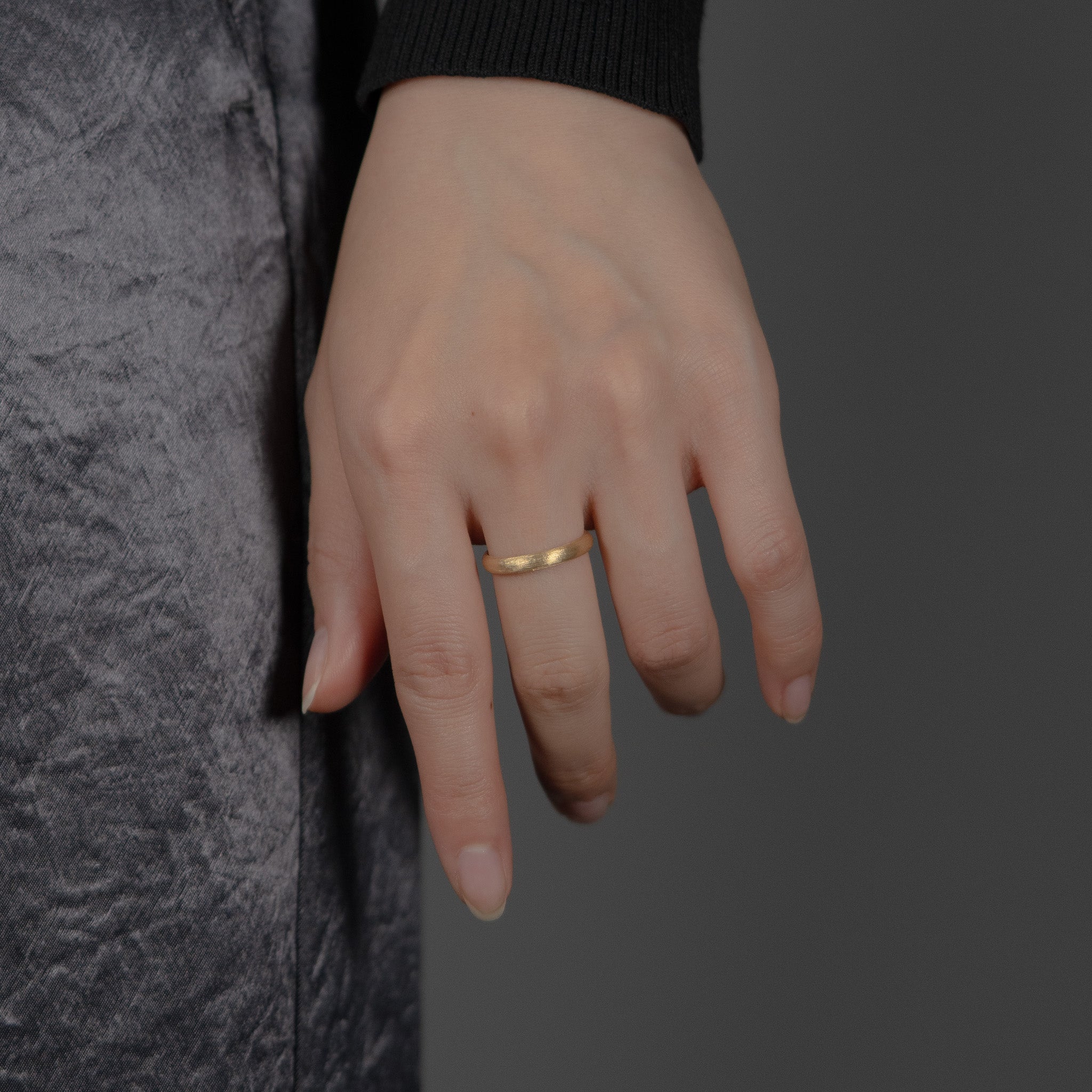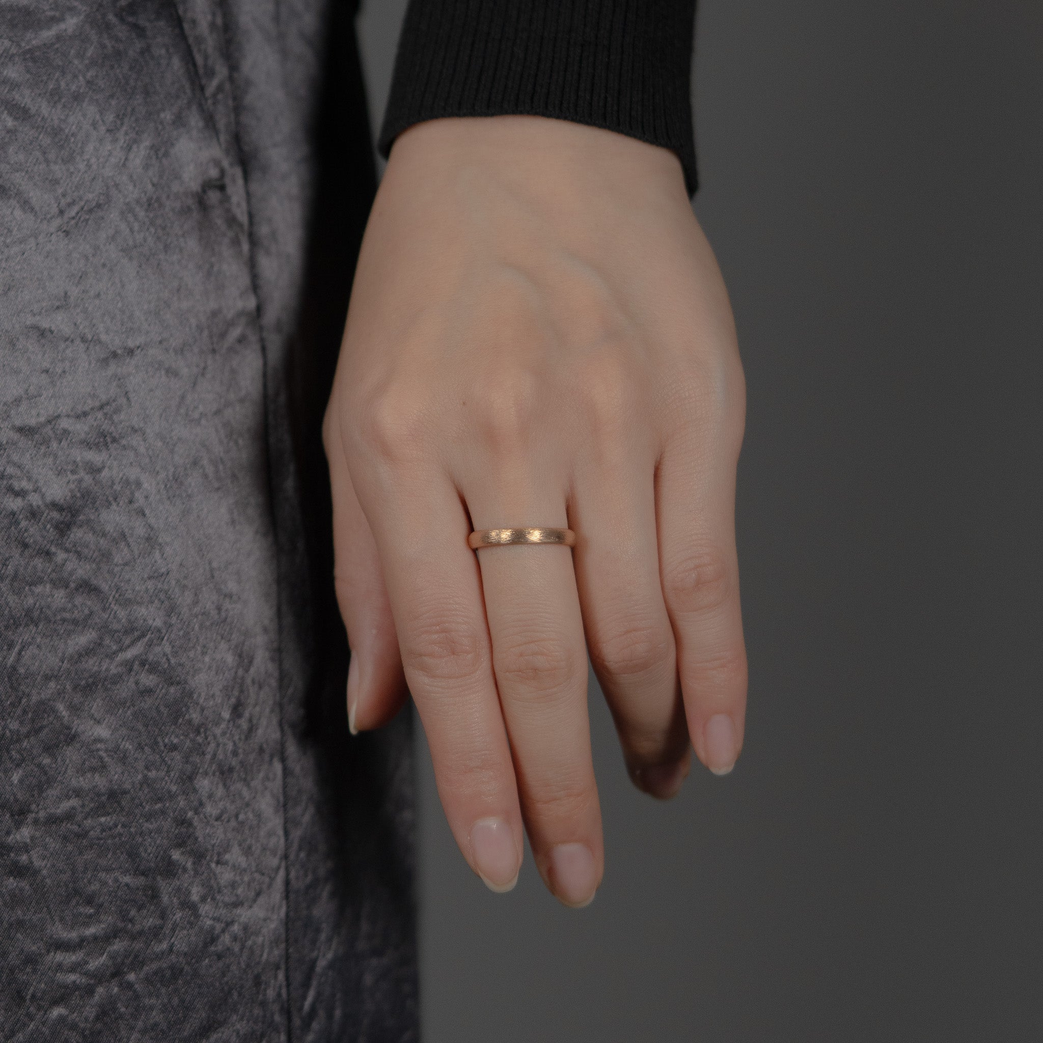 丁寧に磨き上げられた美しいシェイプの3mm幅甲丸リングに、幸せを重ねる木目調のテクスチャを施しました。内側まで丸みを持たせたデザインで、着け心地と指通りの良さを追求した逸品です。