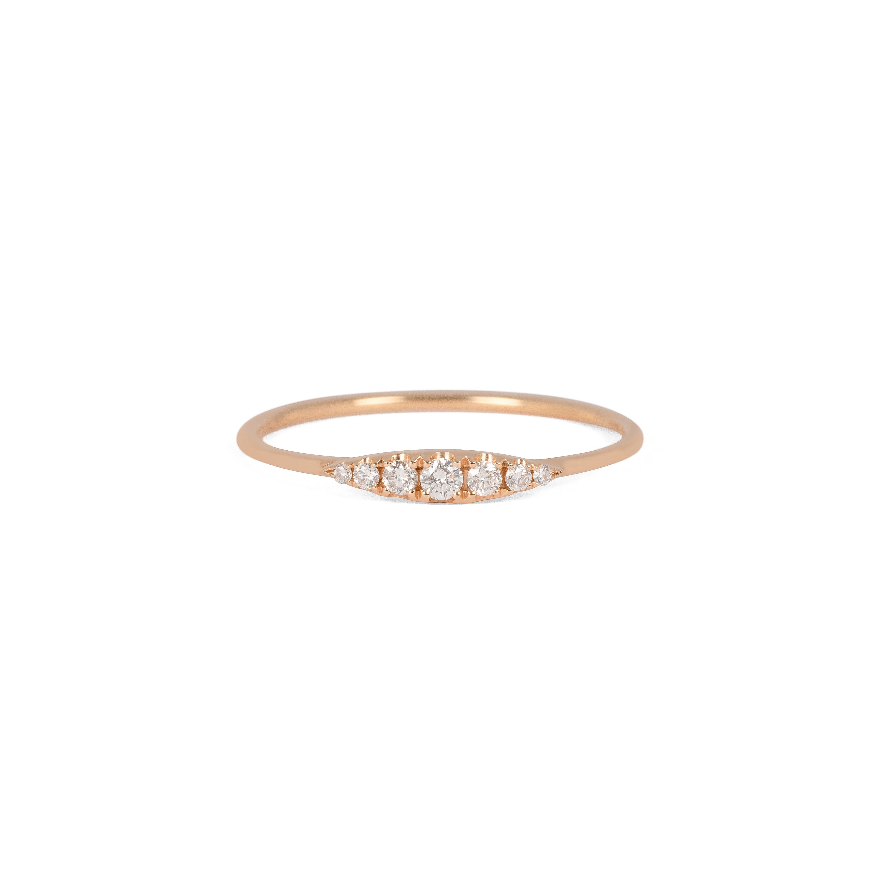 繊細なアームにメレダイヤモンドをグラデーションになるようにセッティングしました。あらゆるファッションやシーンに馴染み、いつでもどこでも身につけていたくなるリングです。
