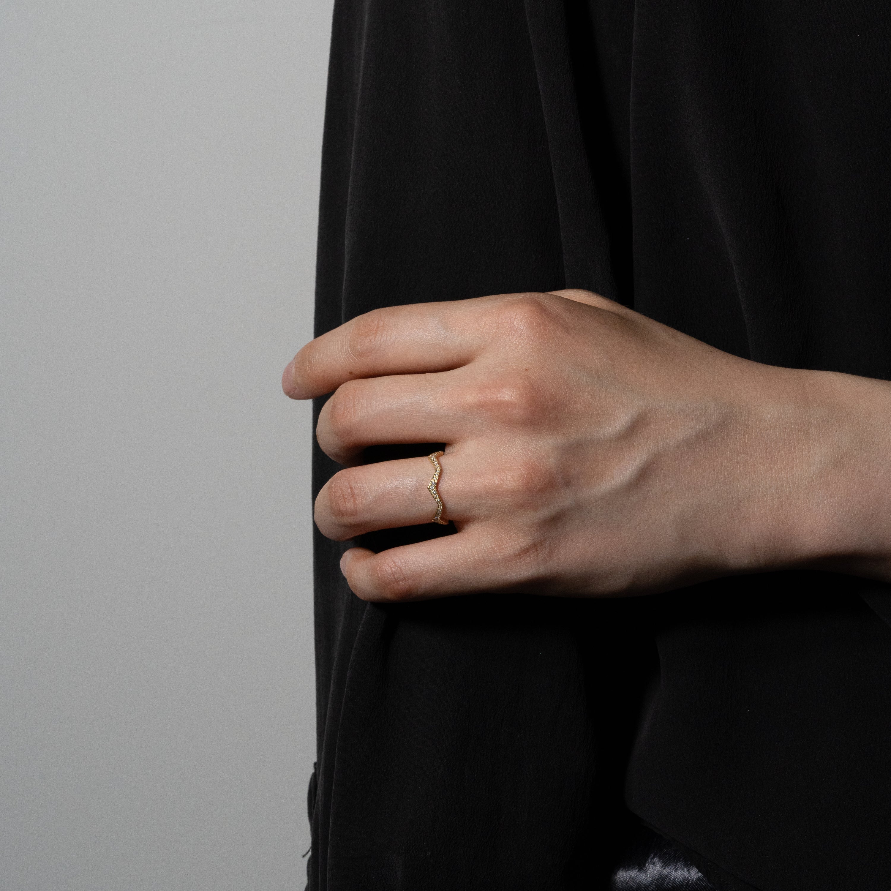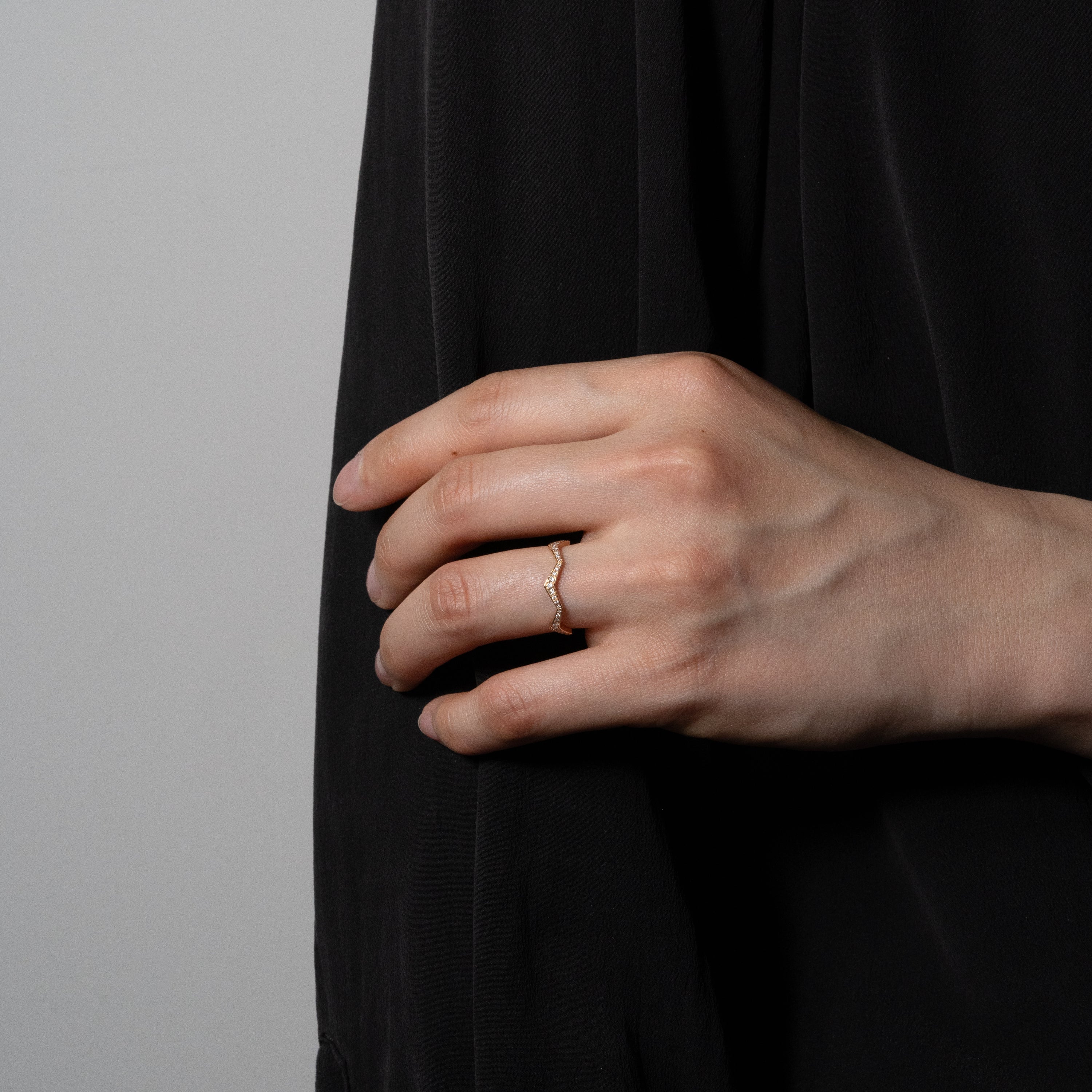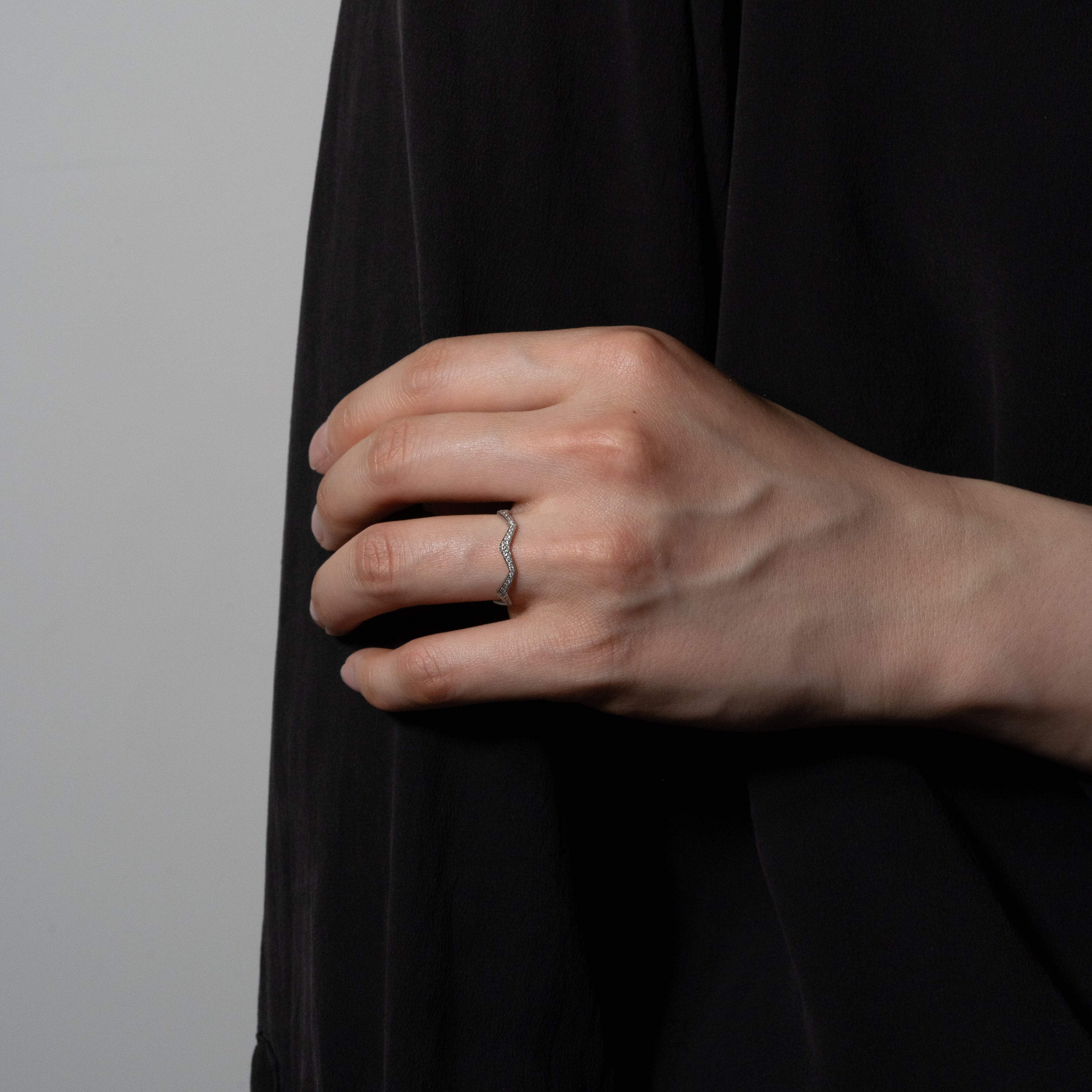 ジグザグの幅に抑揚を持たせ、その幅に合わせてメレダイヤモンドもグラデーションに。全周にジグザグのデザインを施しながらメレダイヤモンドは半周にのみセッティングしているため、あえてメタルの面を上に向けてご使用いただくことも可能です。Zigzag リングの素材違いの重ねづけもおすすめです。