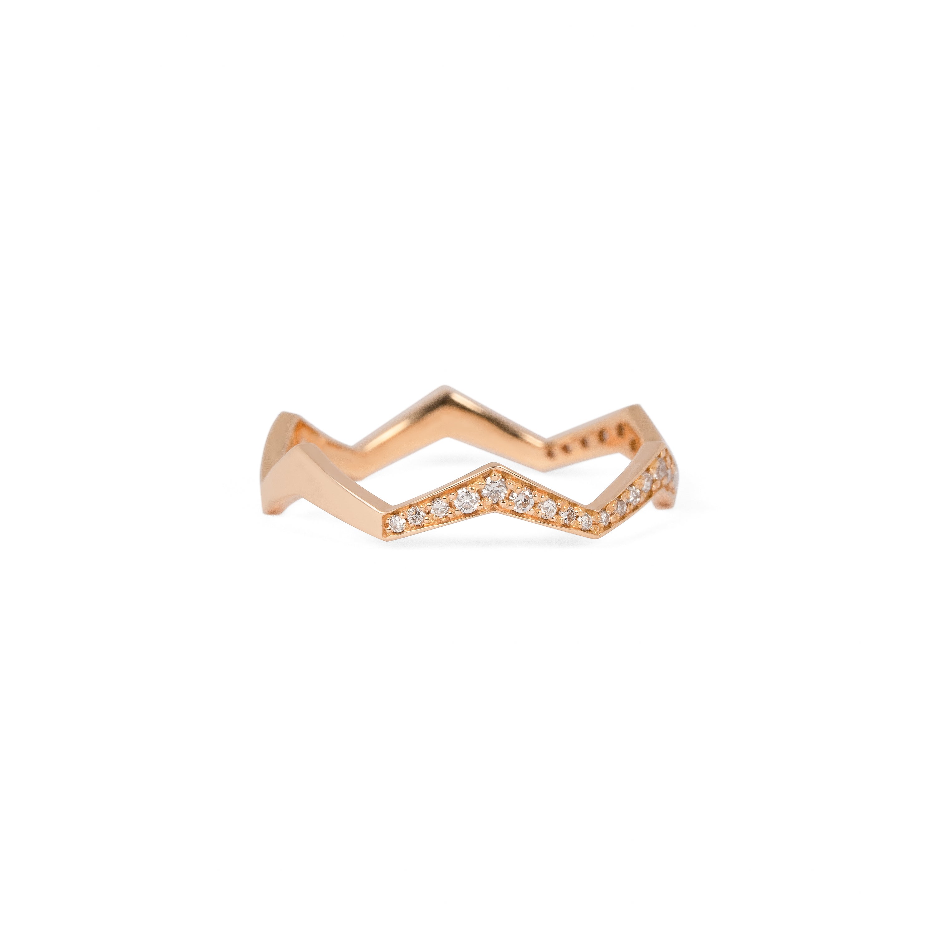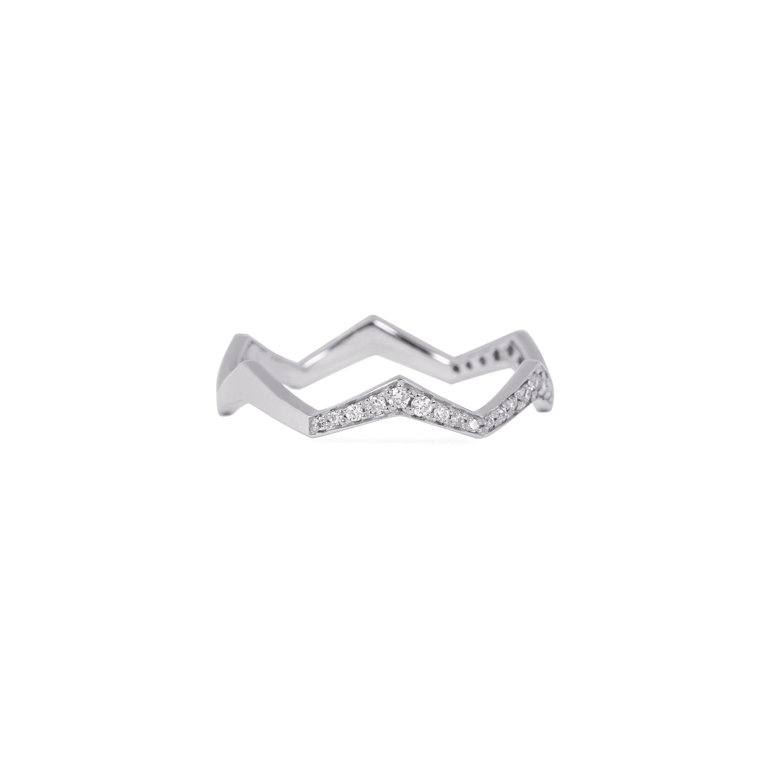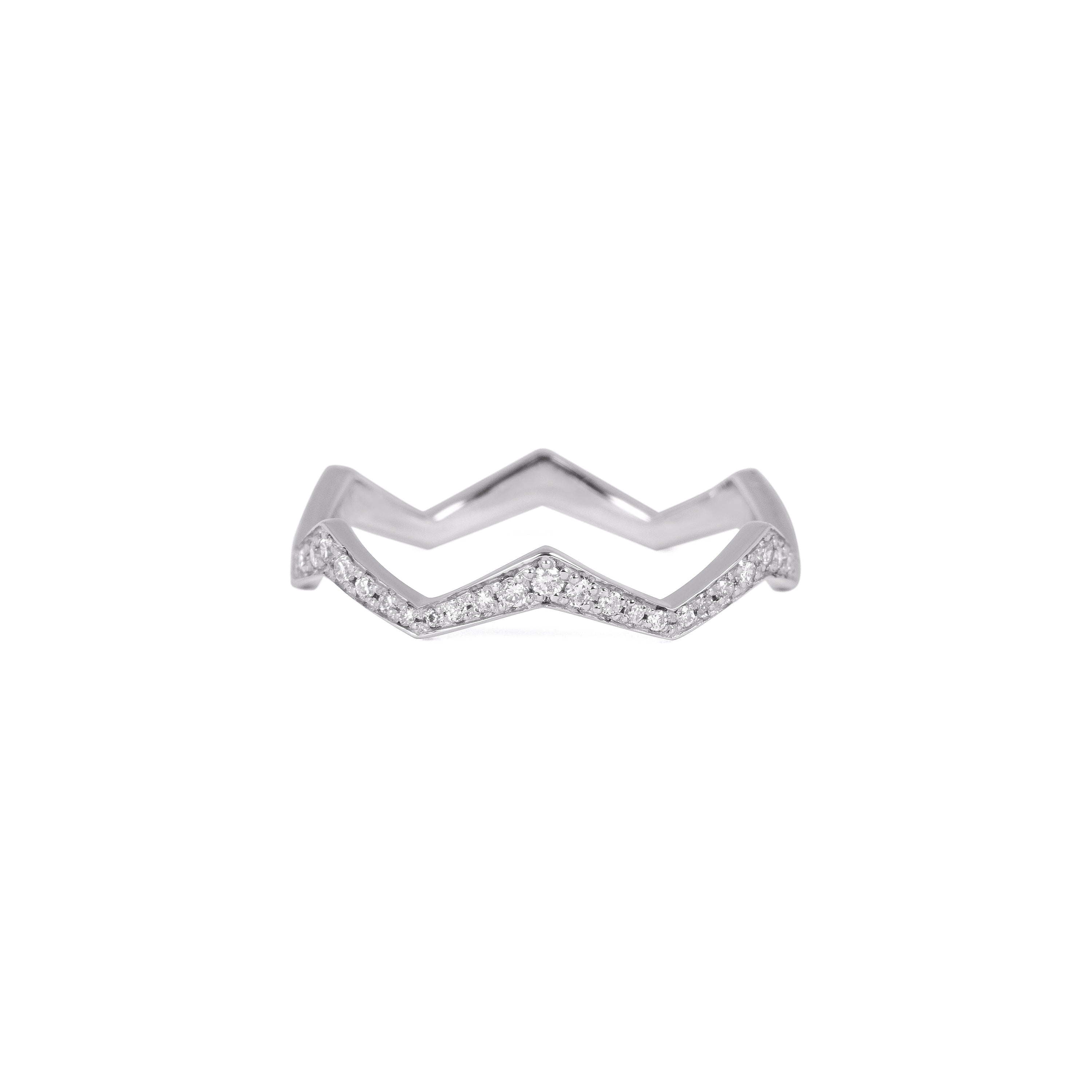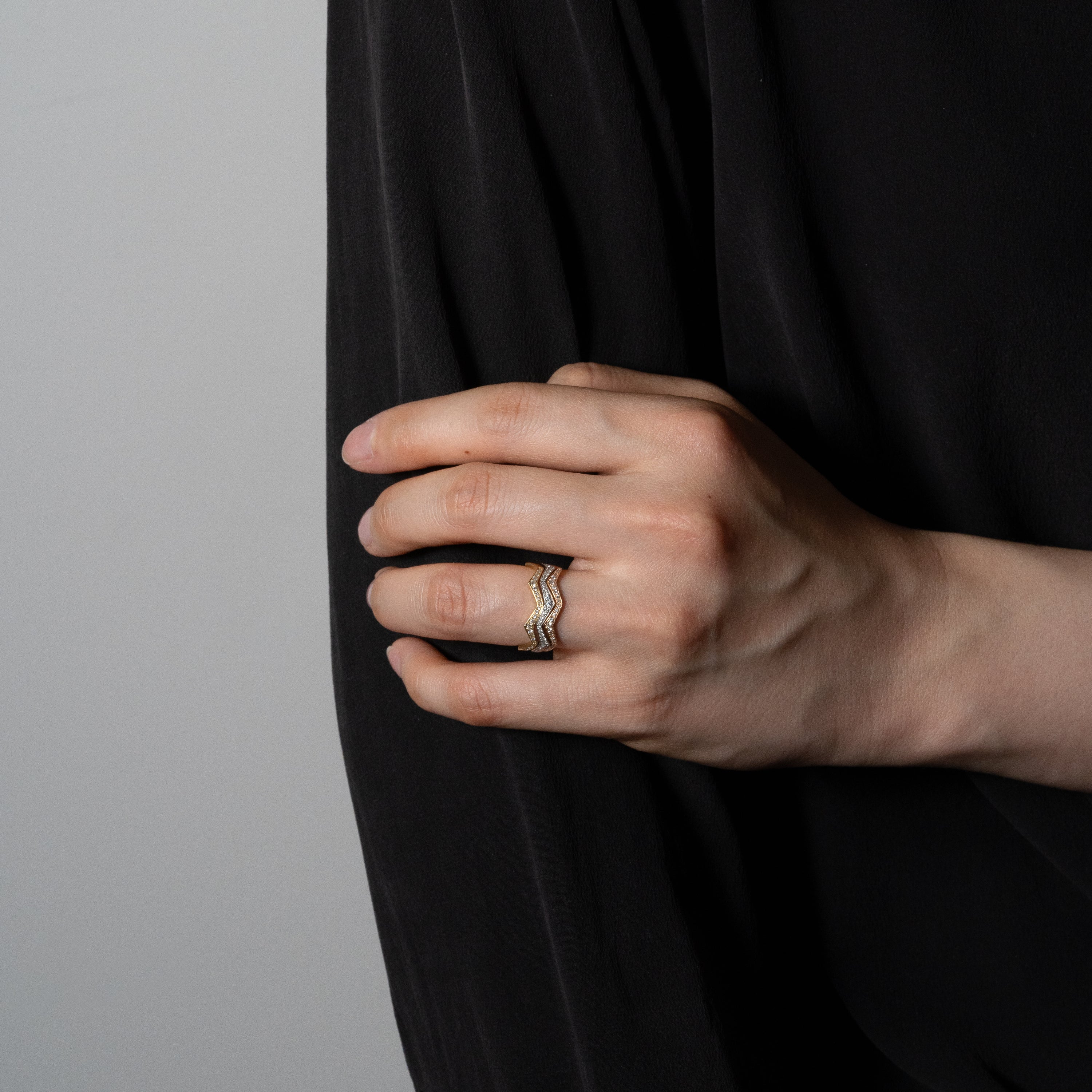 ジグザグの幅に抑揚を持たせ、その幅に合わせてメレダイヤモンドもグラデーションに。全周にジグザグのデザインを施しながらメレダイヤモンドは半周にのみセッティングしているため、あえてメタルの面を上に向けてご使用いただくことも可能です。Zigzag リングの素材違いの重ねづけもおすすめです。