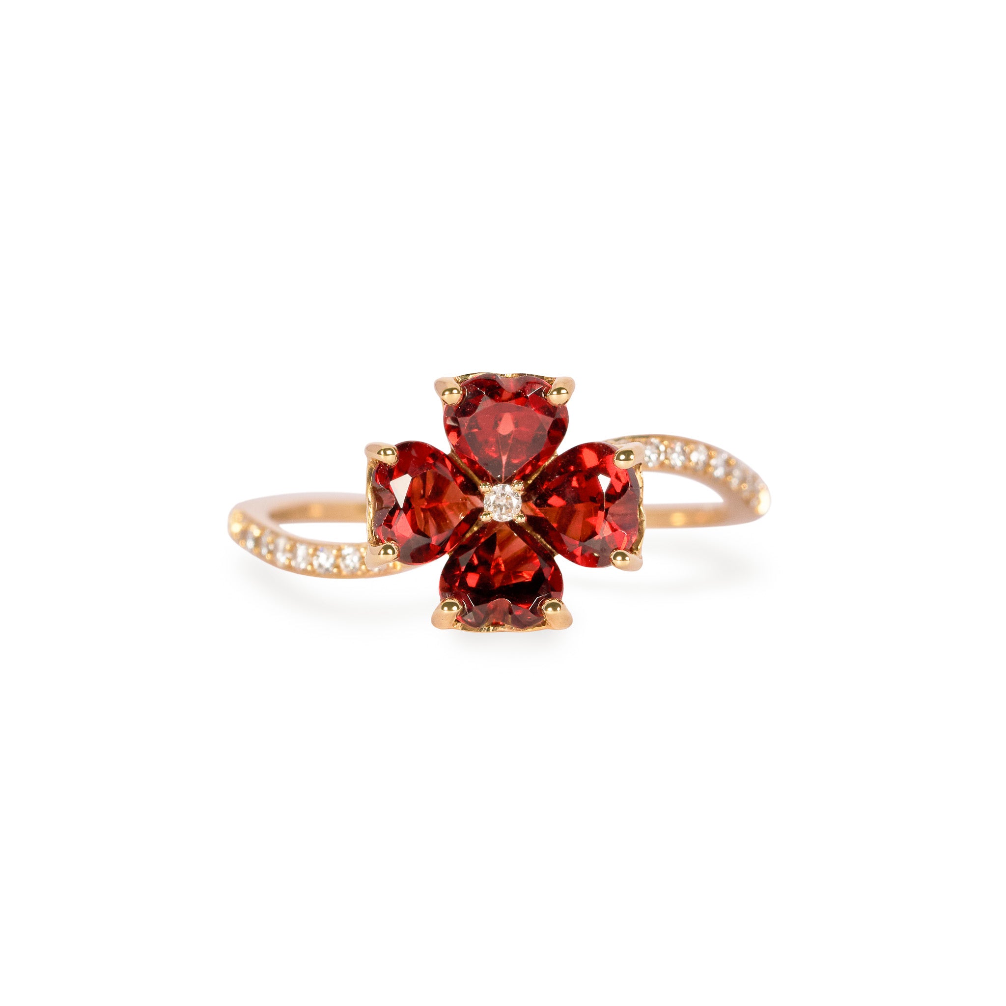 4枚のハートシェイプのガーネットの花びらが咲き誇り、生命を宿したリング。
