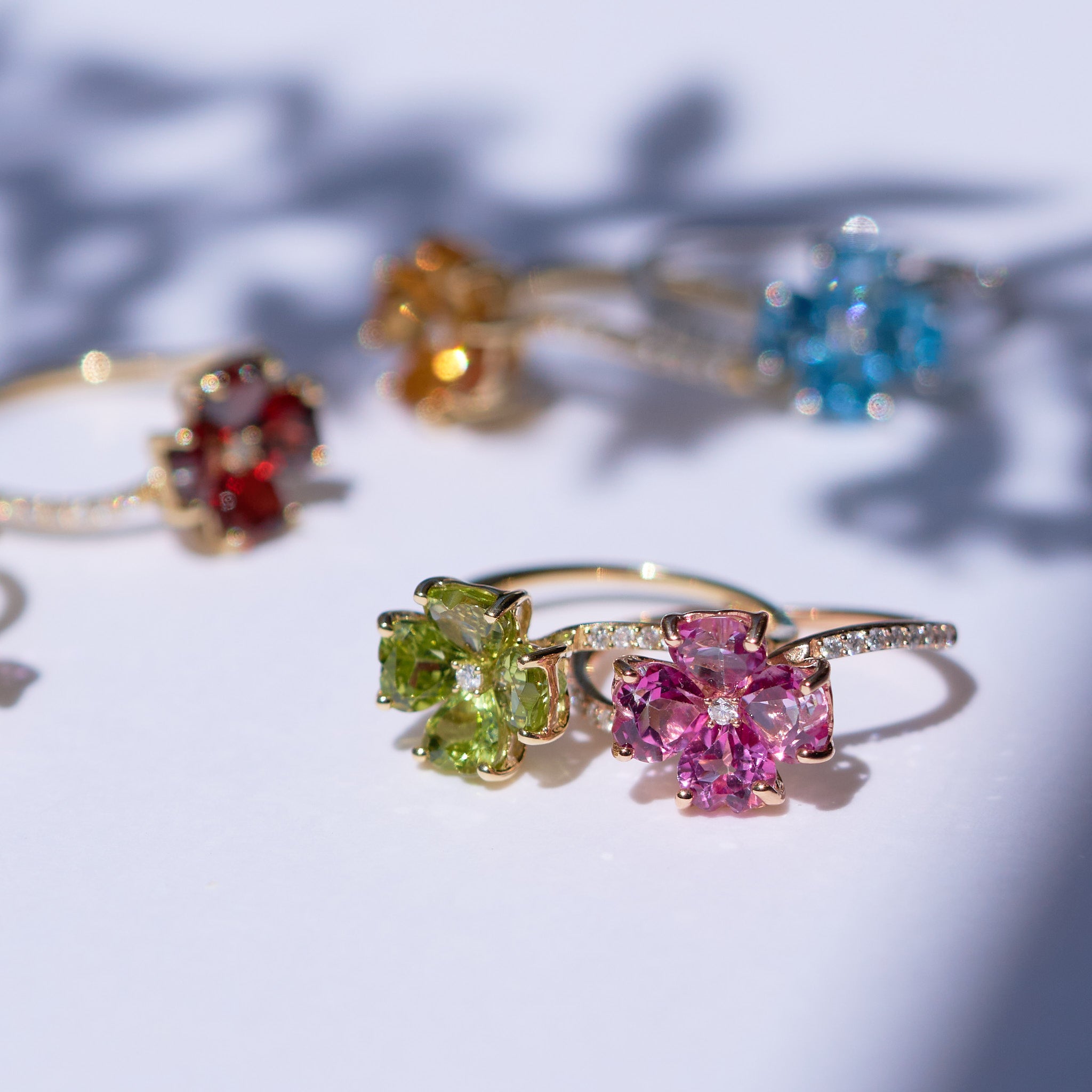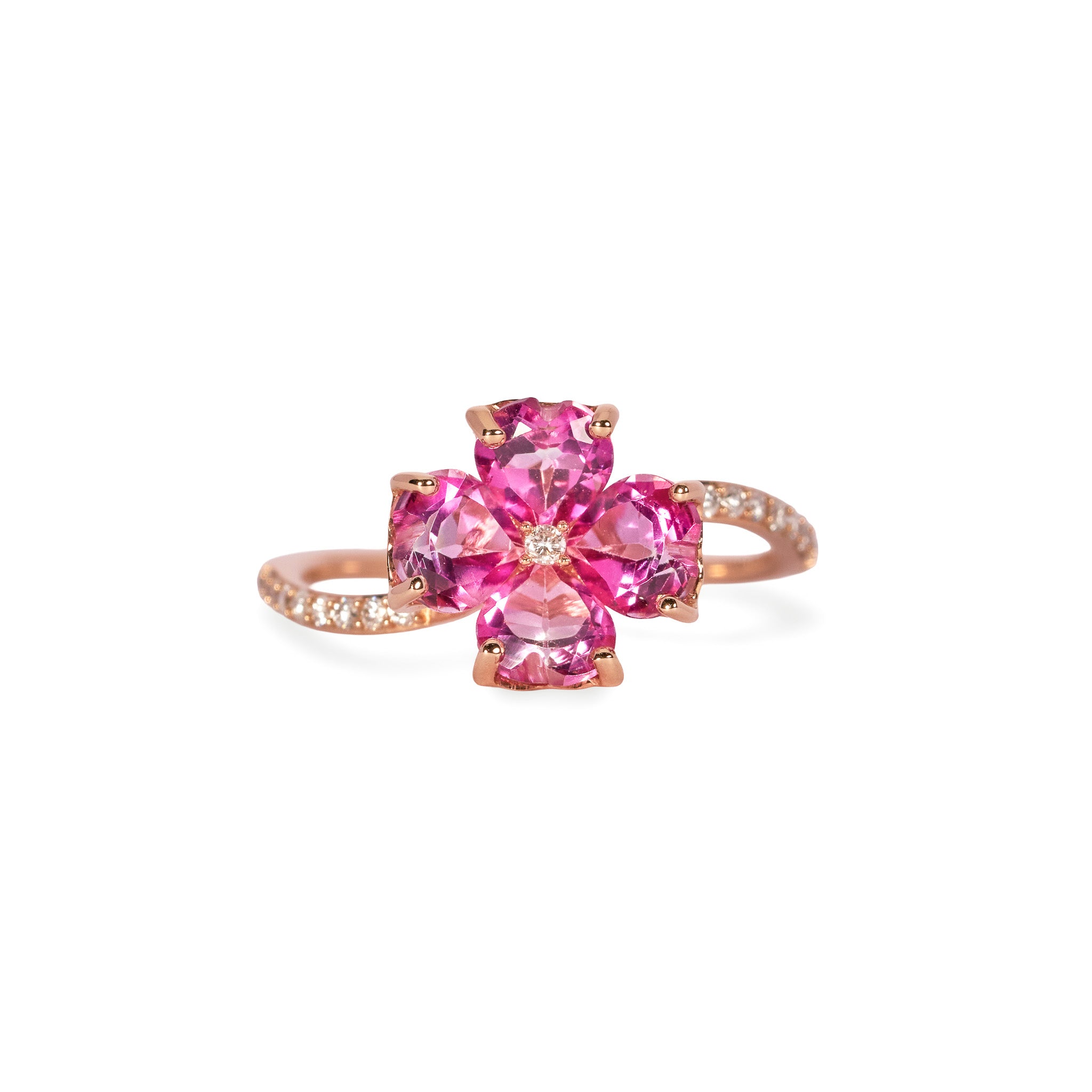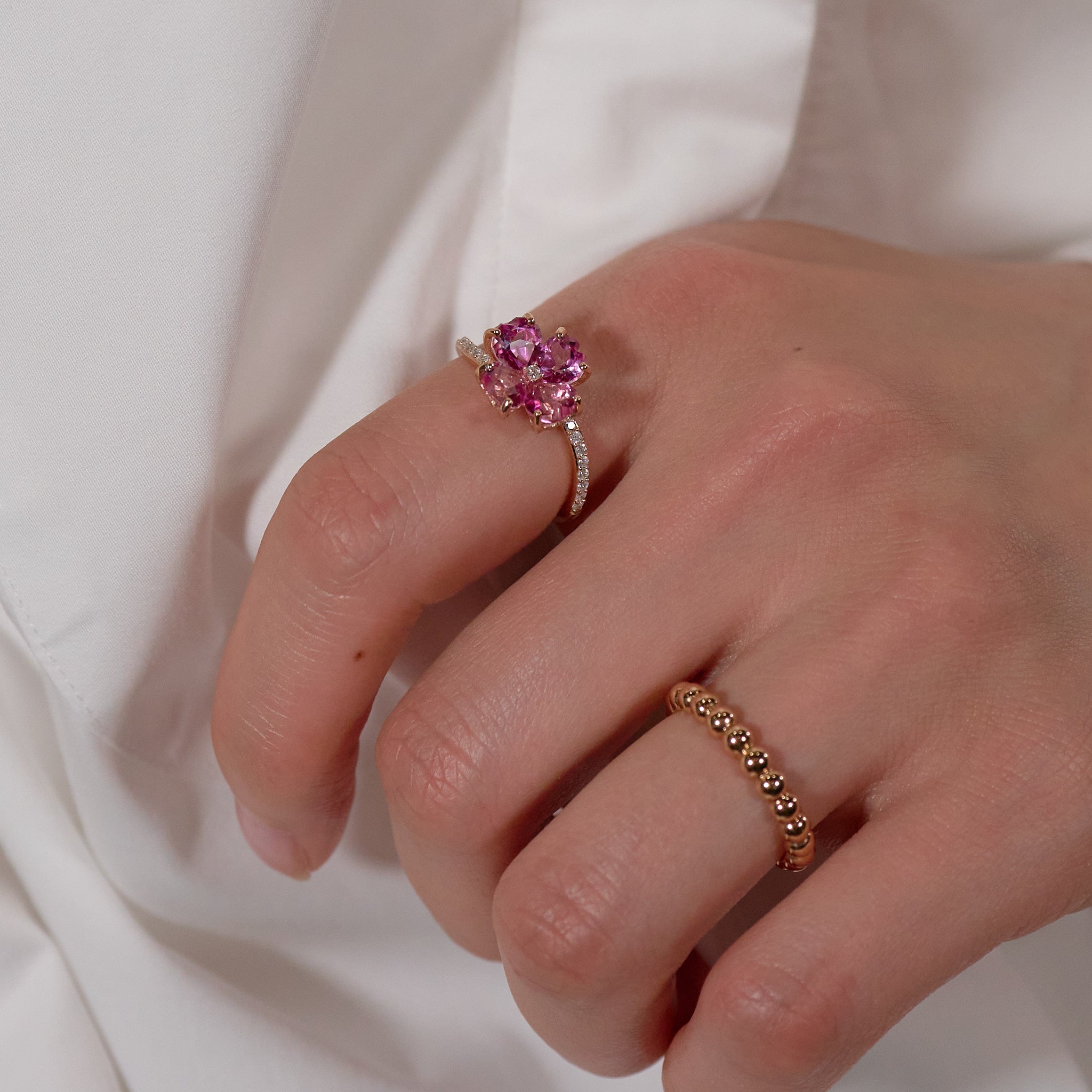 4枚のハートシェイプのピンクトパーズの花びらが咲き誇り、生命を宿したリング。