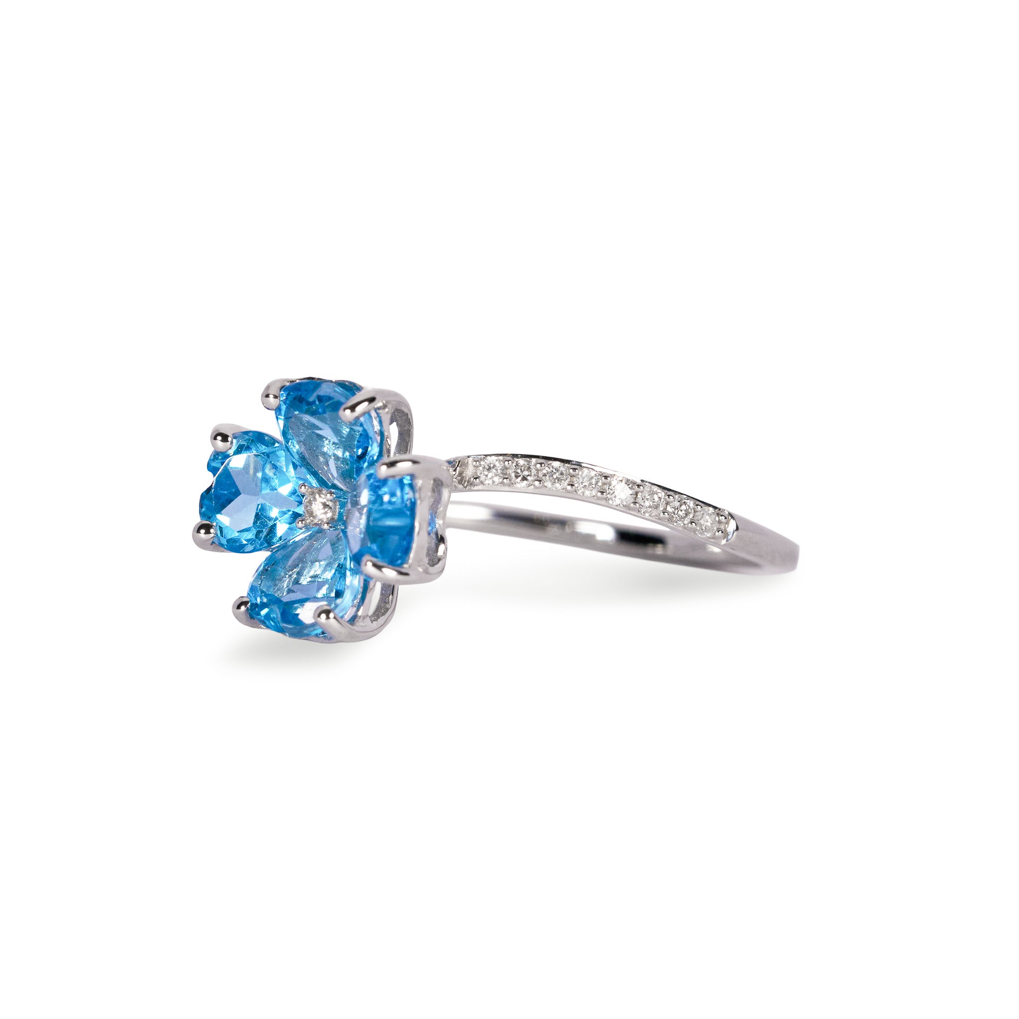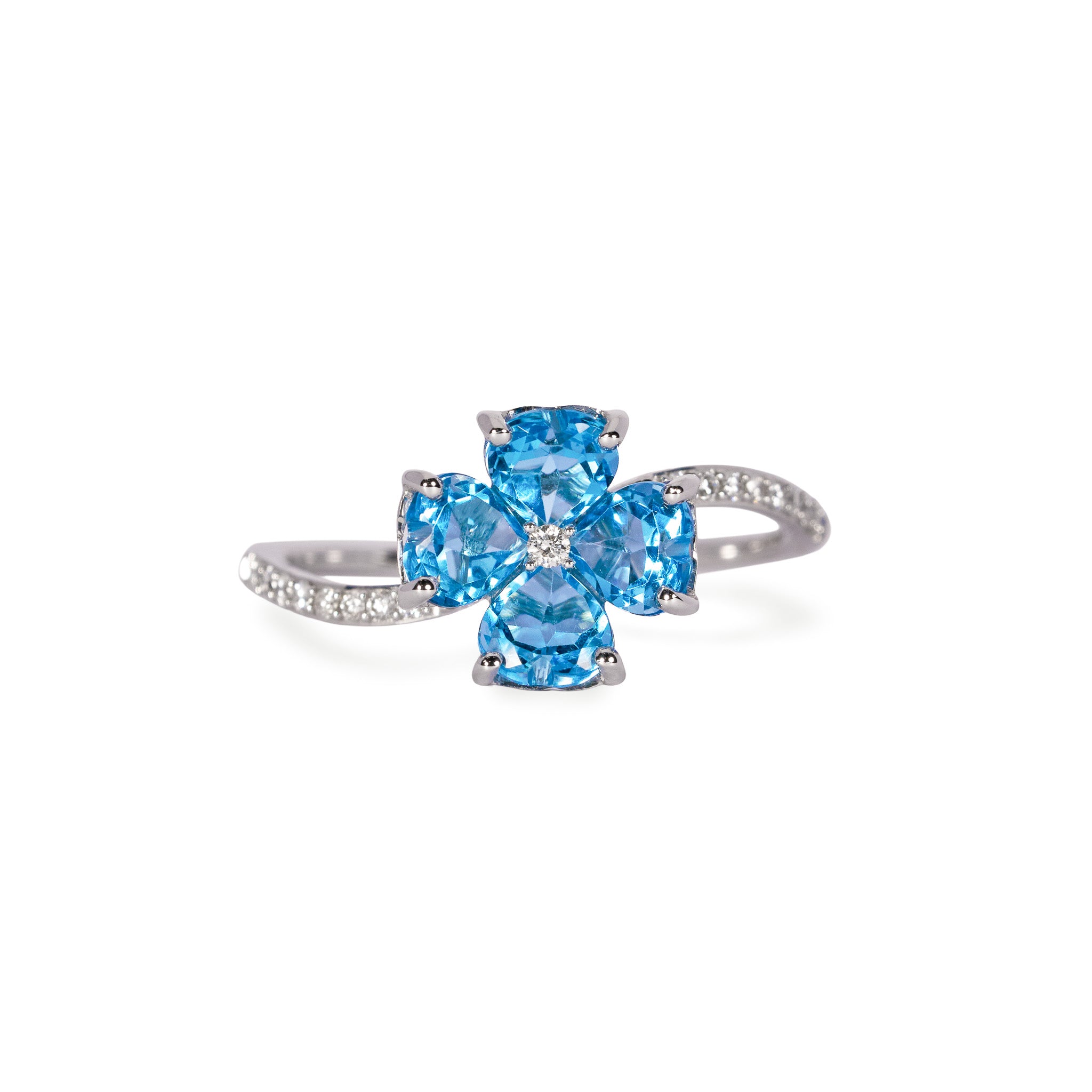 4枚のハートシェイプのブルートパーズの花びらが咲き誇り、生命を宿したリング。