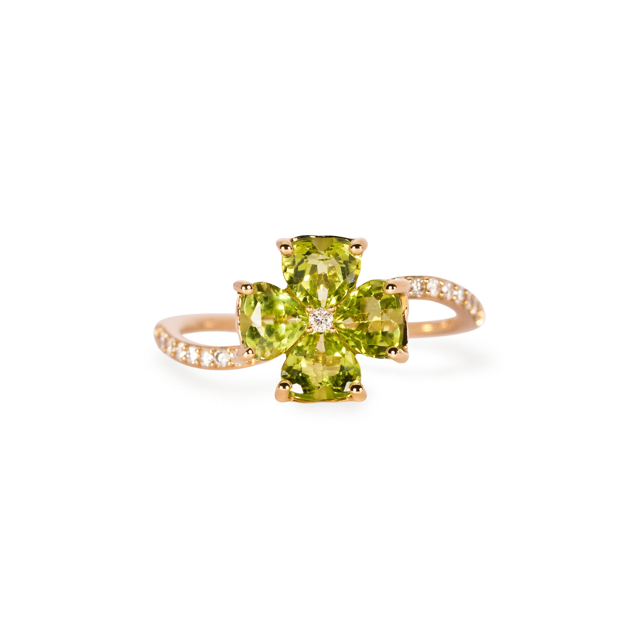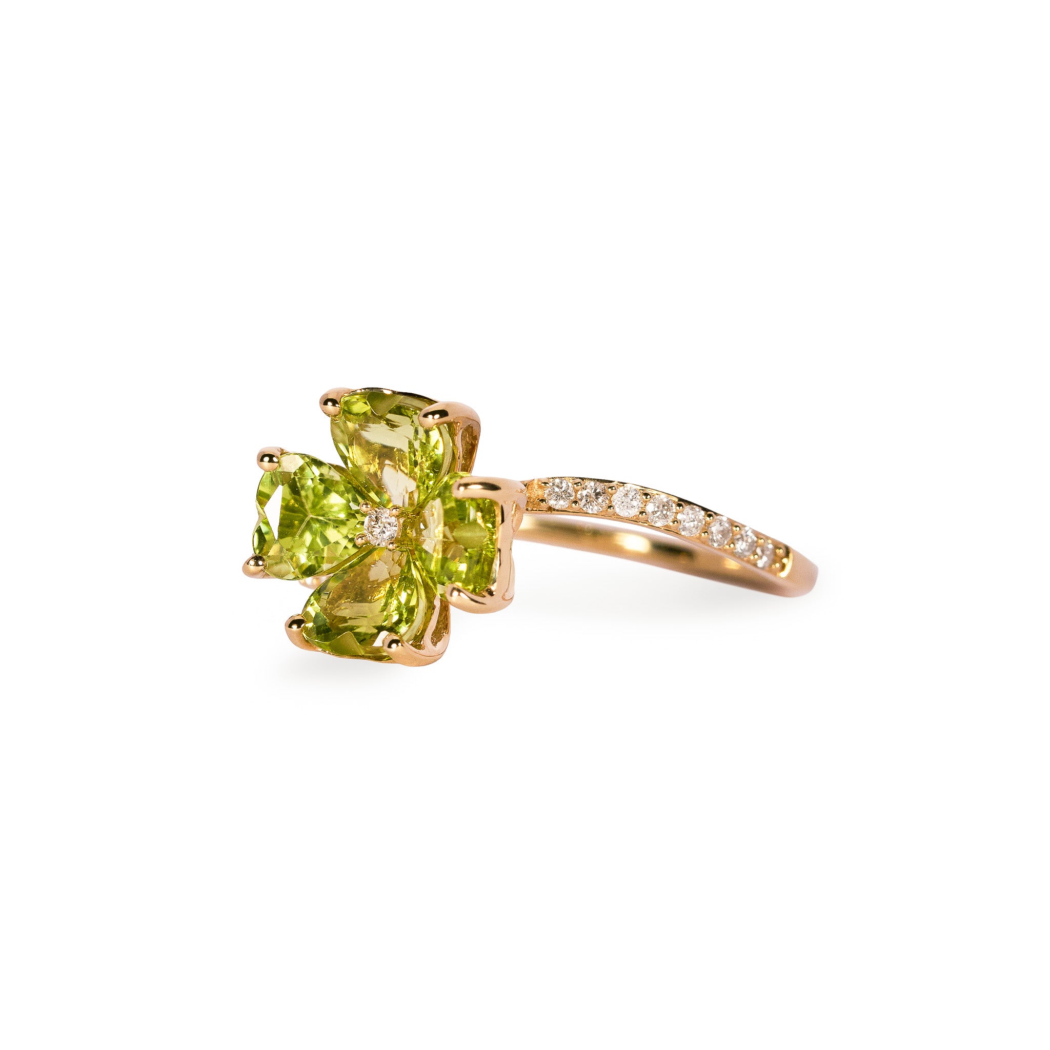 4枚のハートシェイプのペリドットの花びらが咲き誇り、生命を宿したリング。