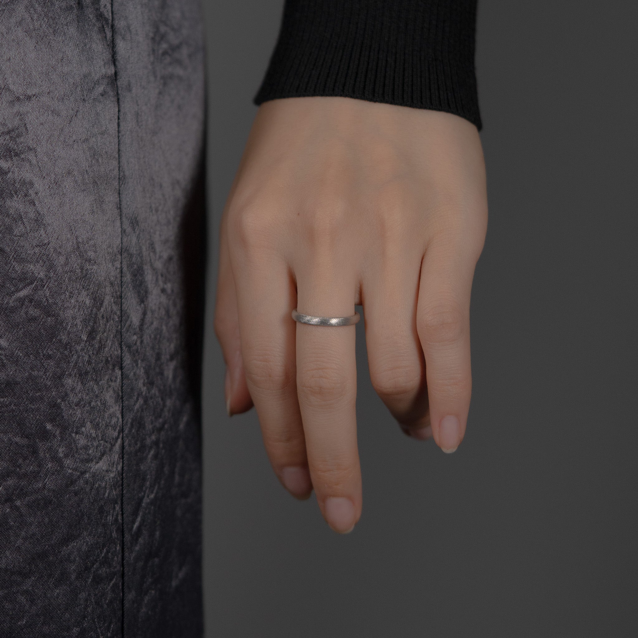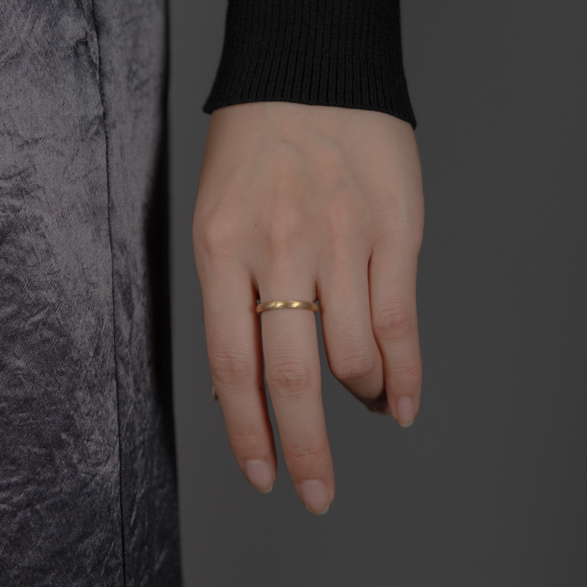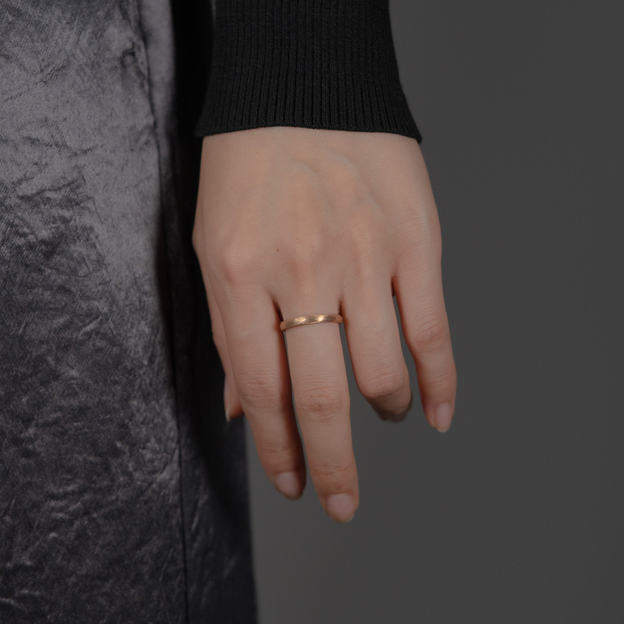 丁寧に磨き上げられた美しいシェイプの2.5mm幅甲丸リングに、無数の星が導く奇跡を表現する星屑のような繊細な光のテクスチャを施しました。内側まで丸みを持たせたデザインで、着け心地と指通りの良さを追求した逸品です。