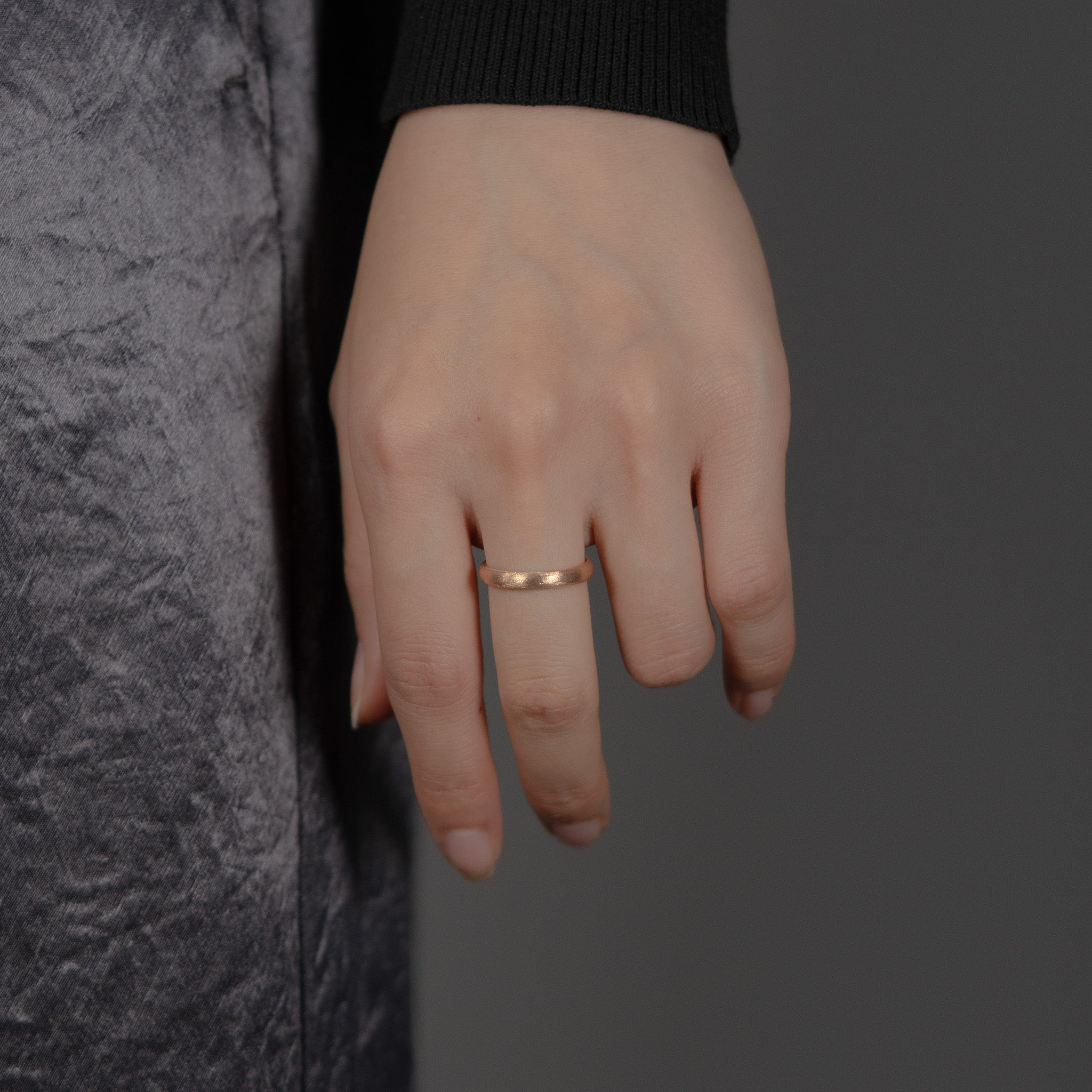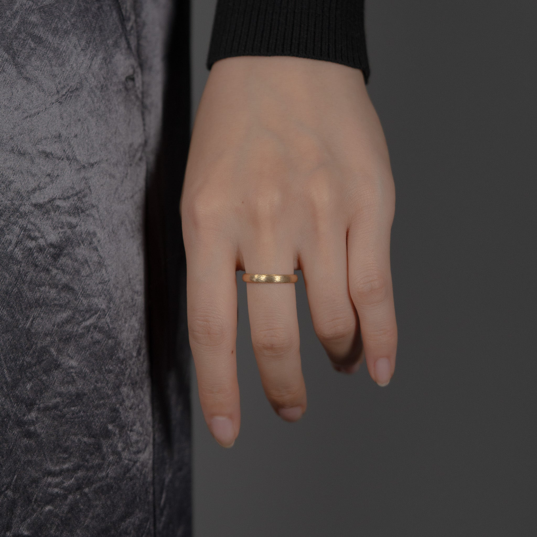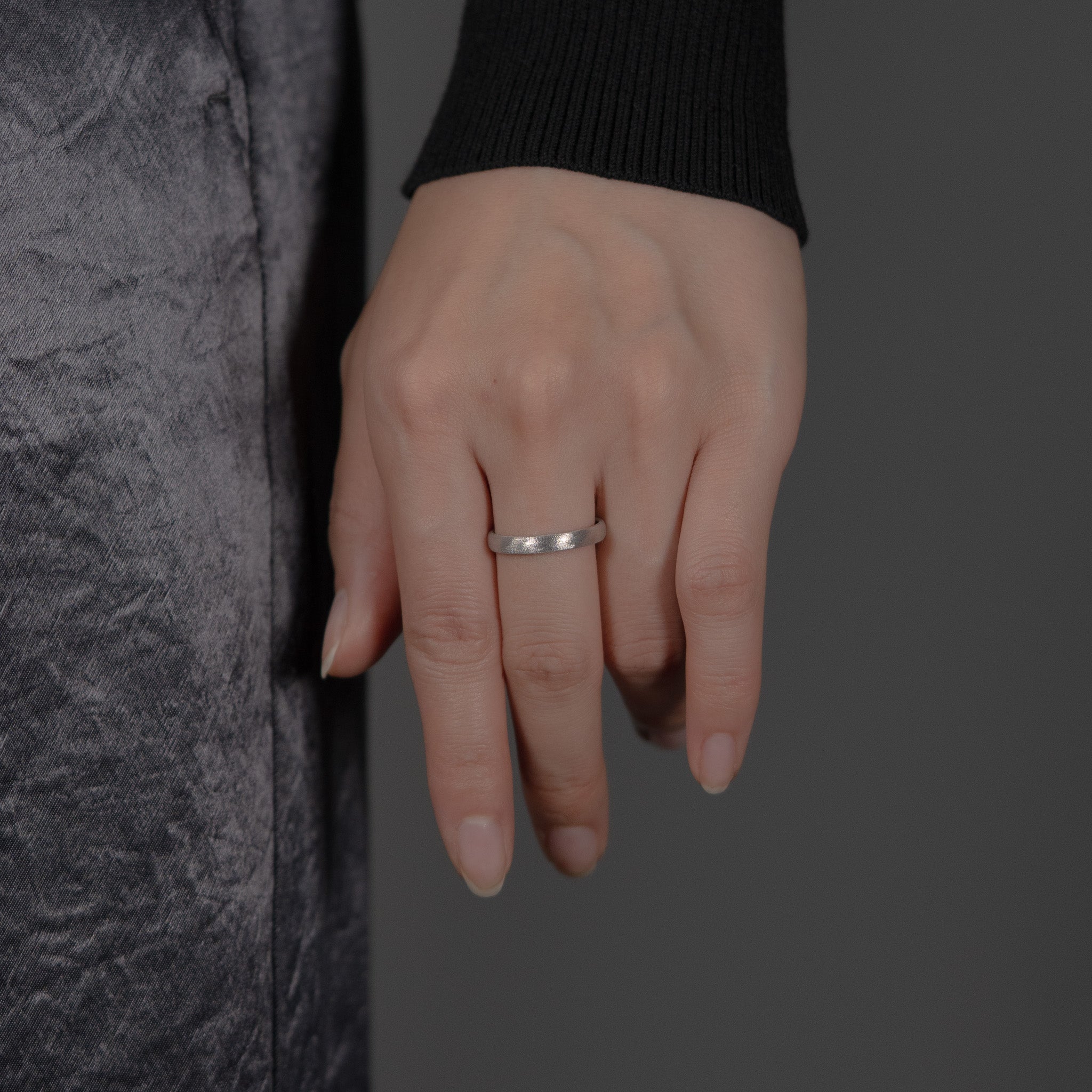 丁寧に磨き上げられた美しいシェイプの3mm幅甲丸リングに、無数の星が導く奇跡を表現する星屑のような繊細な光のテクスチャを施しました。内側まで丸みを持たせたデザインで、着け心地と指通りの良さを追求した逸品です。