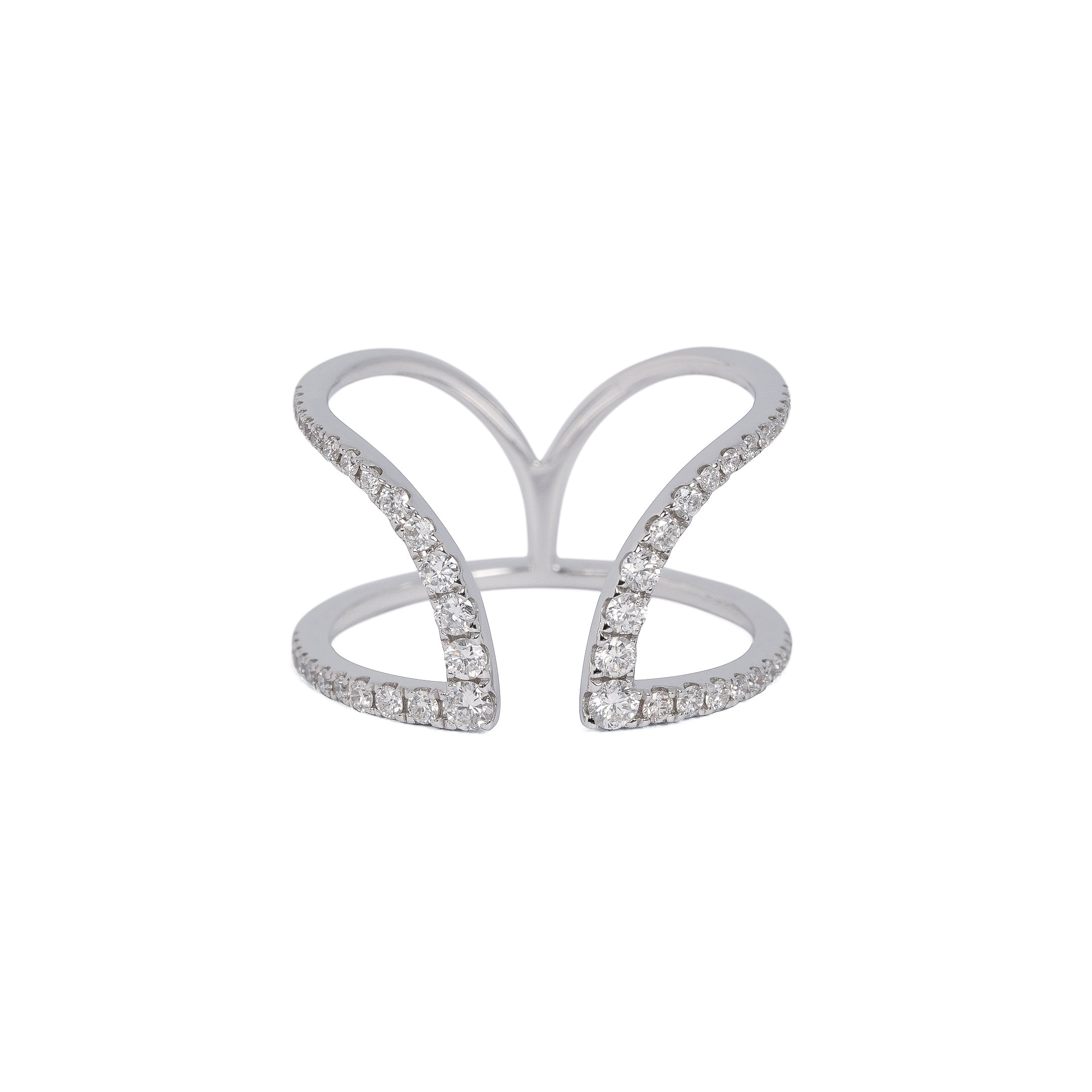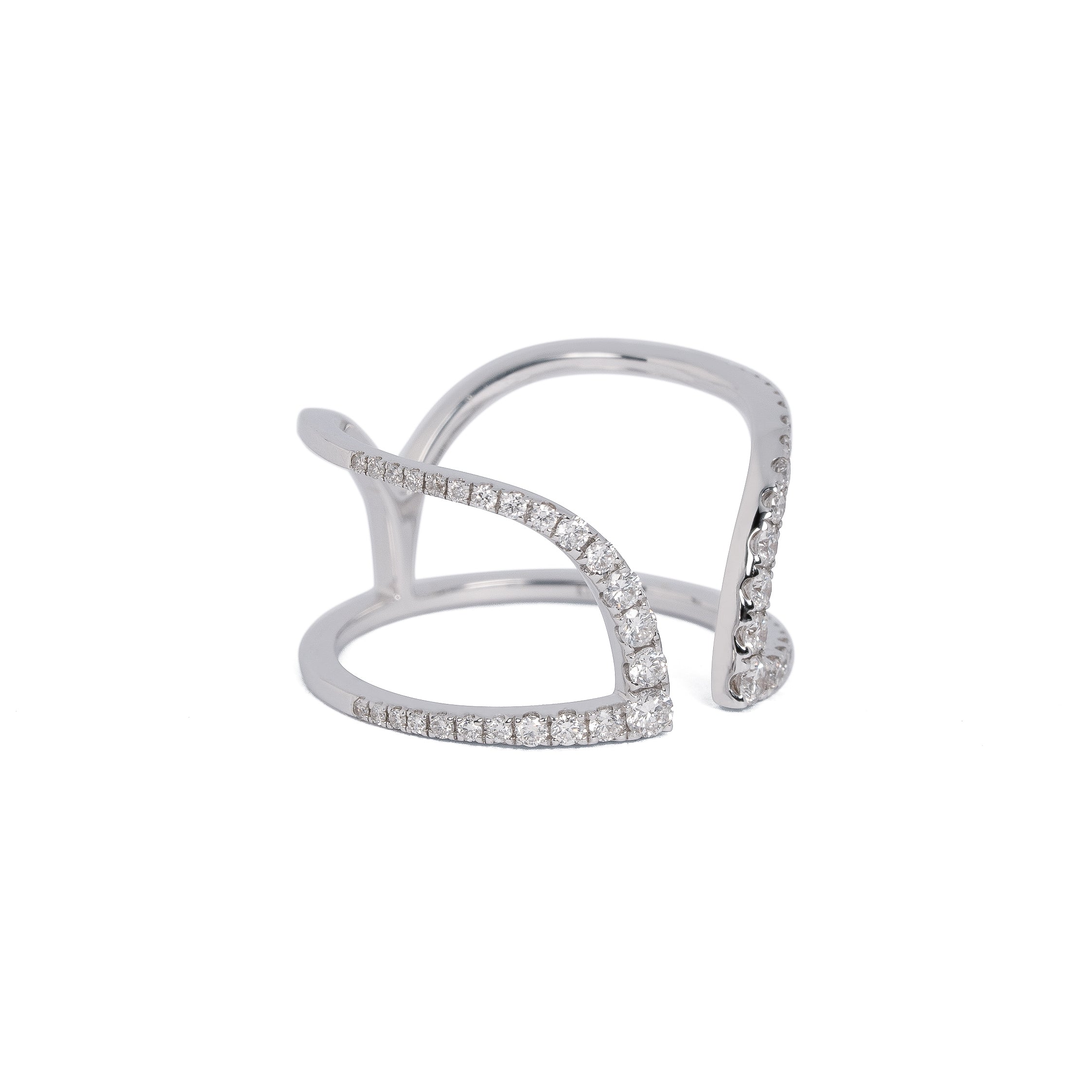 曲線と直線が柔らかく力強く繋がるデザイン。メレダイヤモンドが徐々に大きくなるグラデーションも美しいリング。