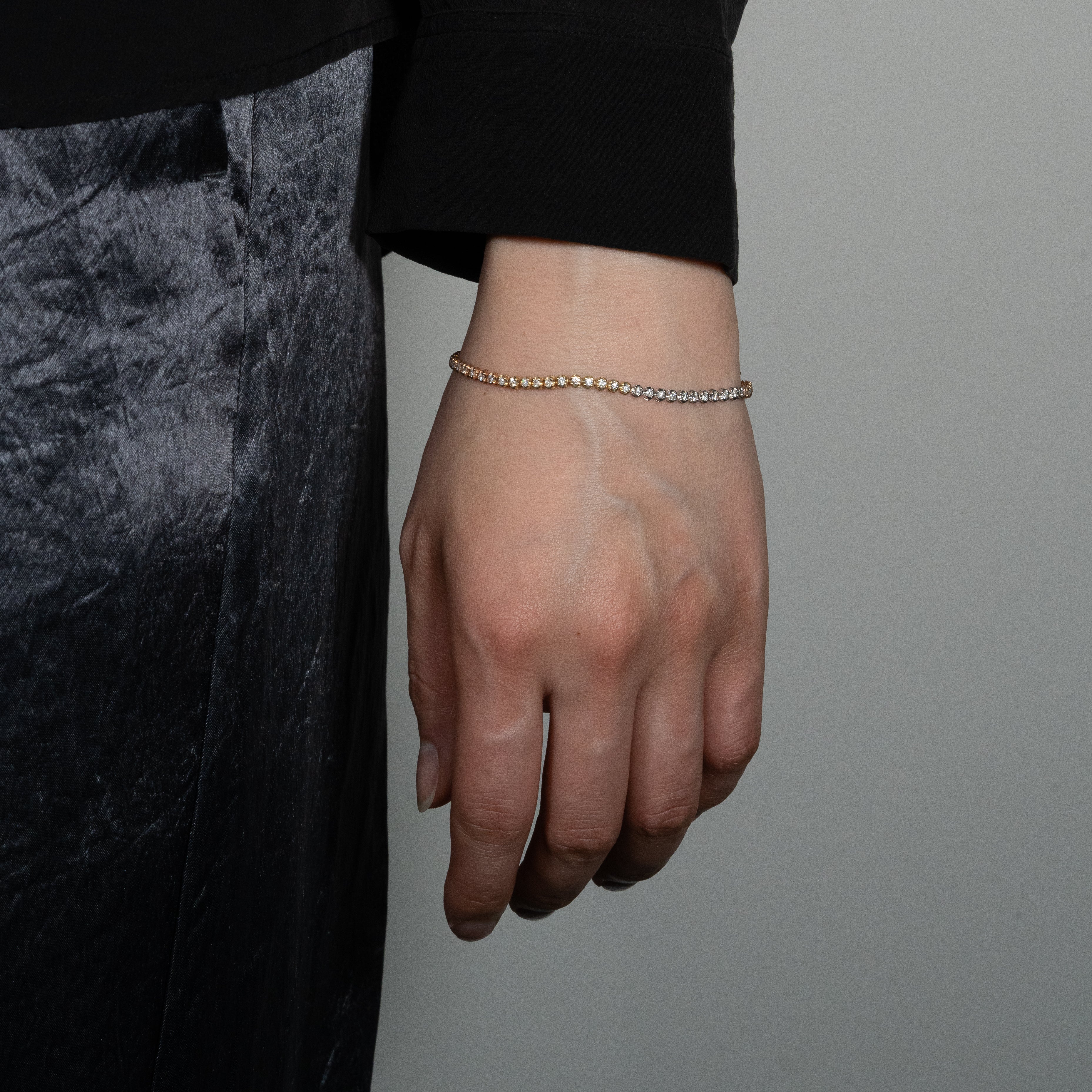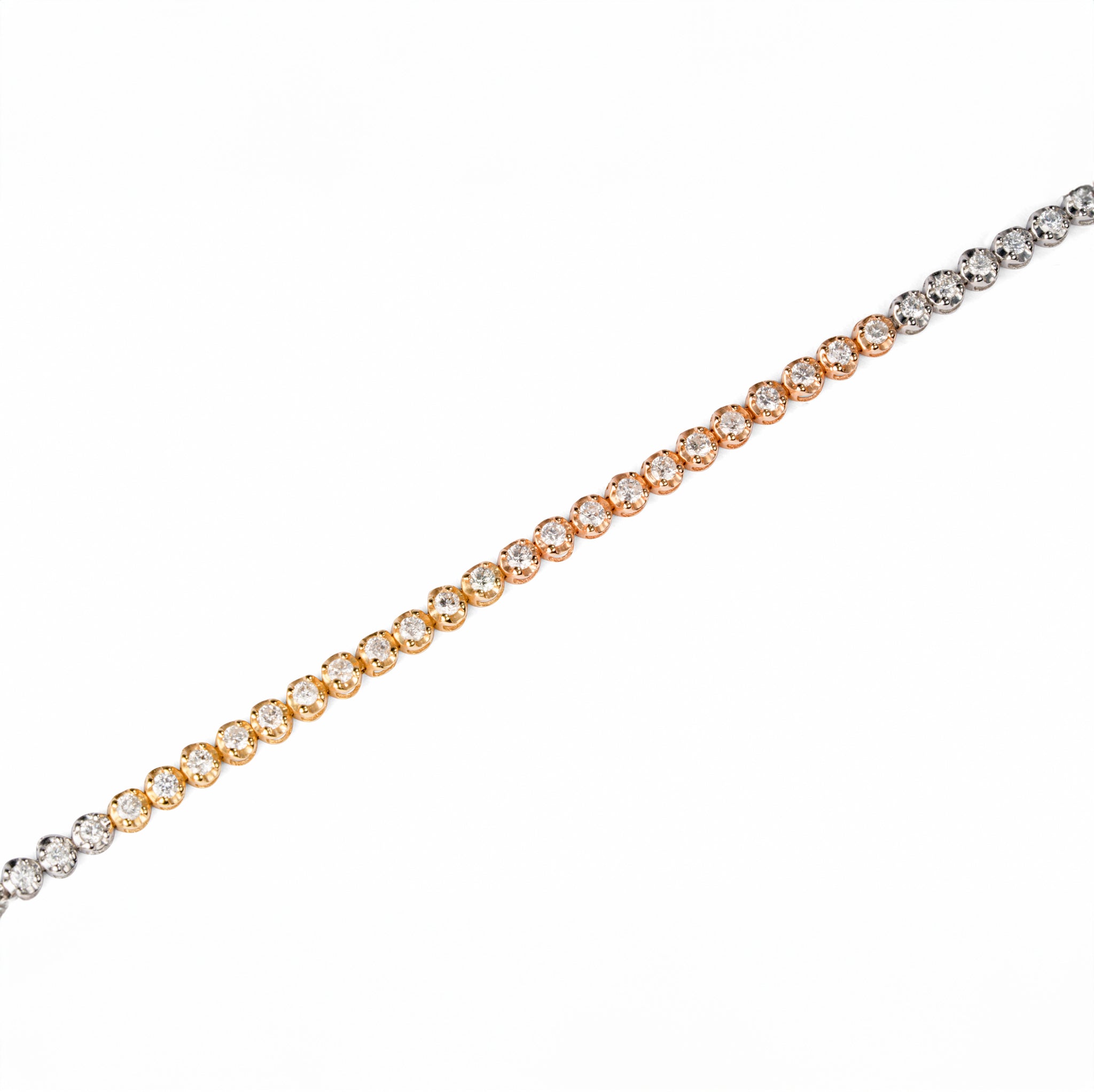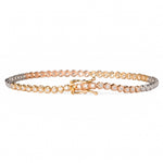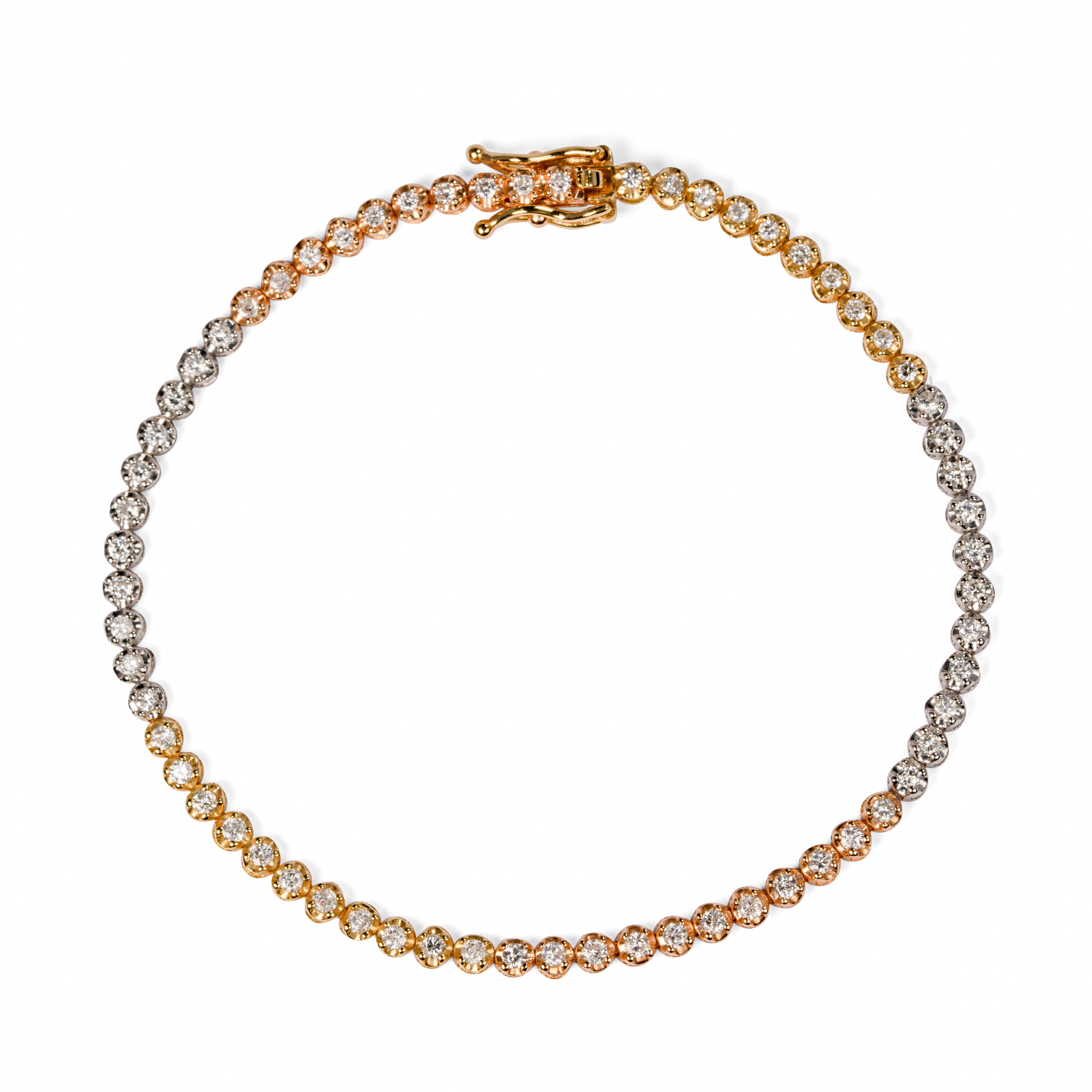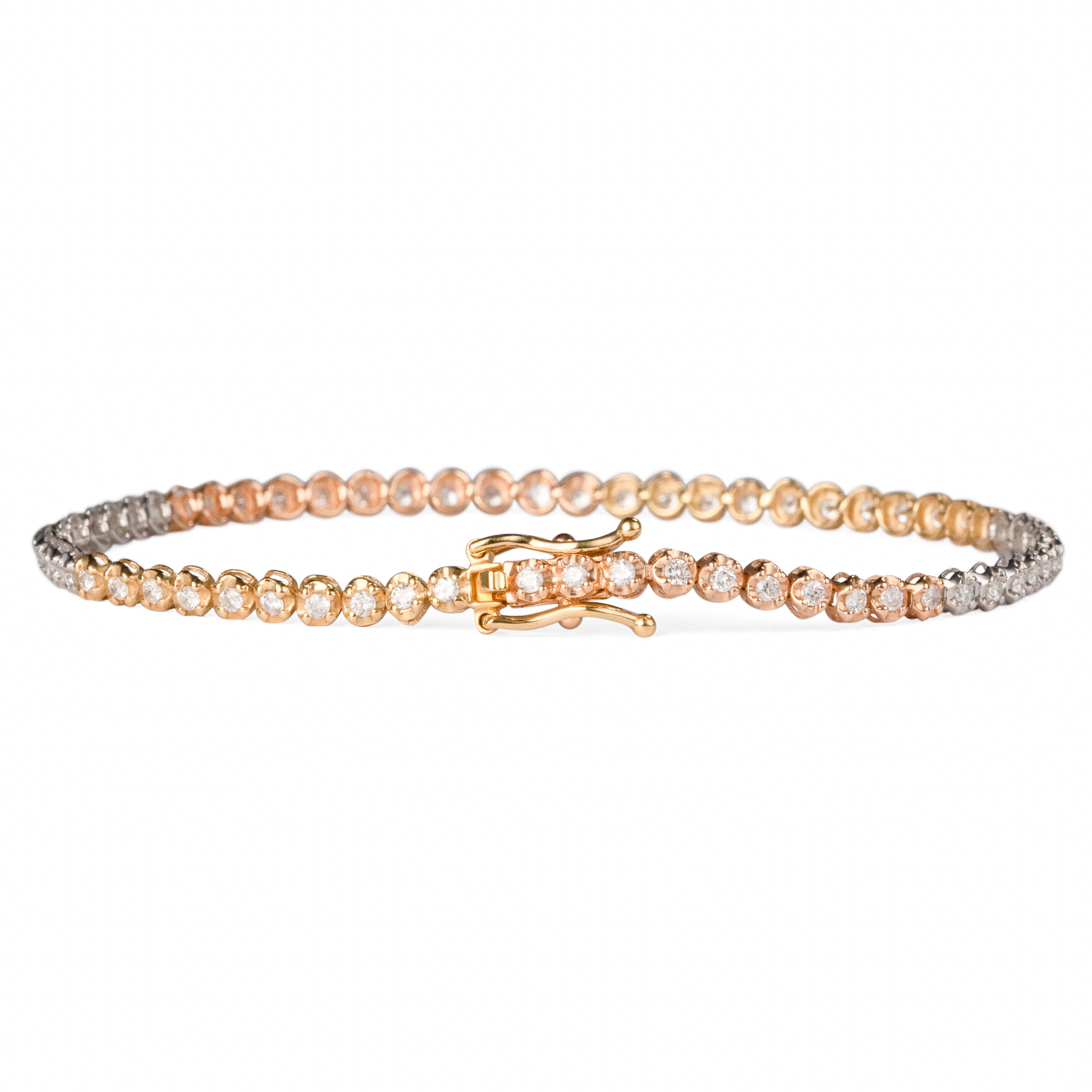 シンプルなテニスブレスレットでありながら、特に注目すべきはその繊細さ。イエロー、ピンク、ホワイトの3色のゴールドを巧みに組み合わせた設計は、多様な魅力を放ち、どんなジュエリーとも自由にコーディネート可能な洗練されたアイテムです。