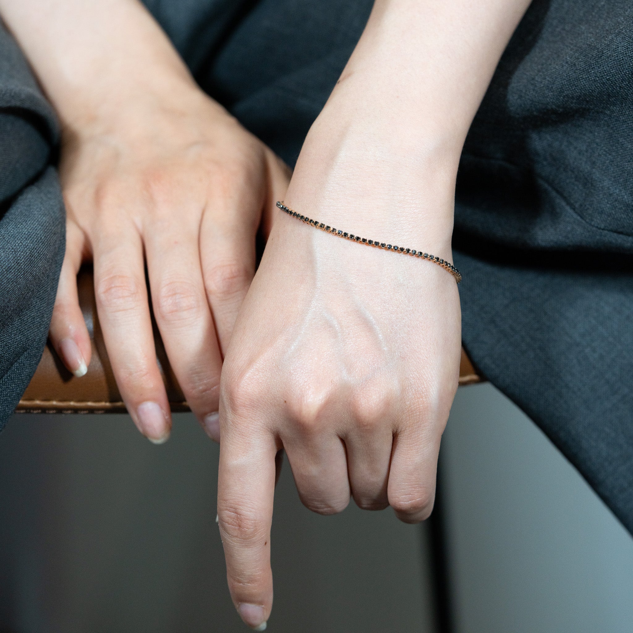 コーディネートを引き締めるブラックアイテムは、どんなスタイルにもマッチします。ラウンドカットのブラックダイヤモンドの丸さが美しく際立ち、繊細さと力強さを同時に宿すテニスブレスレット。Classic ブラックダイヤモンド ブレスレット Sに比べてボリューム感があるユニセックスアイテムです。