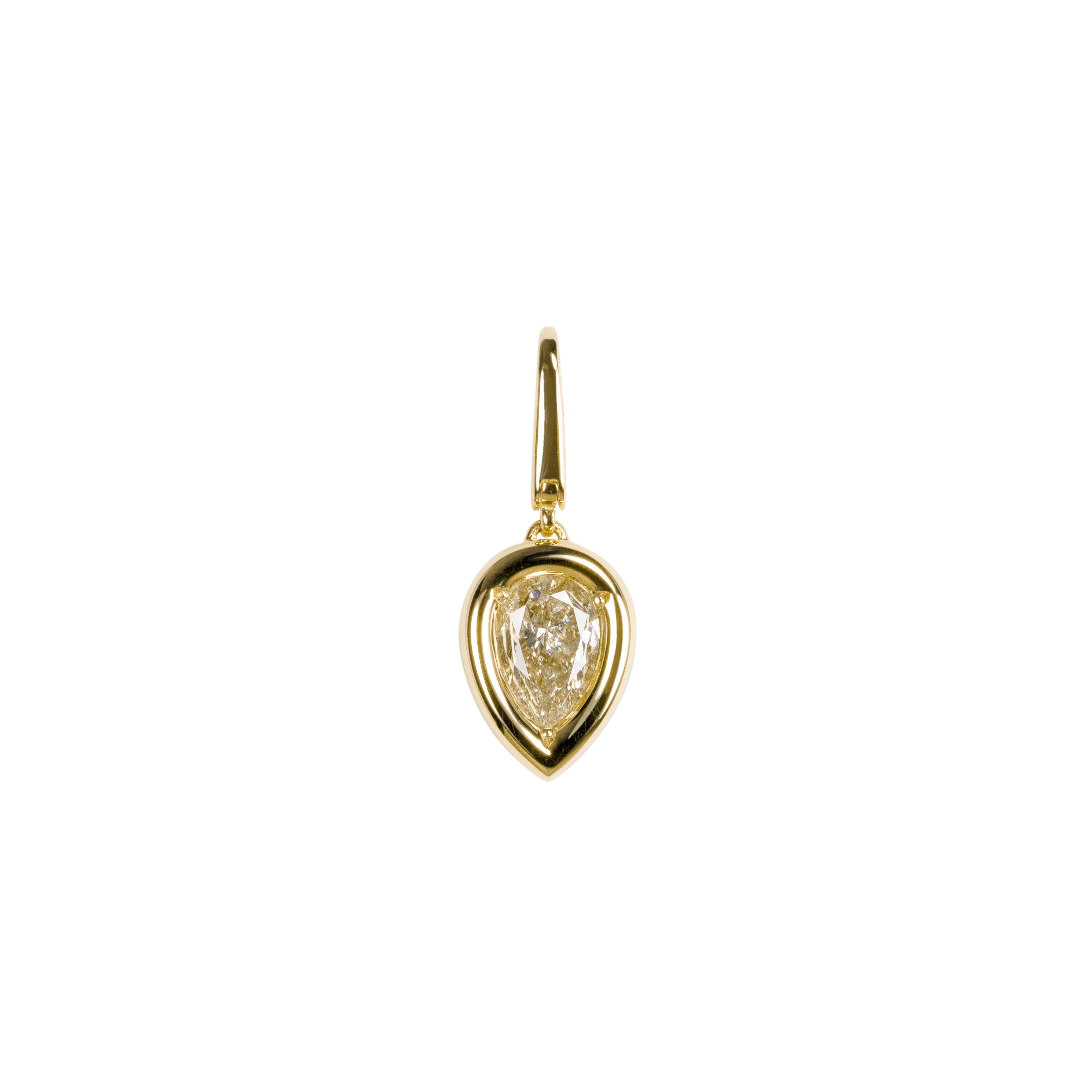 ペアシェイプカットのダイヤモンドを包み込む、たっぷりとしたゴールドボディが魅力のチャーム。横顔や背面まで美しく仕上げたシェイプにこだわり、どの角度から見ても優雅な印象を与えます。厳選された0.9ctアップのダイヤモンドは、1ct以上のボリューム感が楽しめるのも魅力。開閉式の金具により、さまざまなチェーンと組み合わせてお楽しみいただけます。