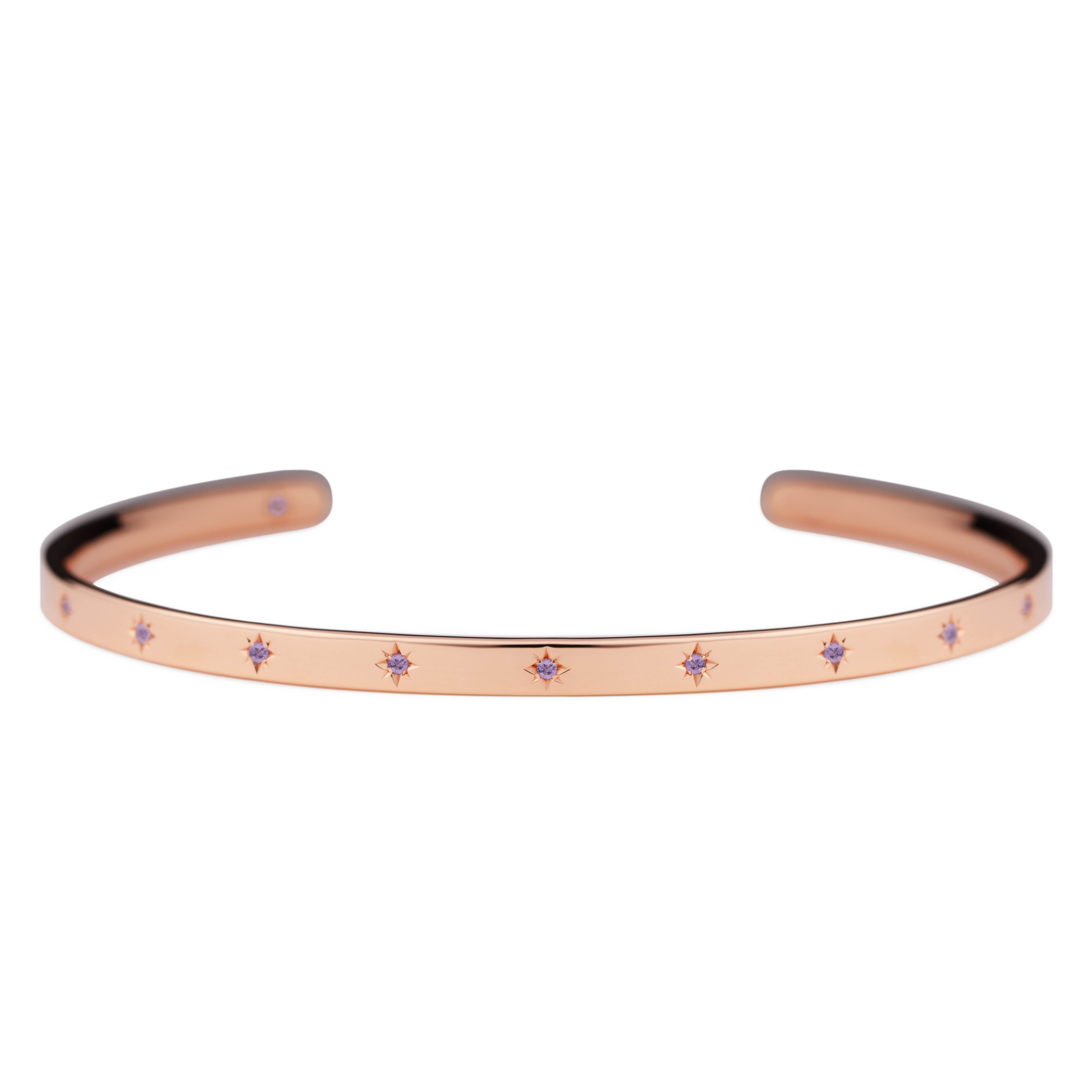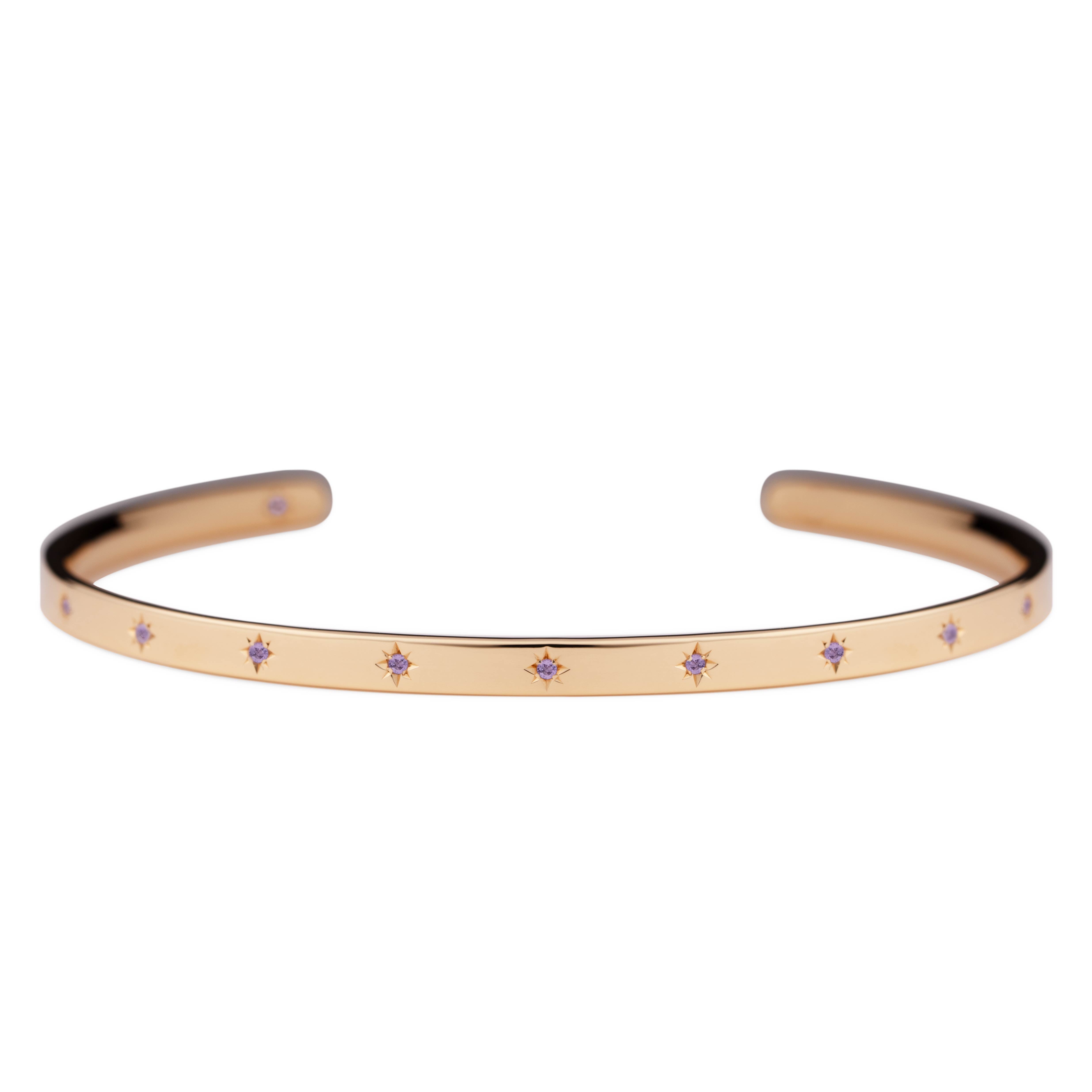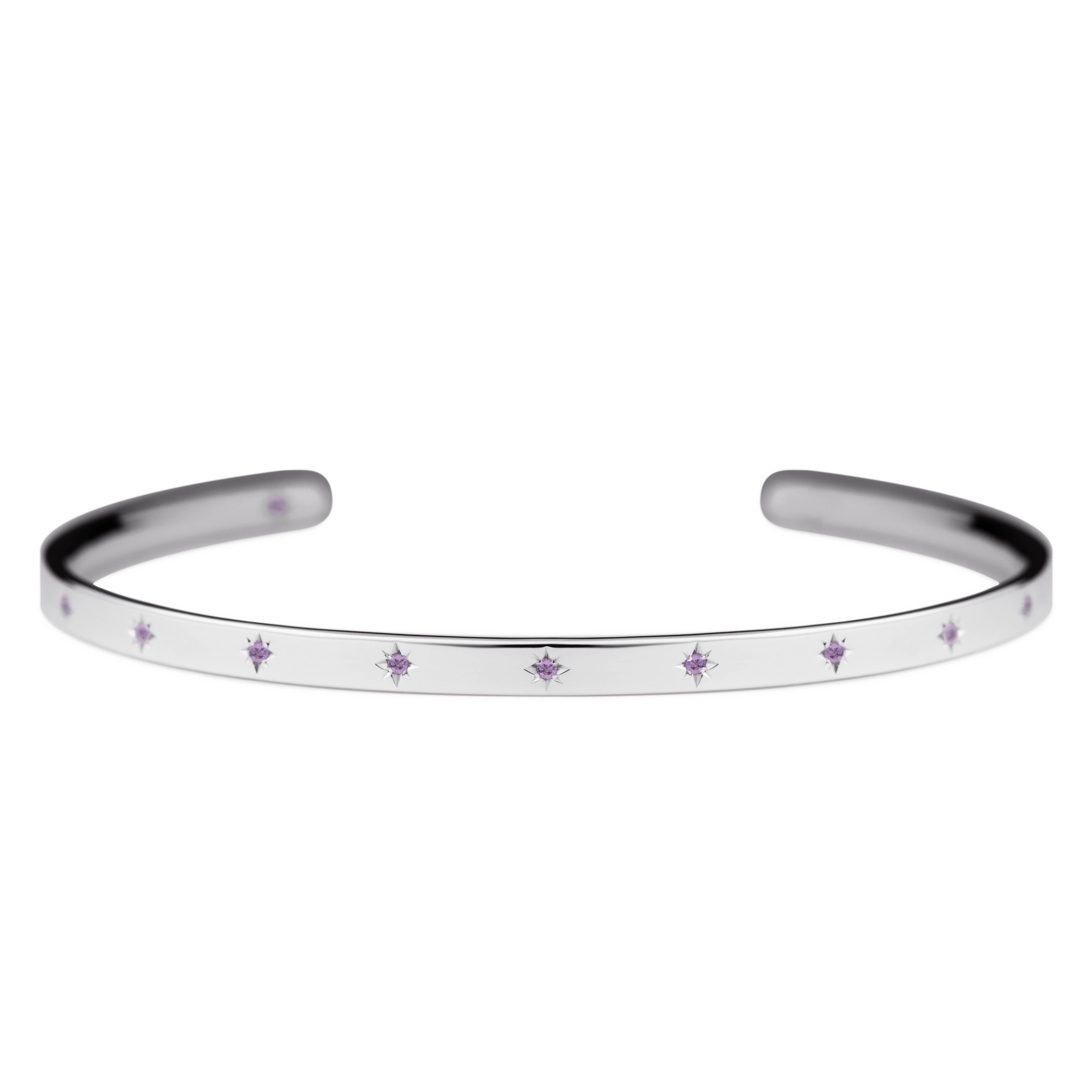 腕に自然に馴染むオーバル(楕円)形状のオープンバングル。2月の誕生石であるアメシストが、星型に手彫りで丁寧に留められています。表面には11の星が輝き、バングルの内側には1つの星がそっと隠れ、身に着ける方を優しく守ります。自分自身を大切にするためのお守りとして。あるいは、パートナーとお揃いで選ぶ、大切な約束の証として。12の星が、どんな日常にも優しく寄り添い、あなたのお手元をそっと輝かせます。オープンバングルは、留め具なしで手首に滑らせるだけで簡単に装着できる実用性と、ユニセックスで楽しめるシンプルなデザインも魅力。