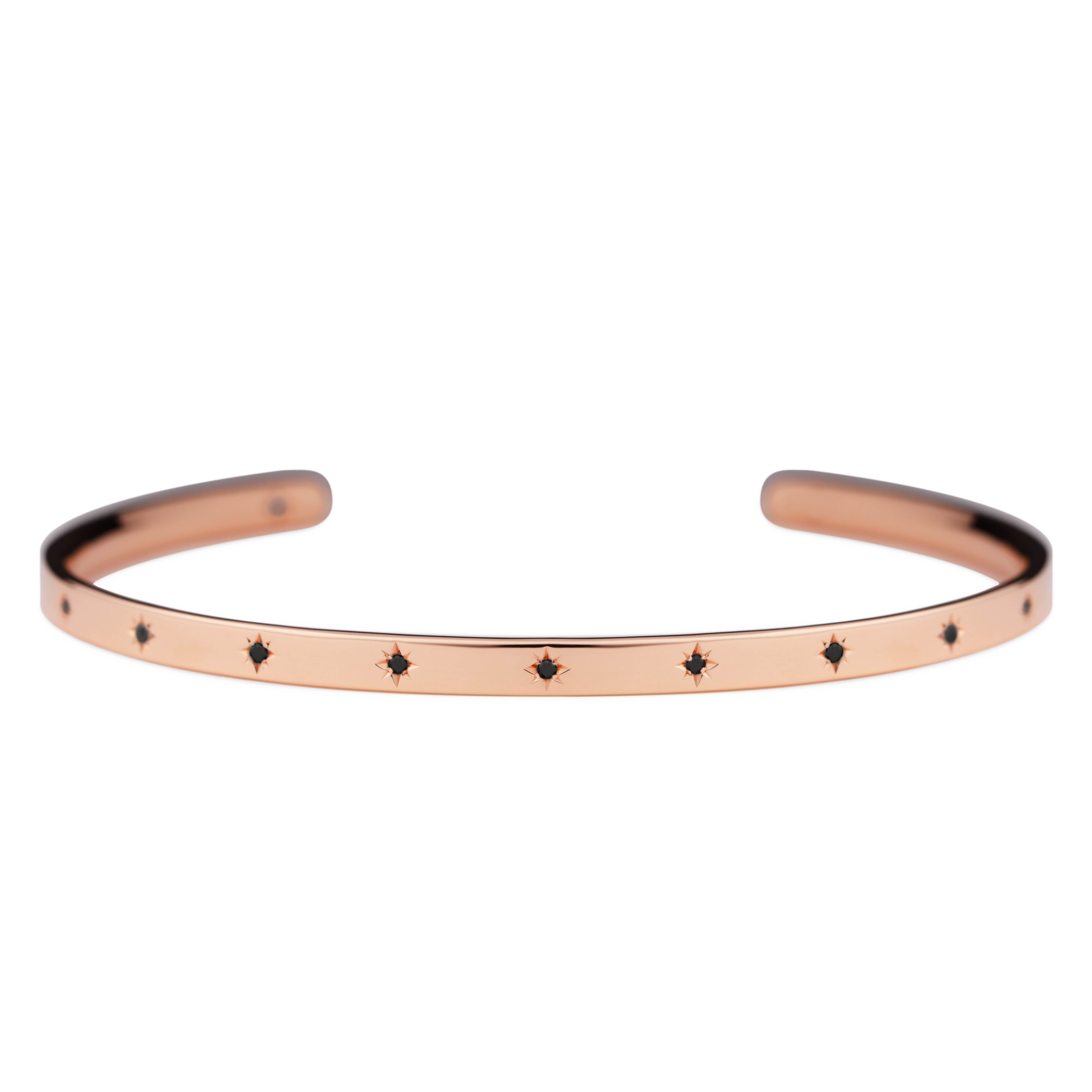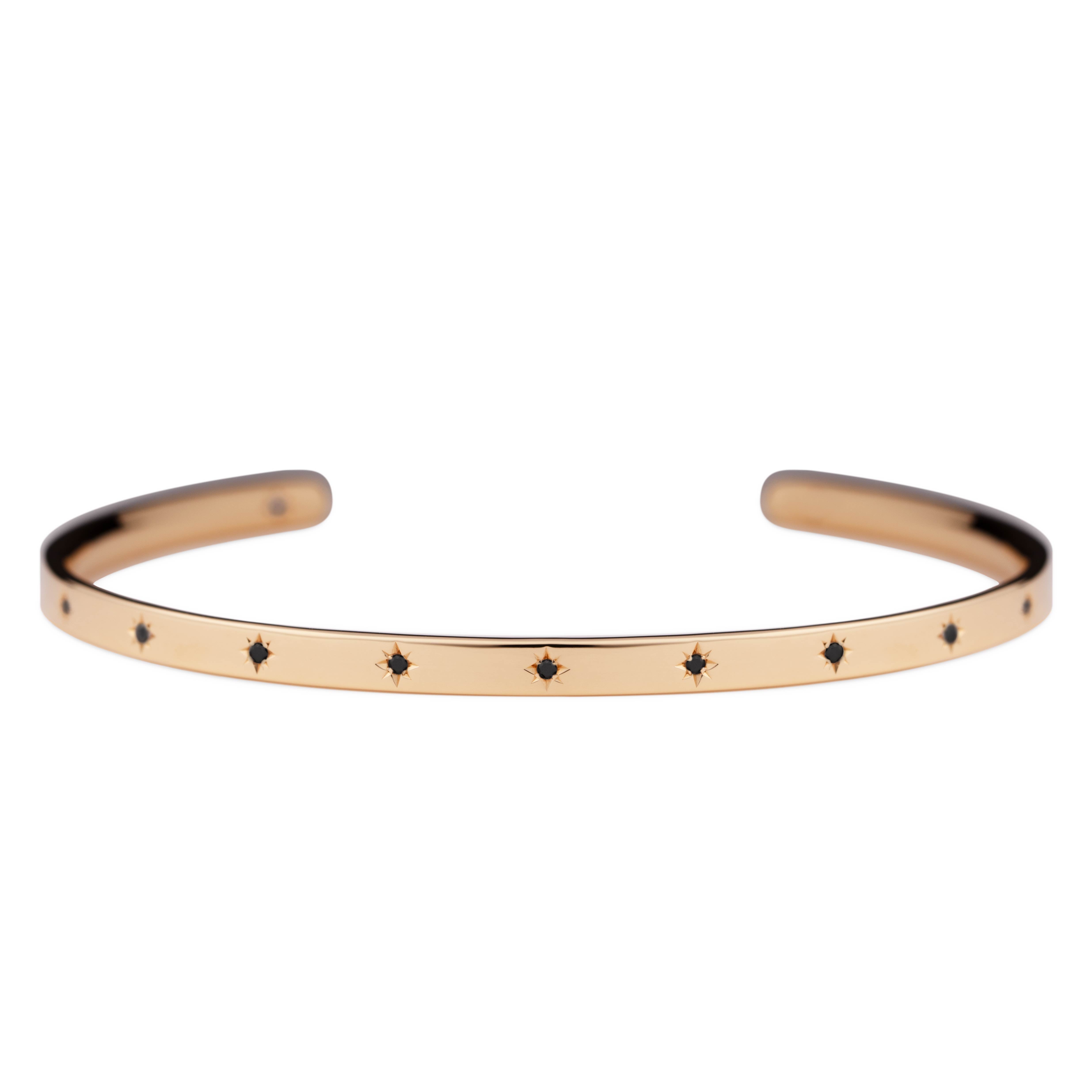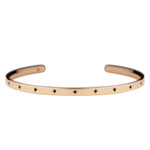 腕に自然に馴染むオーバル(楕円)形状のオープンバングル。4月の誕生石であるブラックダイヤモンドが、星型に手彫りで丁寧に留められています。表面には11の星が輝き、バングルの内側には1つの星がそっと隠れ、身に着ける方を優しく守ります。自分自身を大切にするためのお守りとして。あるいは、パートナーとお揃いで選ぶ、大切な約束の証として。12の星が、どんな日常にも優しく寄り添い、あなたのお手元をそっと輝かせます。オープンバングルは、留め具なしで手首に滑らせるだけで簡単に装着できる実用性と、ユニセックスで楽しめるシンプルなデザインも魅力。