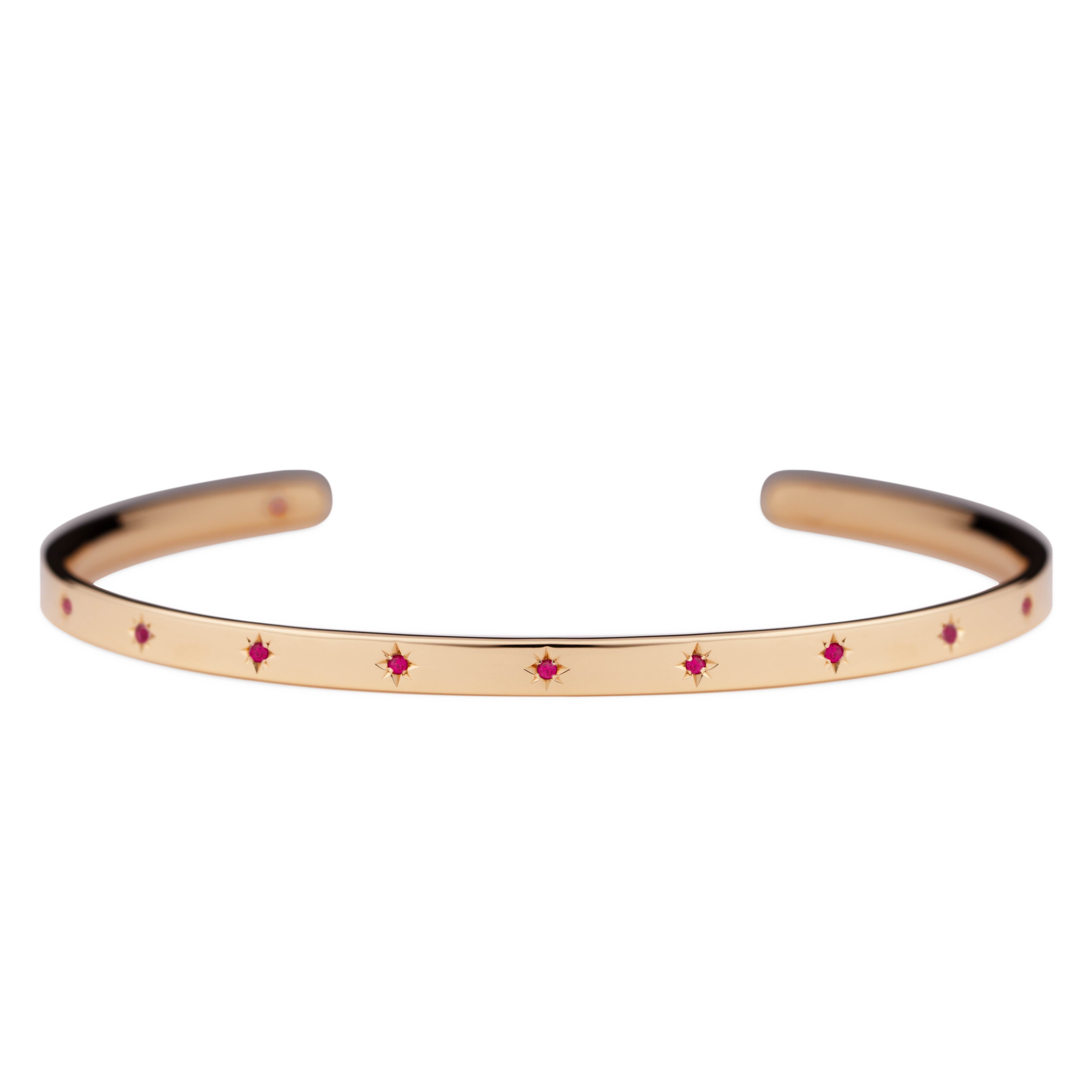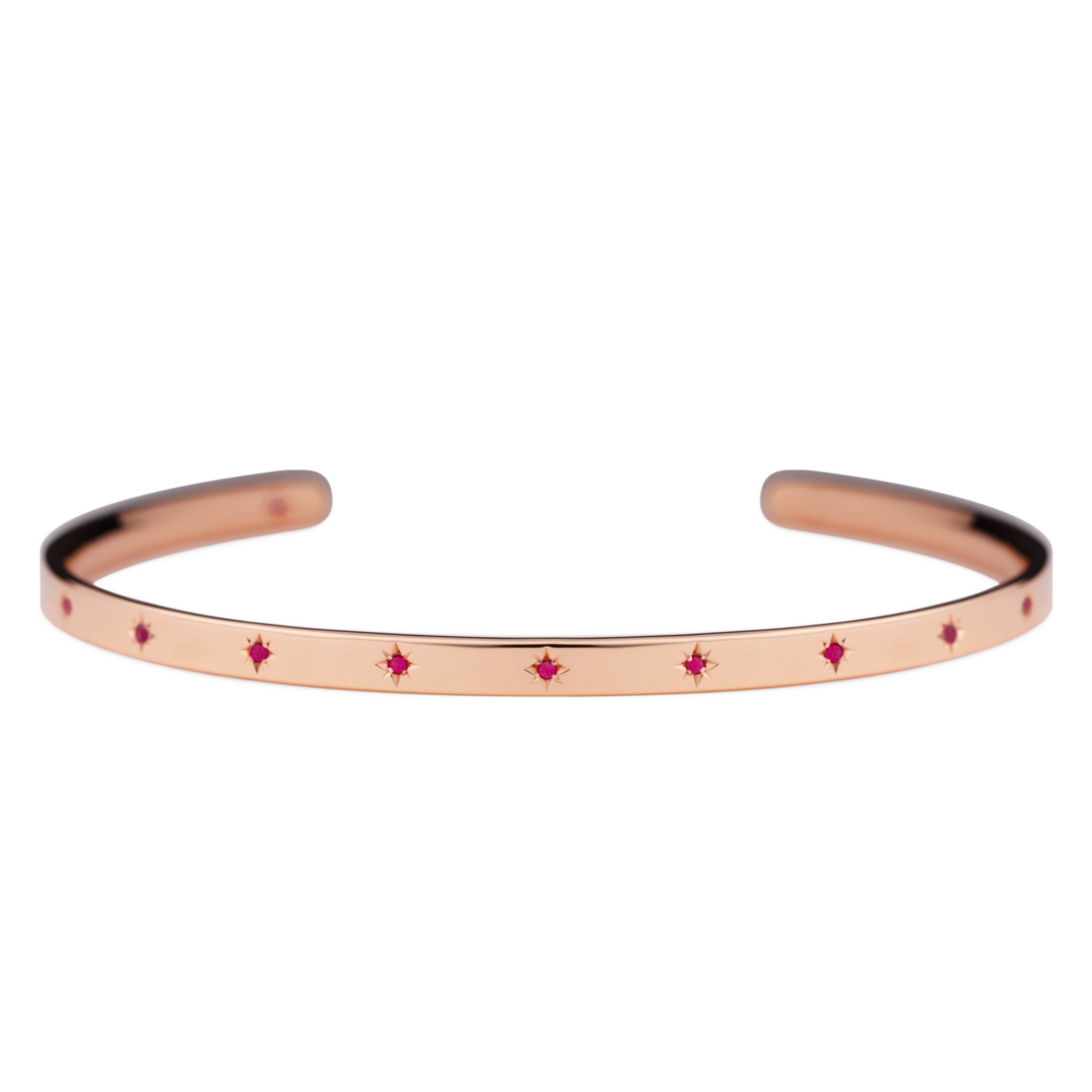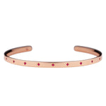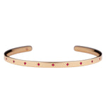 腕に自然に馴染むオーバル(楕円)形状のオープンバングル。8月の誕生石であるピンクスピネルが、星型に手彫りで丁寧に留められています。表面には11の星が輝き、バングルの内側には1つの星がそっと隠れ、身に着ける方を優しく守ります。自分自身を大切にするためのお守りとして。あるいは、パートナーとお揃いで選ぶ、大切な約束の証として。12の星が、どんな日常にも優しく寄り添い、あなたのお手元をそっと輝かせます。オープンバングルは、留め具なしで手首に滑らせるだけで簡単に装着できる実用性と、ユニセックスで楽しめるシンプルなデザインも魅力。