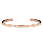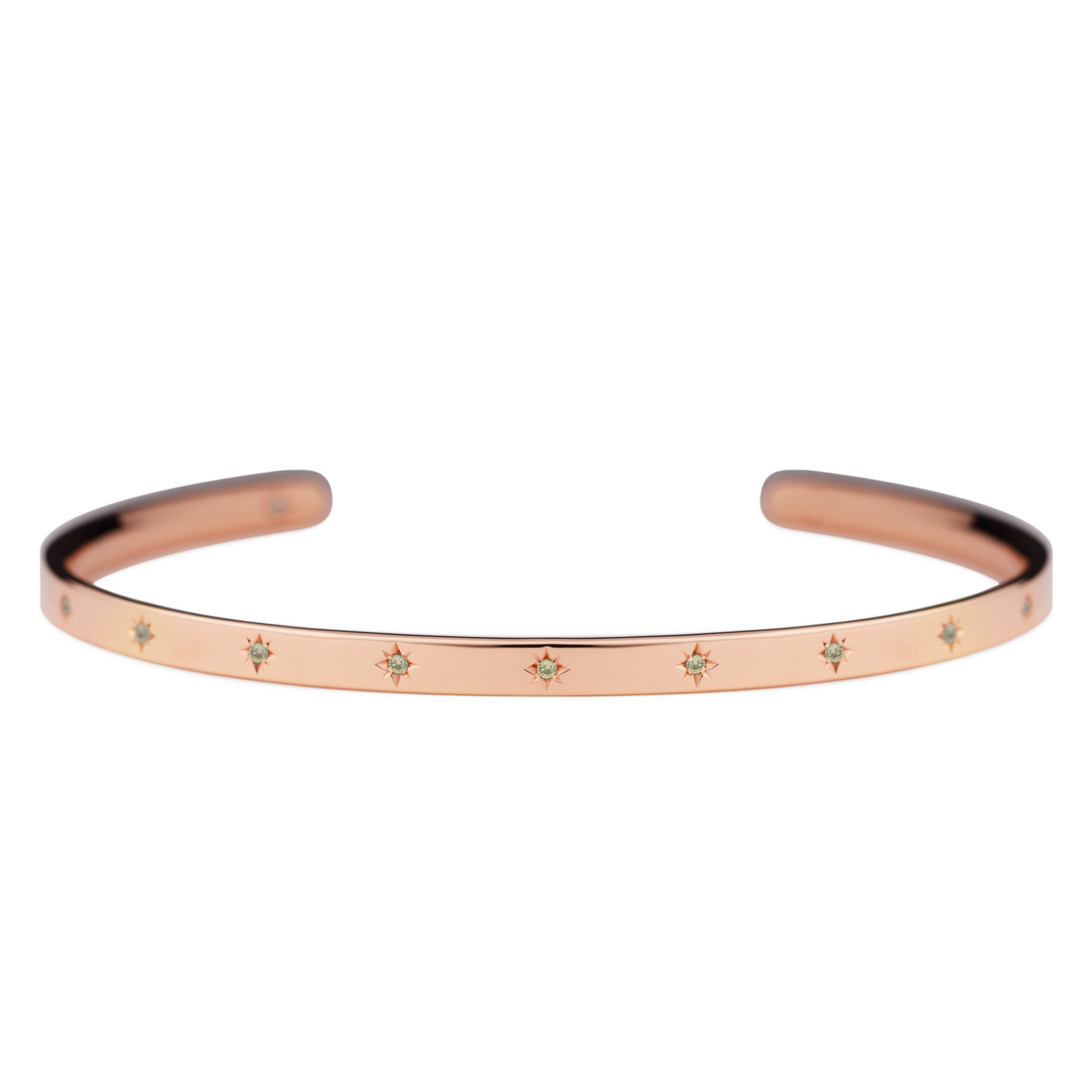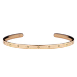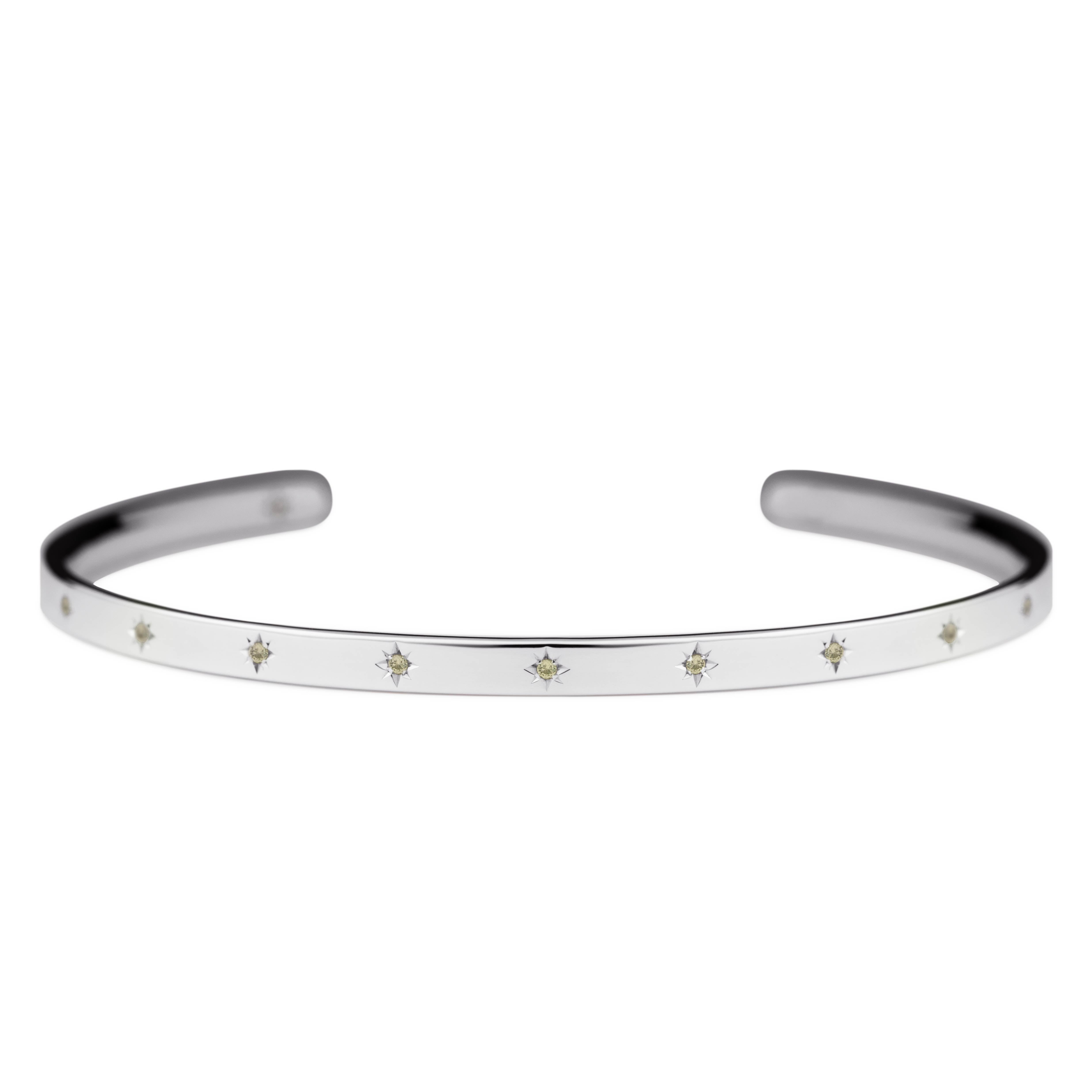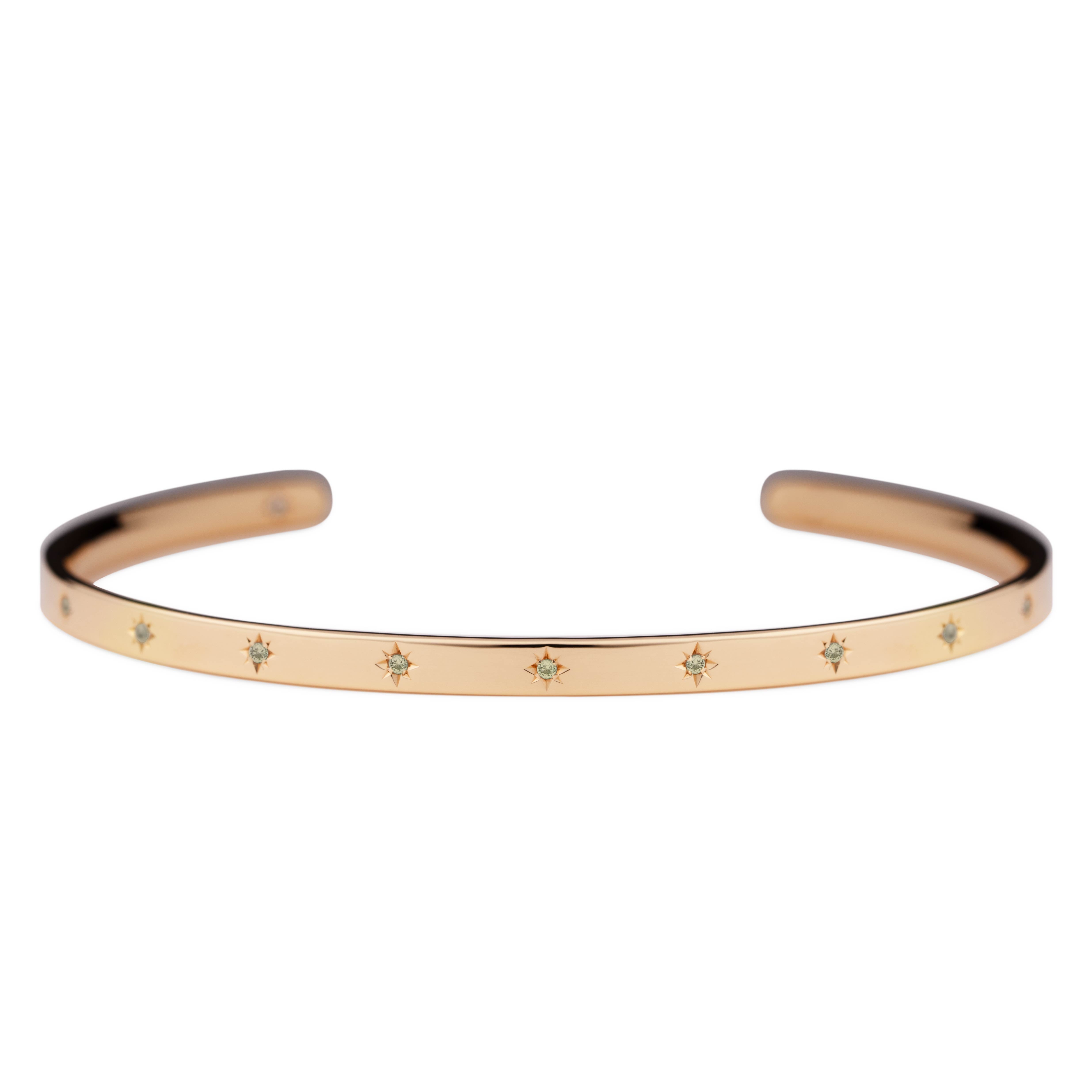 腕に自然に馴染むオーバル(楕円)形状のオープンバングル。8月の誕生石であるペリドットが、星型に手彫りで丁寧に留められています。表面には11の星が輝き、バングルの内側には1つの星がそっと隠れ、身に着ける方を優しく守ります。自分自身を大切にするためのお守りとして。あるいは、パートナーとお揃いで選ぶ、大切な約束の証として。12の星が、どんな日常にも優しく寄り添い、あなたのお手元をそっと輝かせます。オープンバングルは、留め具なしで手首に滑らせるだけで簡単に装着できる実用性と、ユニセックスで楽しめるシンプルなデザインも魅力。