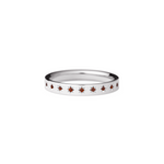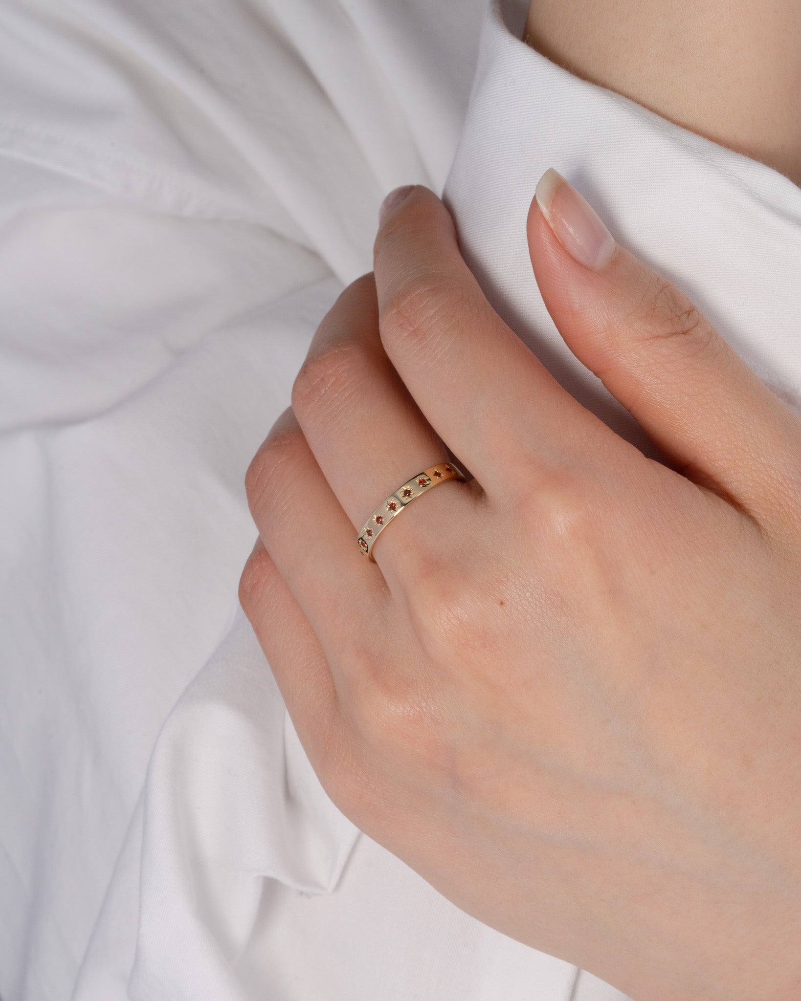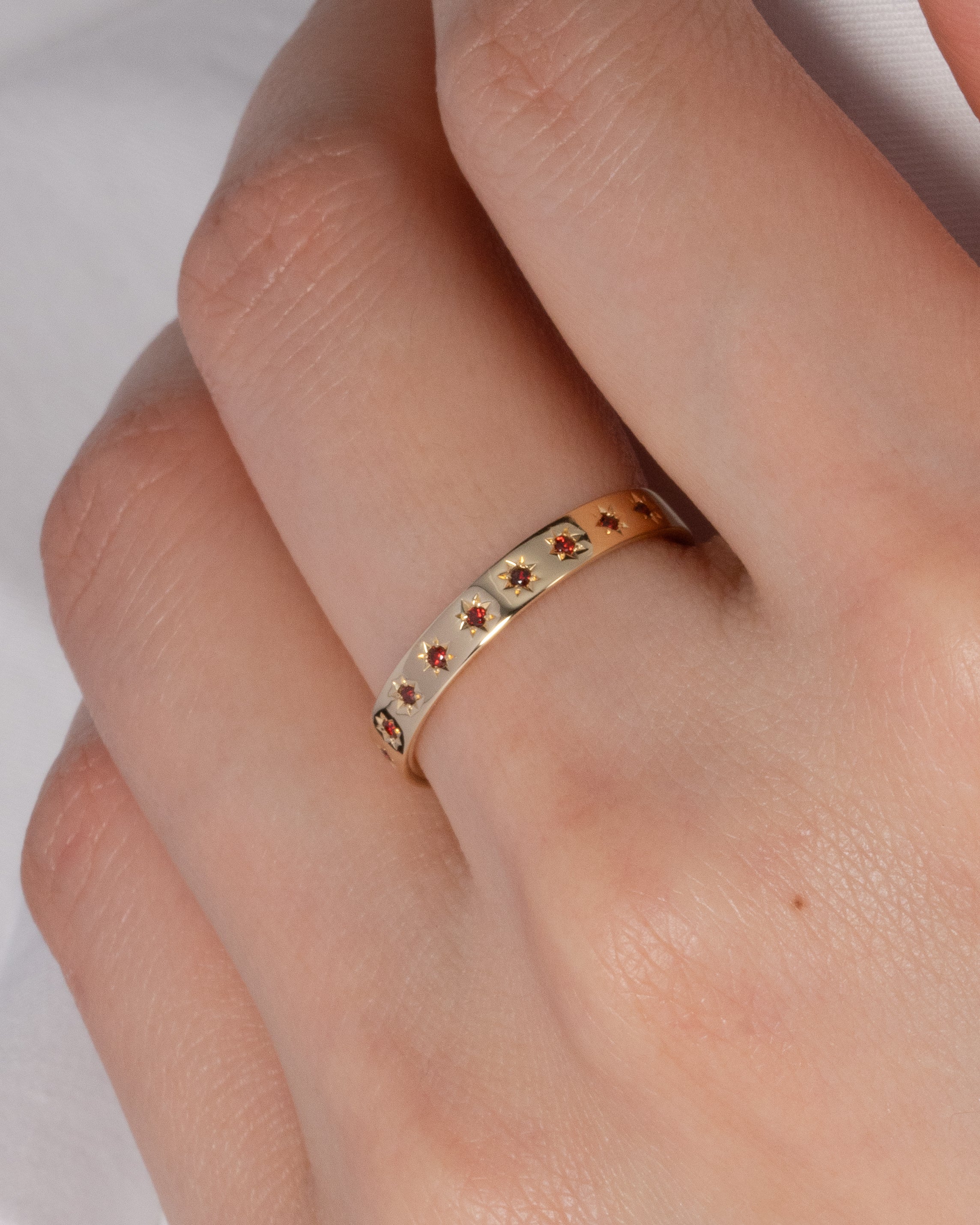 指に自然と馴染む平打ちリング。内甲丸仕上げで、快適な付け心地を実現。1月の誕生石であるガーネットが、星型に手彫りで丁寧に留められています。表面には11の星が輝き、リングの内側には1の星がそっと隠れ、身に着ける方を優しく守ります。自分自身を大切にするためのお守りとして。あるいは、パートナーとお揃いで選ぶ、大切な約束の証として。12の星が、どんな日常にも優しく寄り添い、あなたを照らし続けます。
