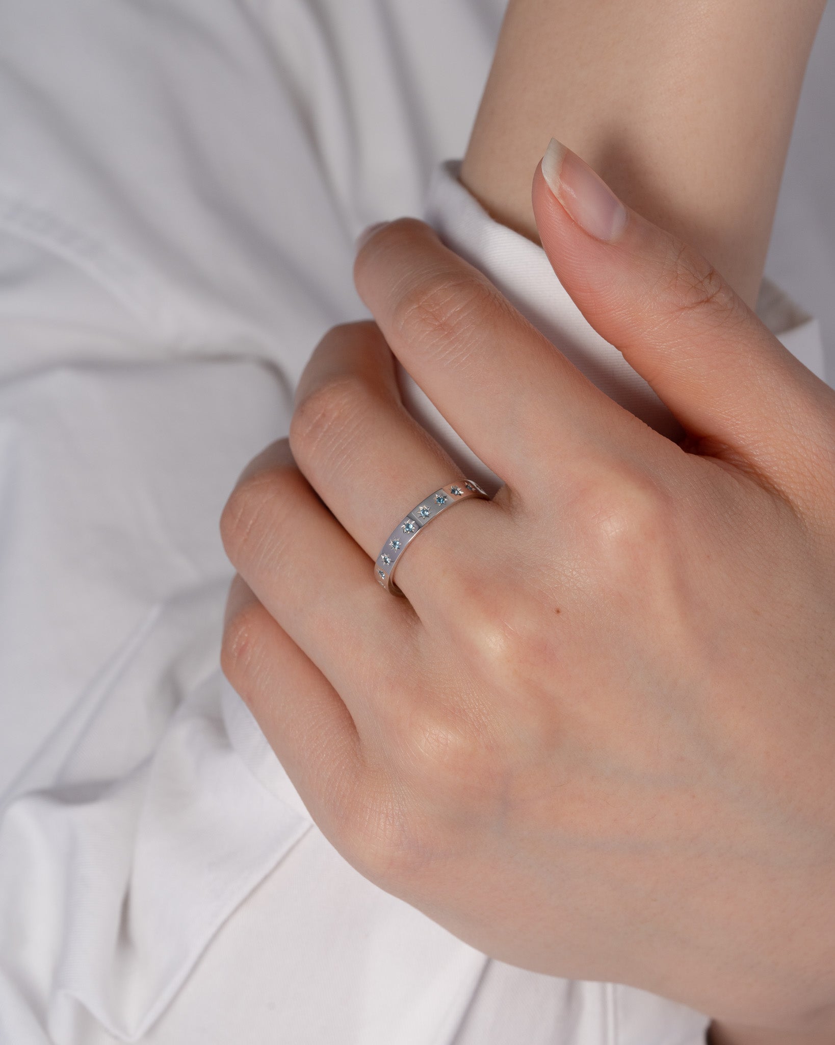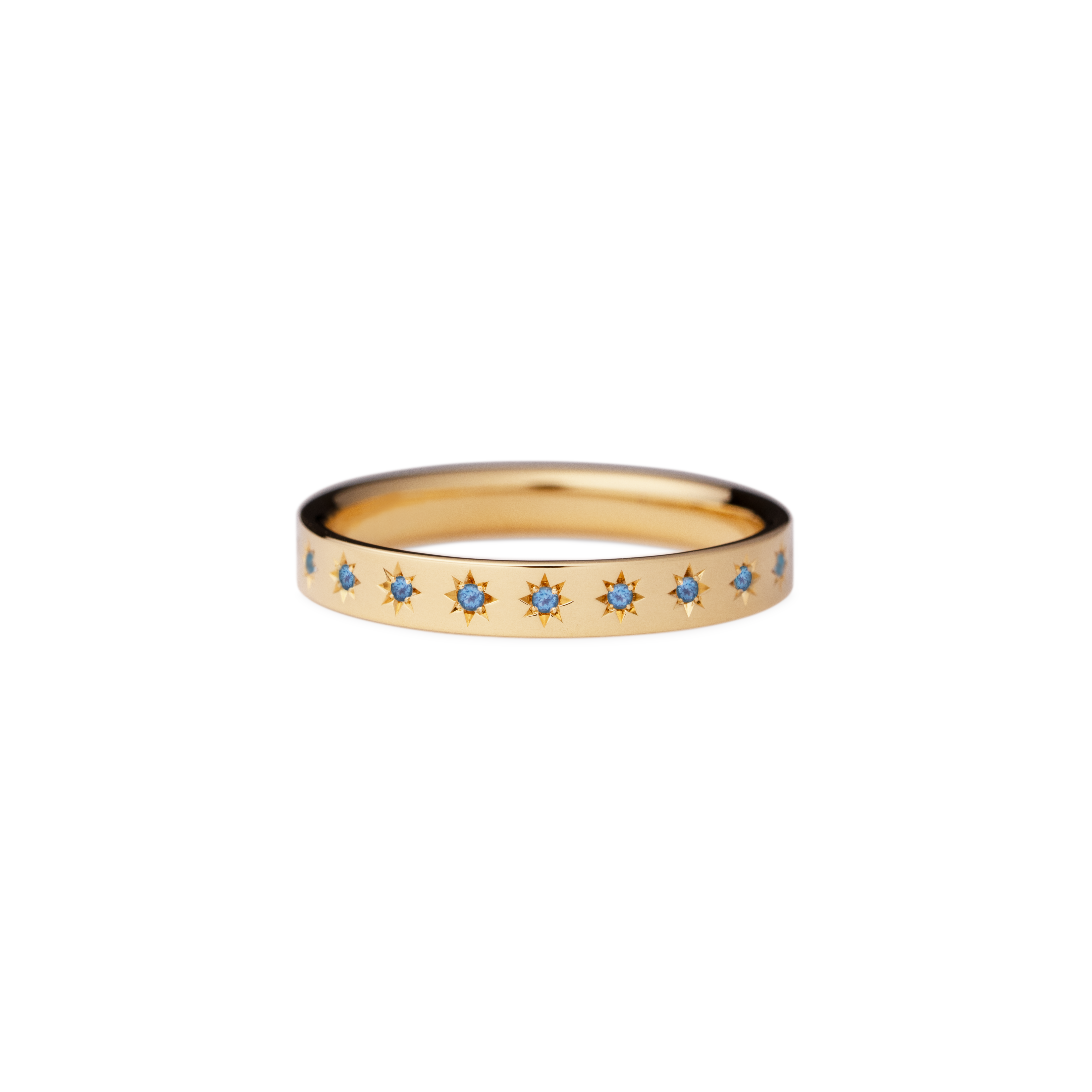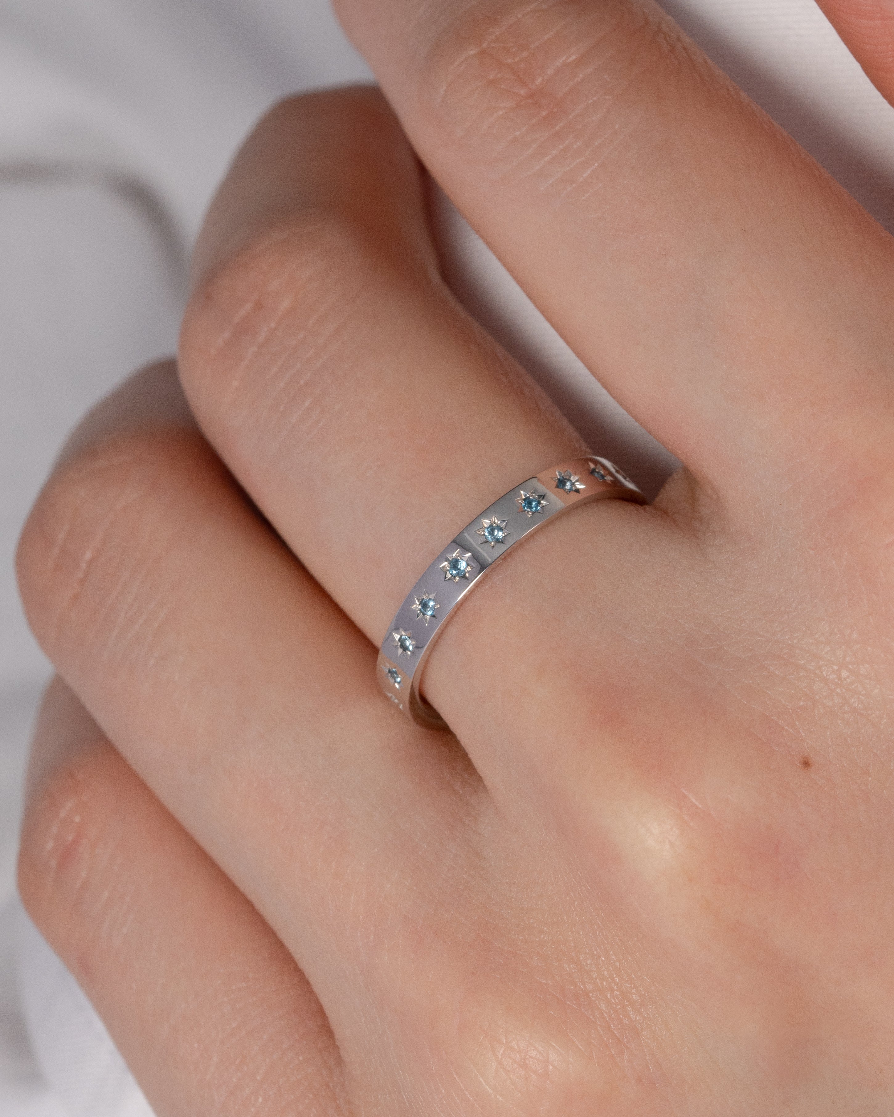指に自然と馴染む平打ちリング。内甲丸仕上げで、快適な付け心地を実現。11月の誕生石であるロンドンブルートパーズが、星型に手彫りで丁寧に留められています。表面には11の星が輝き、リングの内側には1つの星がそっと隠れ、身に着ける方を優しく守ります。自分自身を大切にするためのお守りとして。あるいは、パートナーとお揃いで選ぶ、大切な約束の証として。12の星が、どんな日常にも優しく寄り添い、あなたを照らし続けます。
