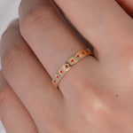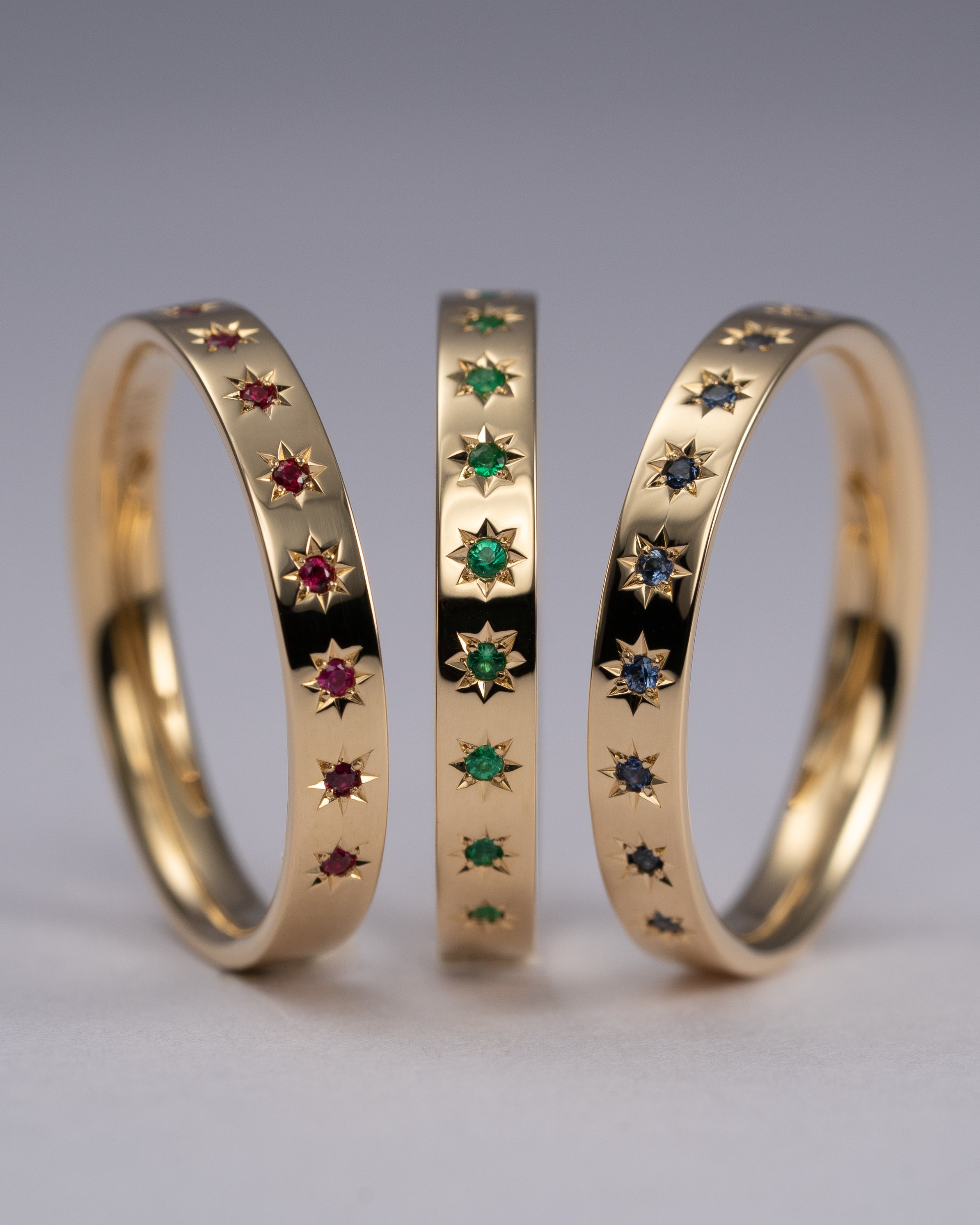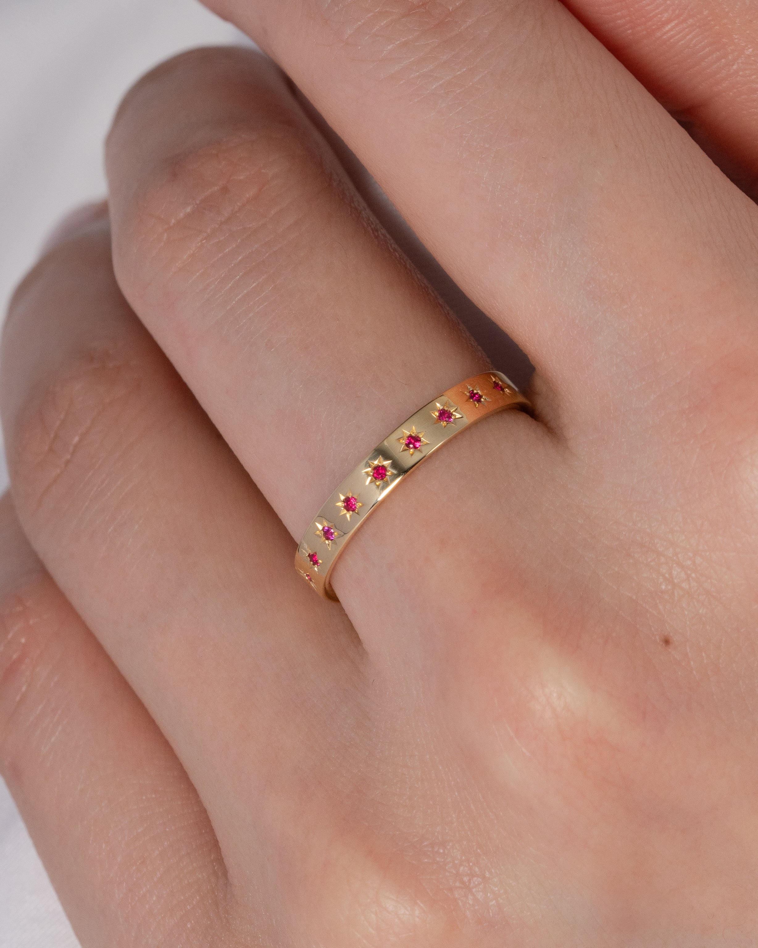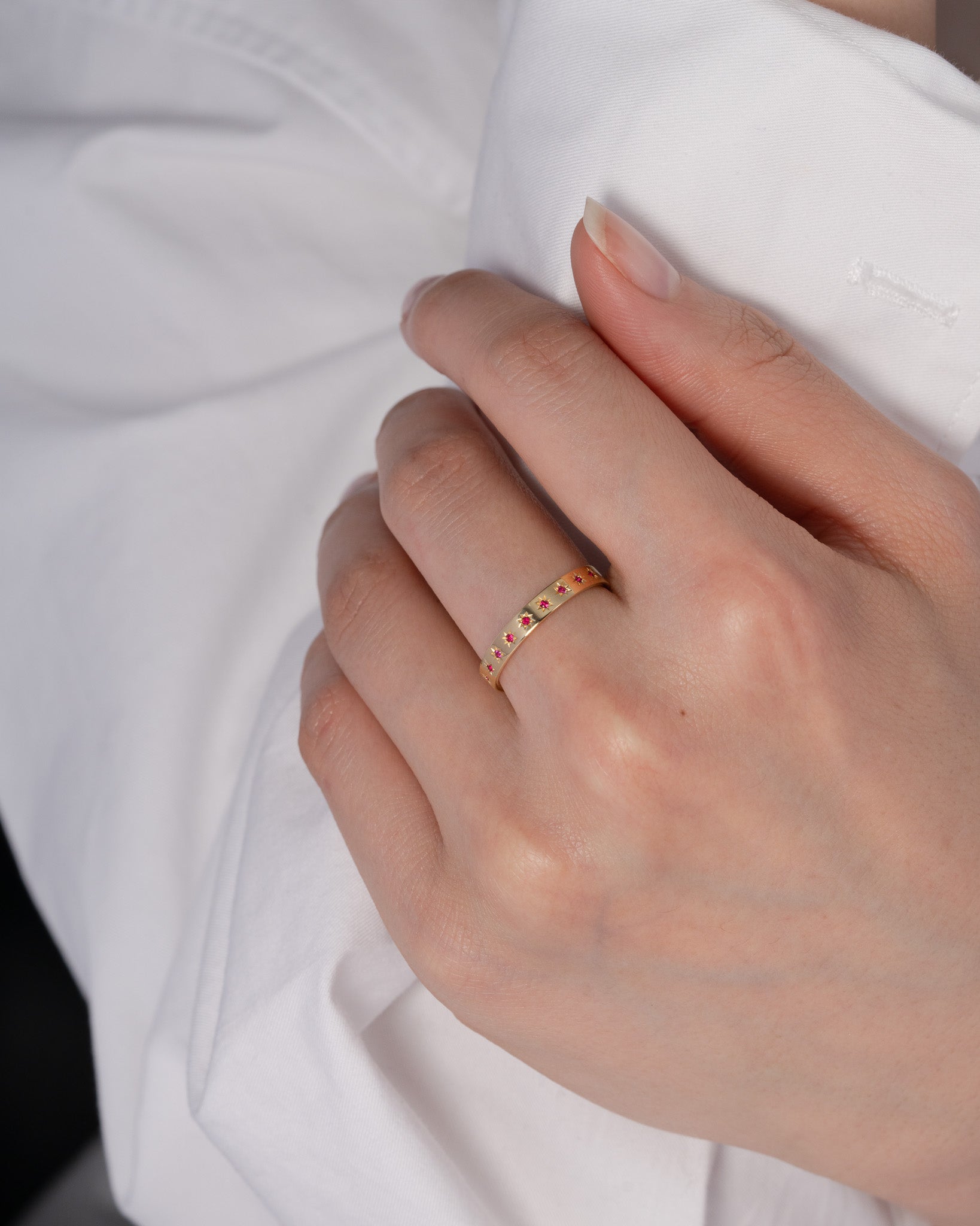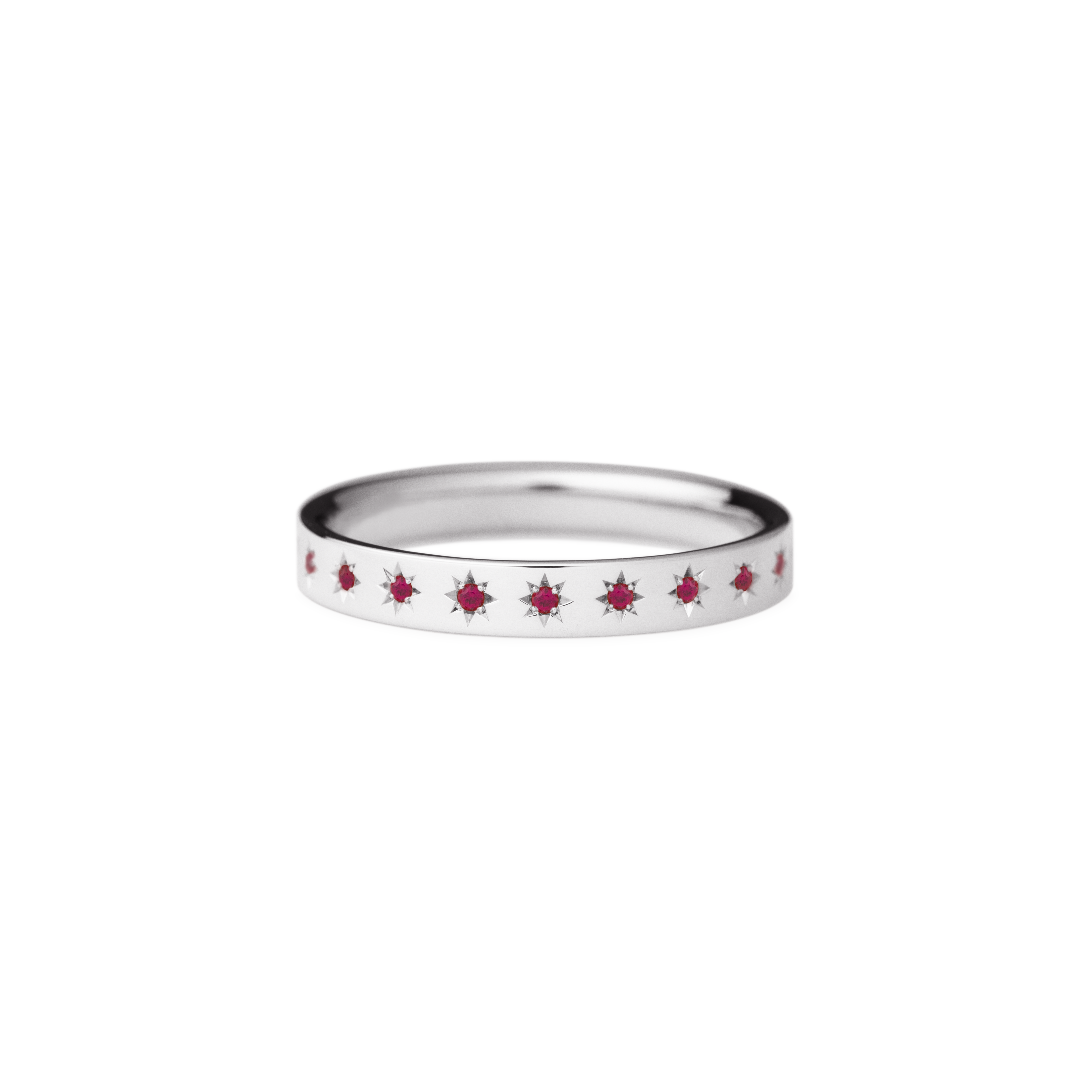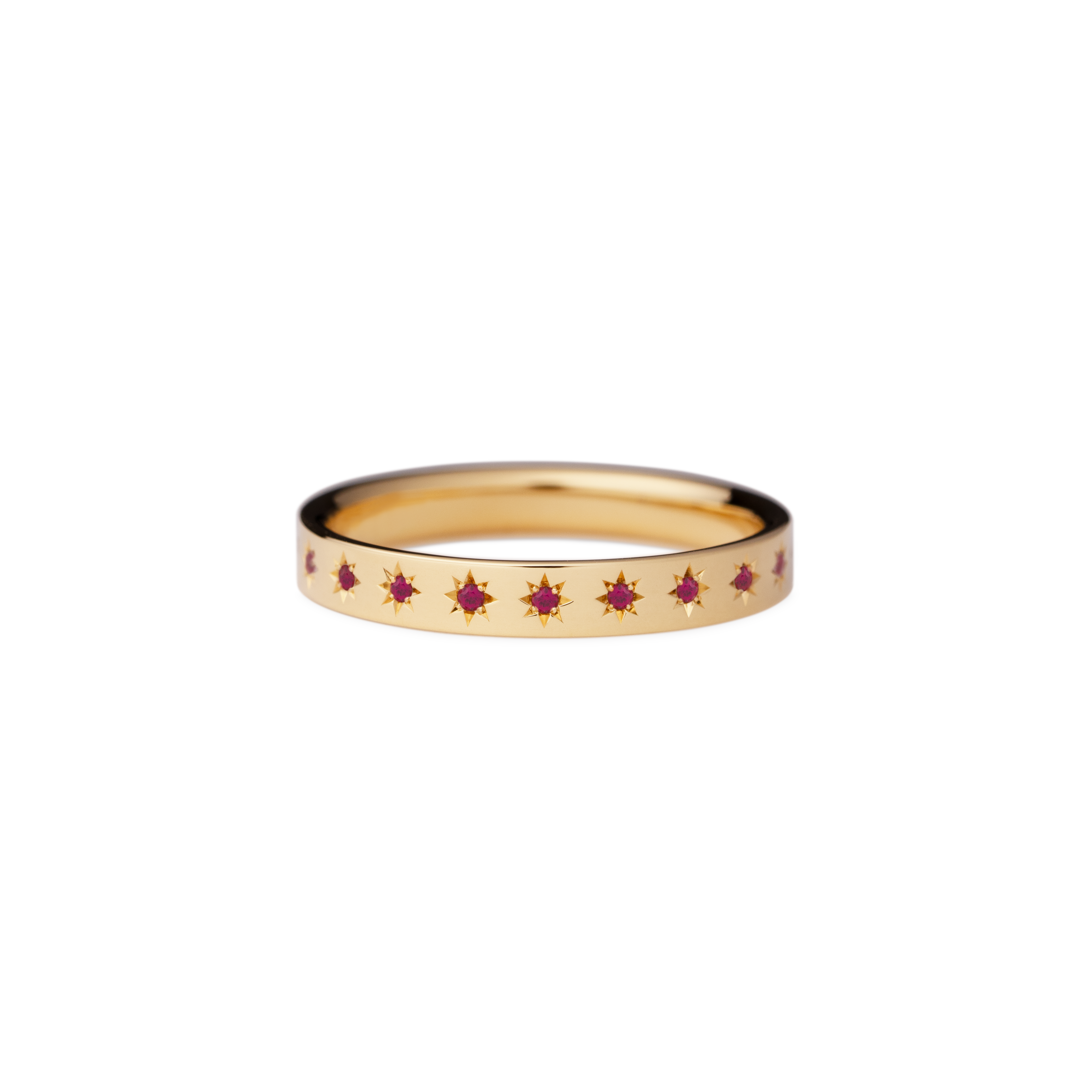 指に自然と馴染む平打ちリング。内甲丸仕上げで、快適な付け心地を実現。7月の誕生石であるルビーが、星型に手彫りで丁寧に留められています。表面には11の星が輝き、リングの内側には1つの星がそっと隠れ、身に着ける方を優しく守ります。自分自身を大切にするためのお守りとして。あるいは、パートナーとお揃いで選ぶ、大切な約束の証として。12の星が、どんな日常にも優しく寄り添い、あなたを照らし続けます。