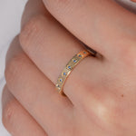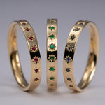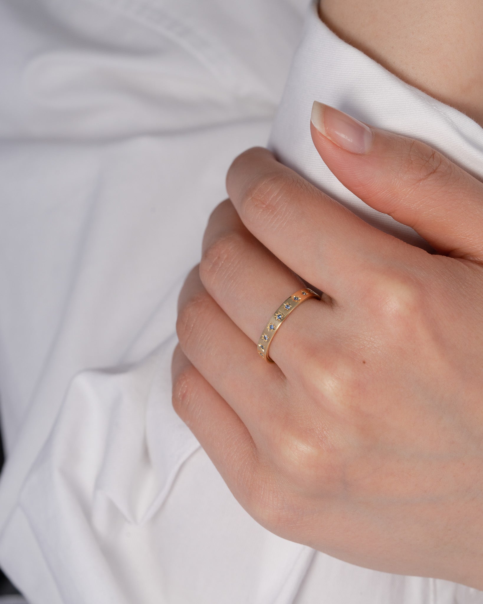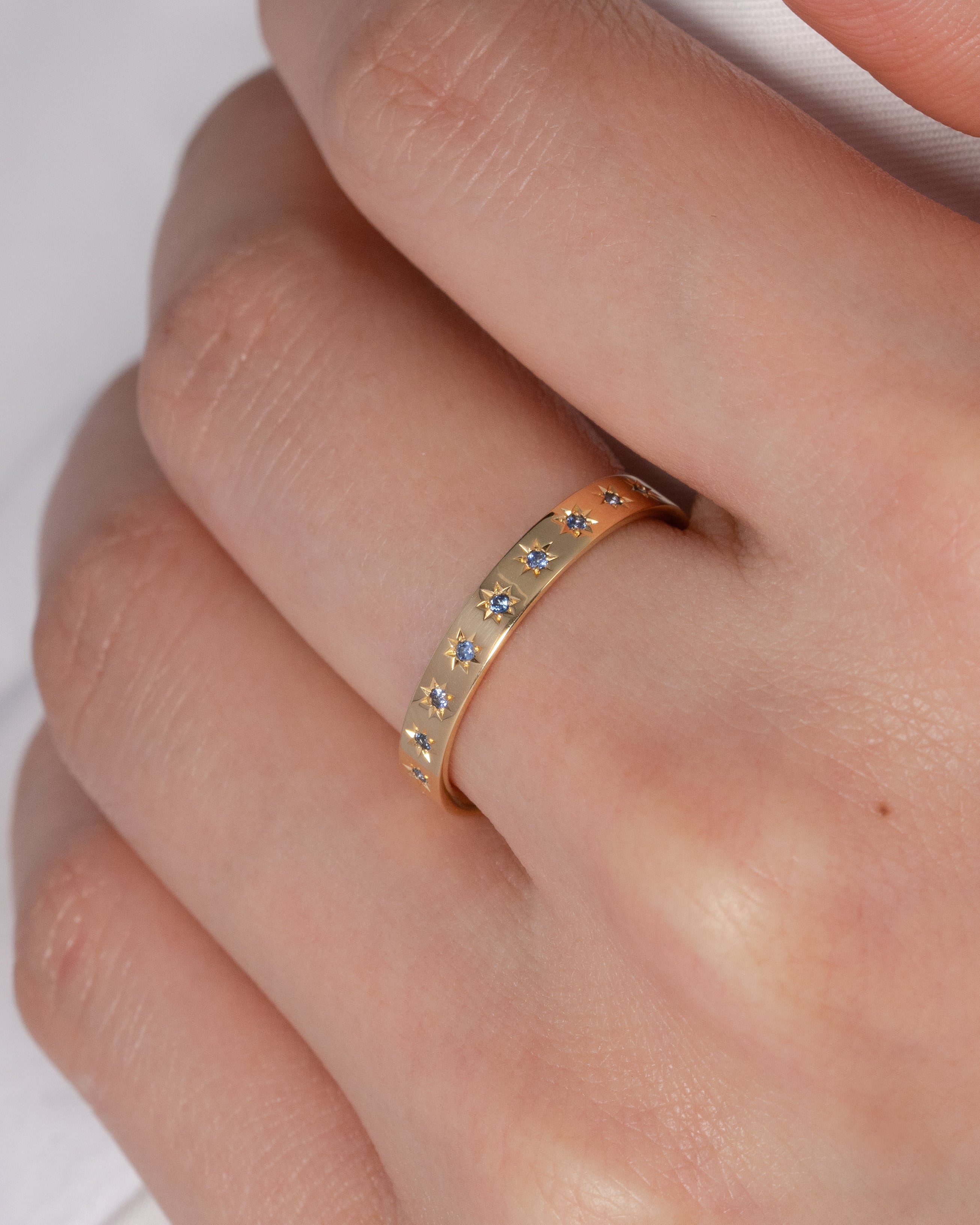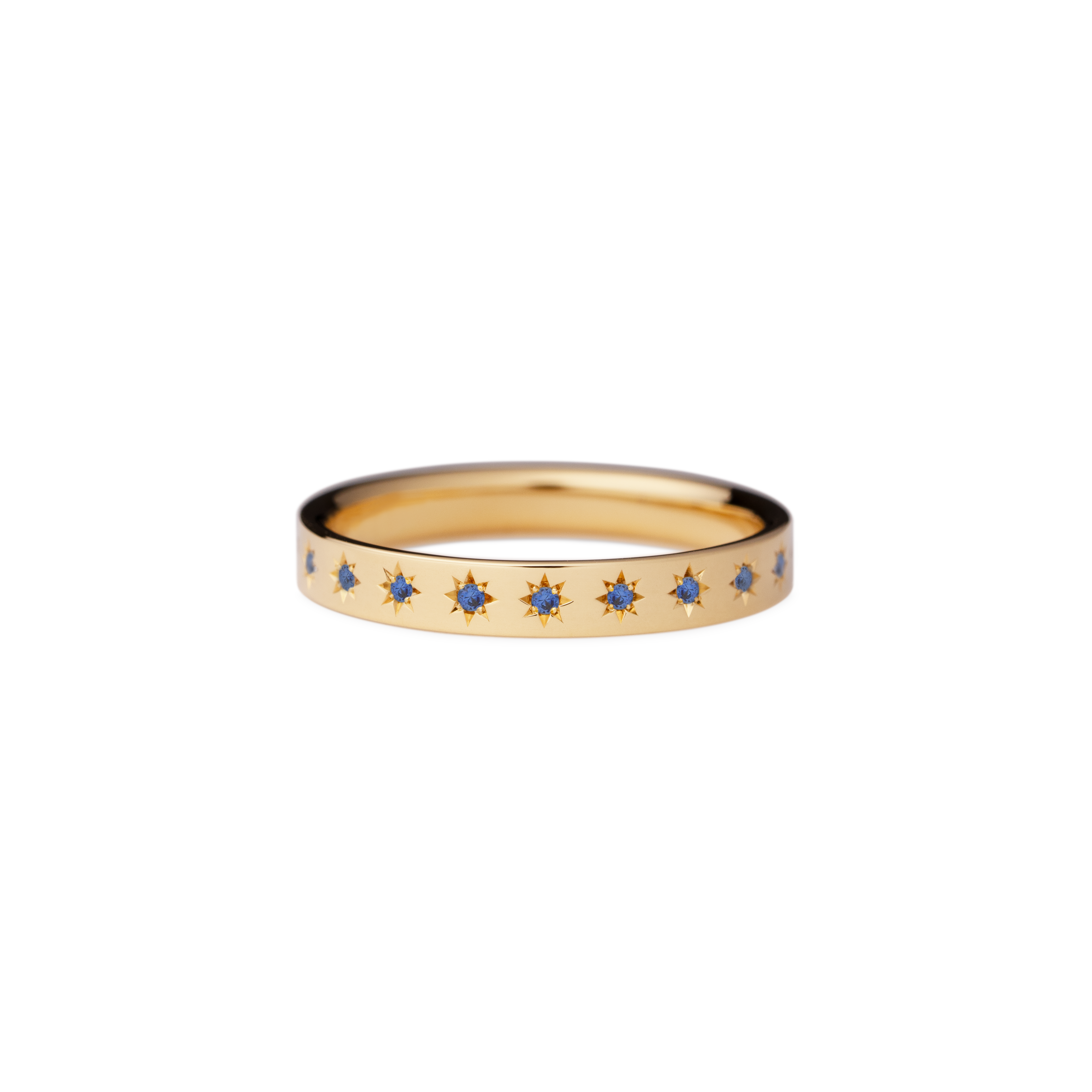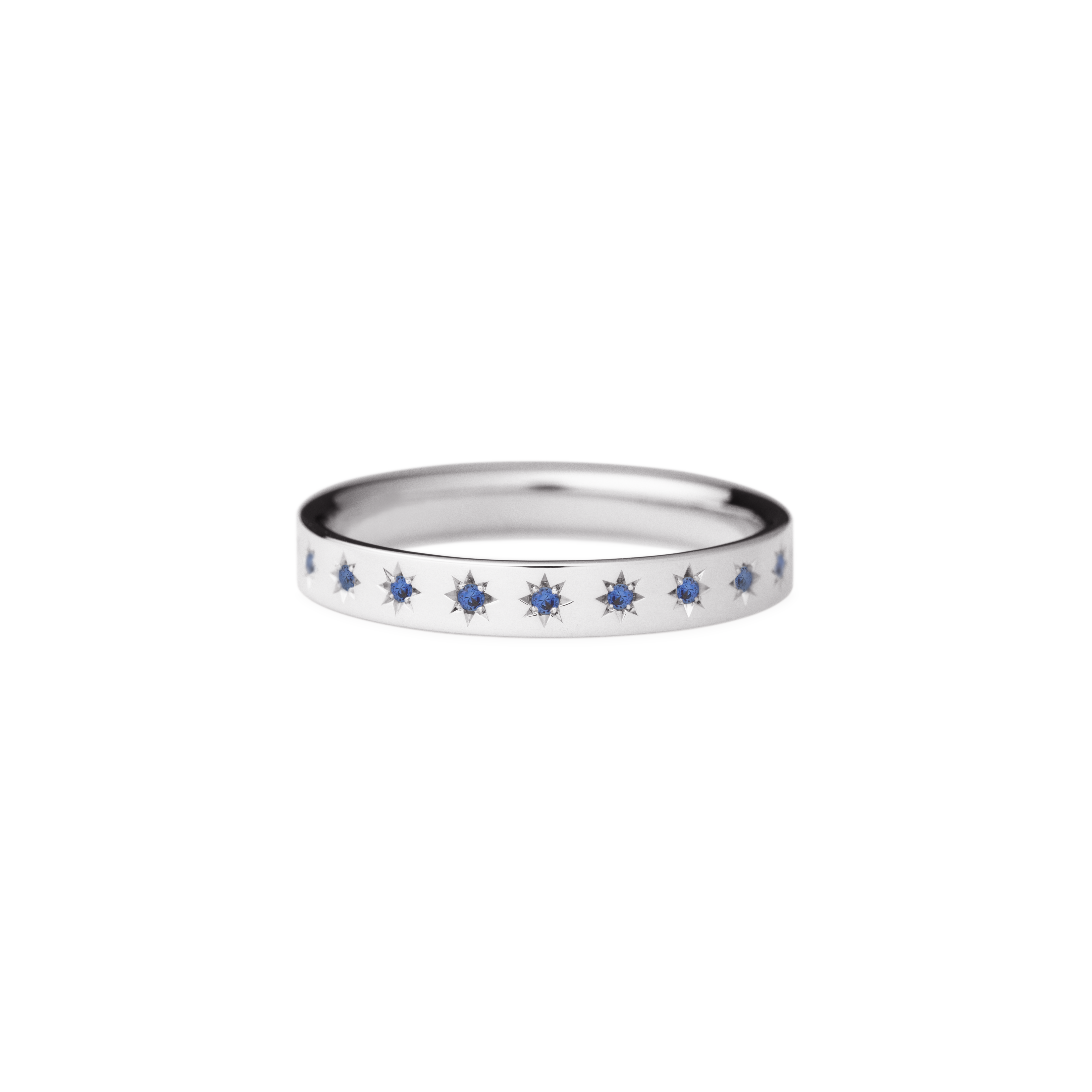 指に自然と馴染む平打ちリング。内甲丸仕上げで、快適な付け心地を実現。9月の誕生石であるサファイアが、星型に手彫りで丁寧に留められています。表面には11の星が輝き、リングの内側には1つの星がそっと隠れ、身に着ける方を優しく守ります。自分自身を大切にするためのお守りとして。あるいは、パートナーとお揃いで選ぶ、大切な約束の証として。12の星が、どんな日常にも優しく寄り添い、あなたを照らし続けます。
