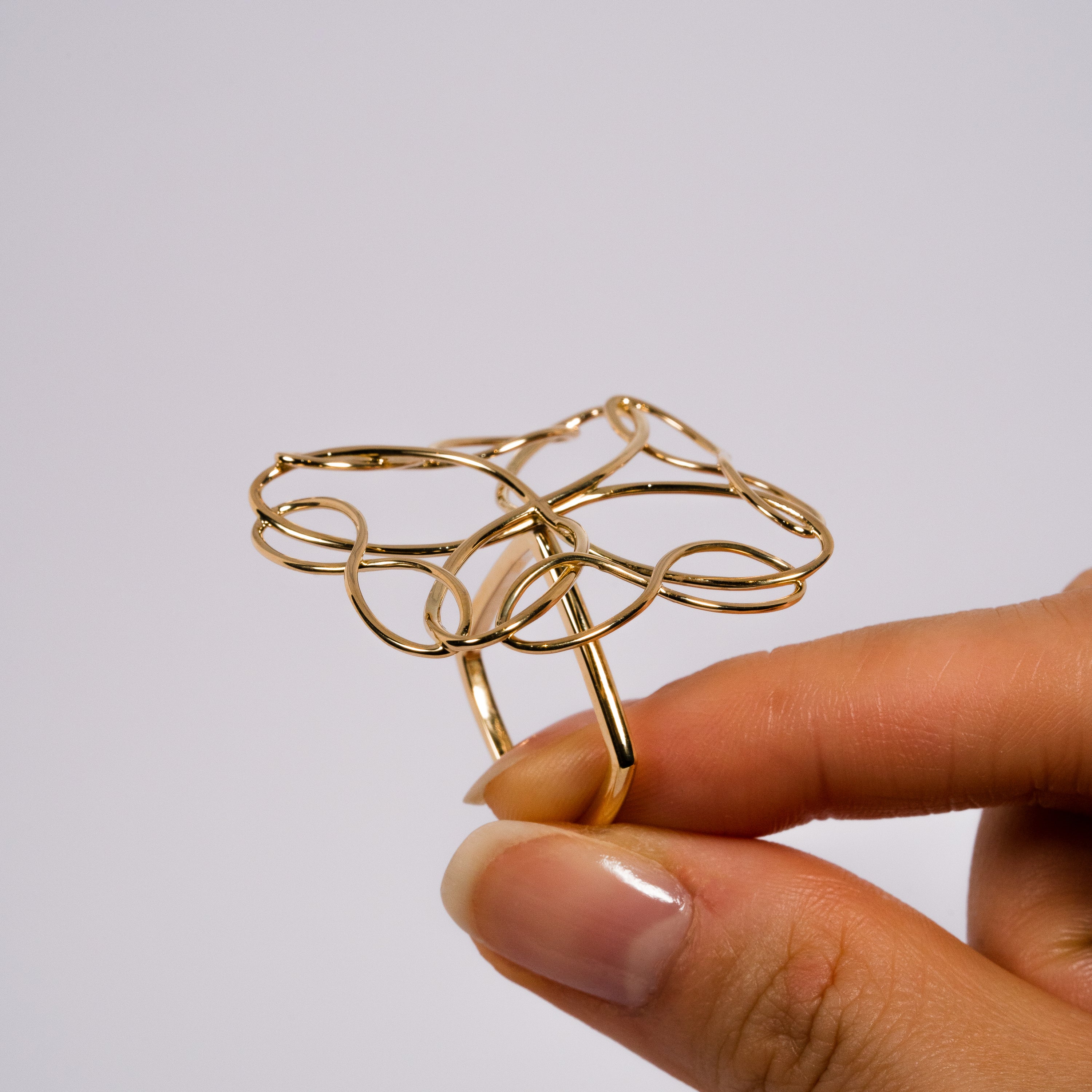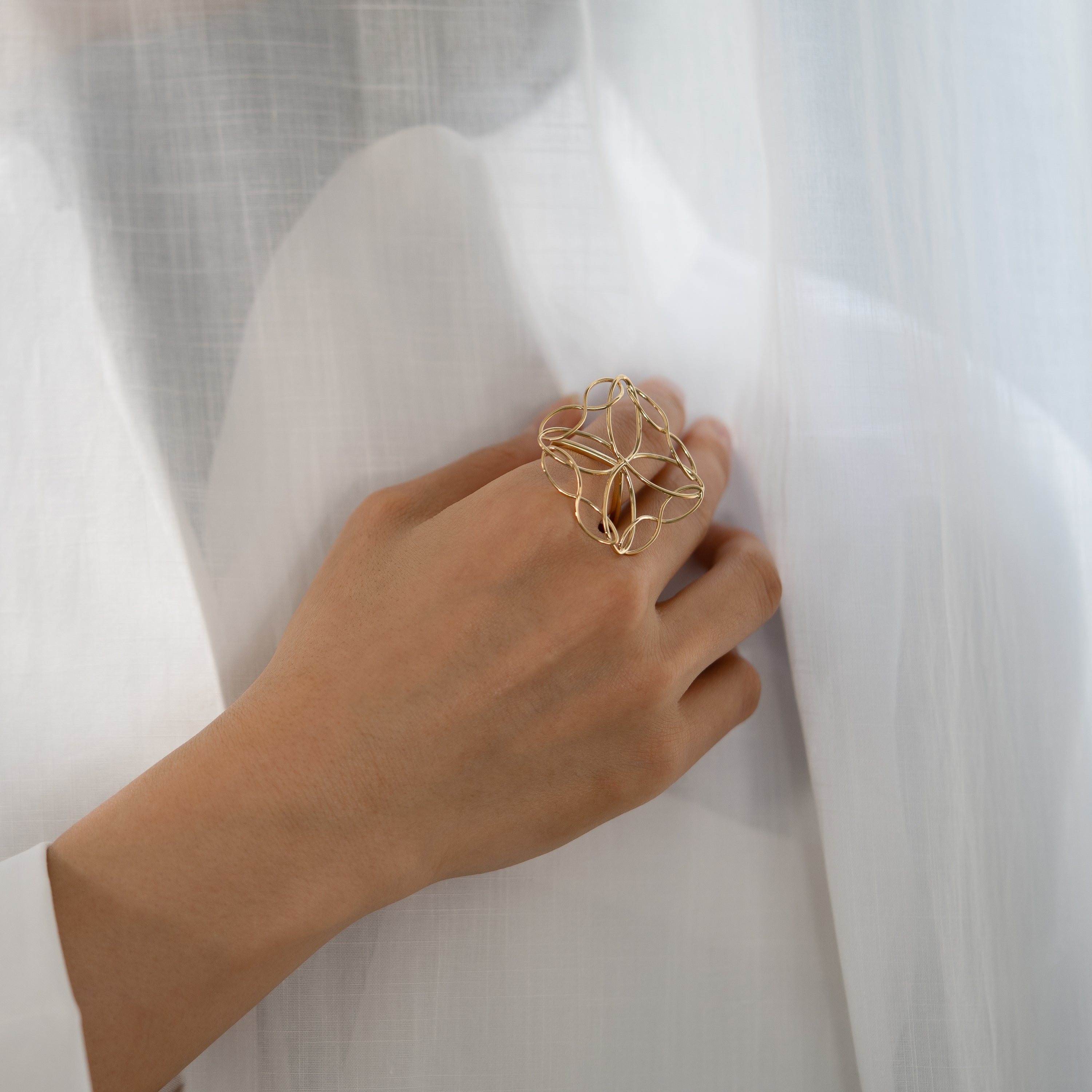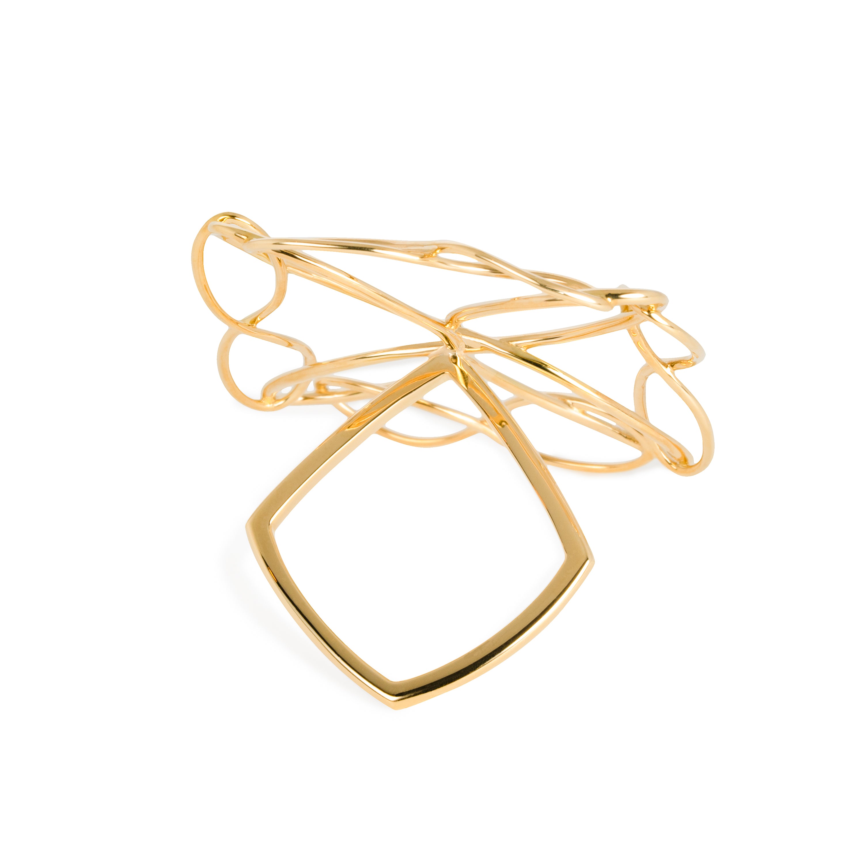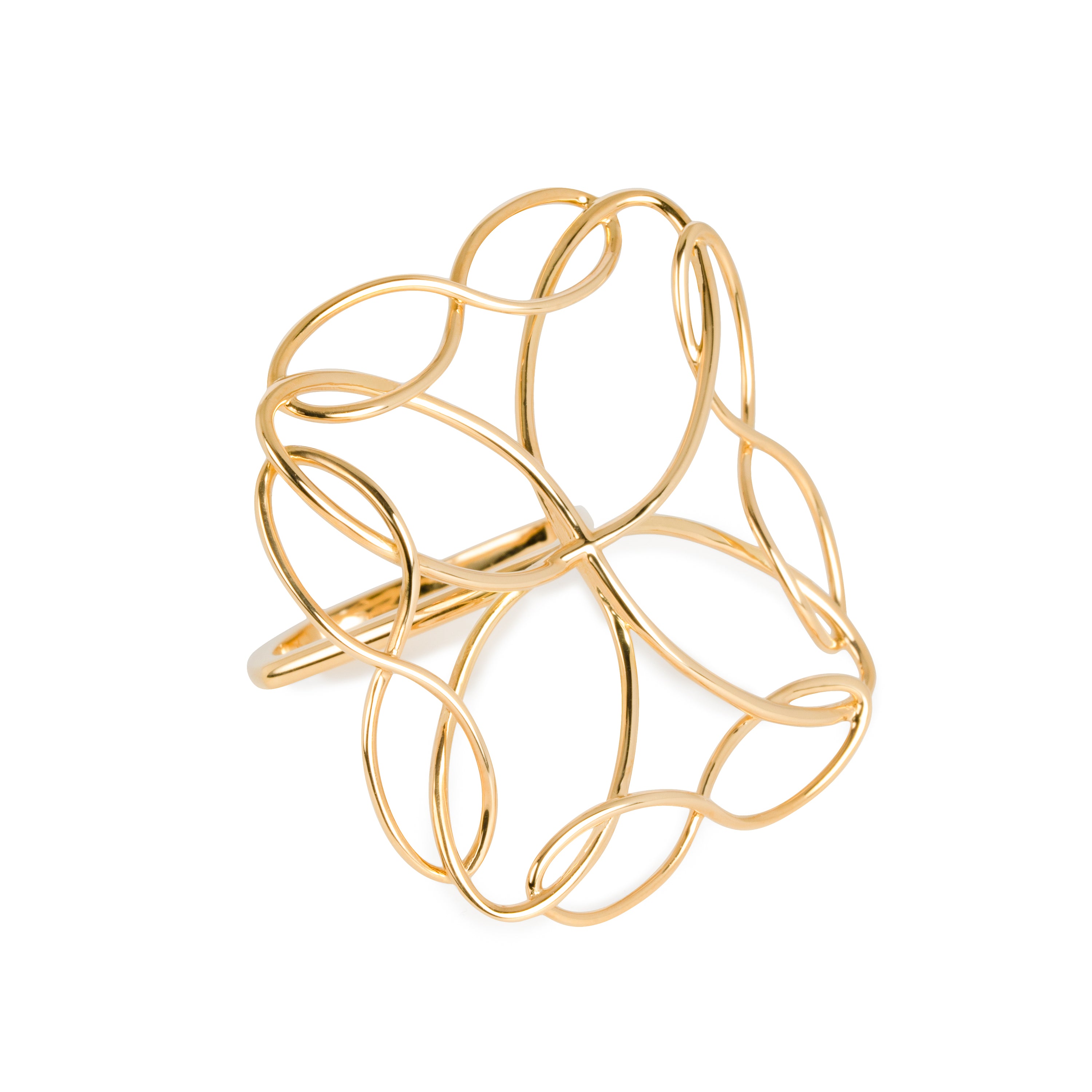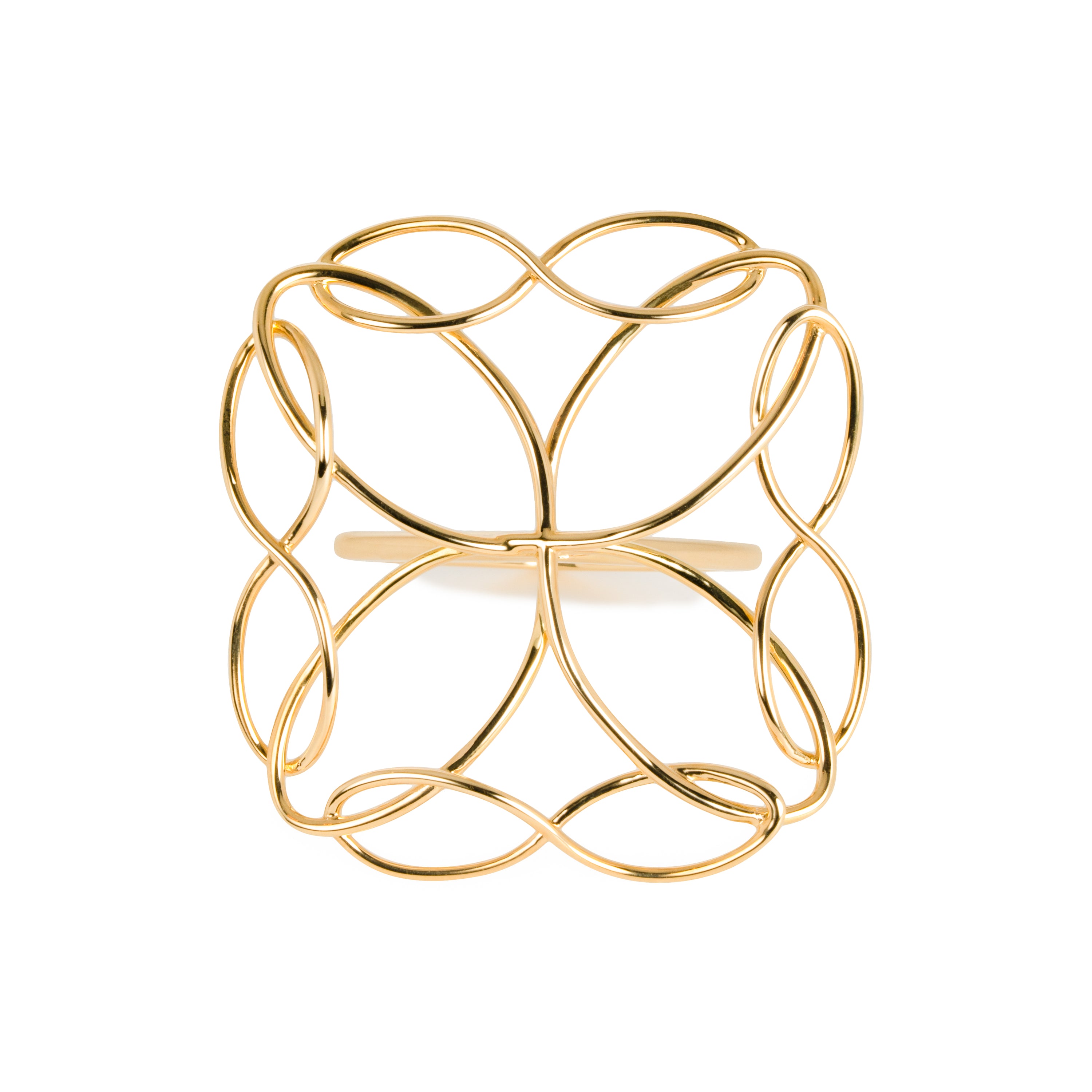 大胆な約36mmの縦横サイズが際立つこちらのリングは、精巧なゴールドの細工と思い切った空間の使い方が見事に調和し、卓越した存在感を演出します。アーム部分には菱形の設計を採用し、装いに遊び心を添える洗練されたリングです。