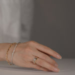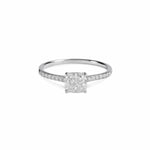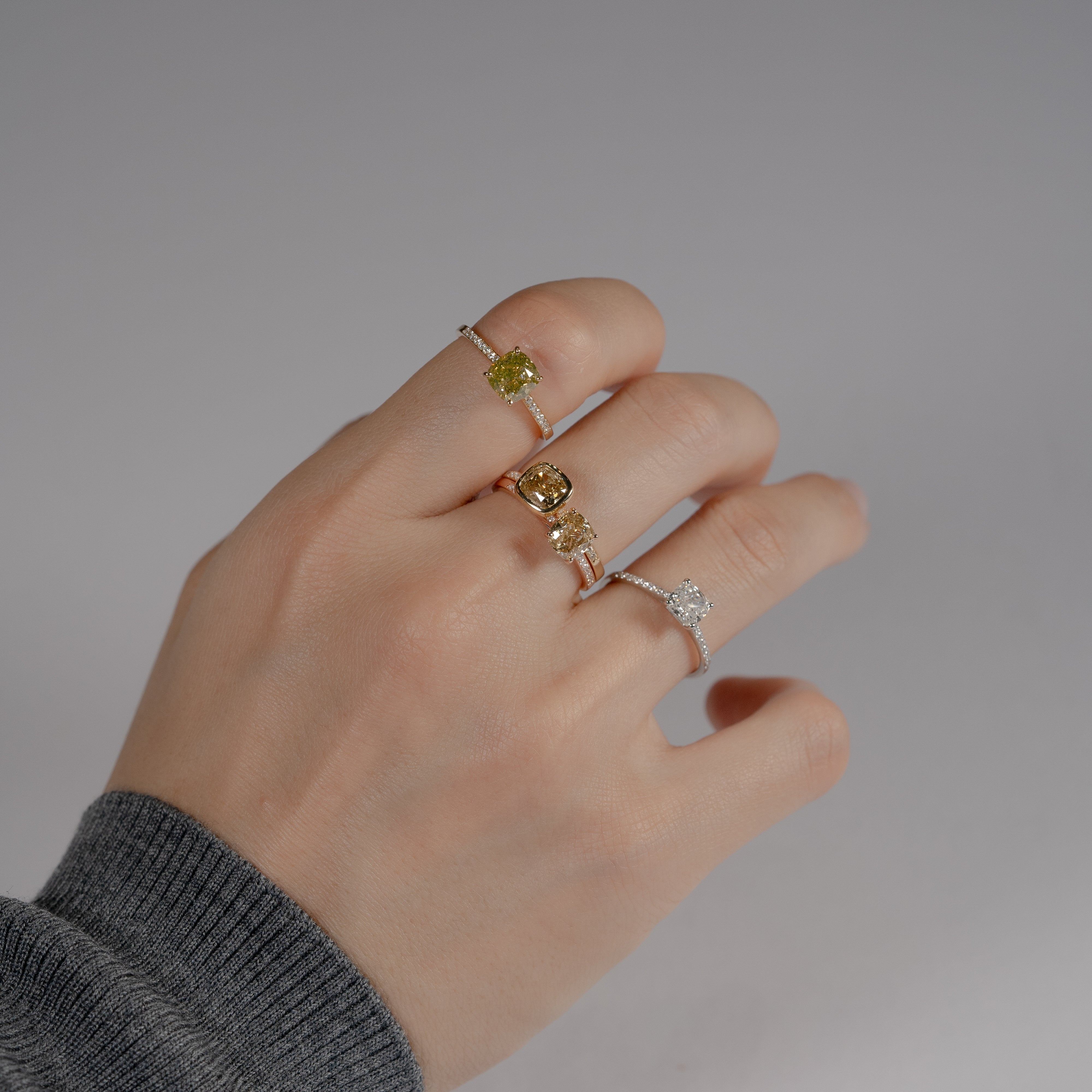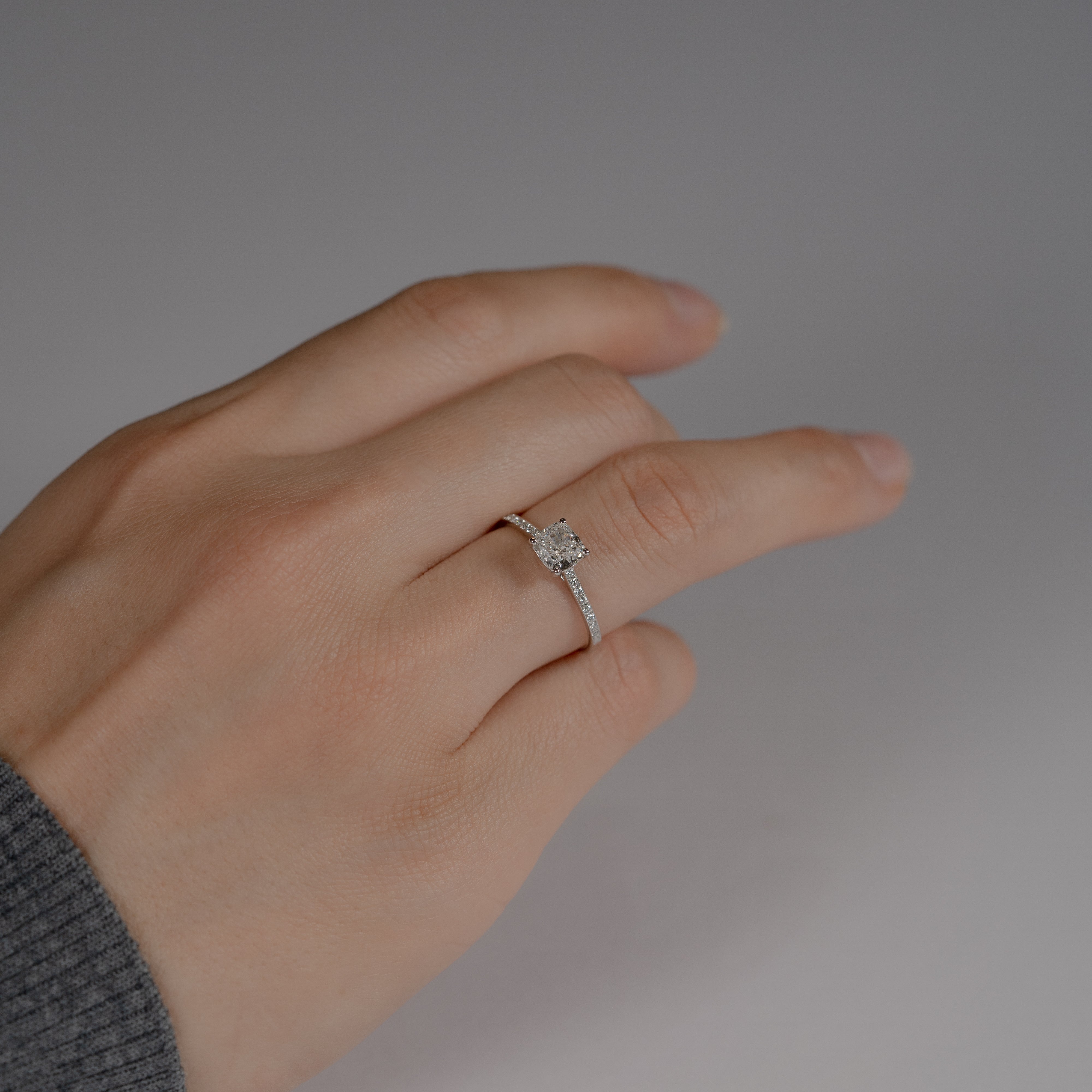 クッションカットのダイヤモンドが主役のタイムレスなソリティアリング。 中石座の高さは緊張感と身につけやすさのバランスを見極め、センターストーンを強調する華奢なアームにはダイヤモンドを彫り留めするなど、シンプルなデザインながら細部までこだわり抜いてお作りしました。