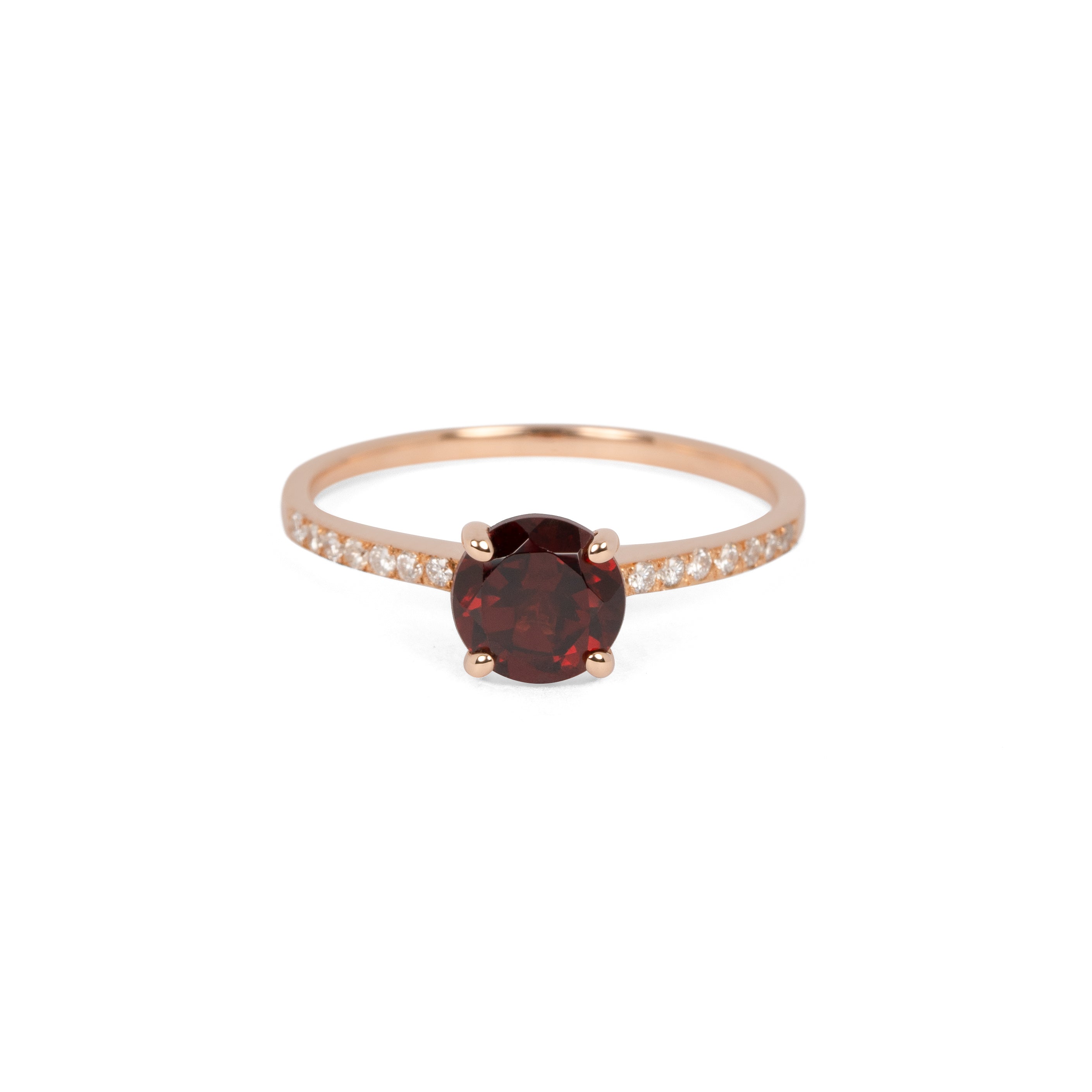 深い色味のロードライトガーネットが主役のタイムレスなソリティアリング。中石座の高さは緊張感と身につけやすさのバランスを見極め、センターストーンを強調する華奢なアームにはダイヤモンドを彫り留めするなど、シンプルなデザインながら細部までこだわり抜いてお作りしました。