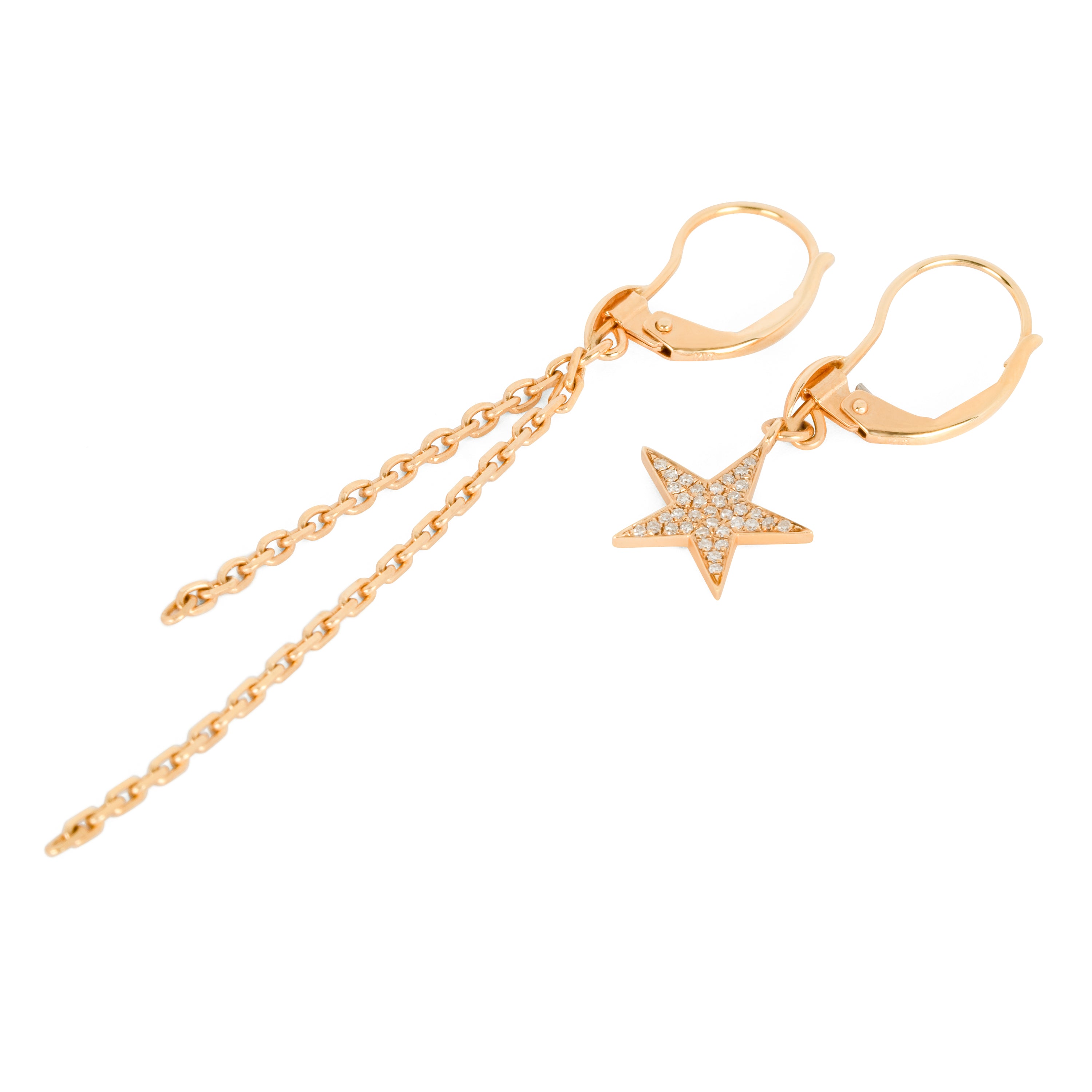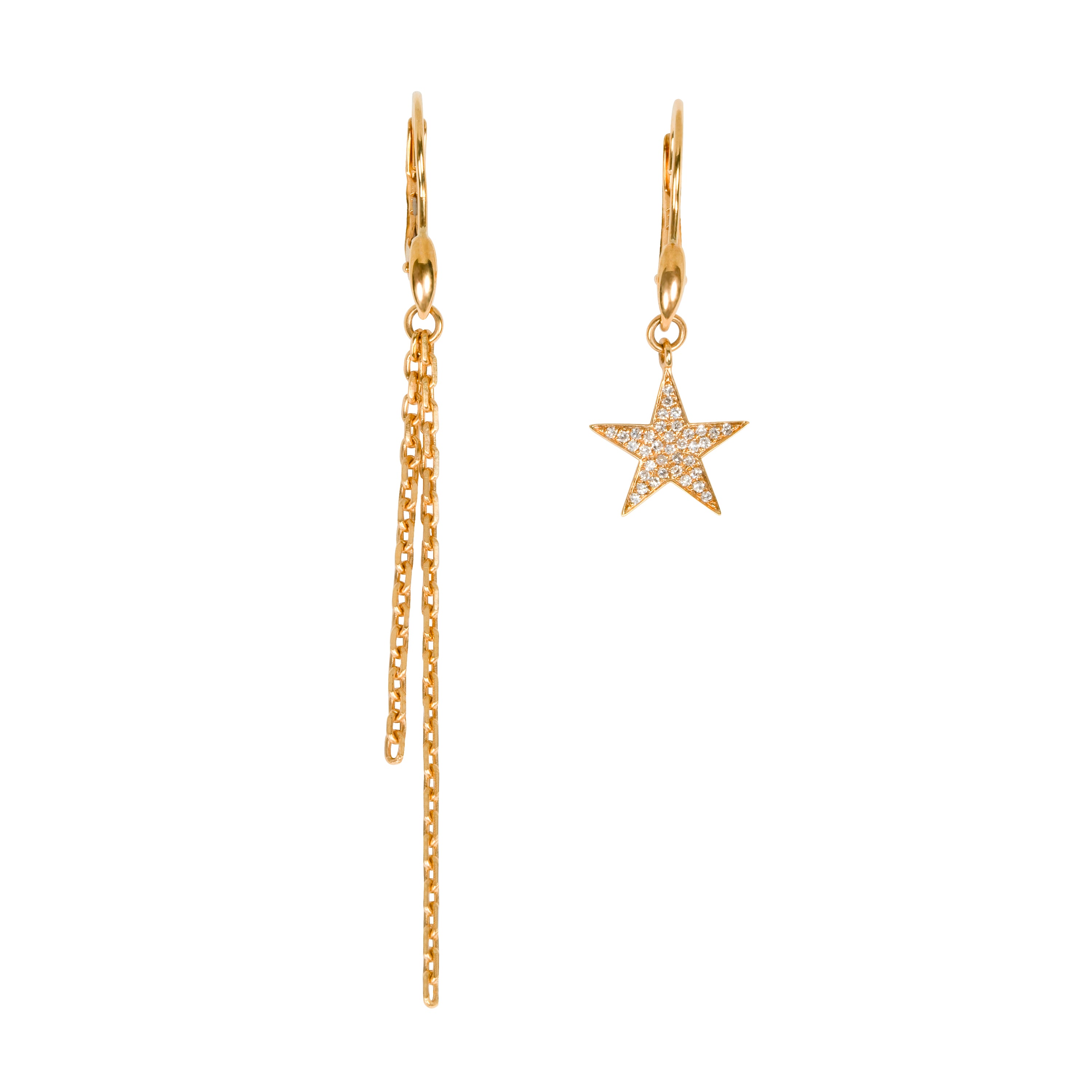 片方はメレダイヤモンドをあしらった星モチーフのピアス、もう片方は流れ星が空を駆ける様子を表現した長さの異なる2連のチェーン。左右の異なるデザインが特徴的で遊び心あるジュエリーです。