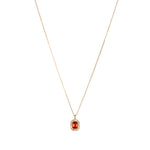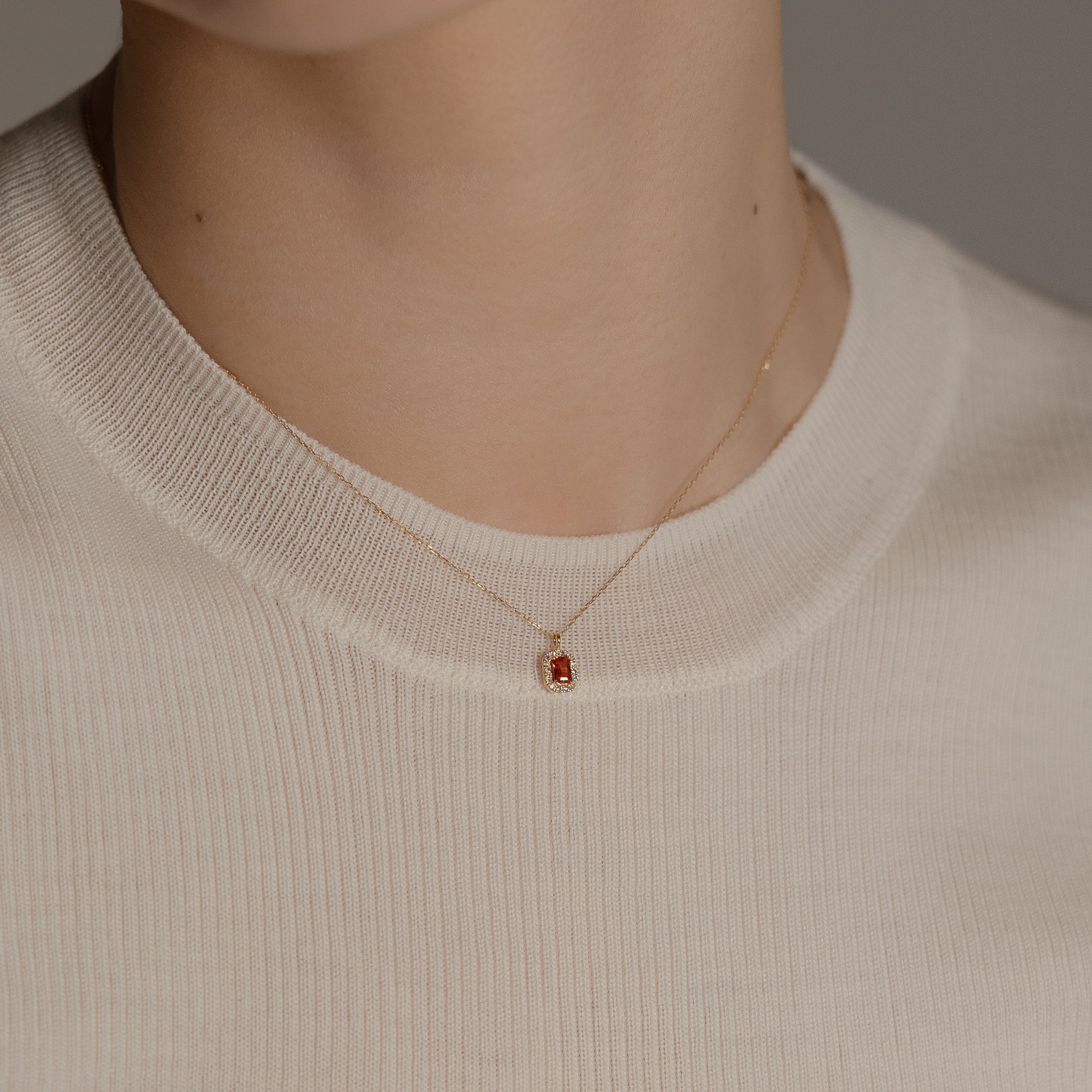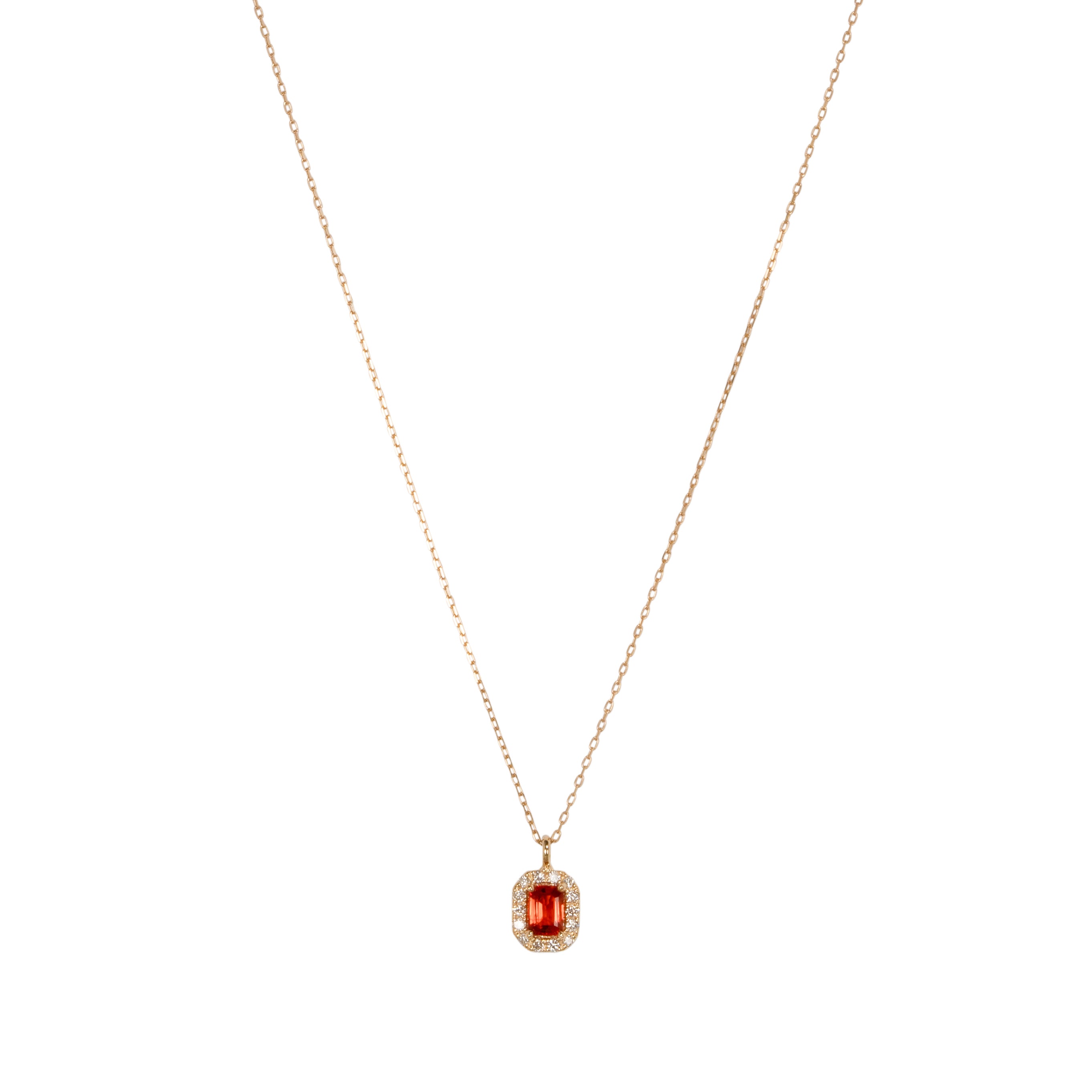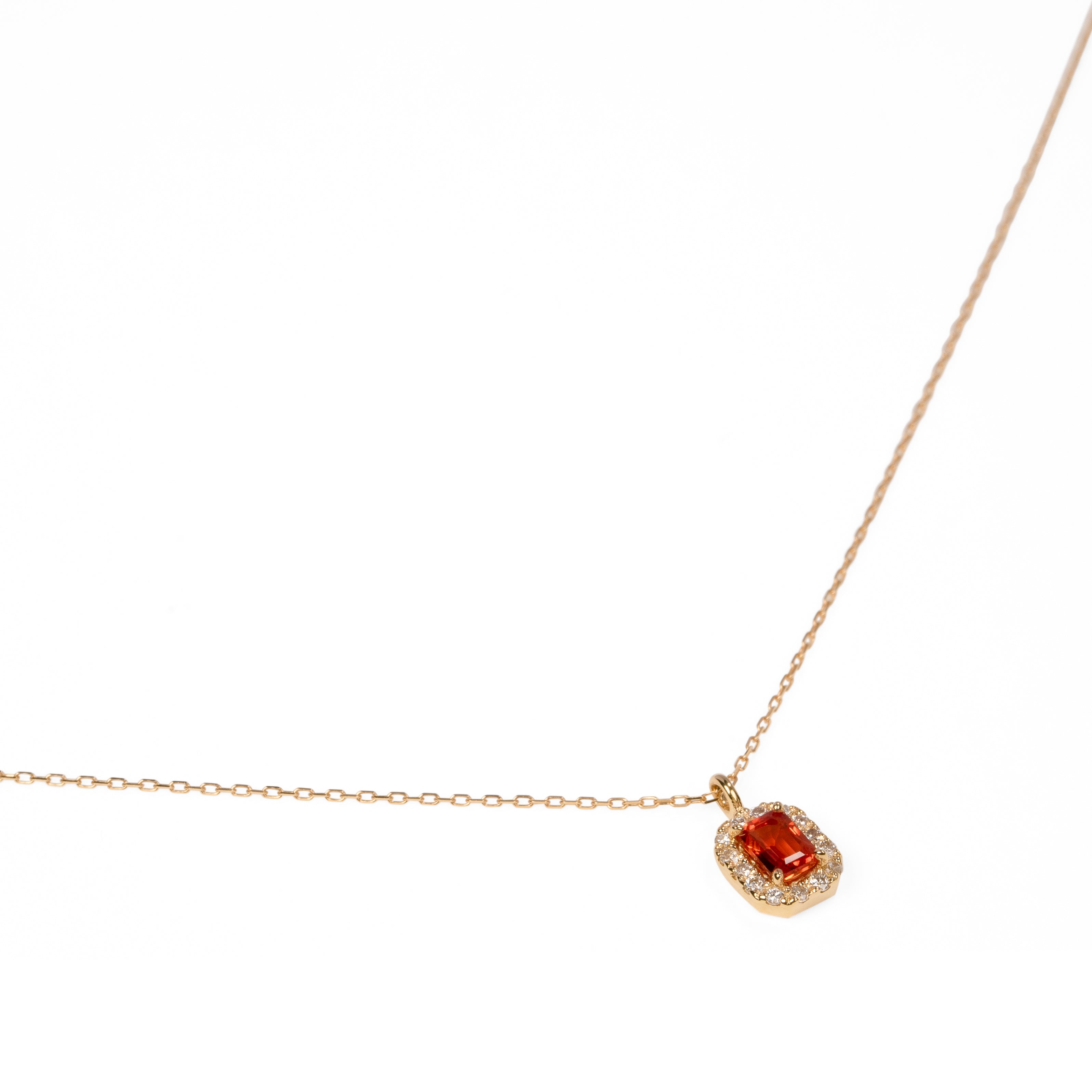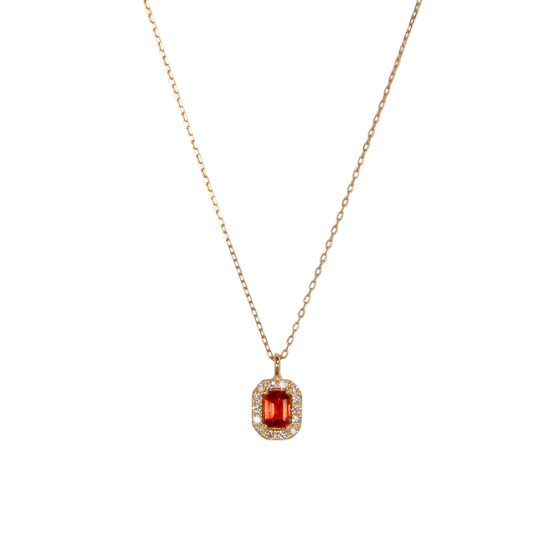 赤色に近い鮮やかなオレンジ色のファンシーサファイアと繊細に輝くダイヤモンドで仕立てた、シンプルで存在感あるデザイン。デイリーに使えるサイズ感も魅力のネックレス。