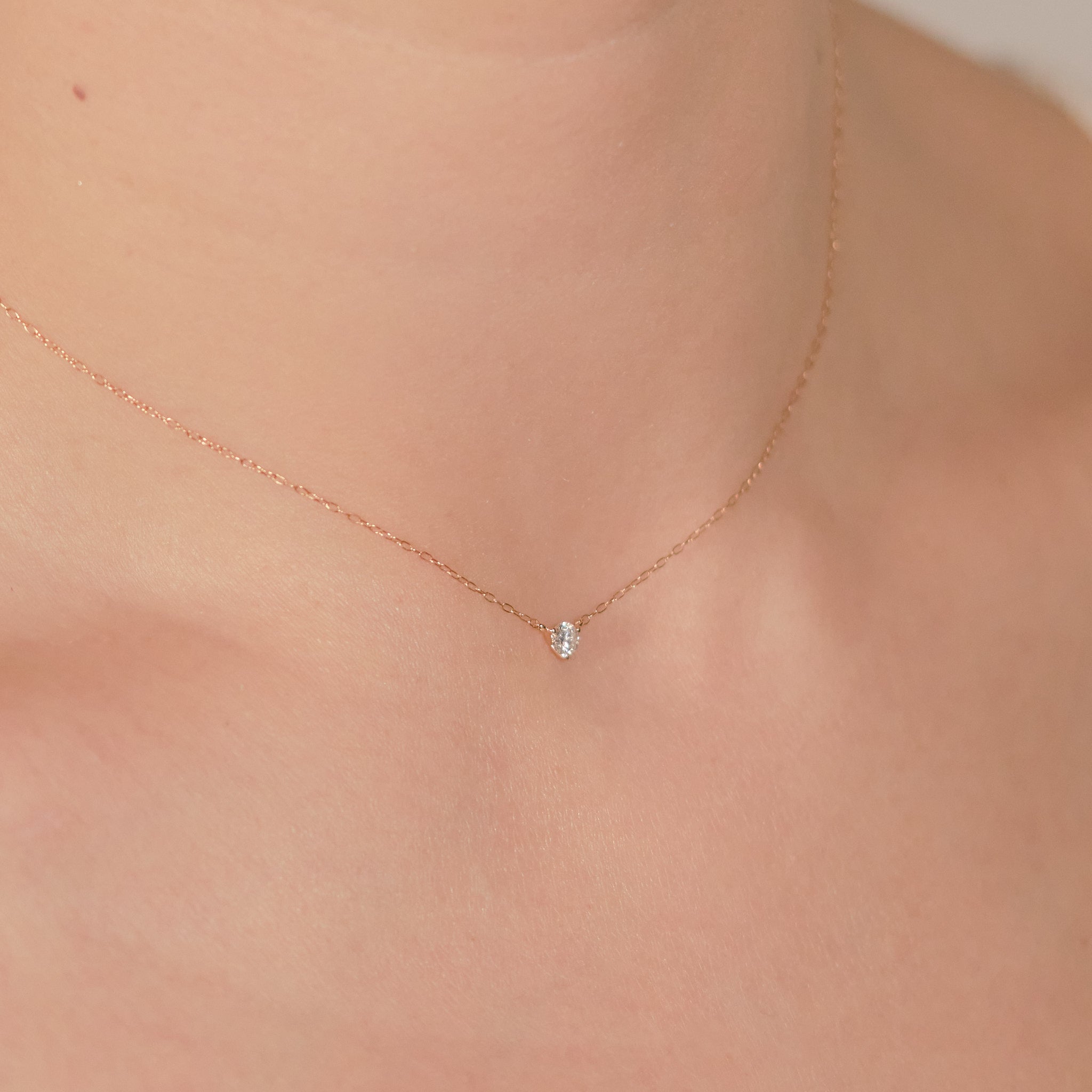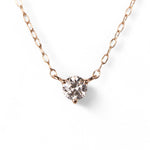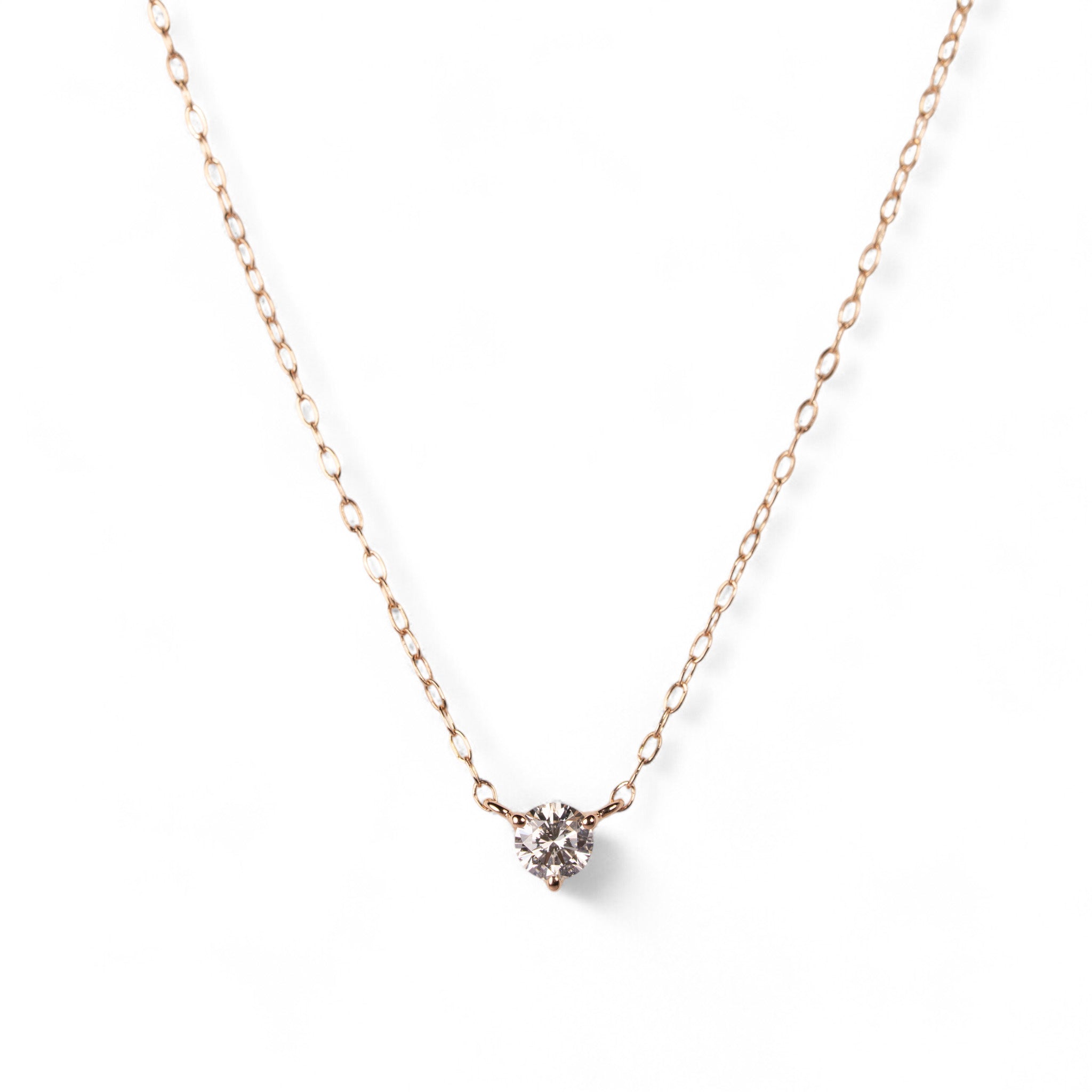 スキンジュエリーのように、さりげなくきらめく一粒ダイヤモンドネックレス。チェーンの流れに沿った3点留めのデザインが、素肌に自然と馴染み、胸元で上品な輝きを放ちます。
