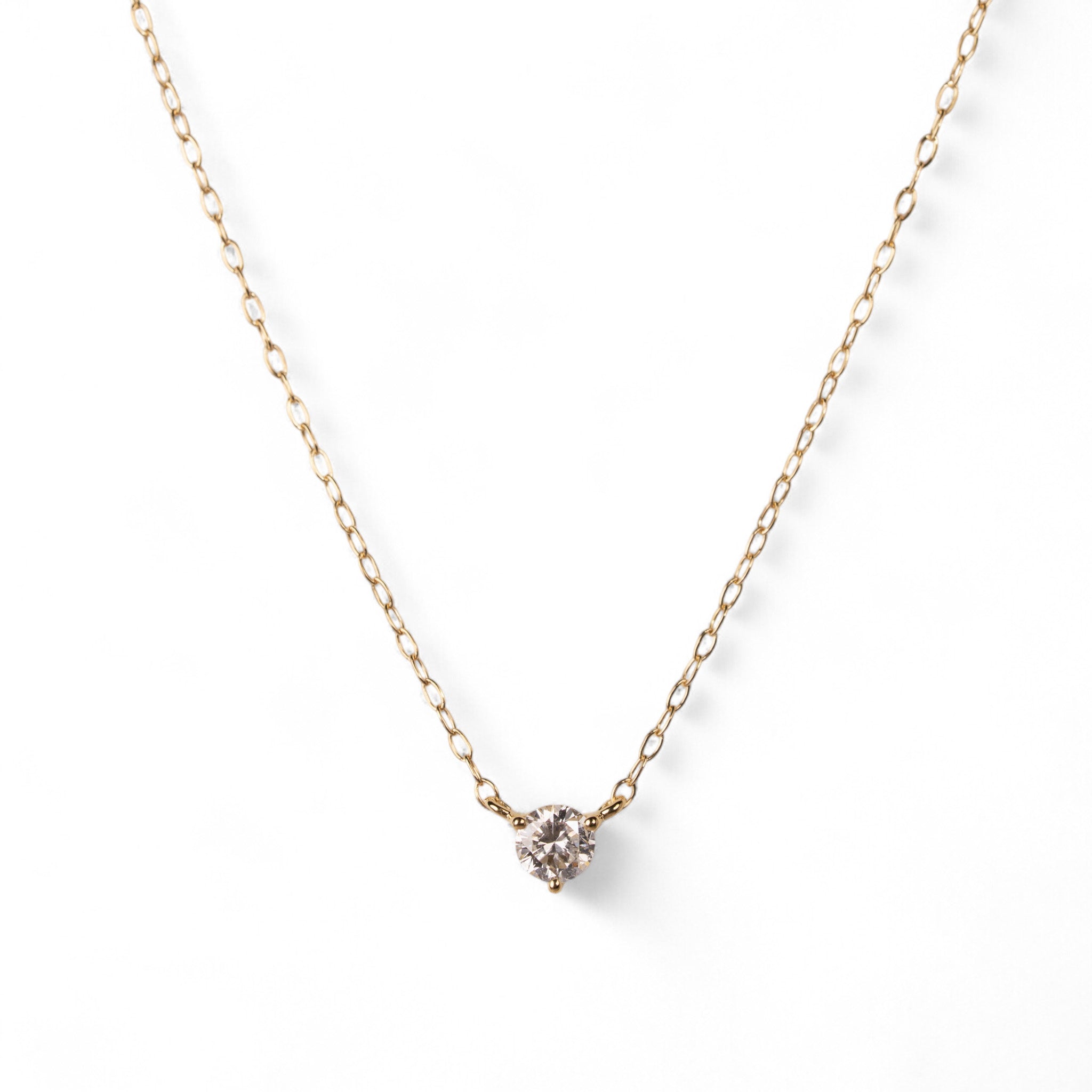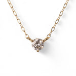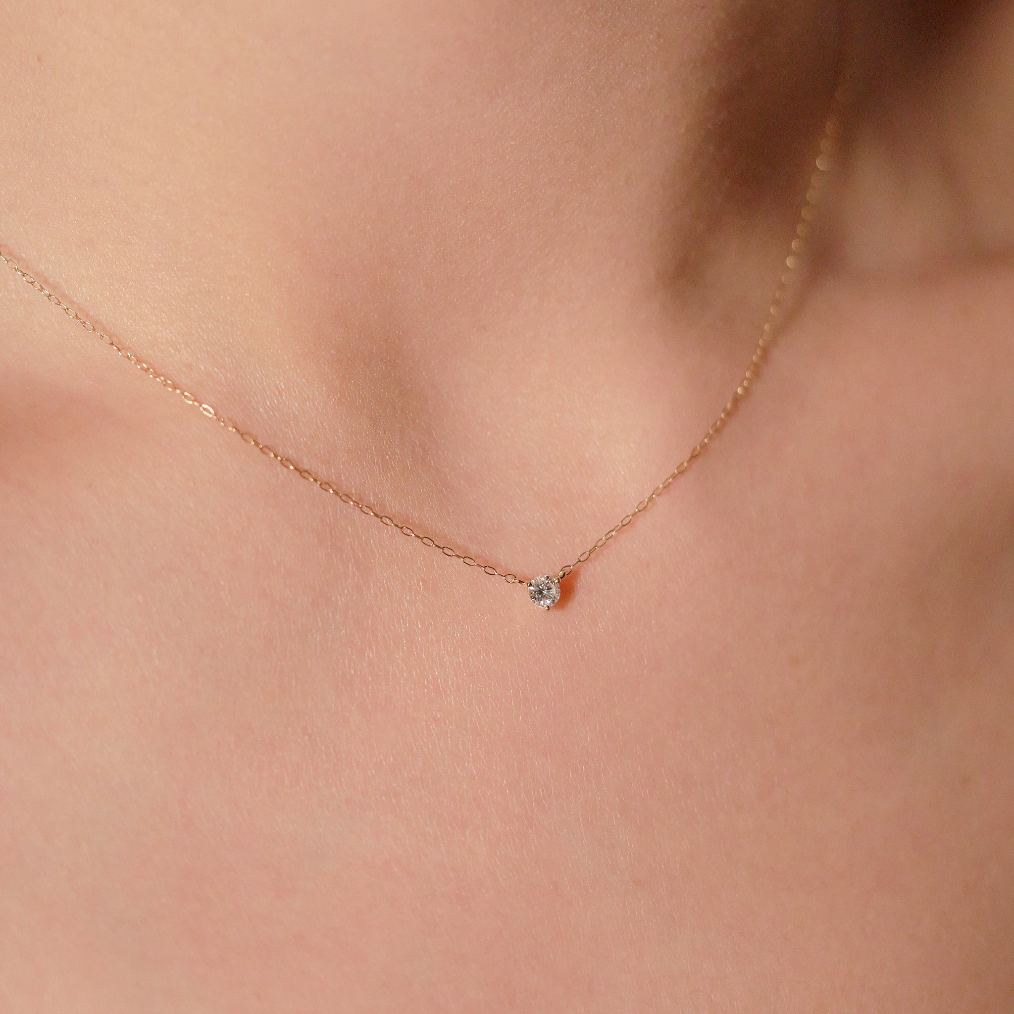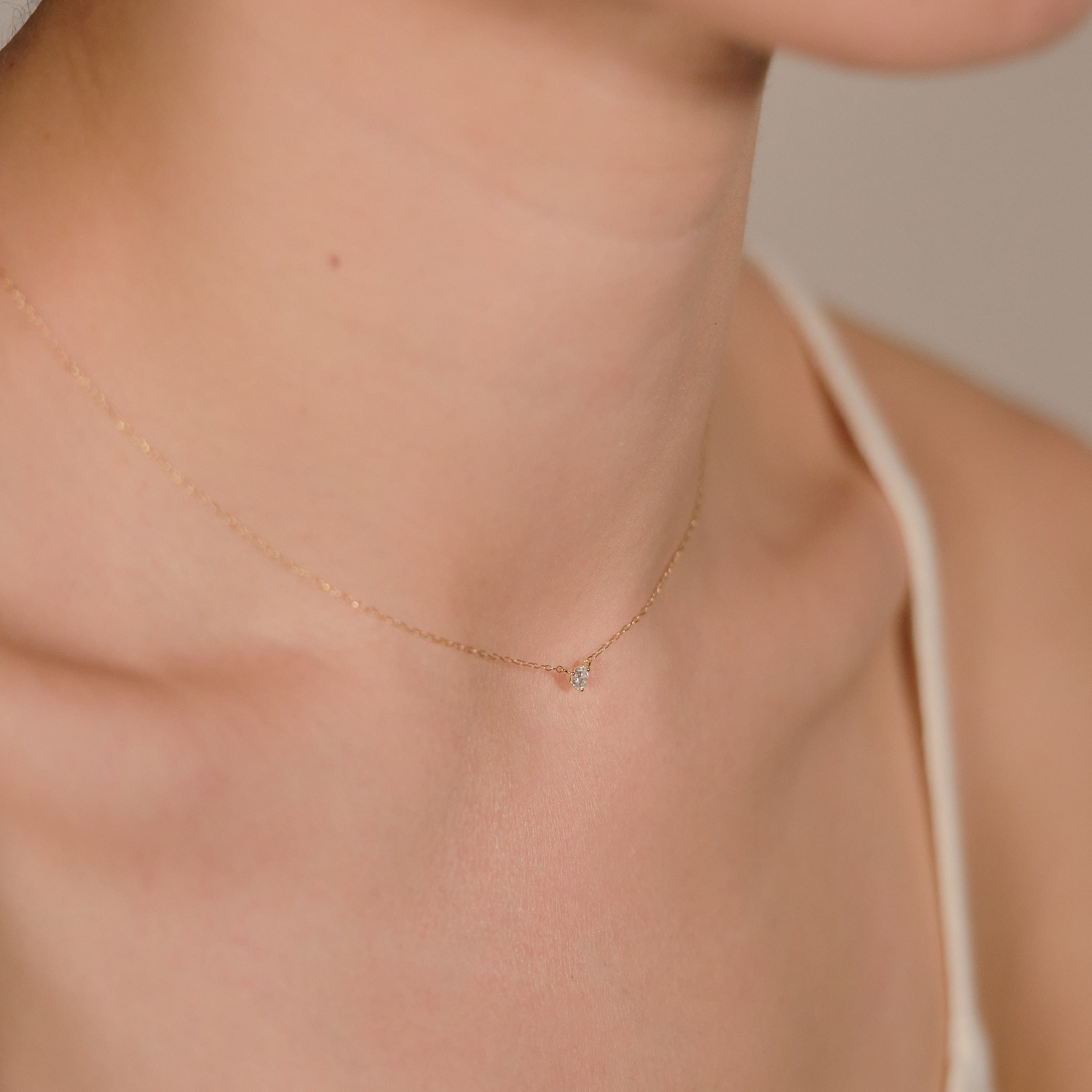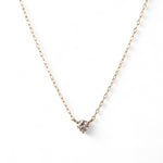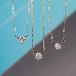 スキンジュエリーのように、さりげなくきらめく一粒ダイヤモンドネックレス。チェーンの流れに沿った3点留めのデザインが、素肌に自然と馴染み、胸元で上品な輝きを放ちます。
