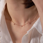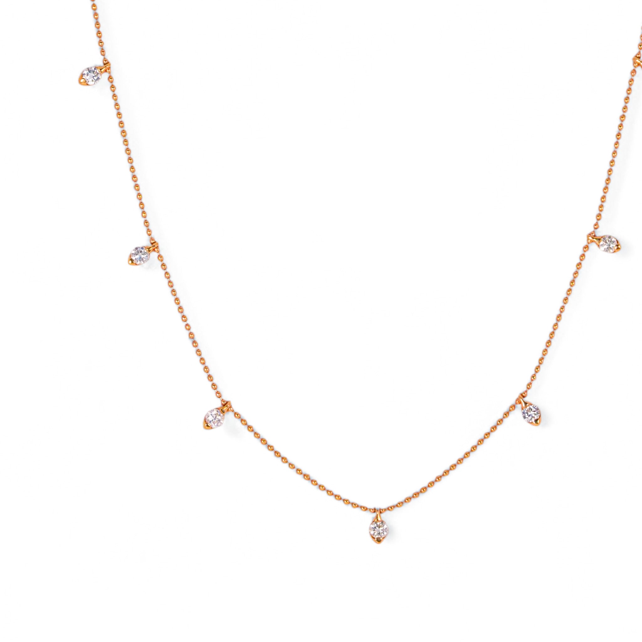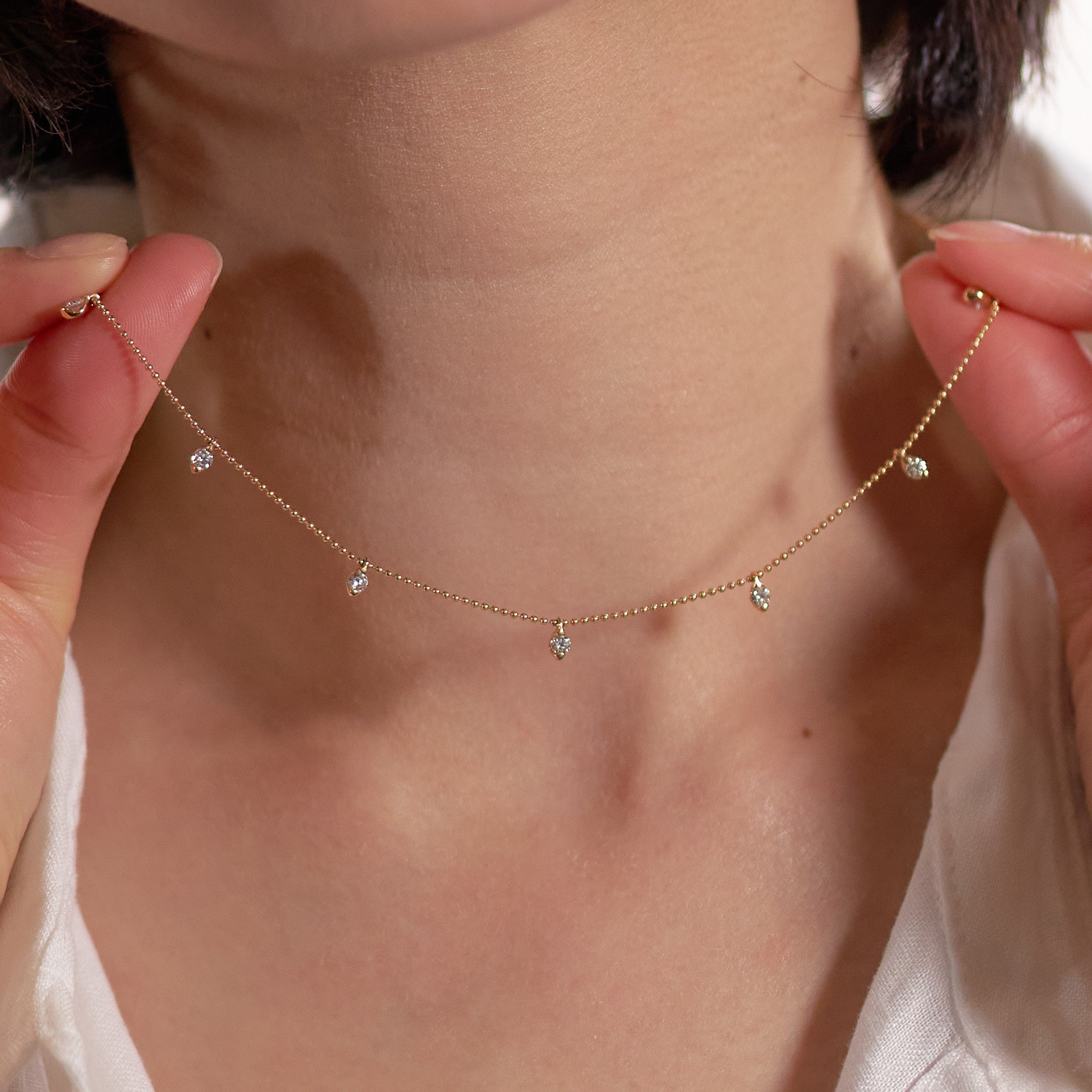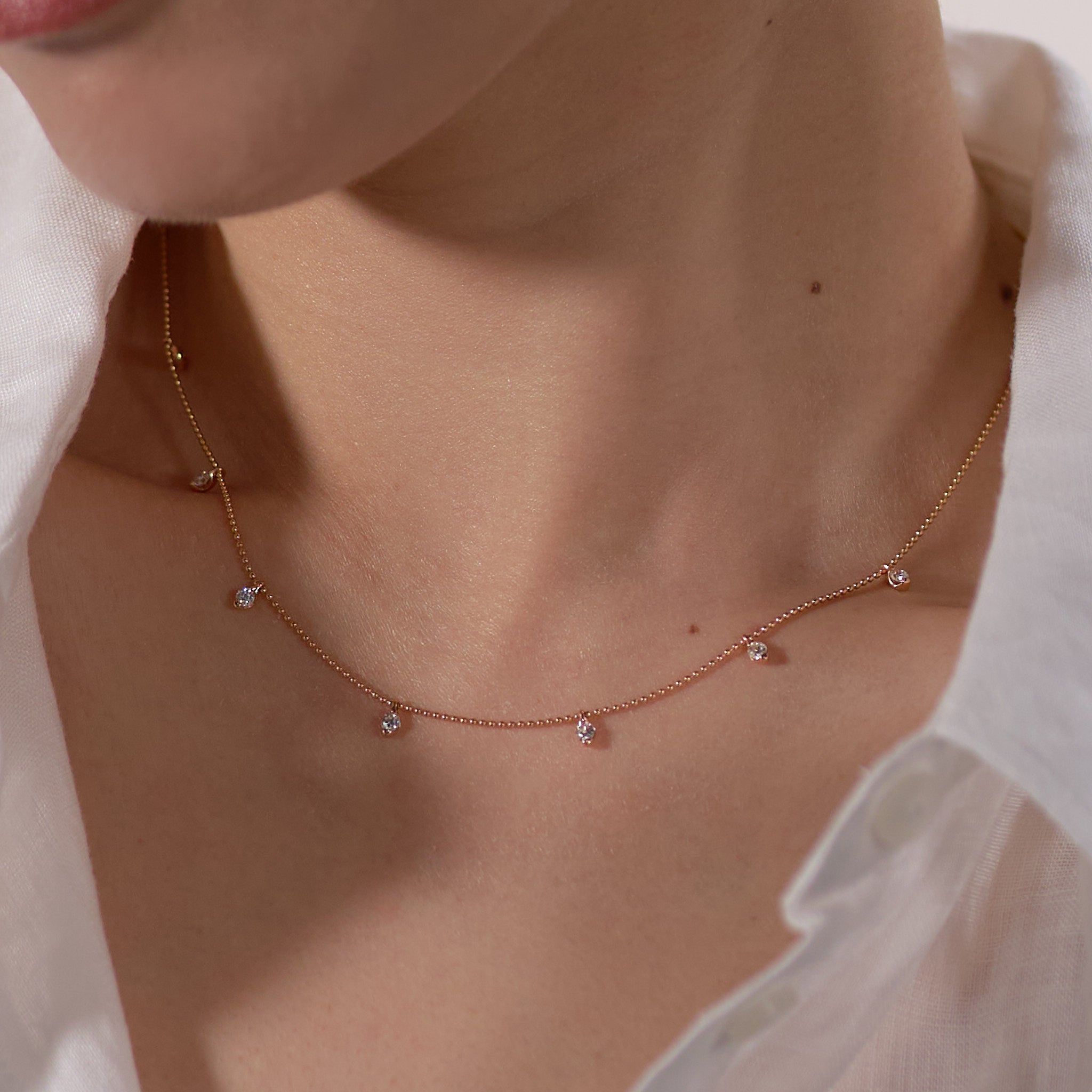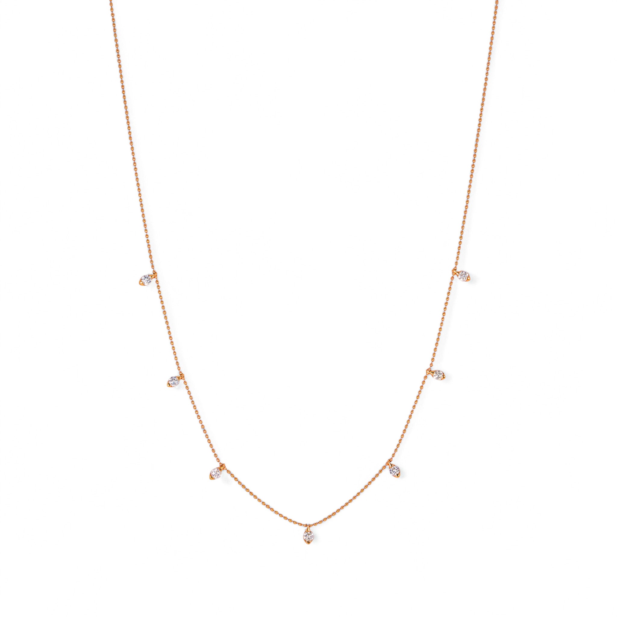 動きに合わせて、7粒のダイヤモンドが軽やかに揺れるステーションネックレス。