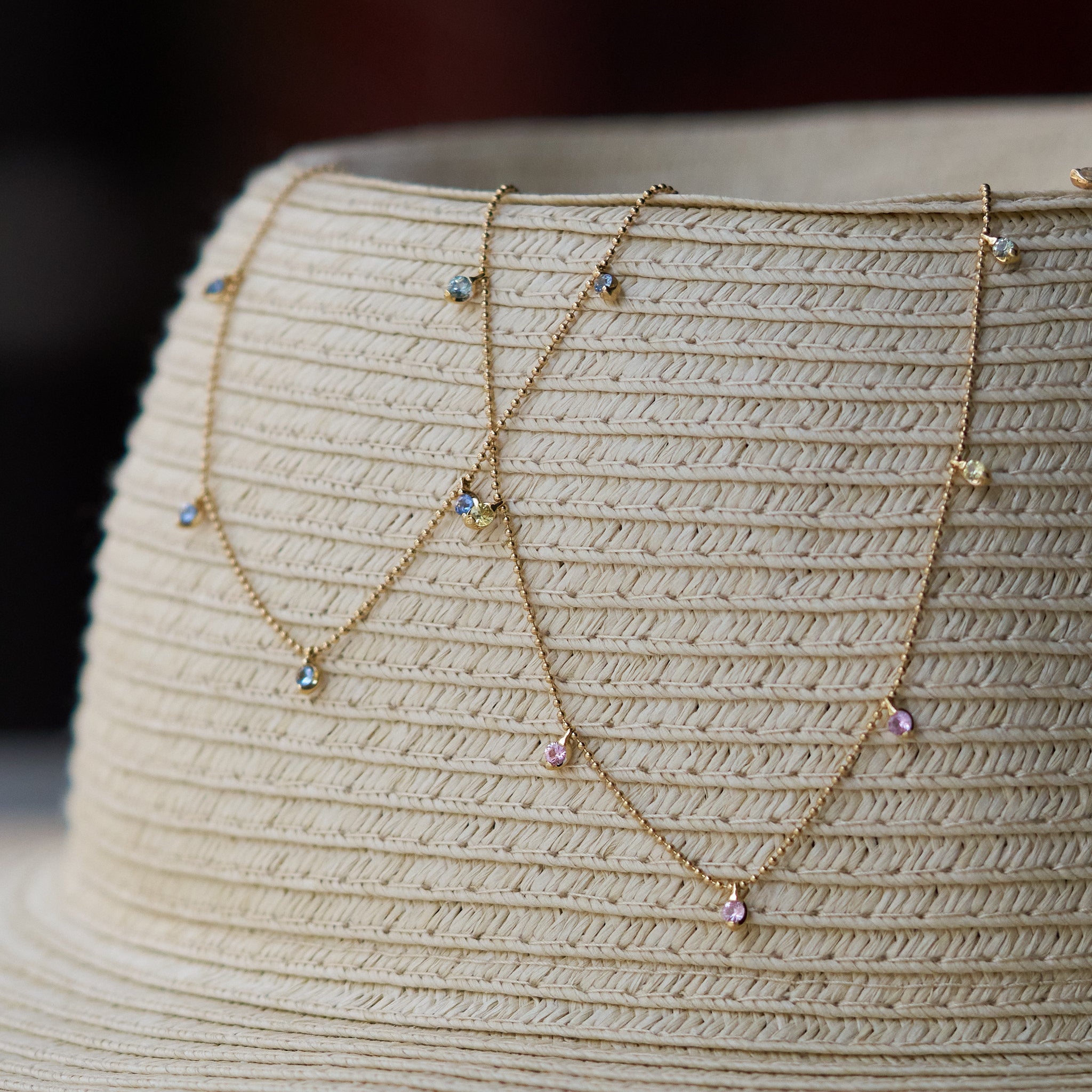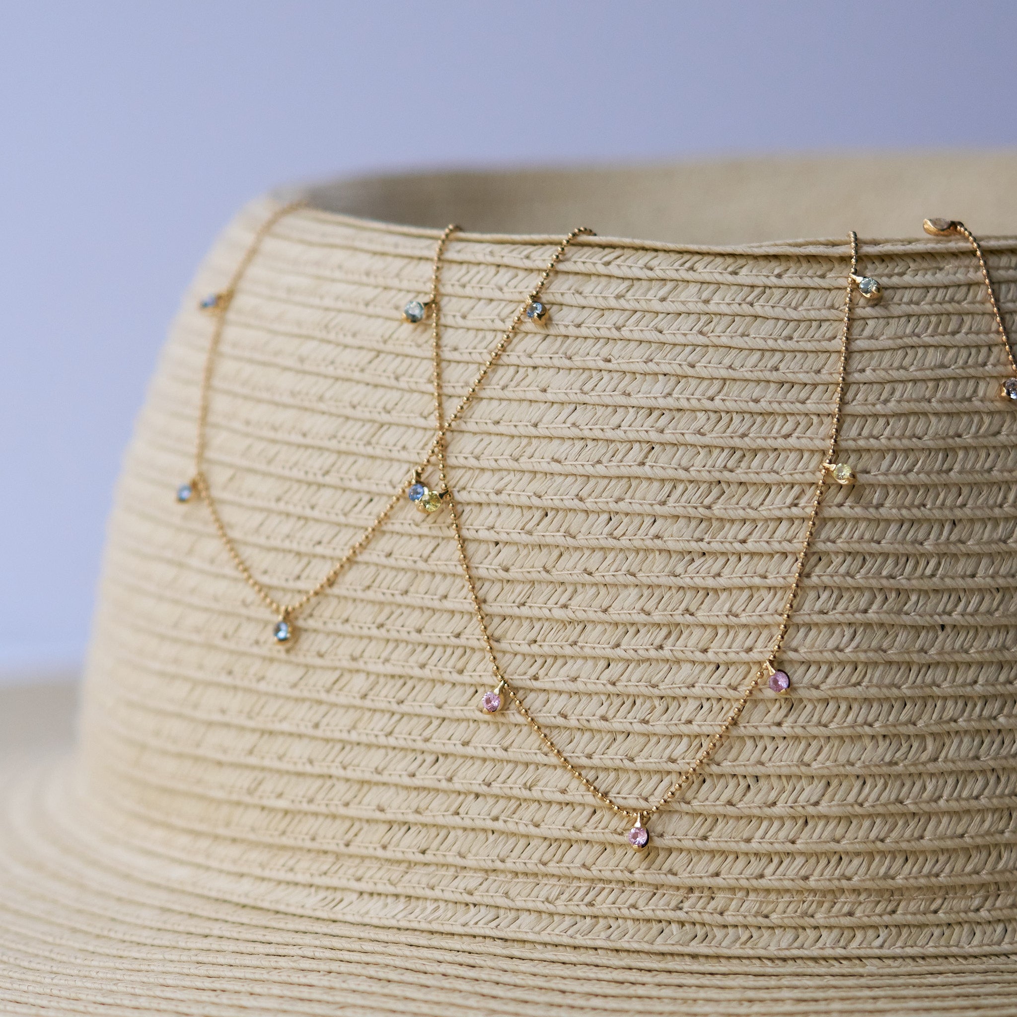 動きに合わせて、7粒の優しいお色のサファイアが軽やかに揺れるステーションネックレス。秋冬は薄手のタートルの上から、春夏はシャツやサマードレスの素肌にチェーンの長さを調整しながら、スタイルに合わせて楽しめます。季節や装い、気分に寄り添う、表情豊かなアイテムです。