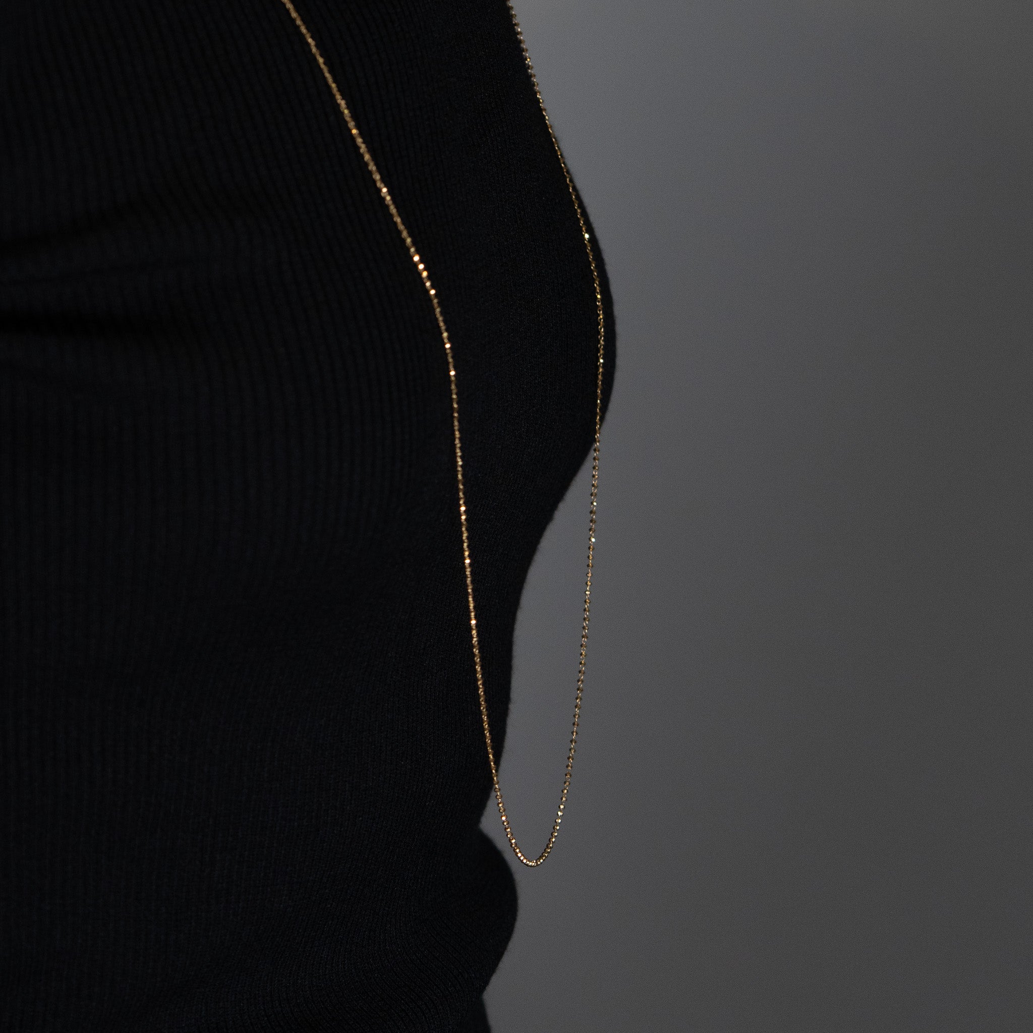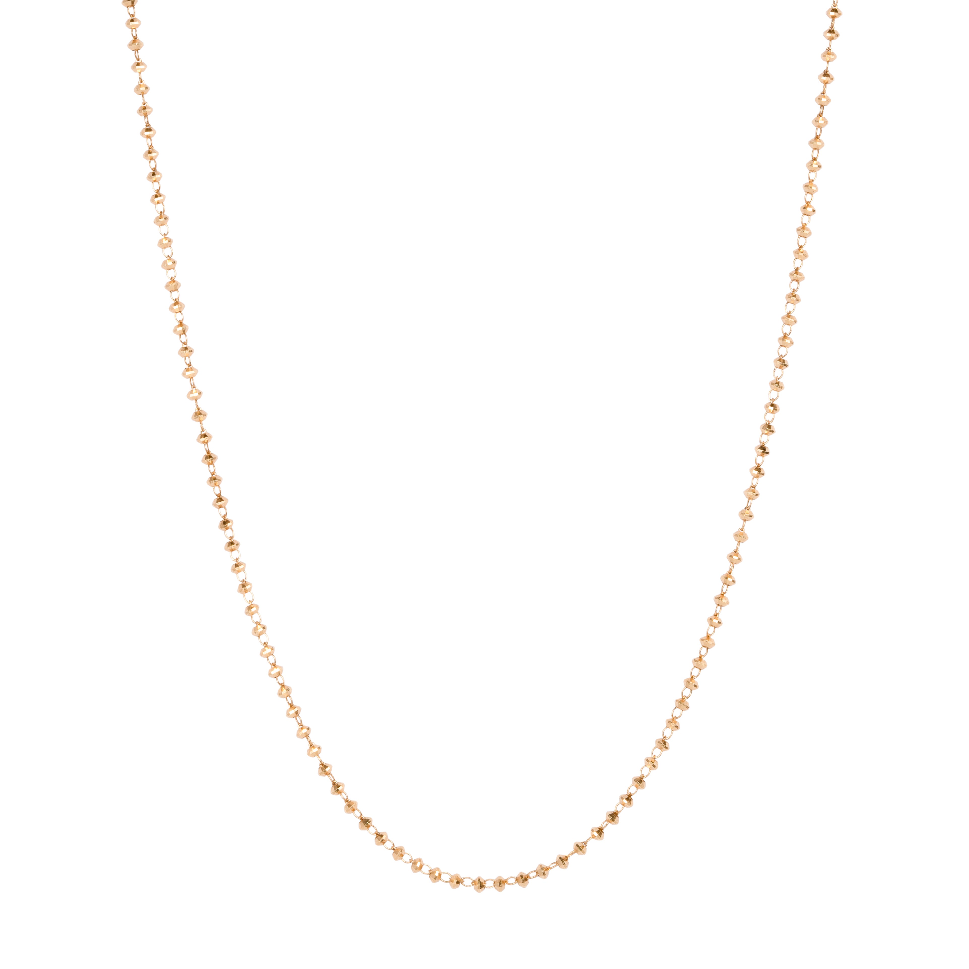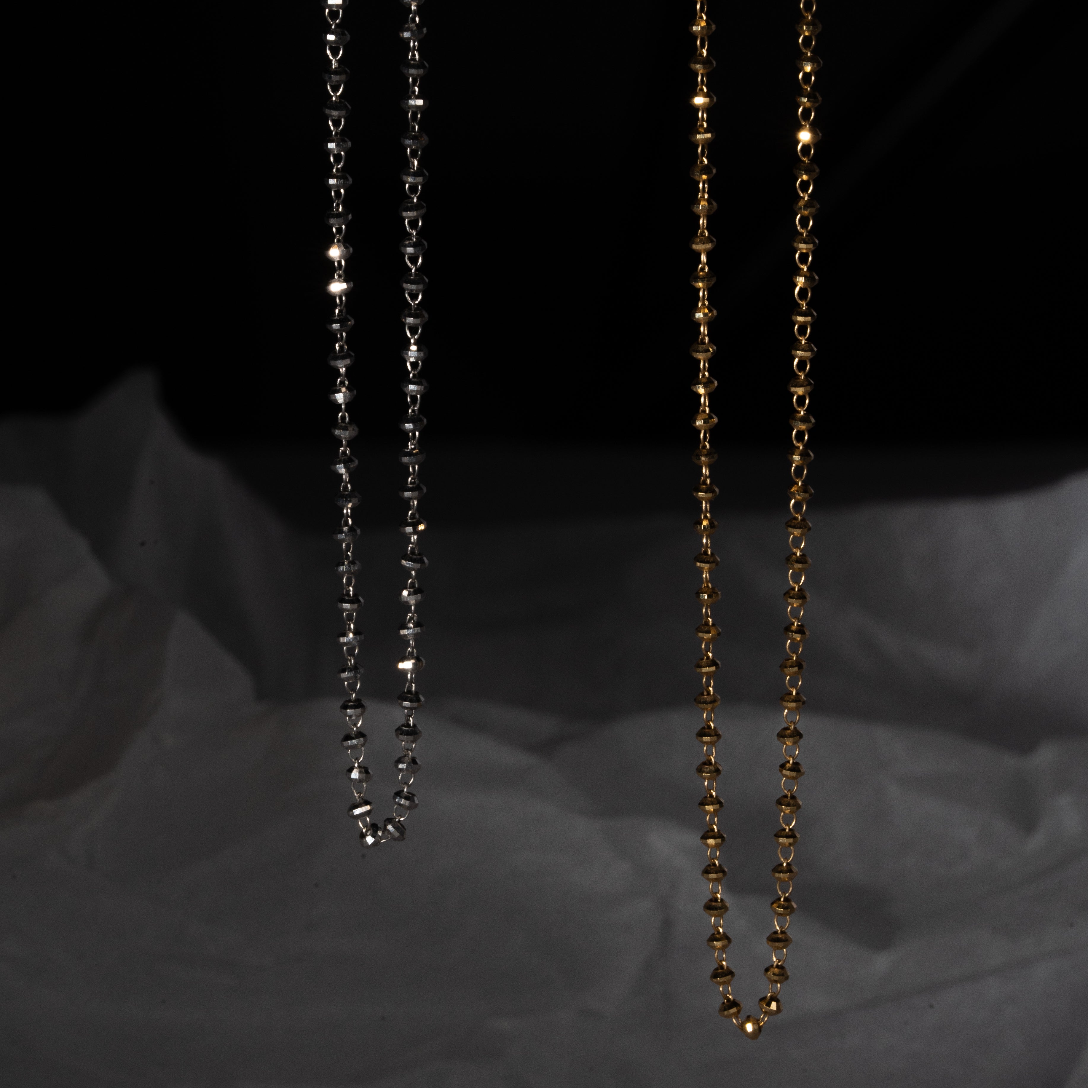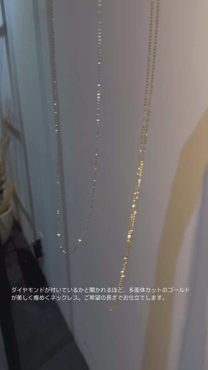 ダイヤモンドのような多面体カットが施されたゴールドが、繊細でありながら力強く煌めくネックレス。職人の手作業で丁寧に仕立てました。チョーカー風に短く着けても、ロングで揺れる輝きを楽しんでも美しく映えるデザインです。特別な日に、ぜひこの美しい煌めきを合わせていただきたい逸品。