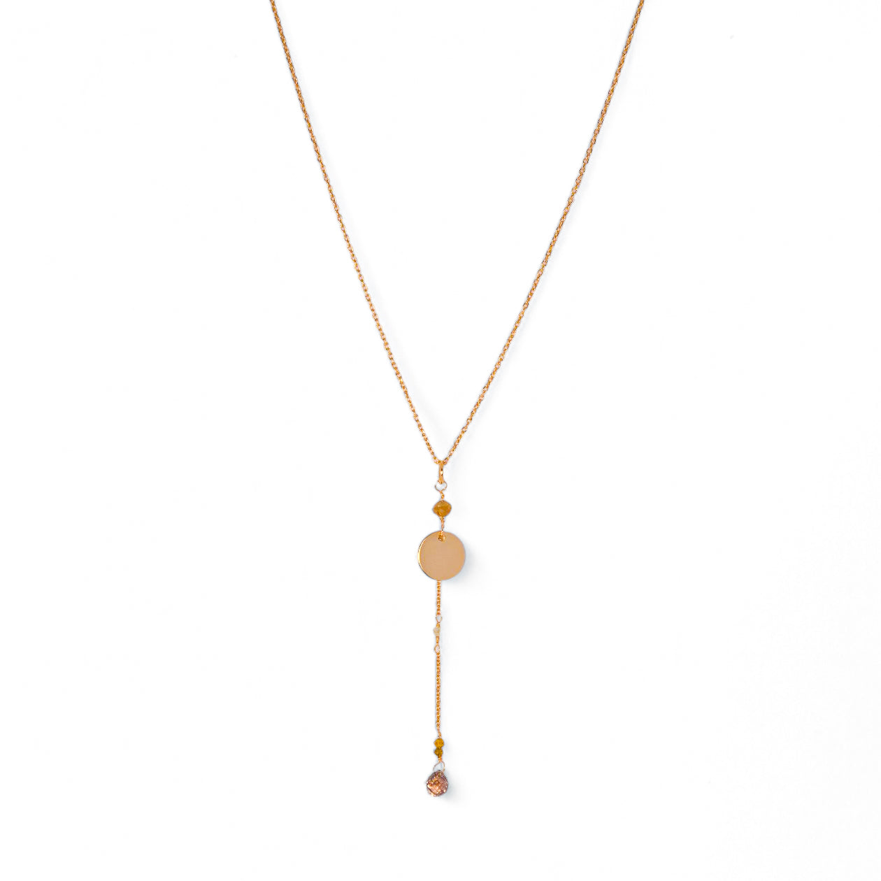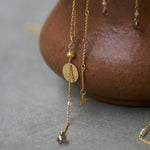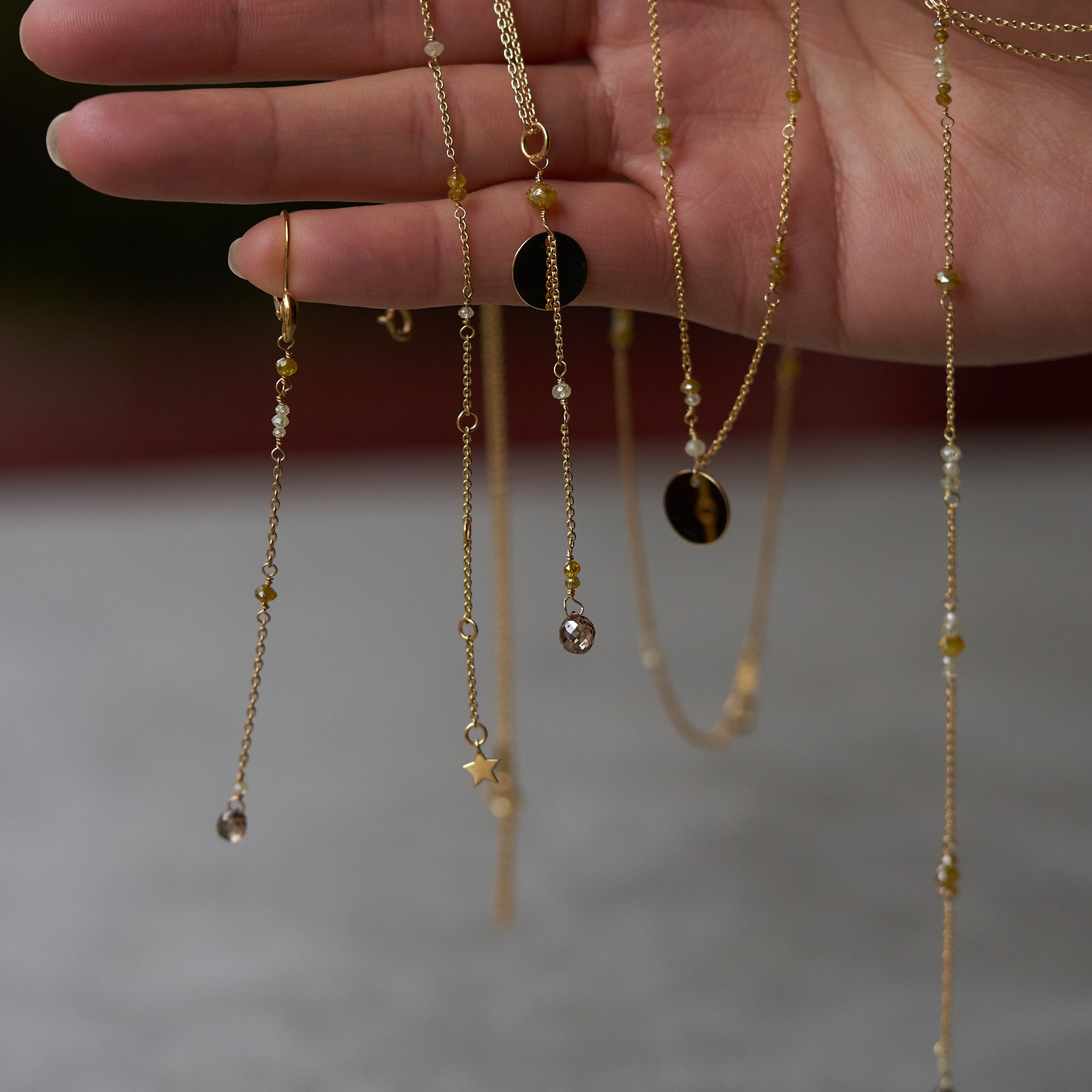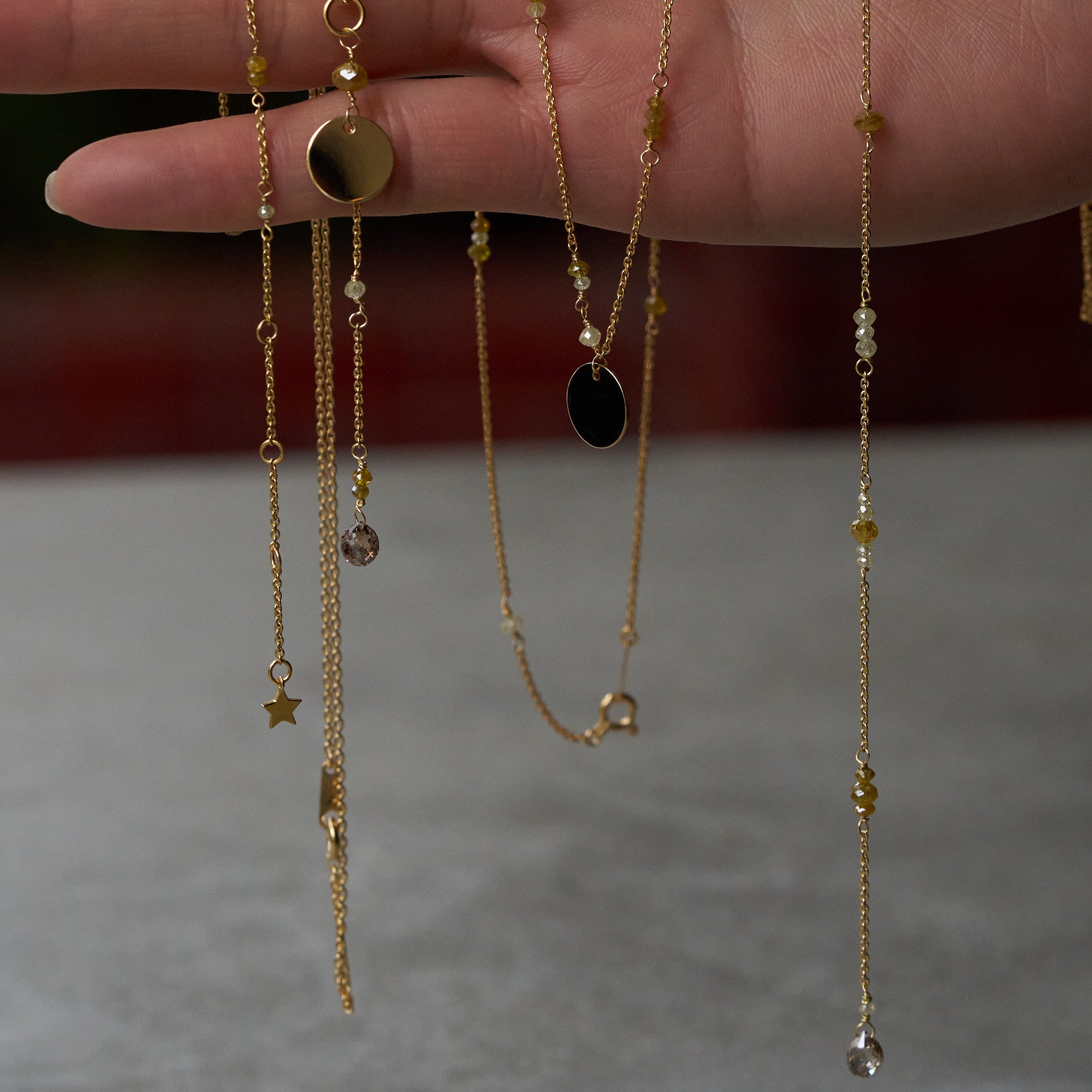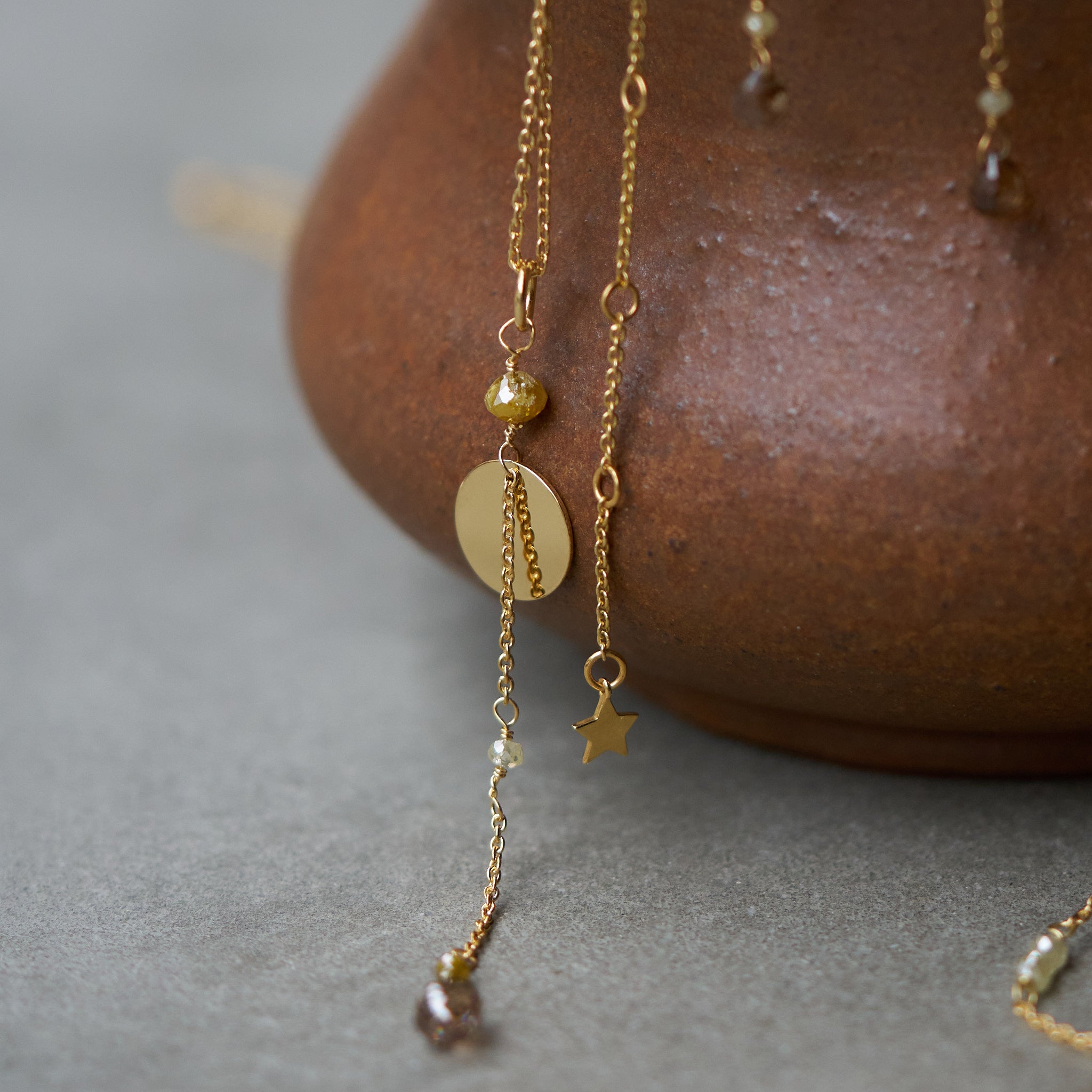 優しいイエローとアイスカラーのラフダイヤが、どこか懐かしさを感じさせる佇まい。静かな光をたたえるダイヤと繊細なチェーンに、ブリオレットカットのブラウンダイヤを贅沢にあしらいました。控えめな輝きが、大人の装いにそっと華を添えるネックレスです。