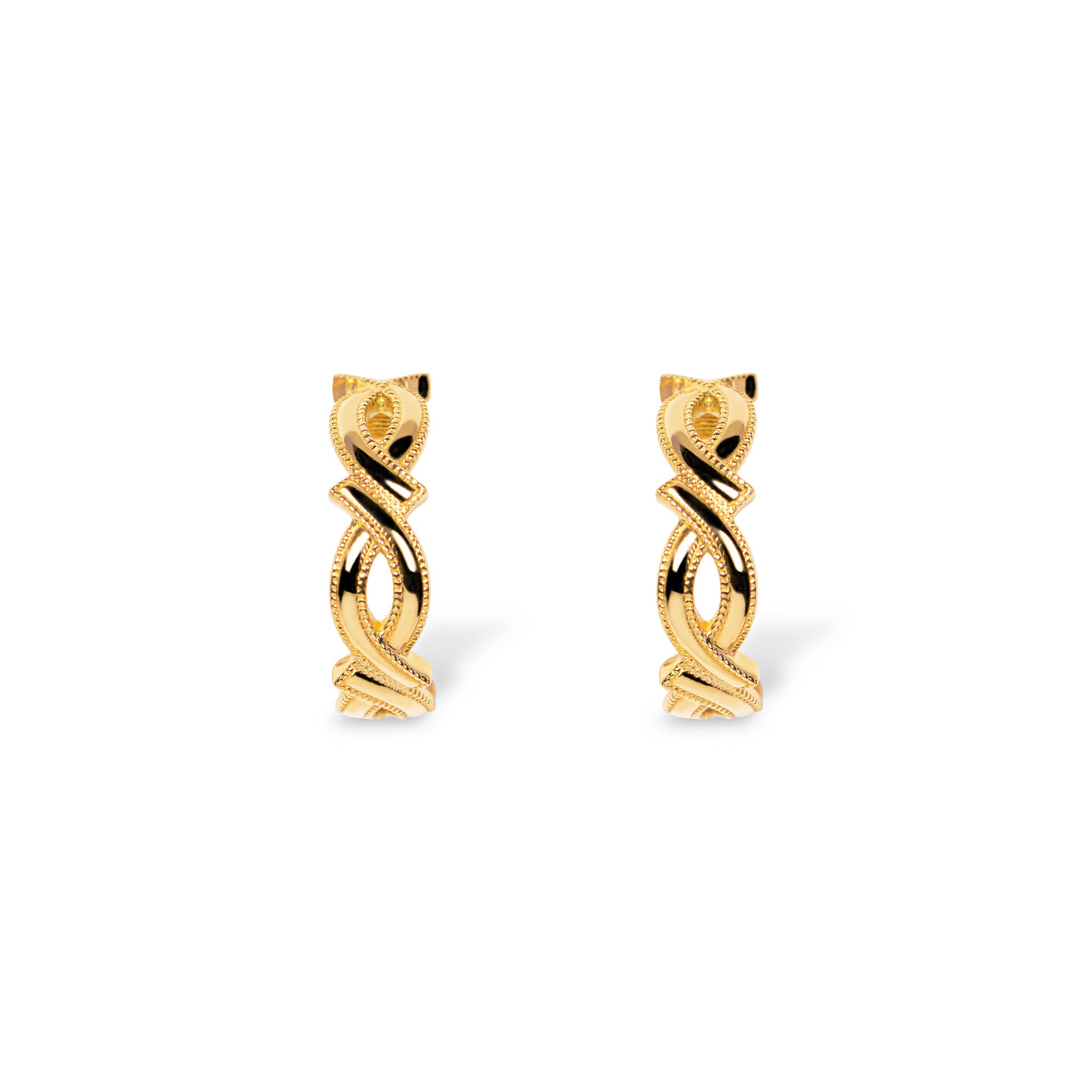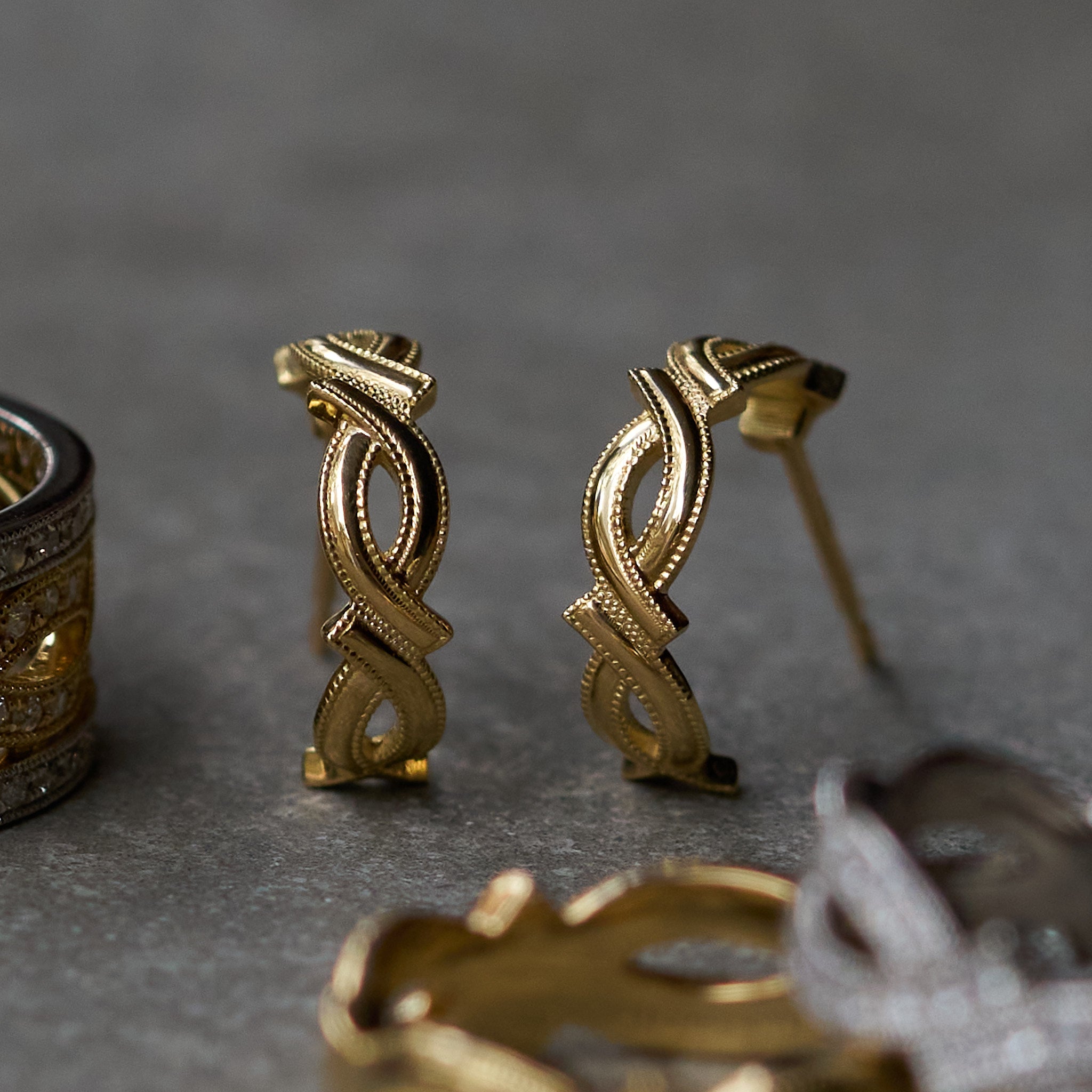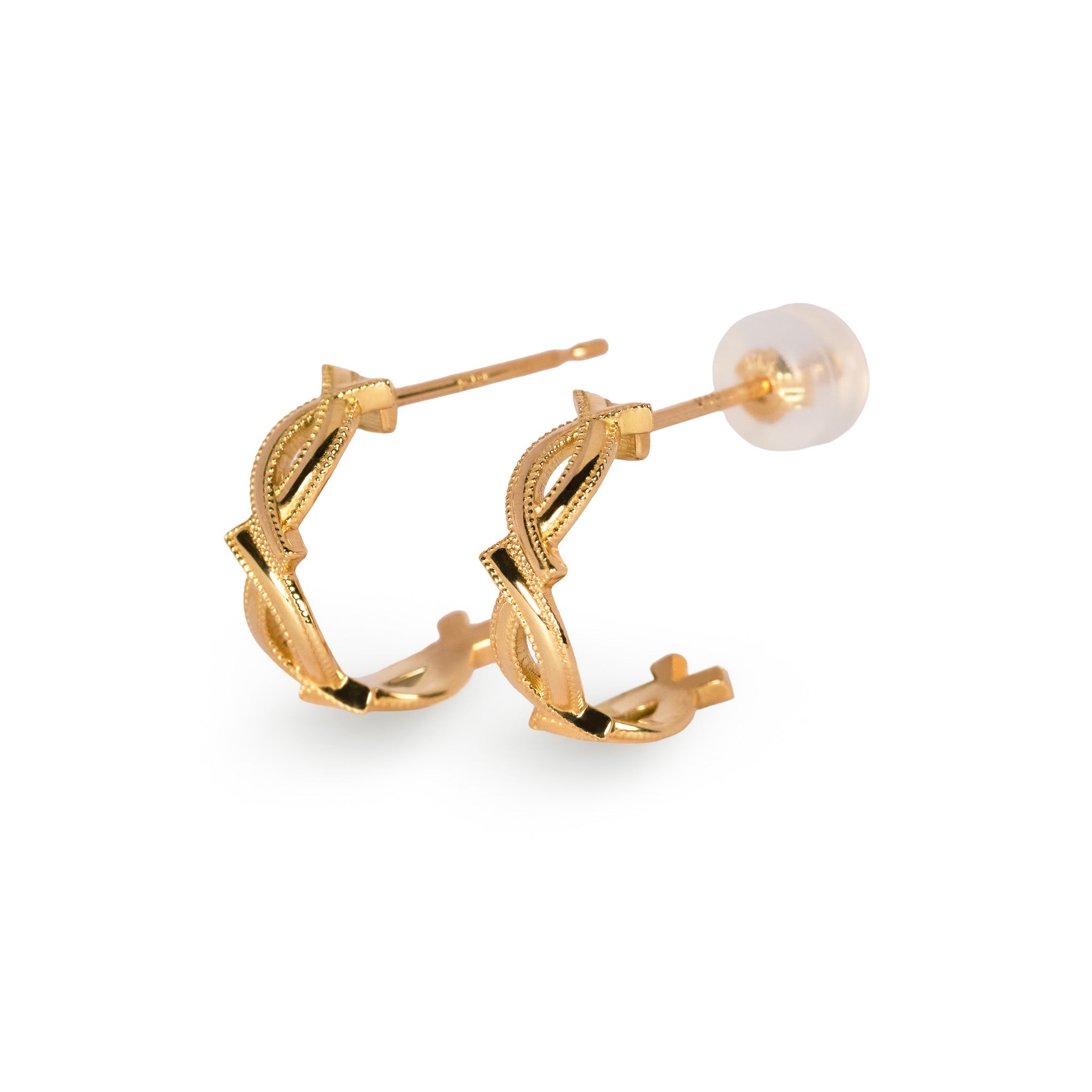 絡まり合い、支え合う蔦の姿を、繊細なミルグレインで描いたデザイン。フープピアスのような立体感が、お顔まわりをさりげなく輝かせます。