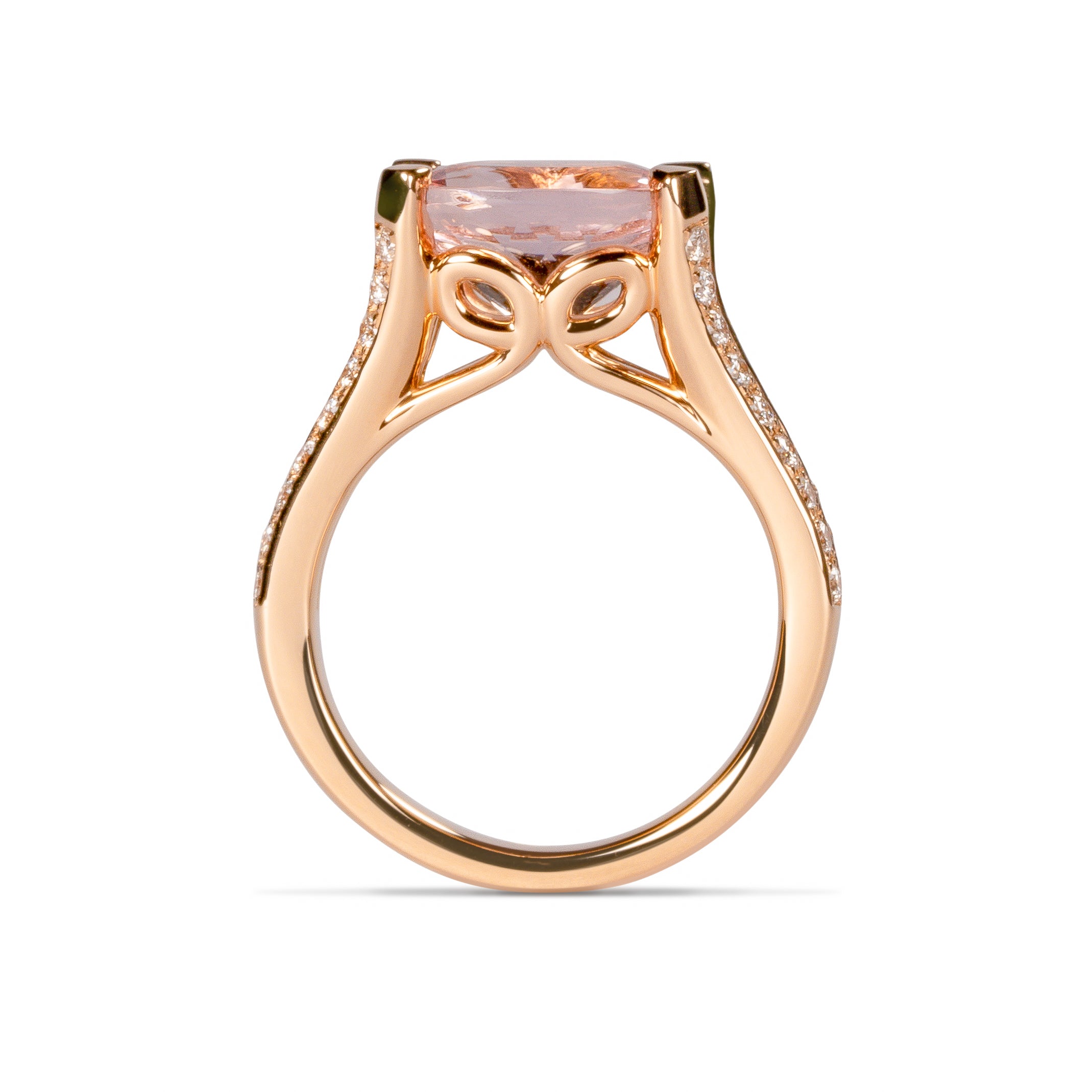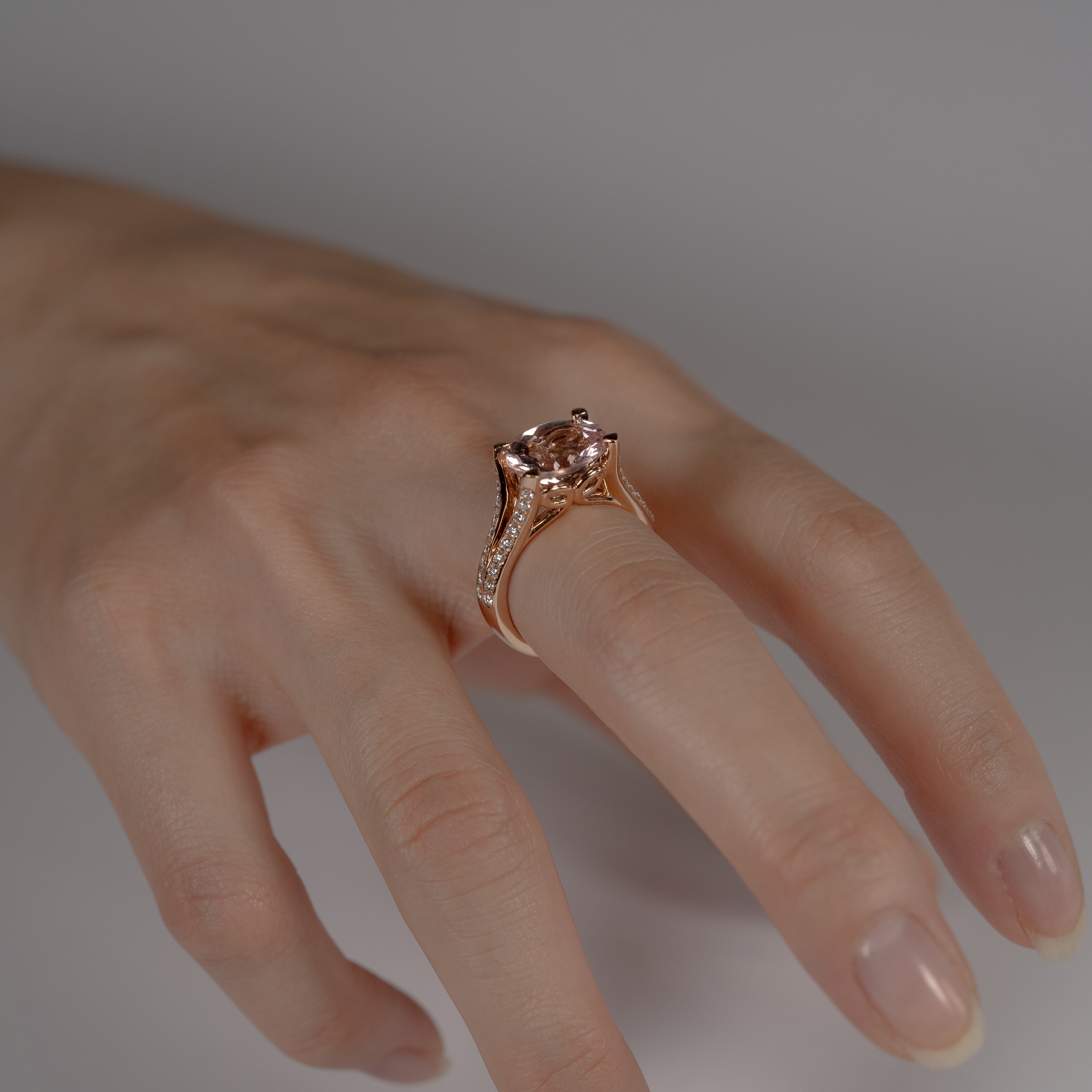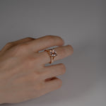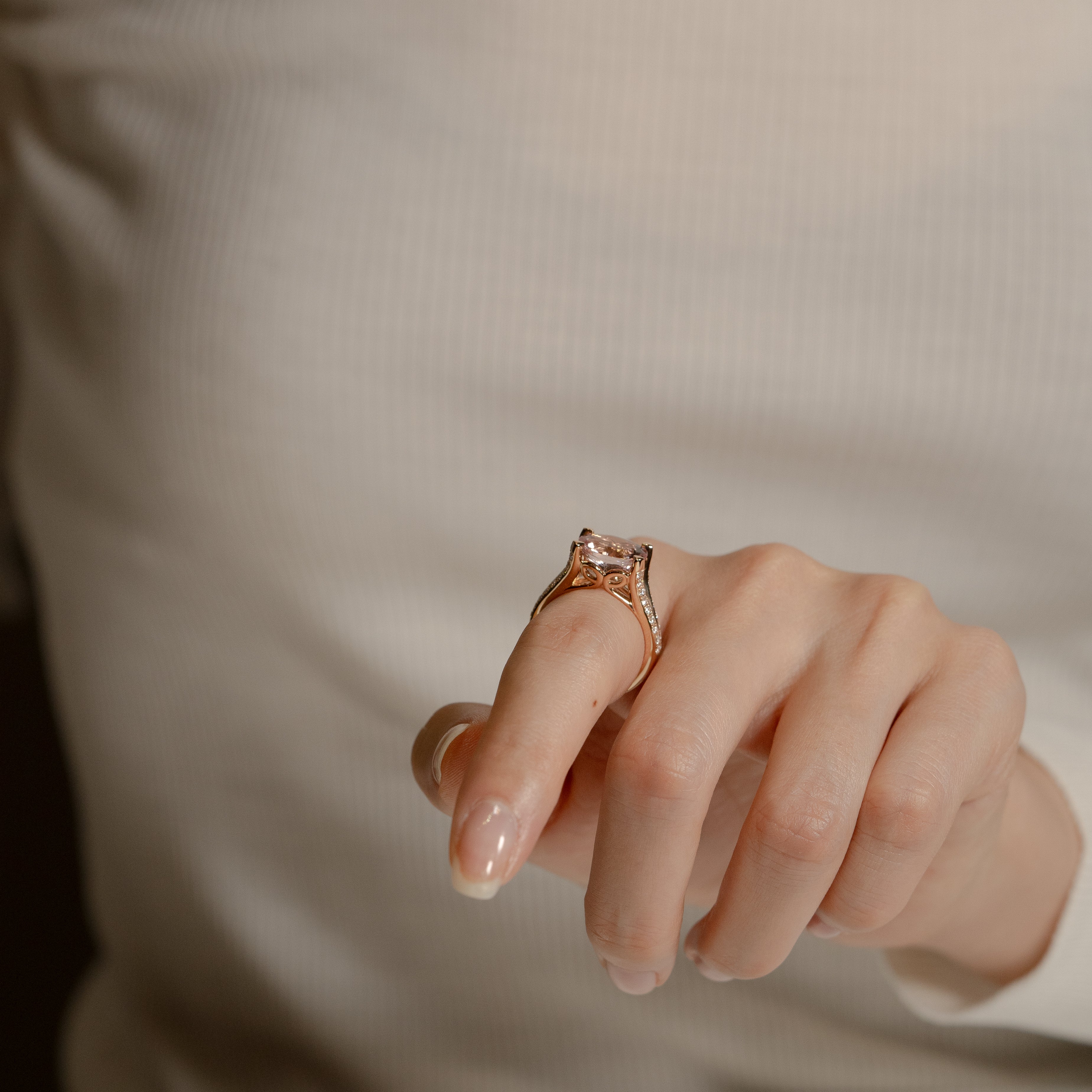 繊細なディテールと柔らかな輝きが魅力のモルガナイトリング。宝石の美しさだけでなく、横顔のカーブモチーフがモルガナイトの優しい色合いと調和し、洗練されたジュエリーに仕上がっています。たっぷりと使われたピンクゴールドが心地よい重量感を添え、手元を上品に演出します。