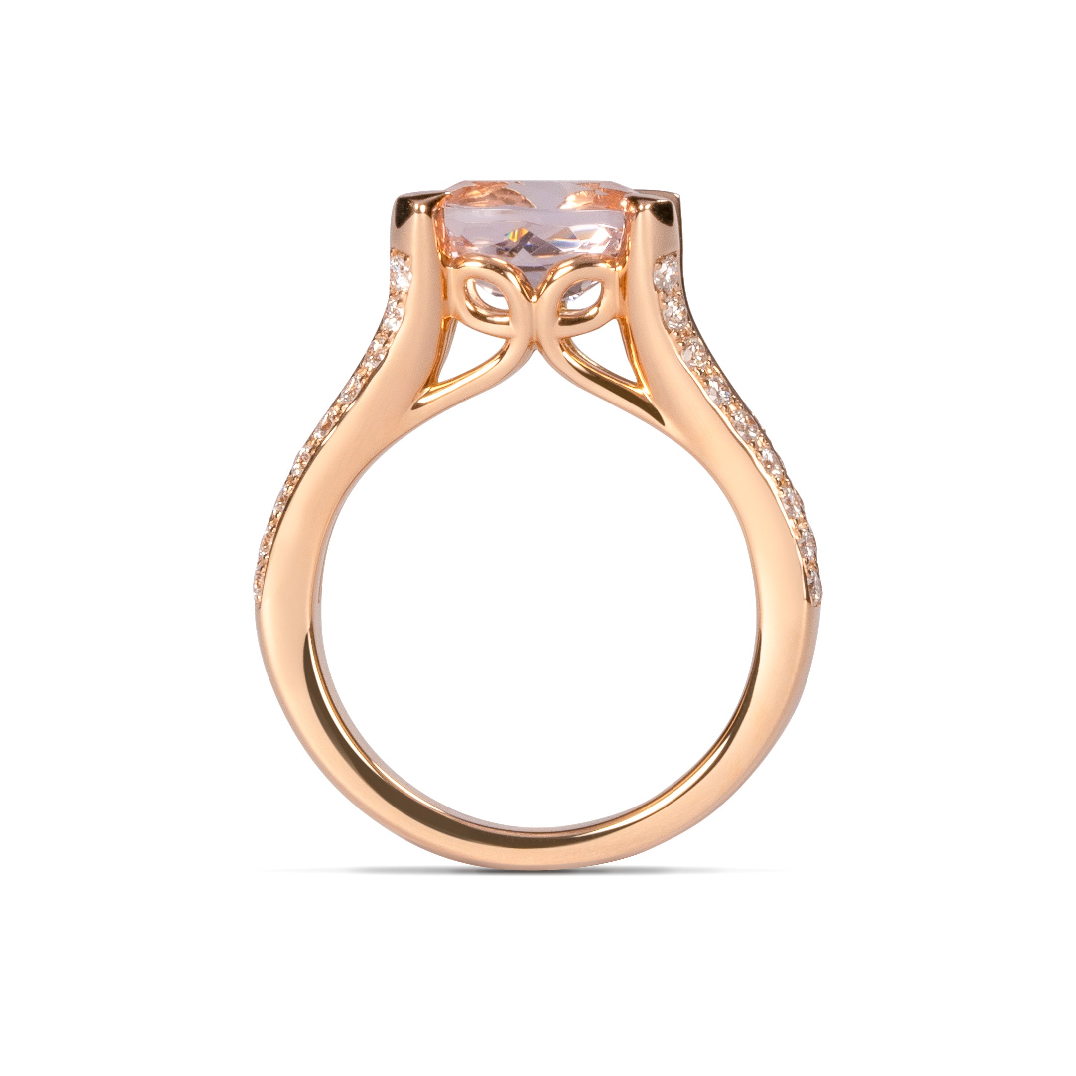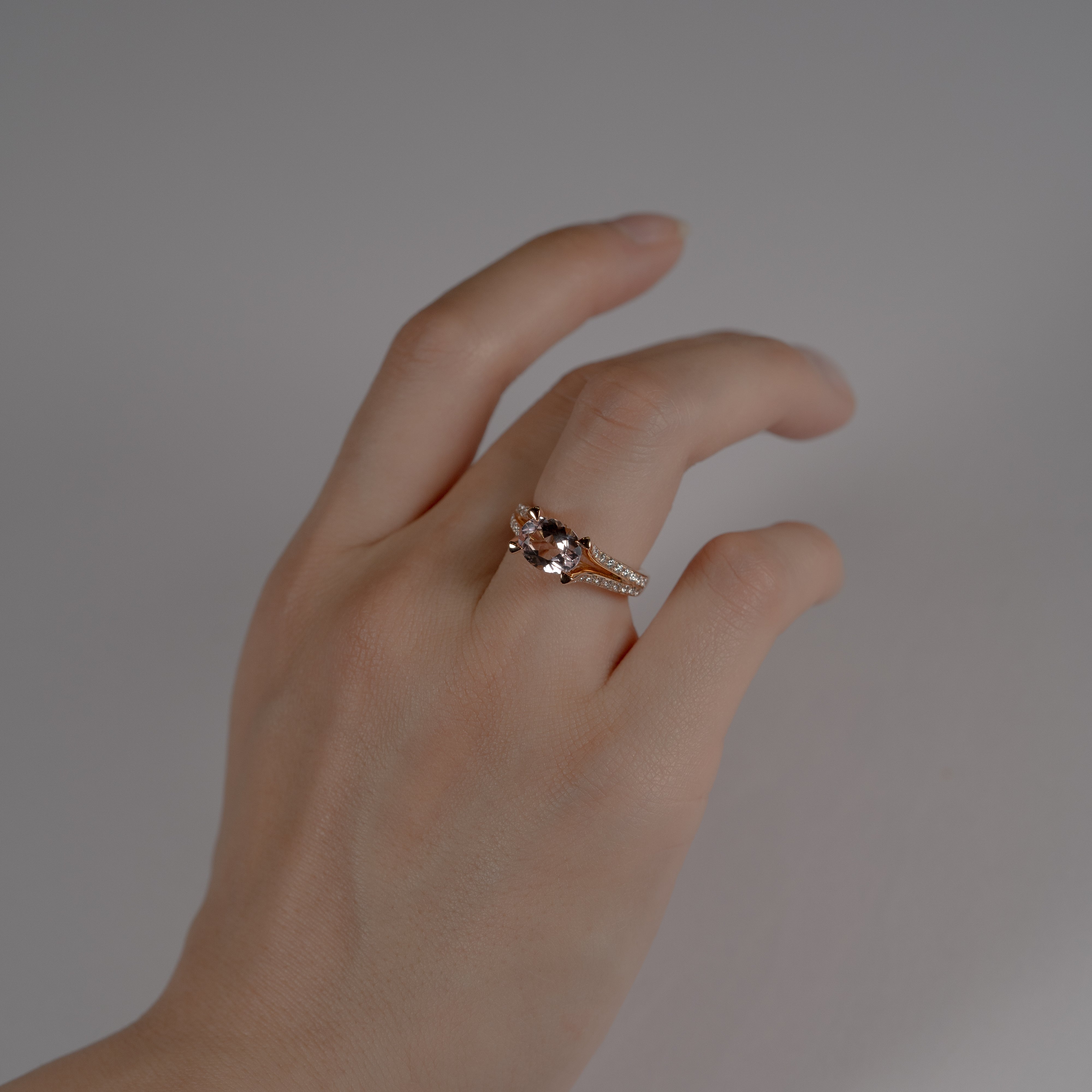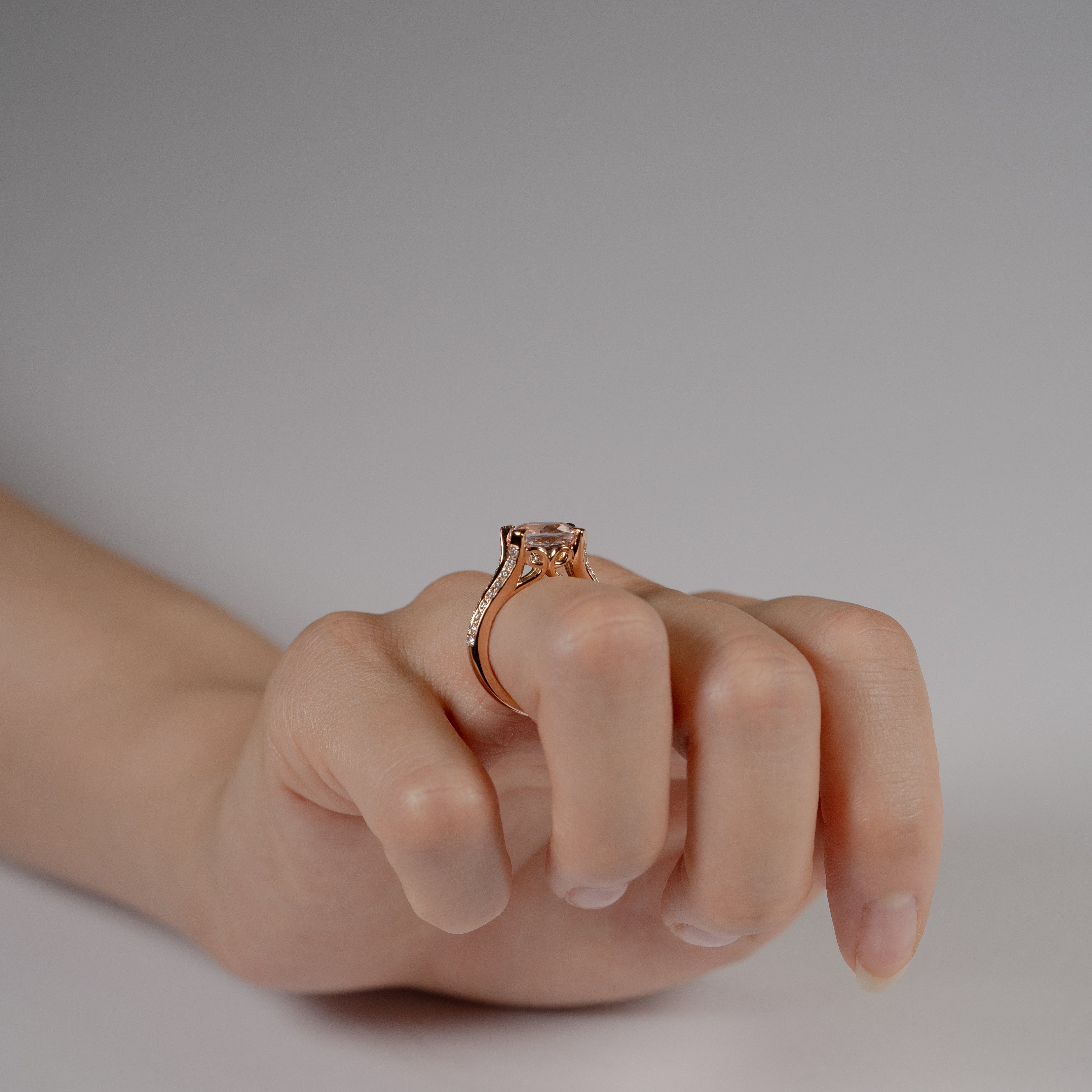 繊細なディテールと柔らかな輝きが魅力のモルガナイトリング。宝石の美しさだけでなく、横顔のカーブモチーフがモルガナイトの優しい色合いと調和し、洗練されたジュエリーに仕上がっています。たっぷりと使われたピンクゴールドが心地よい重量感を添え、手元を上品に演出します。