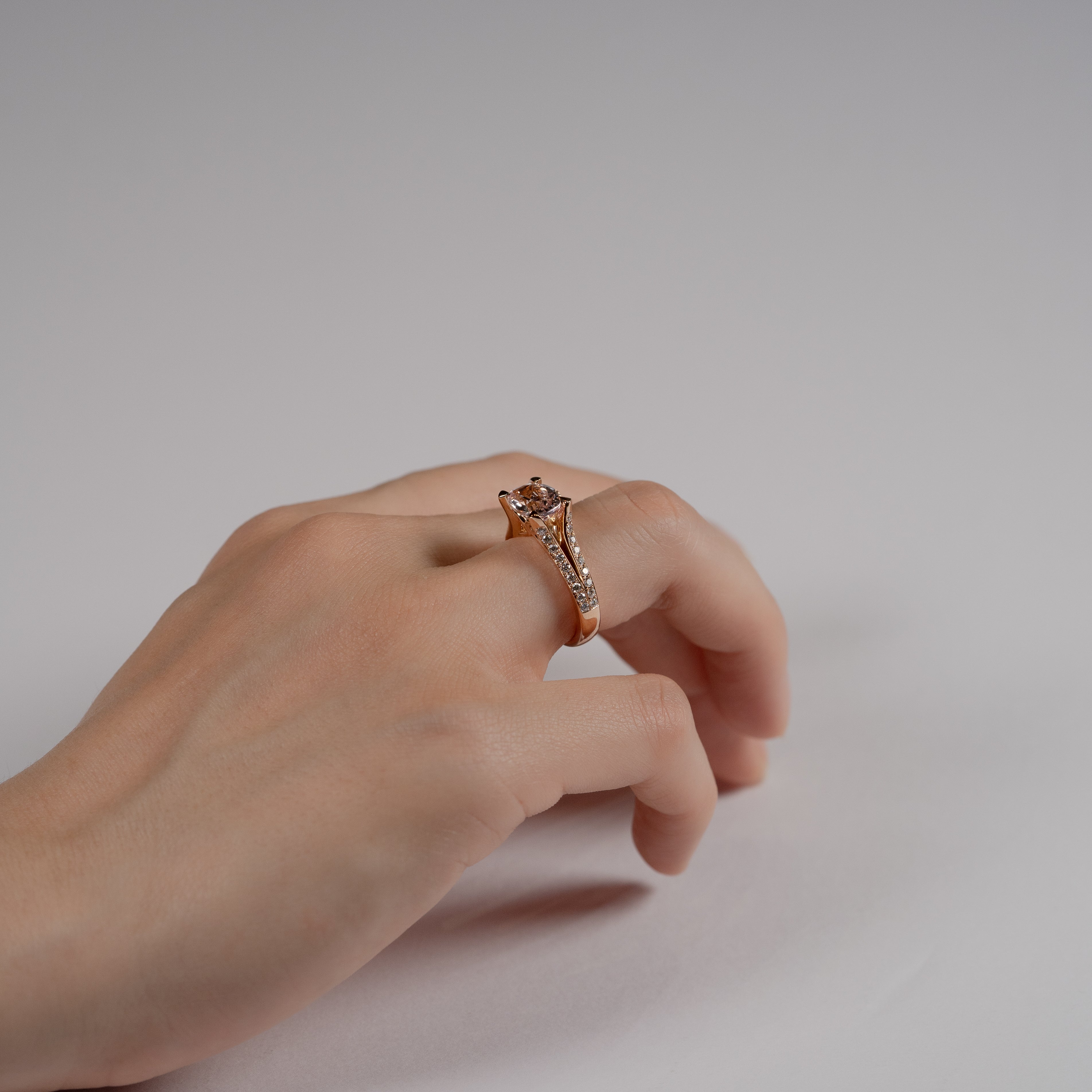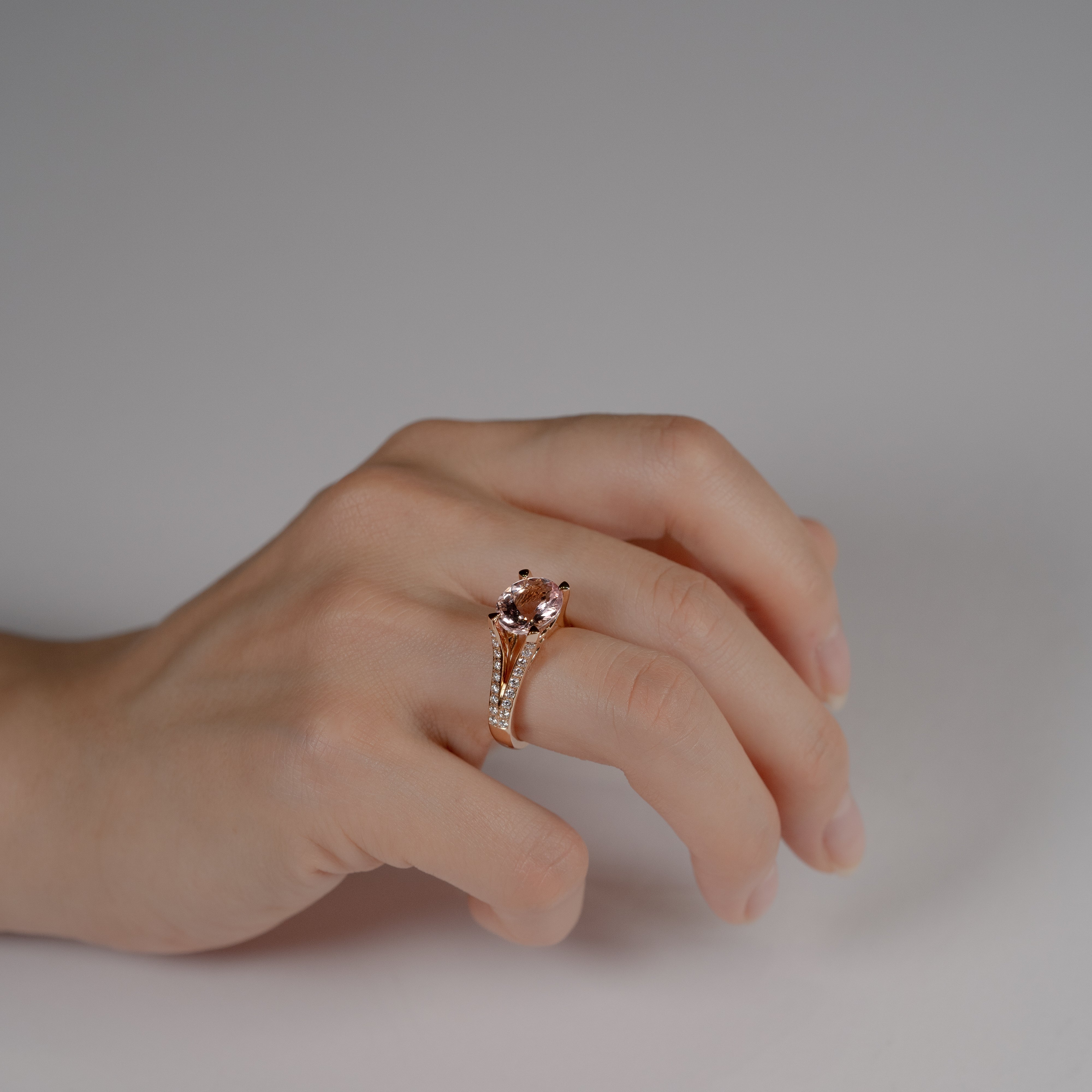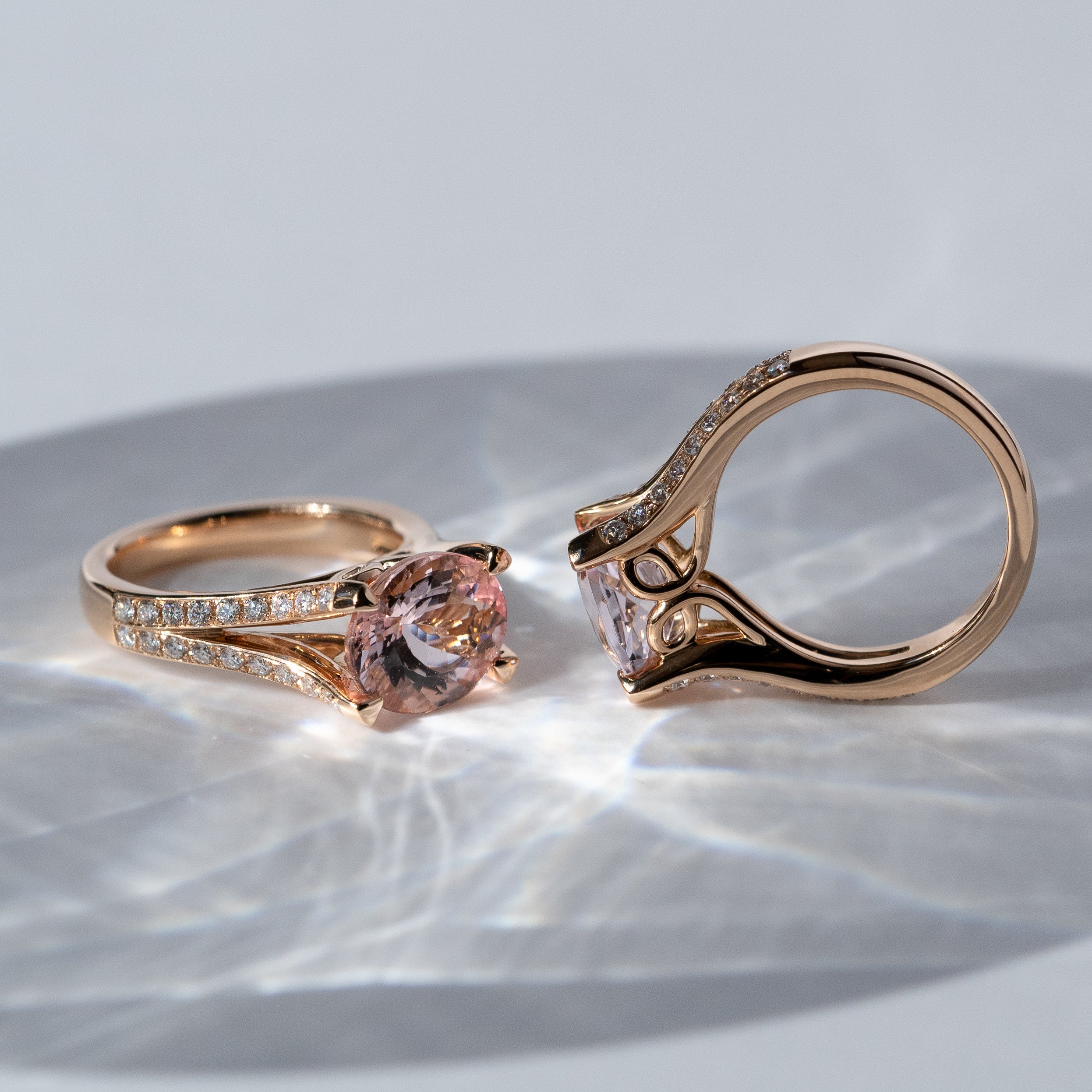 繊細なディテールと柔らかな輝きが魅力のモルガナイトリング。宝石の美しさだけでなく、横顔のカーブモチーフがモルガナイトの優しい色合いと調和し、洗練されたジュエリーに仕上がっています。たっぷりと使われたピンクゴールドが心地よい重量感を添え、手元を上品に演出します。