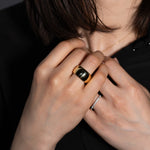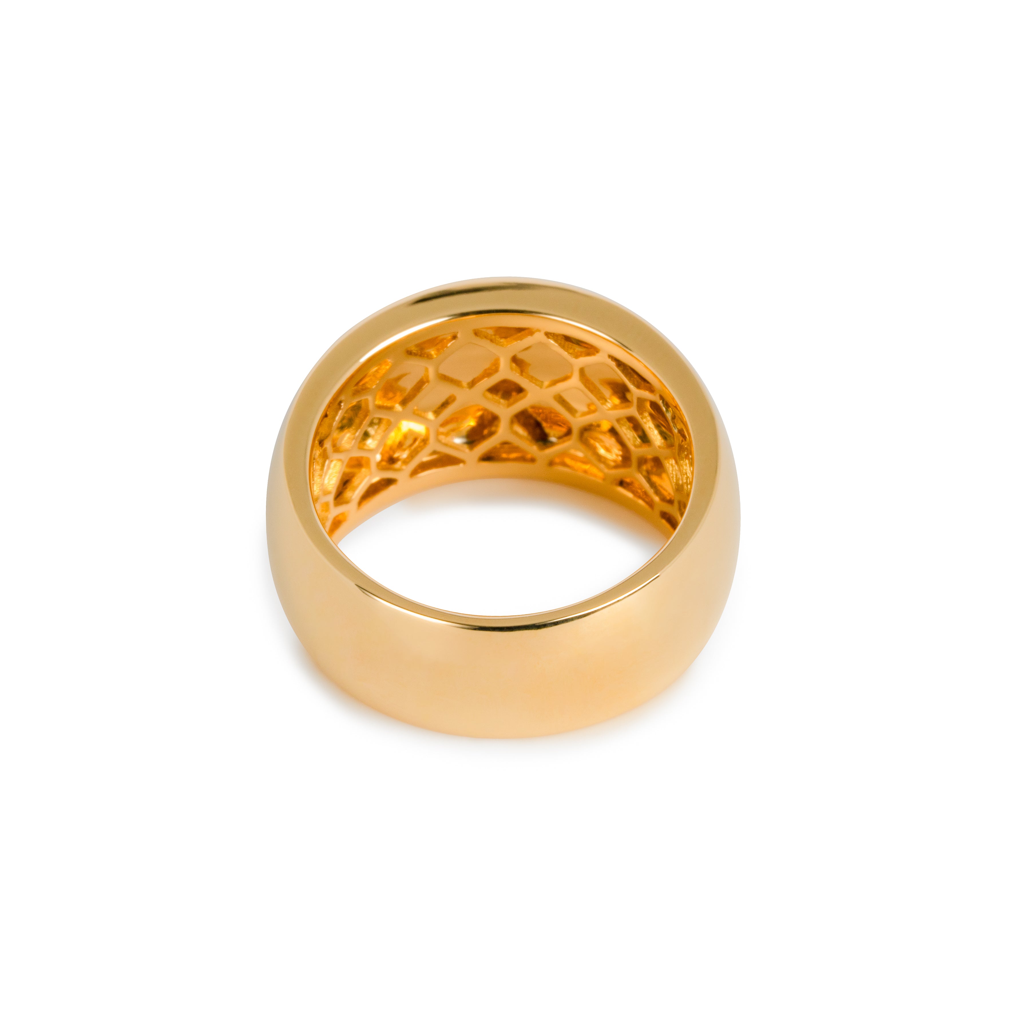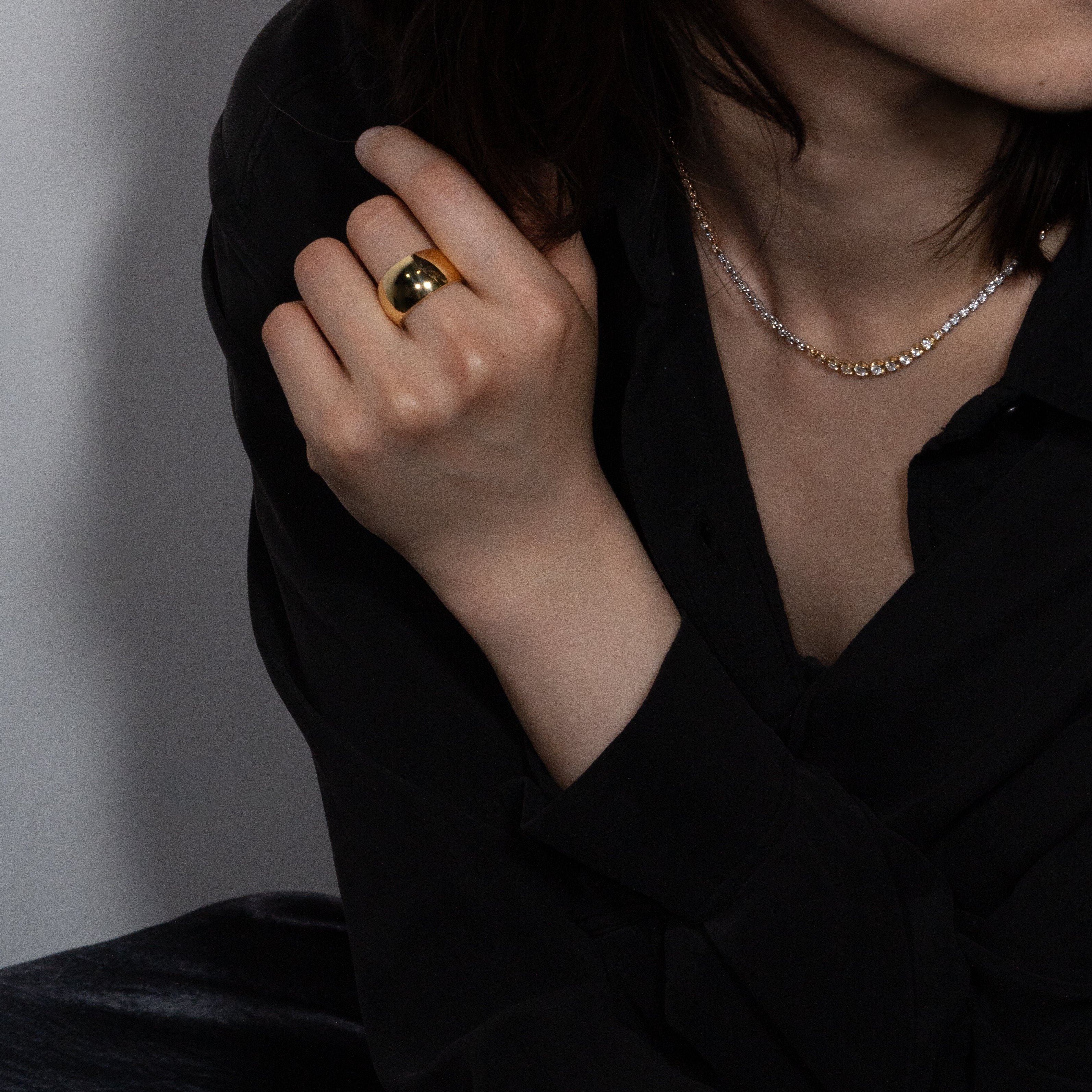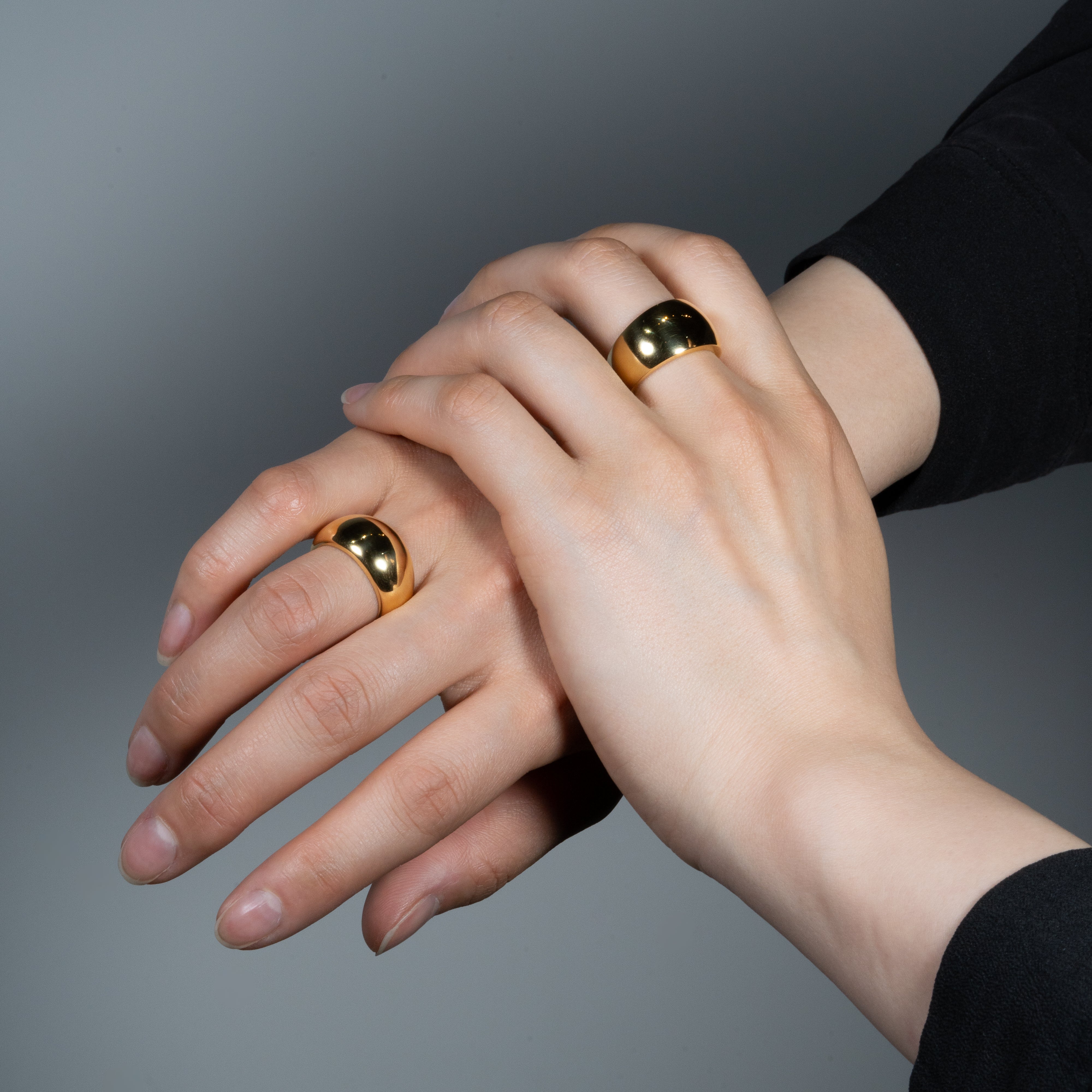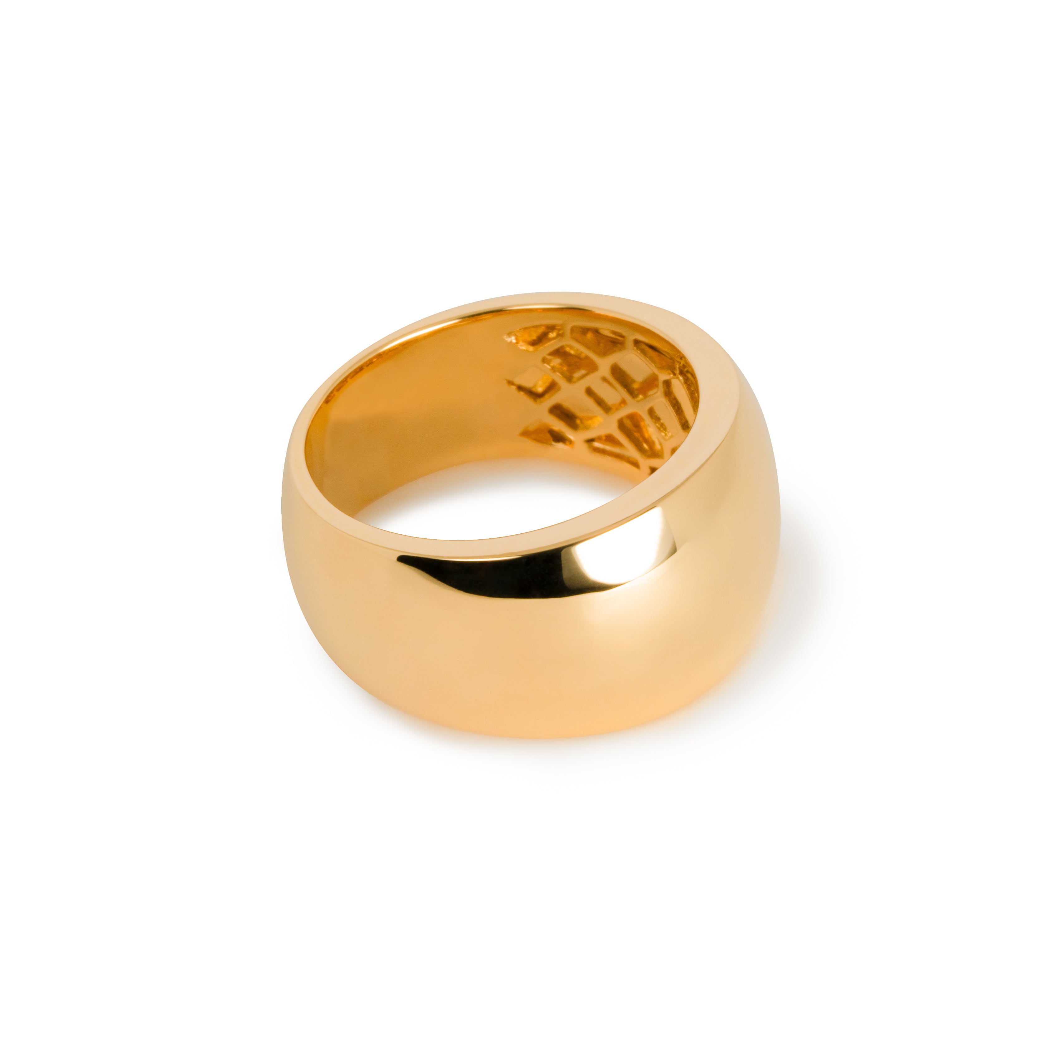 豊かなボリュームと重量感で満たされた優雅な丸みの中にエッジのあるリング。ゴールドが織りなすシンプルでありながら艶やかなボディは、上質なリッチさを体現しています。初めて手にした時から放つ煌めきは、時間を経るごとに持ち主の日常に溶け込み、細かな傷や経年変化による風合いを纏い、さらに深みを増していきます。手にする人と共に成長し、時を重ねてゆく、そんなジュエリーです。