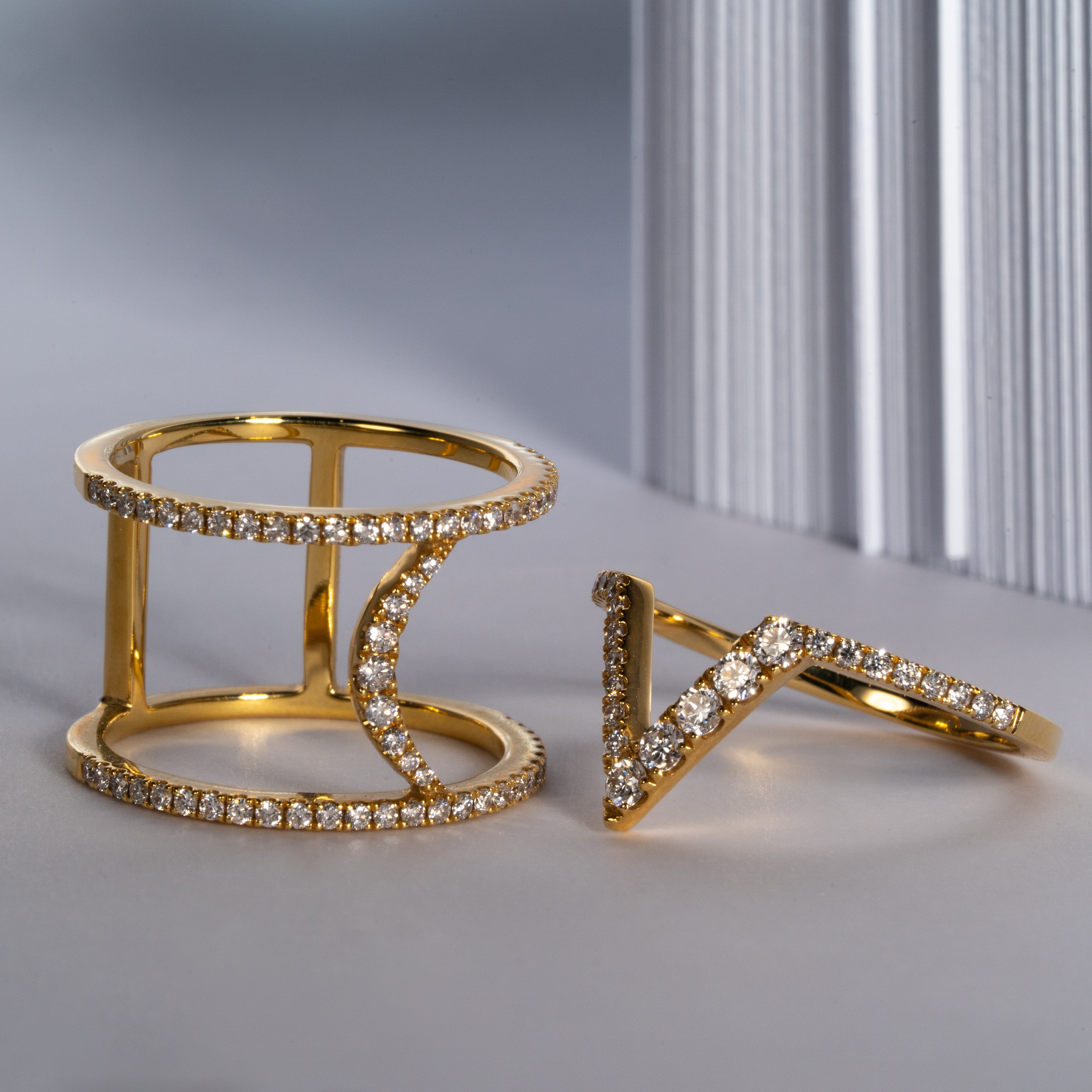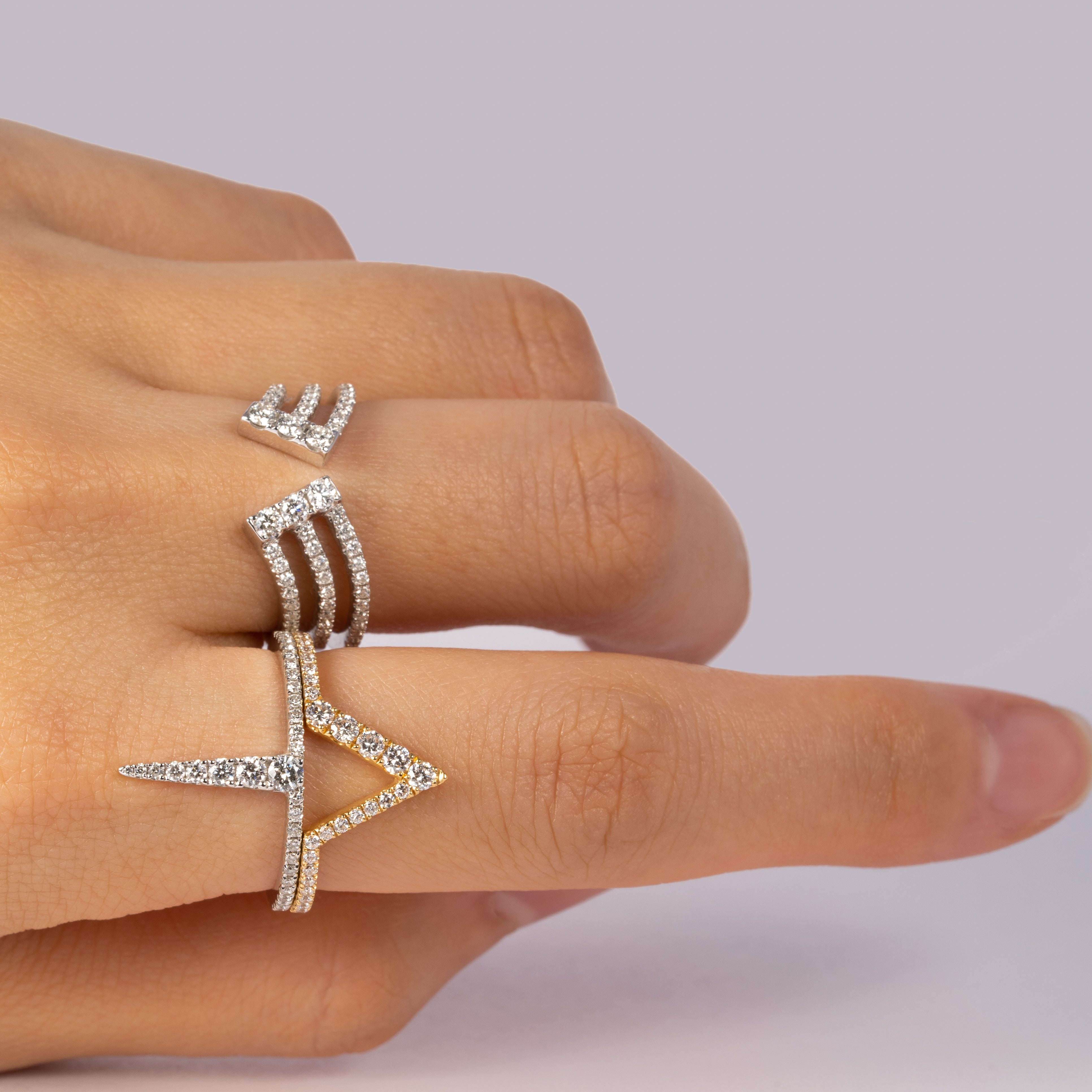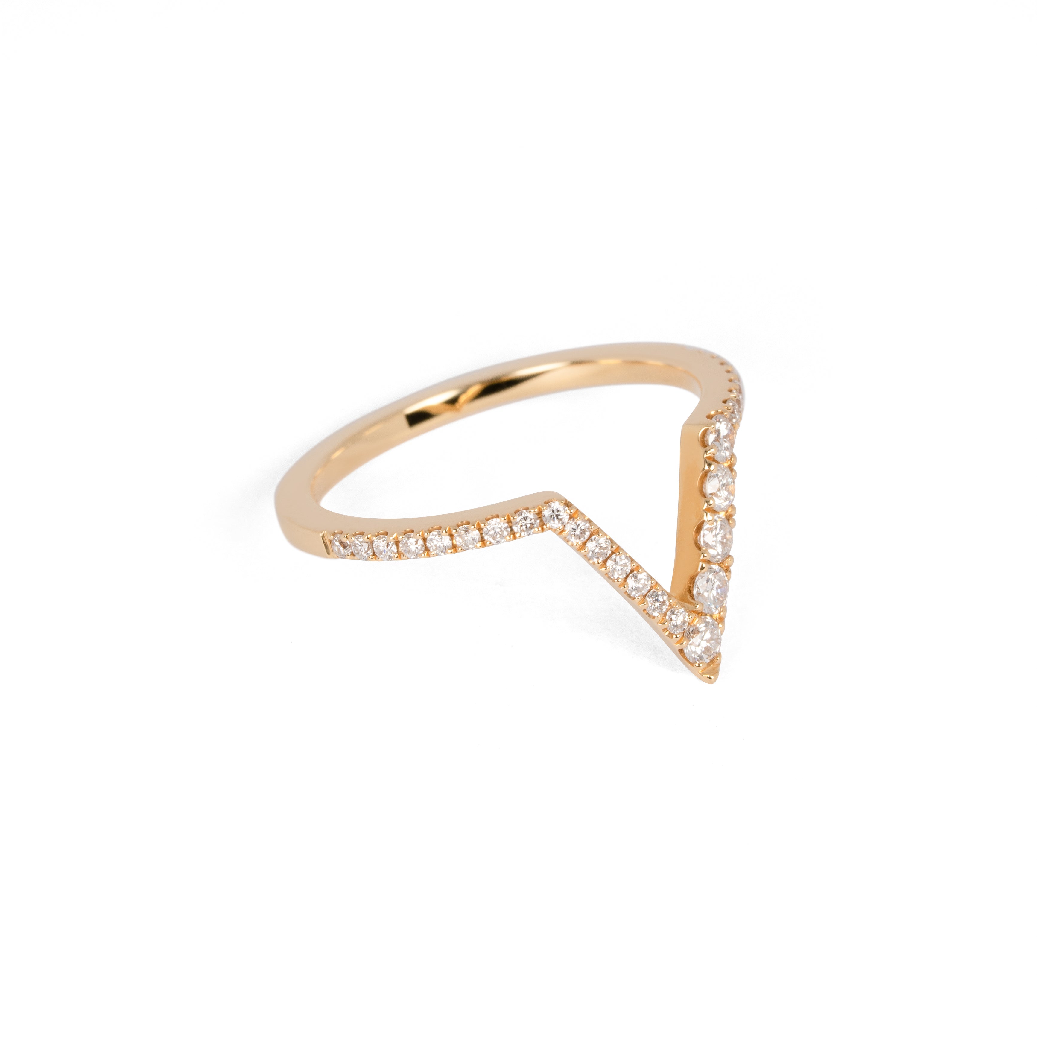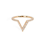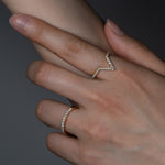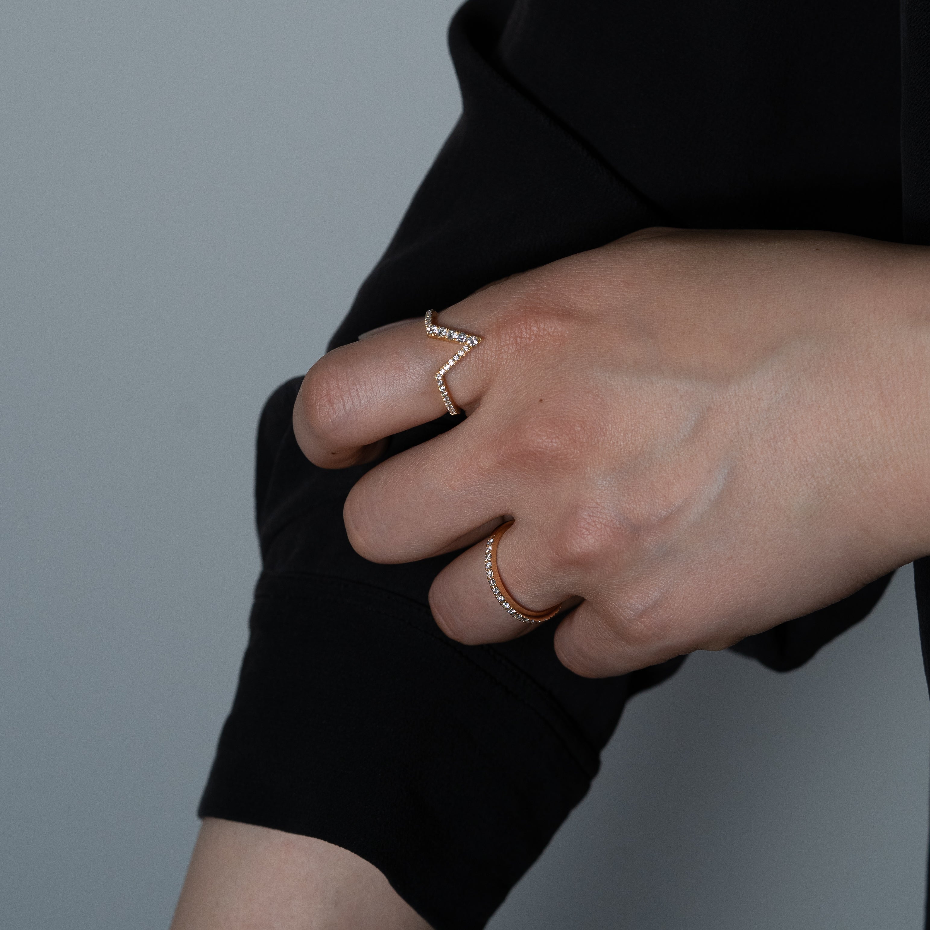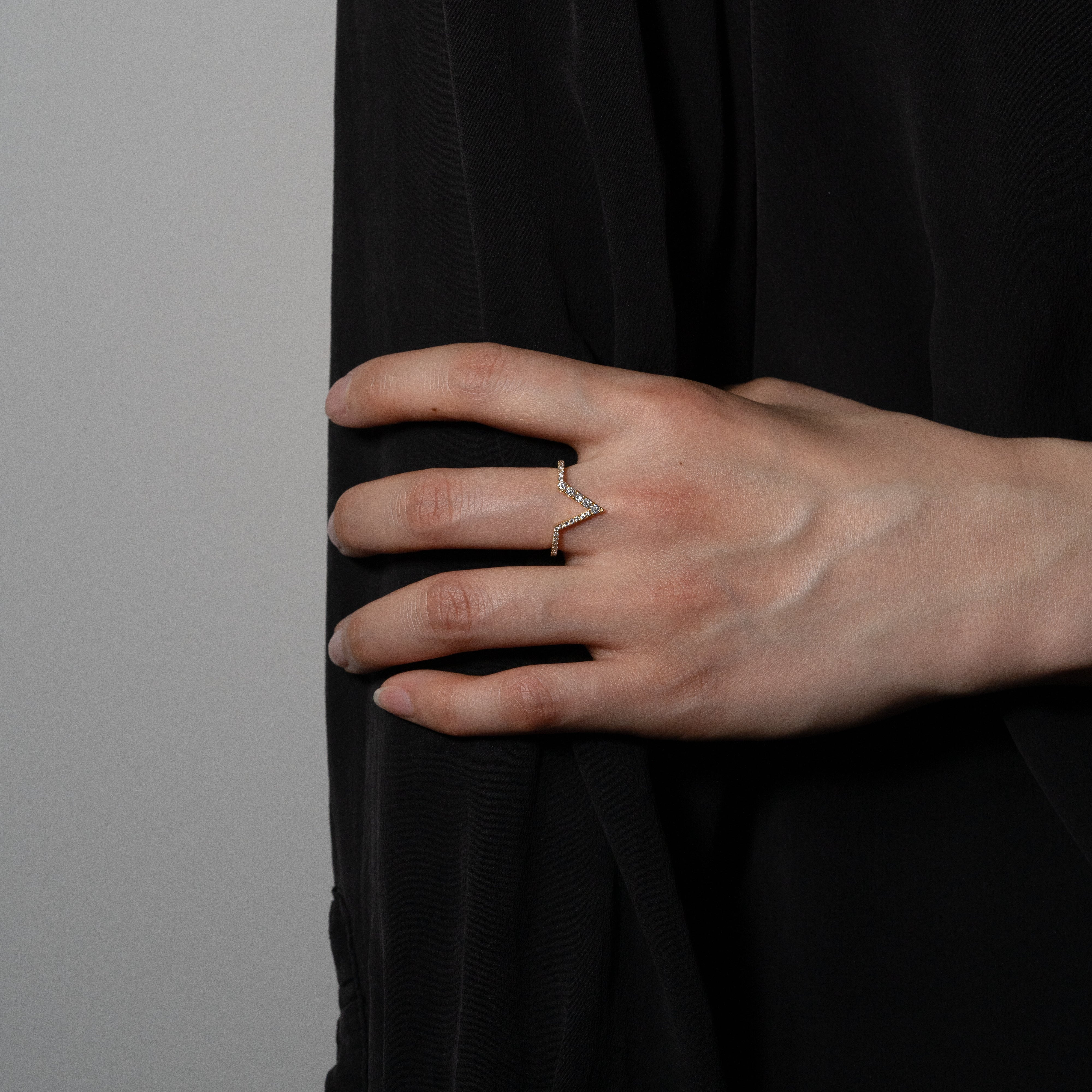 シャープなV字が際立つデザイン。アームの太さをアシンメトリーにしたディテールの工夫も楽しいリング。