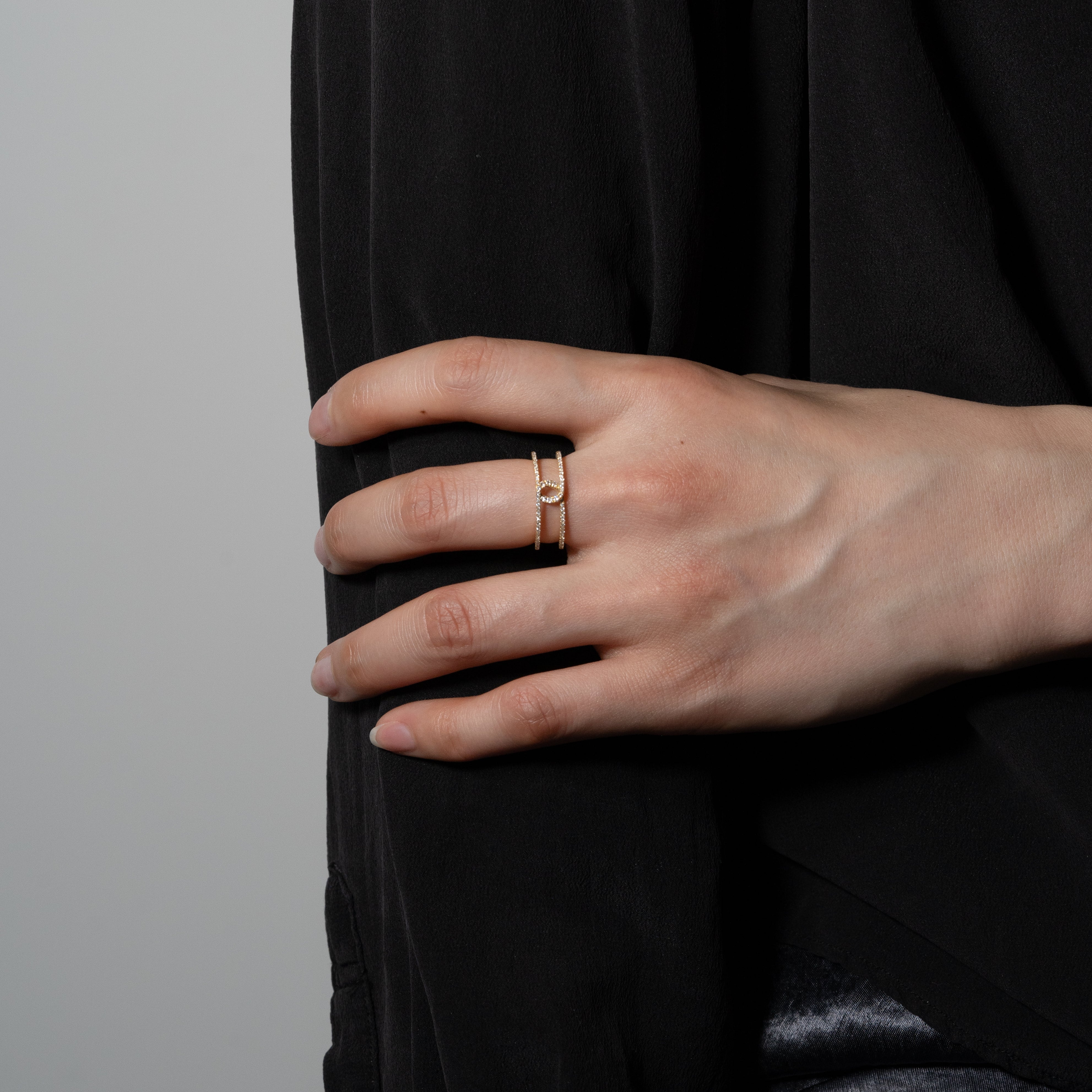 抱き合うように優しく重なりあう曲線。ダイヤモンドの繊細なきらめきと着用した時に生まれる空間が美しいリングです。個性的なリングにチャレンジしたいけれど大ぶりなデザインが得意ではない方にもおすすめ。