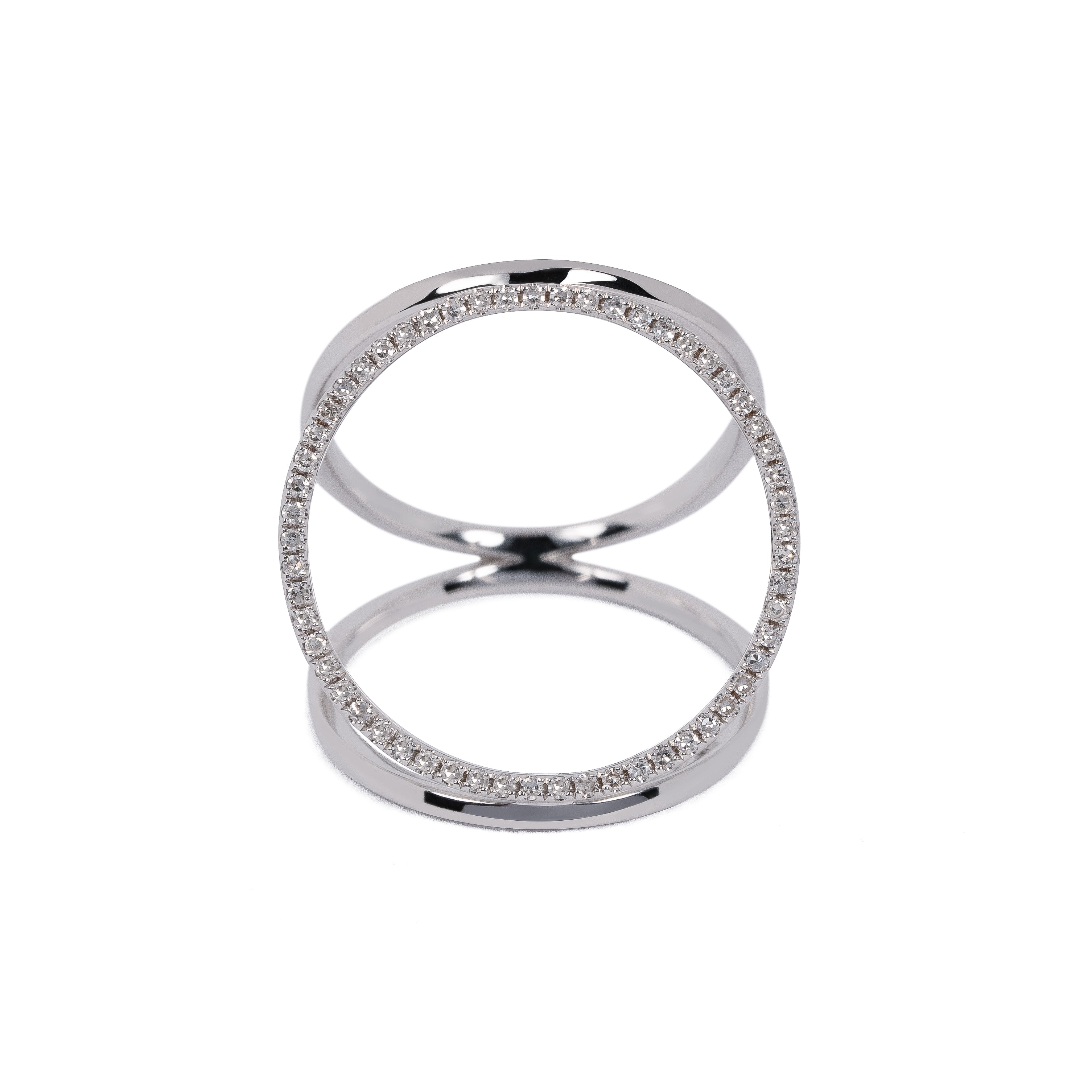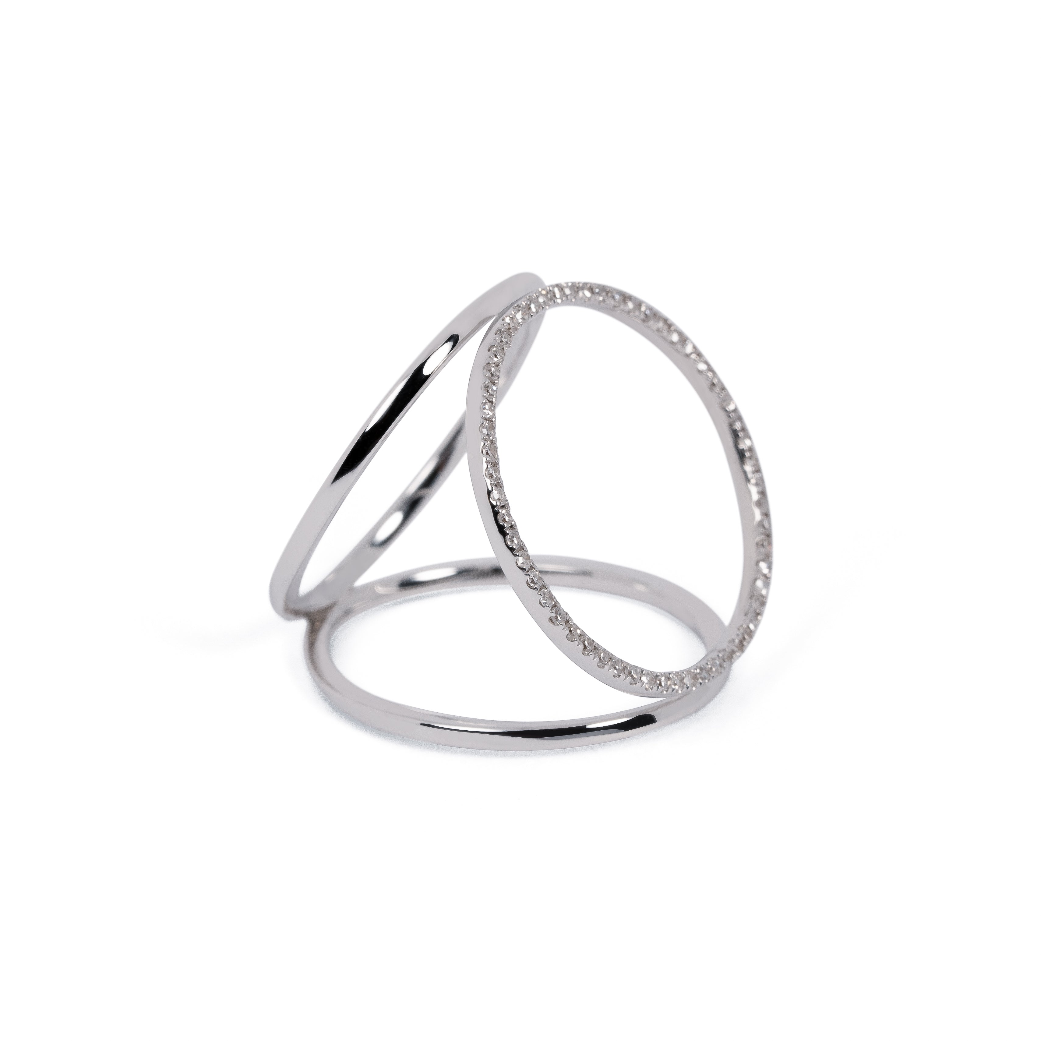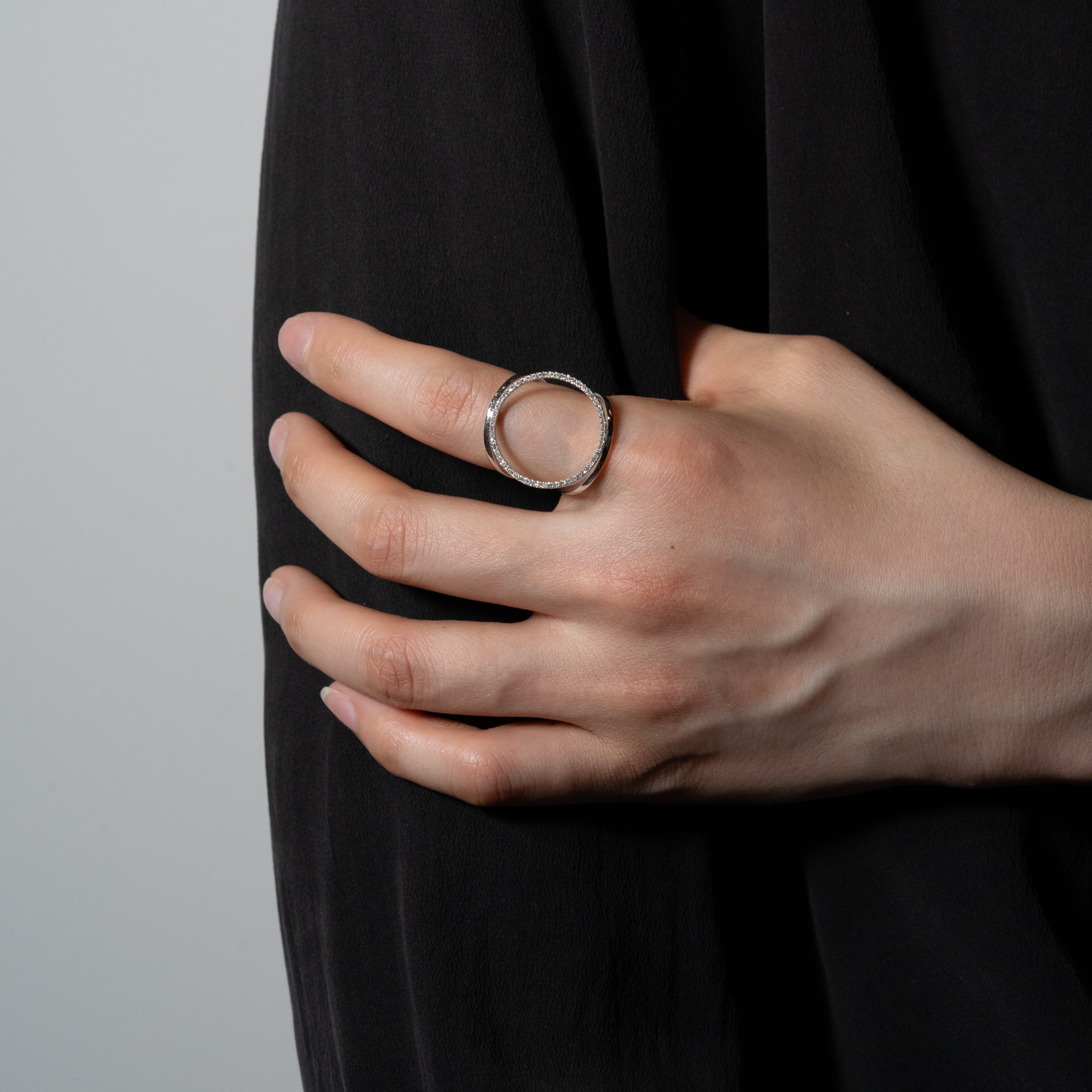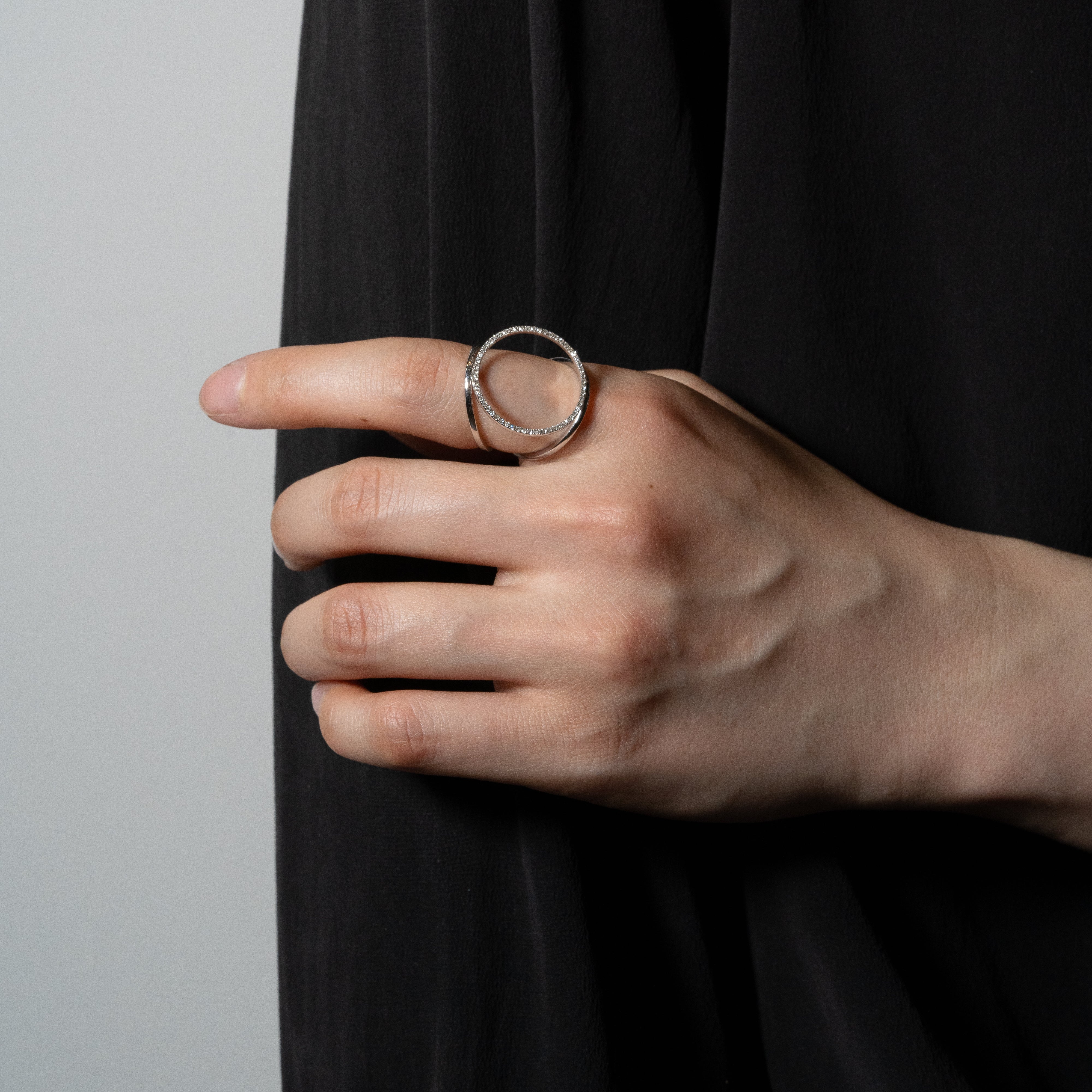 3つの円で構成されたリング。身につけると指の上に大きなメレダイヤモンドの円が浮かび上がります。華奢なラインと大胆な余白がダイナミックかつミニマルなデザイン。
