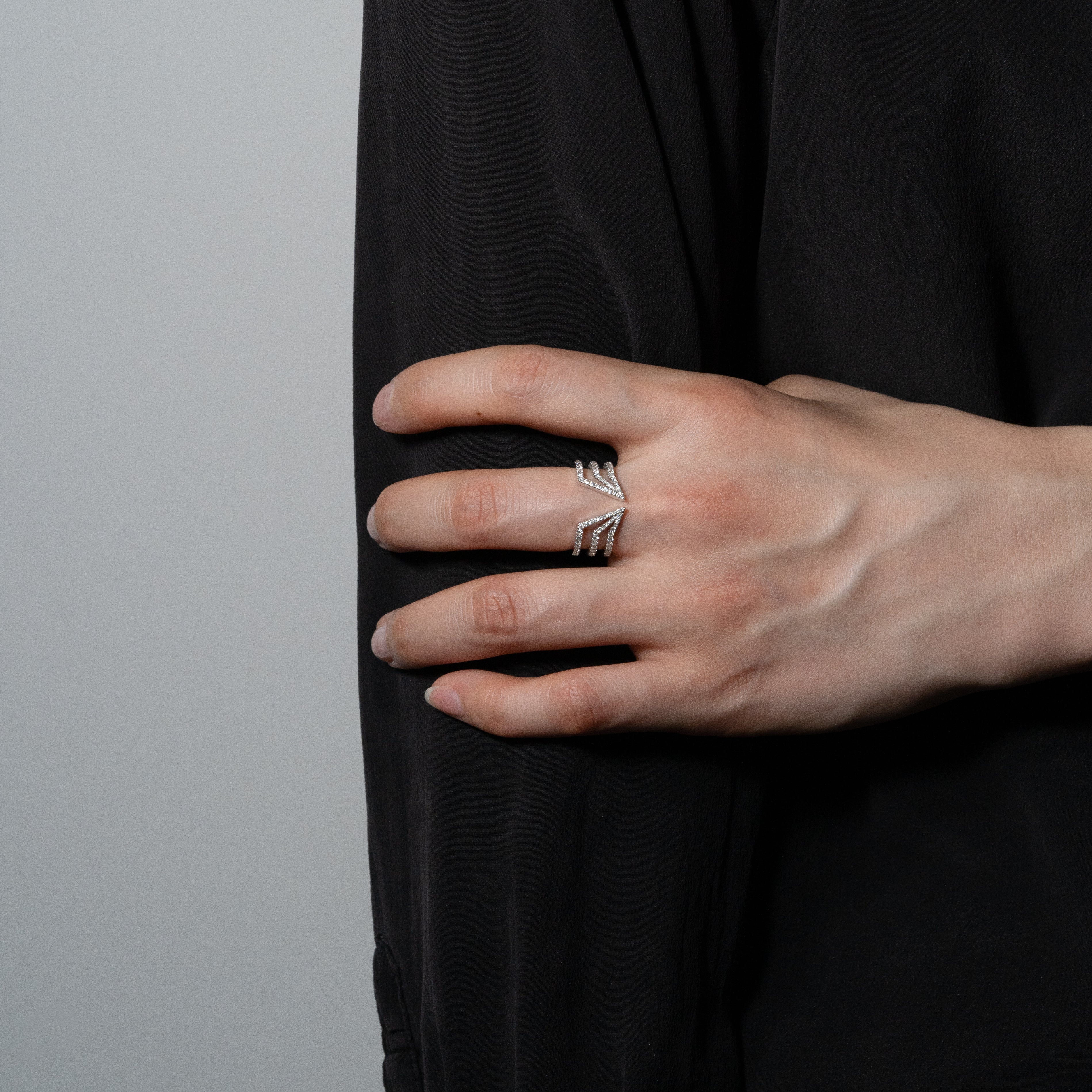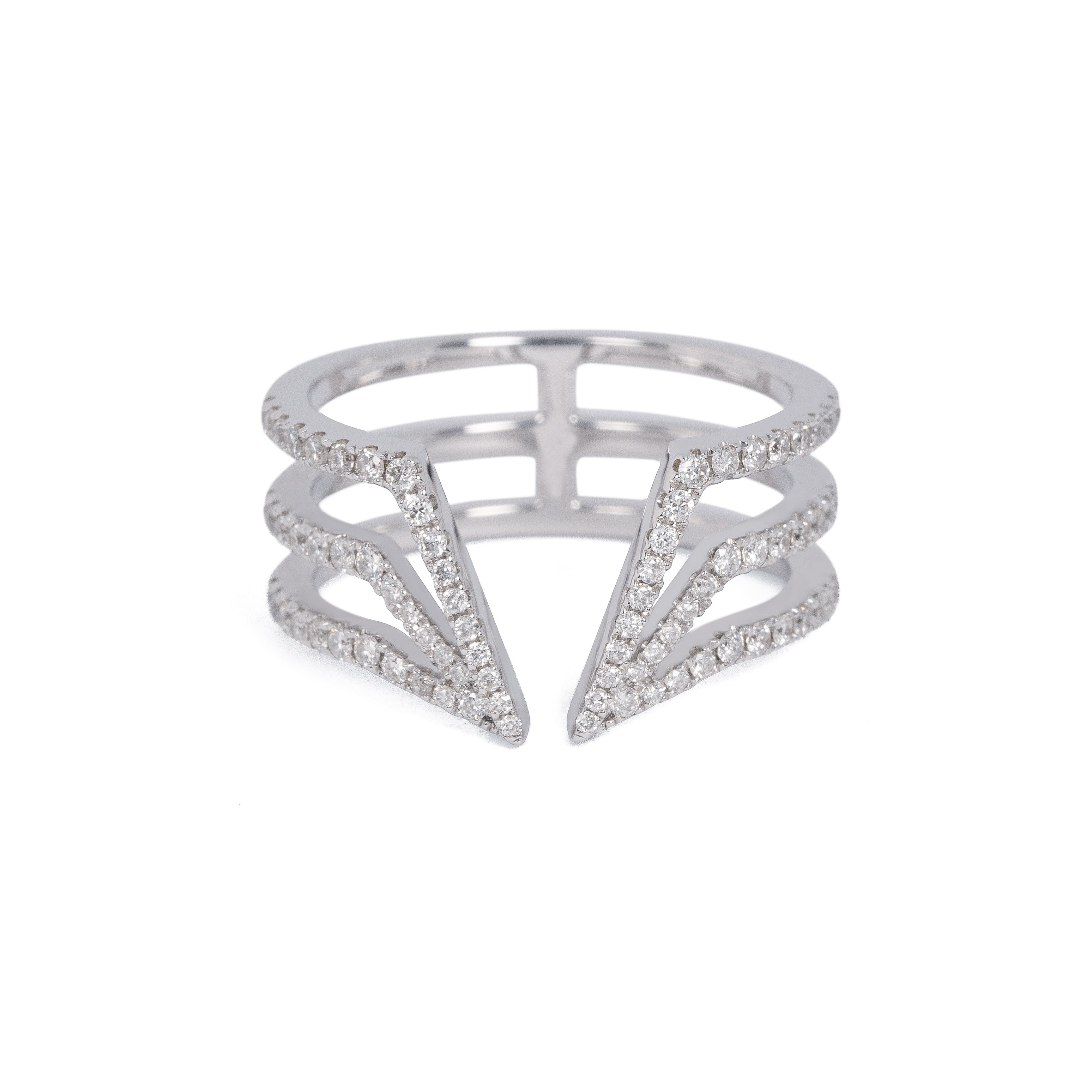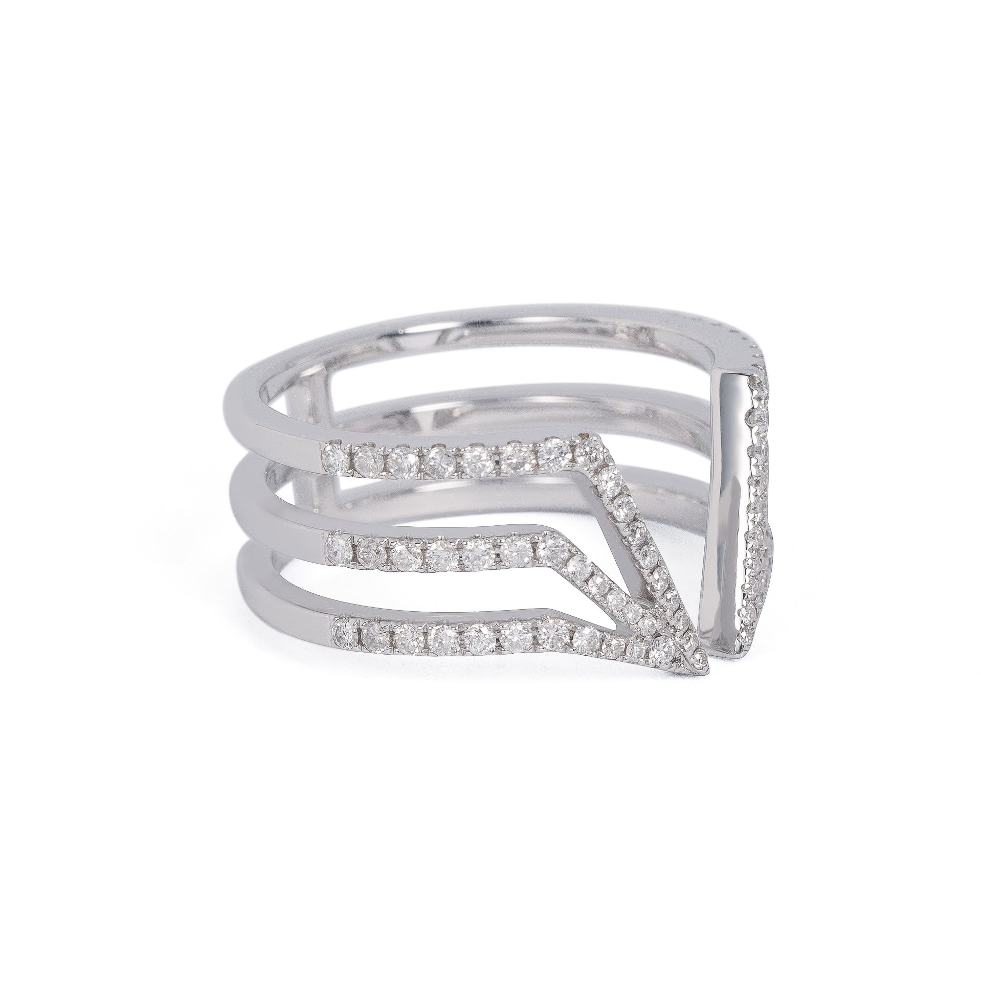 きらめくダイヤモンドが印象的な3つの直線が中央で結束するリングです。大ぶりなメレダイヤモンドを使用し、華やかで力強い印象のジュエリーです。
