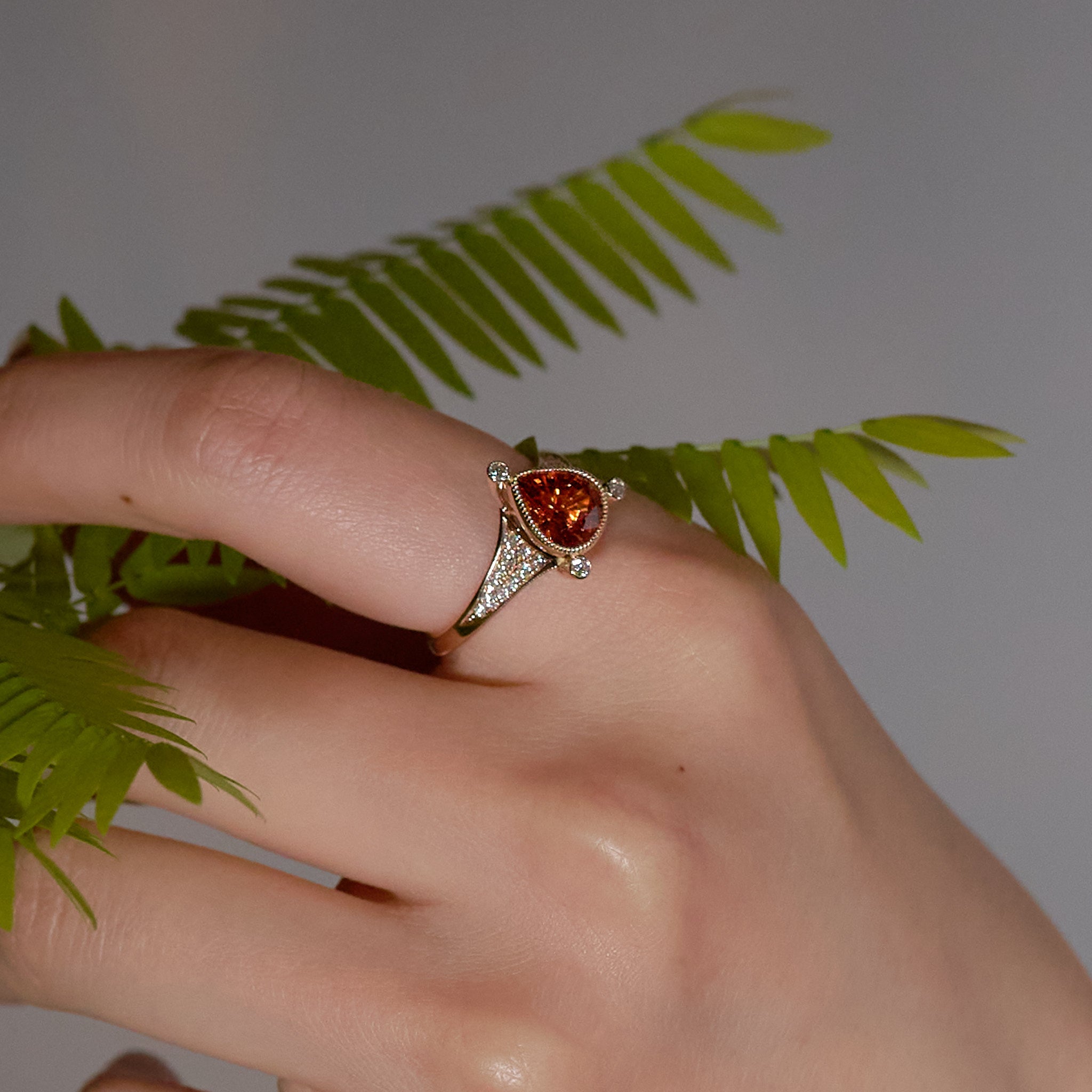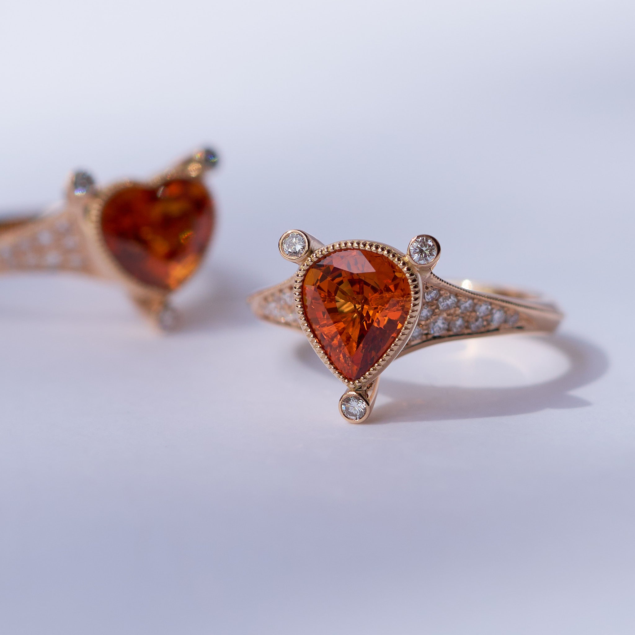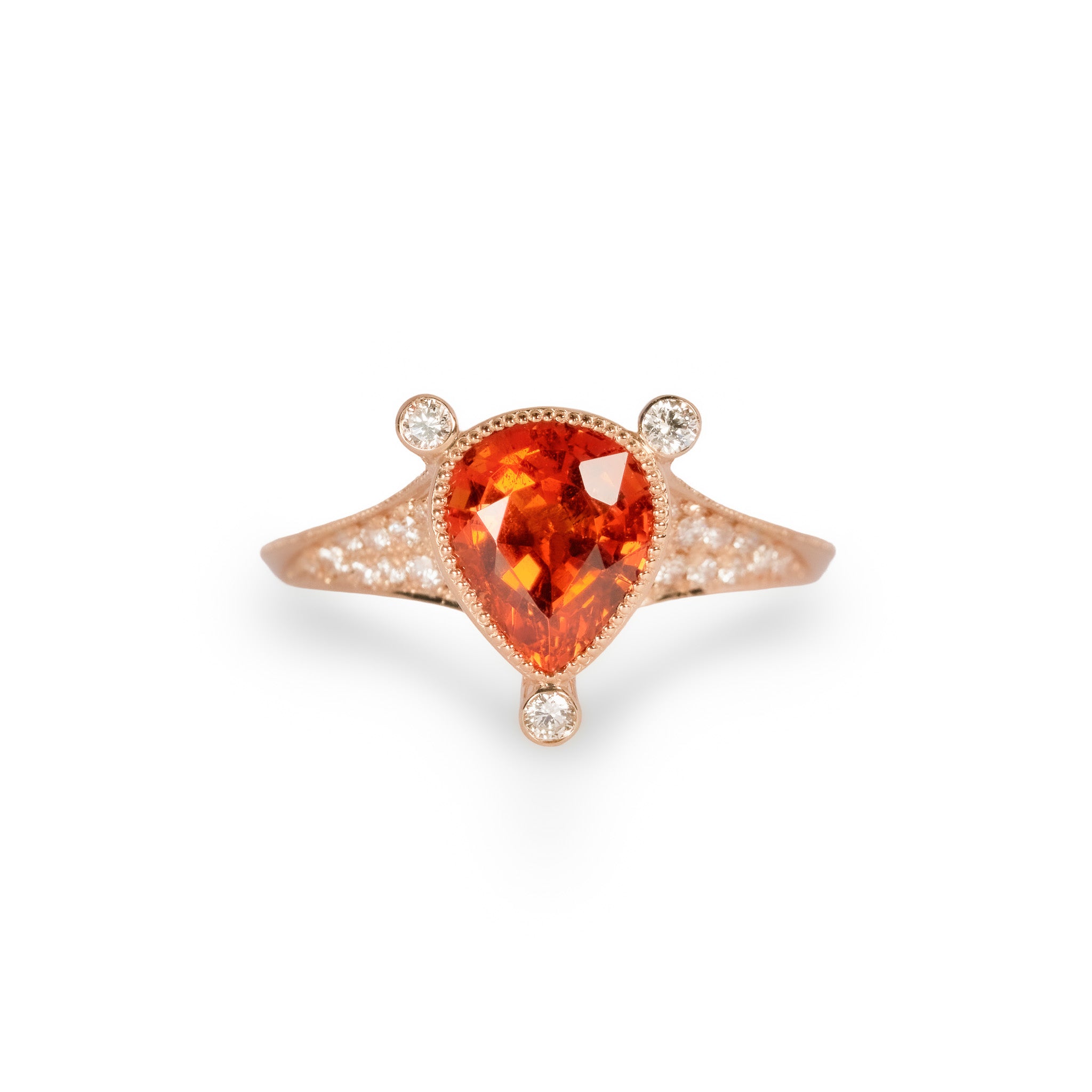 燃えるような強い煌めきを放つ、ペアシェイプのスペサルティンガーネット。
