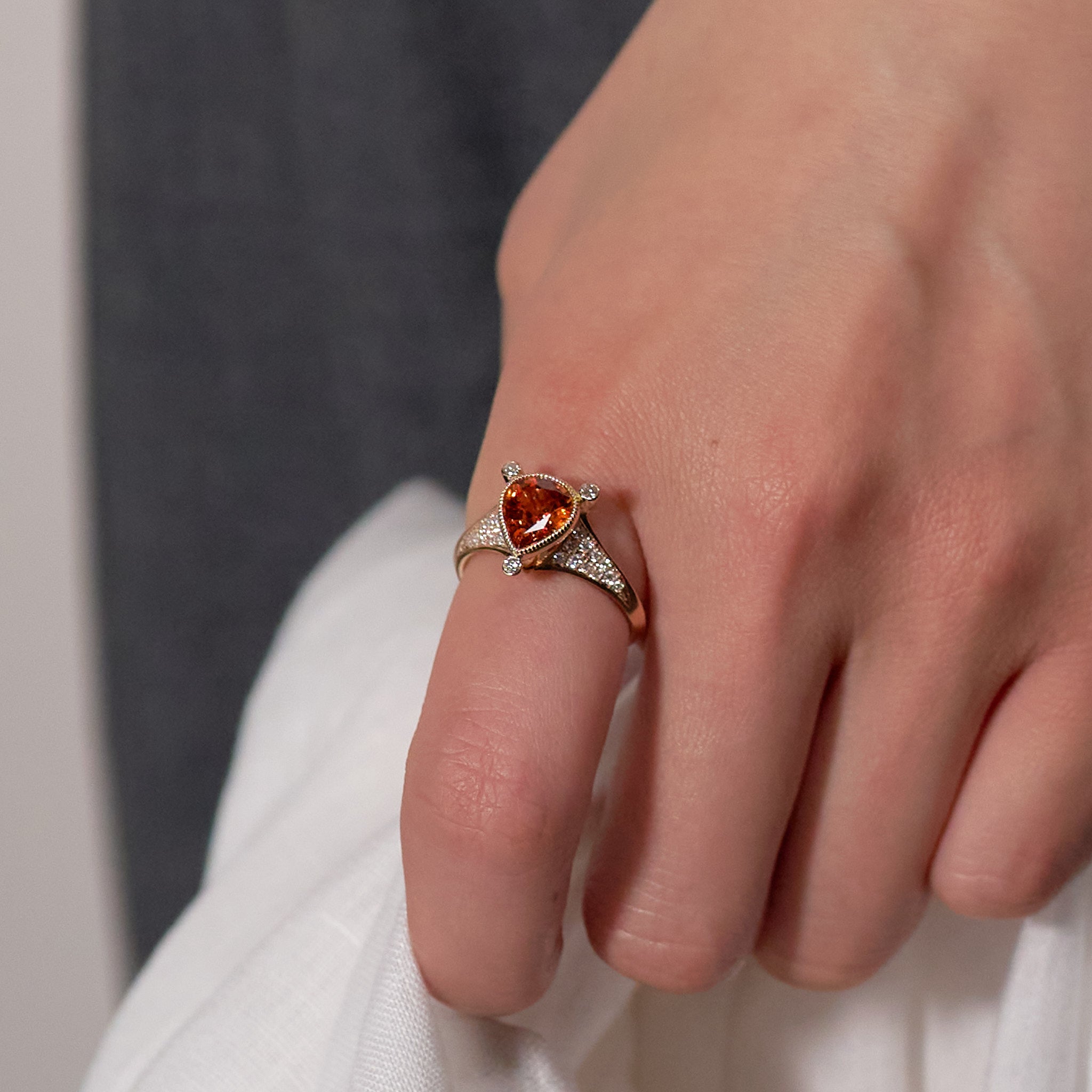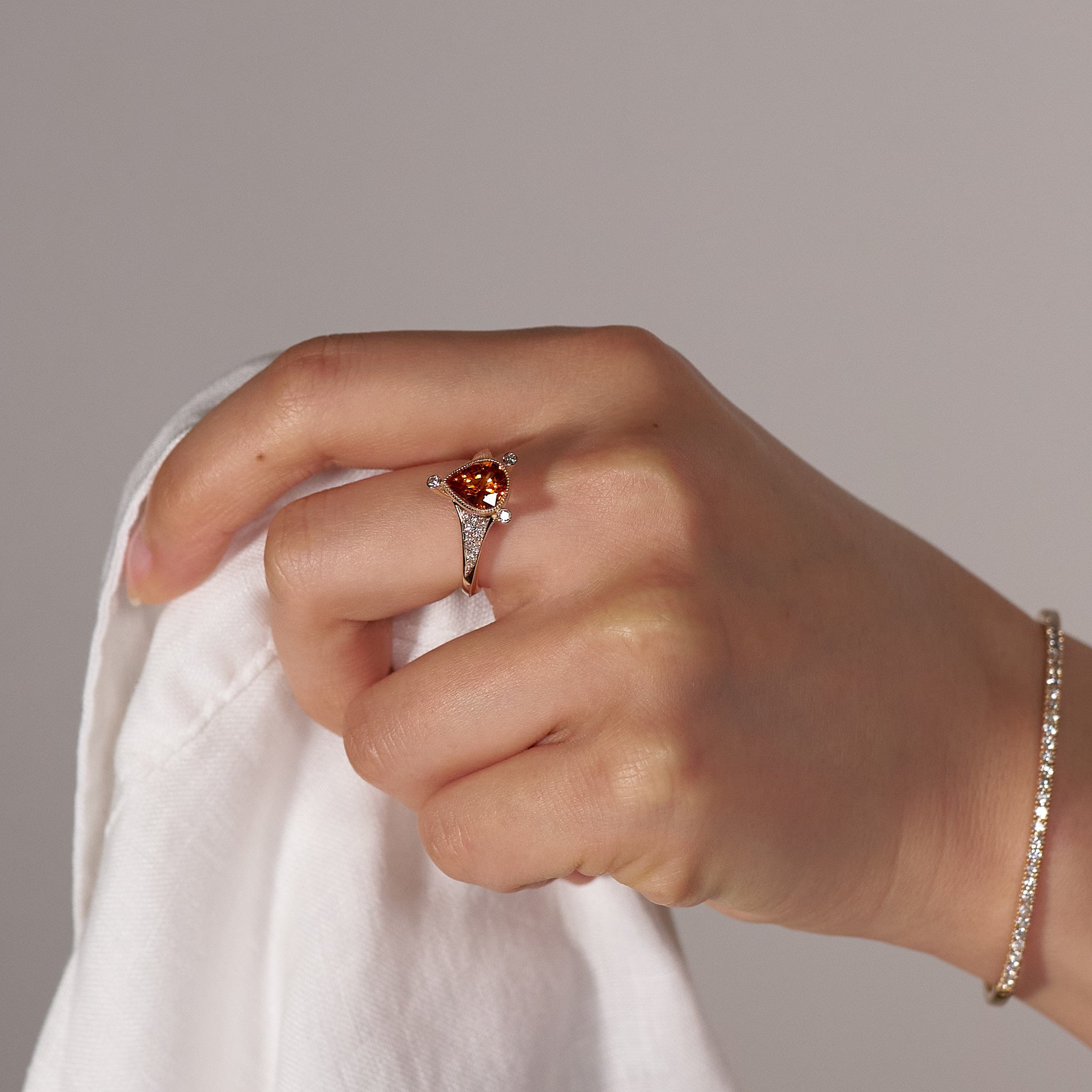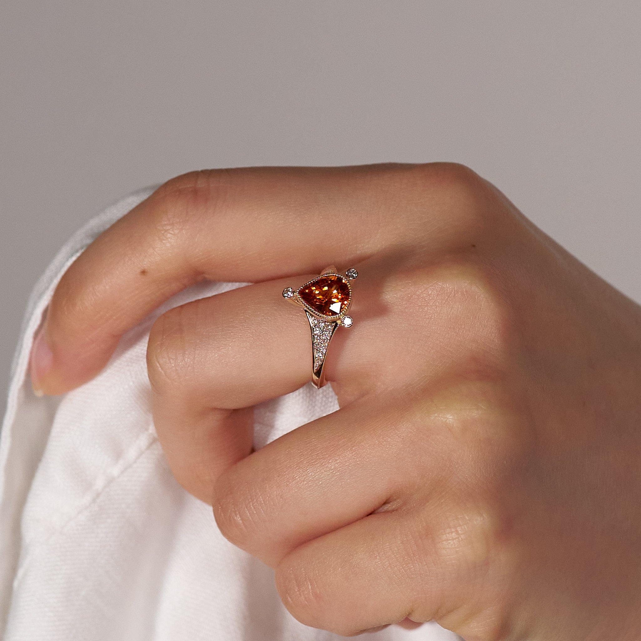 燃えるような強い煌めきを放つ、ペアシェイプのスペサルティンガーネット。