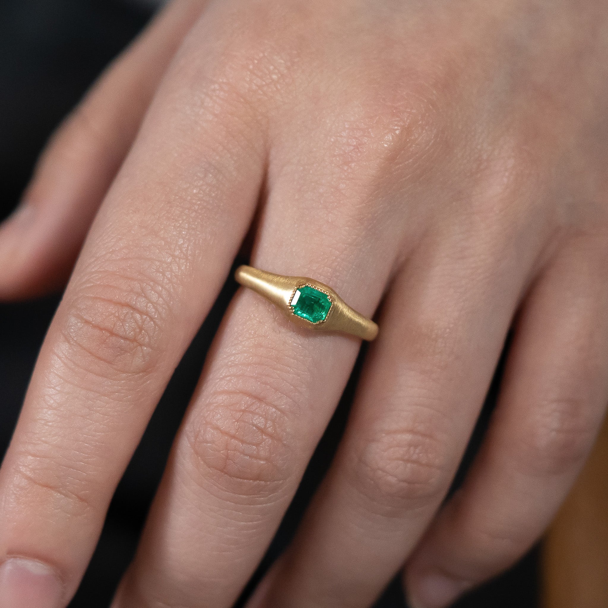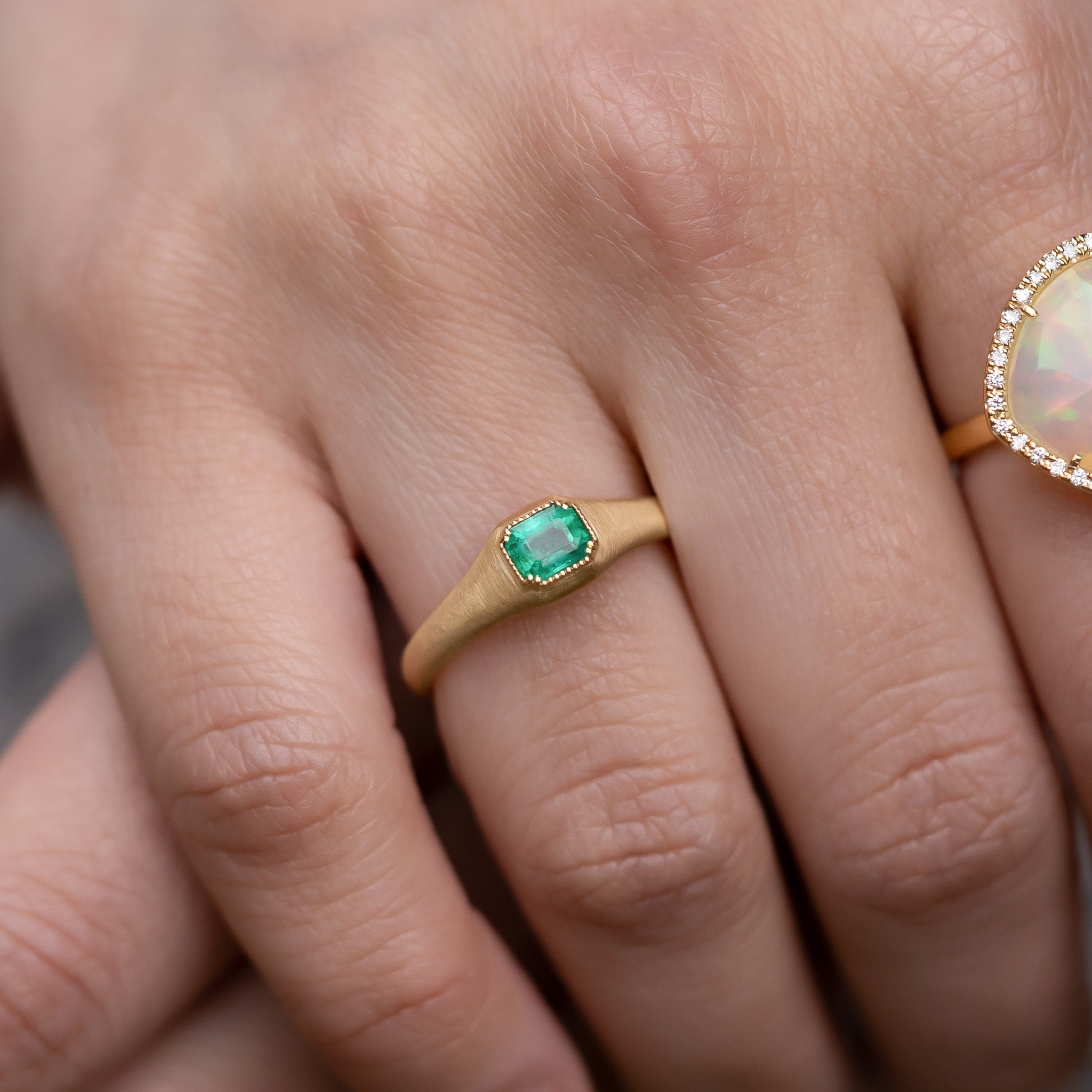 砂漠の中のオアシスをイメージしたデザイン。風に流れる砂の模様をゴールドのテクスチャーで、湧き出る水の瑞々しさをエメラルドで表現したリングです。