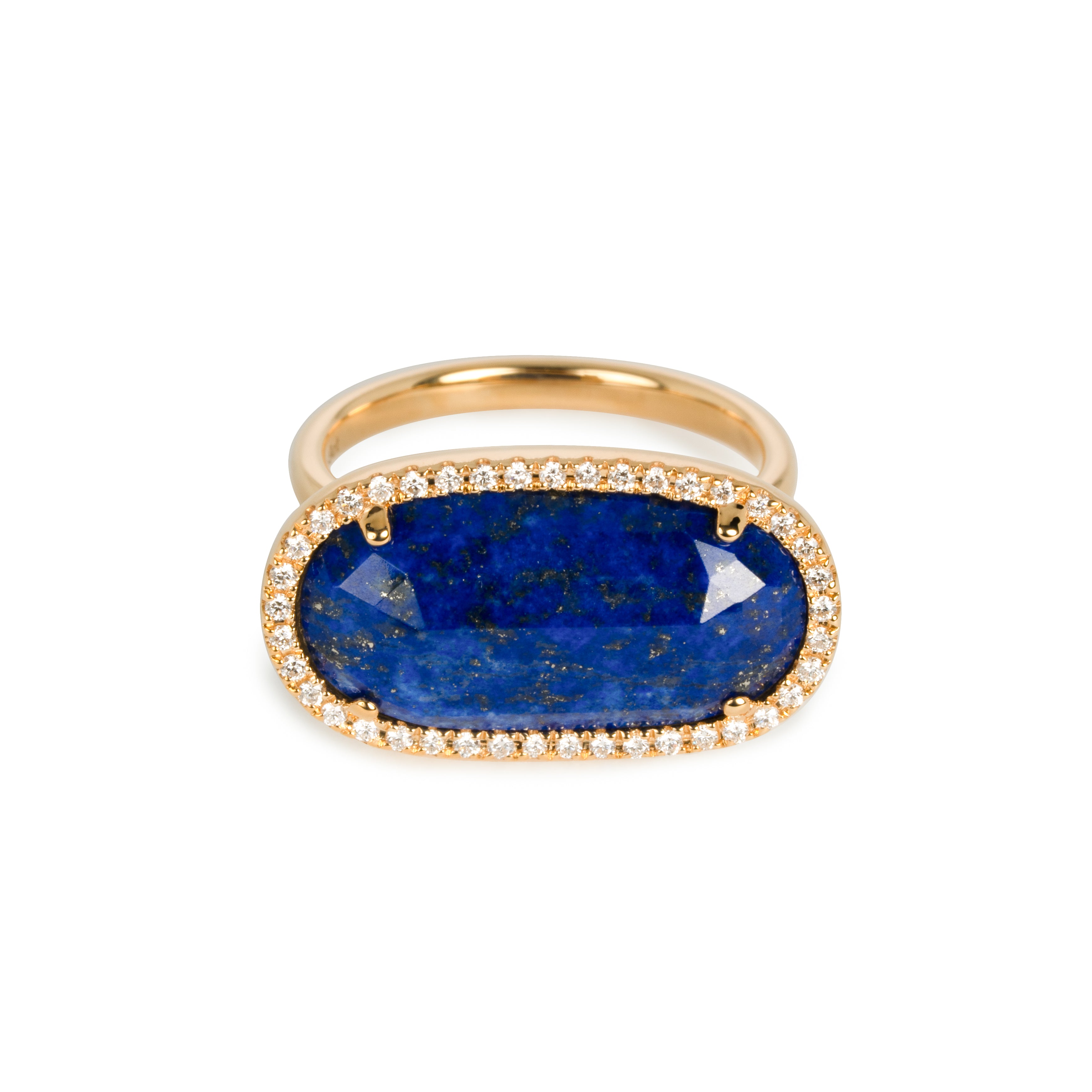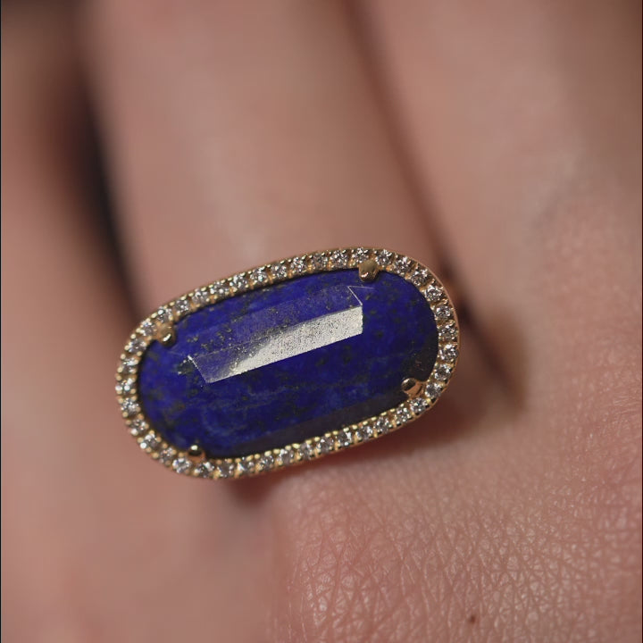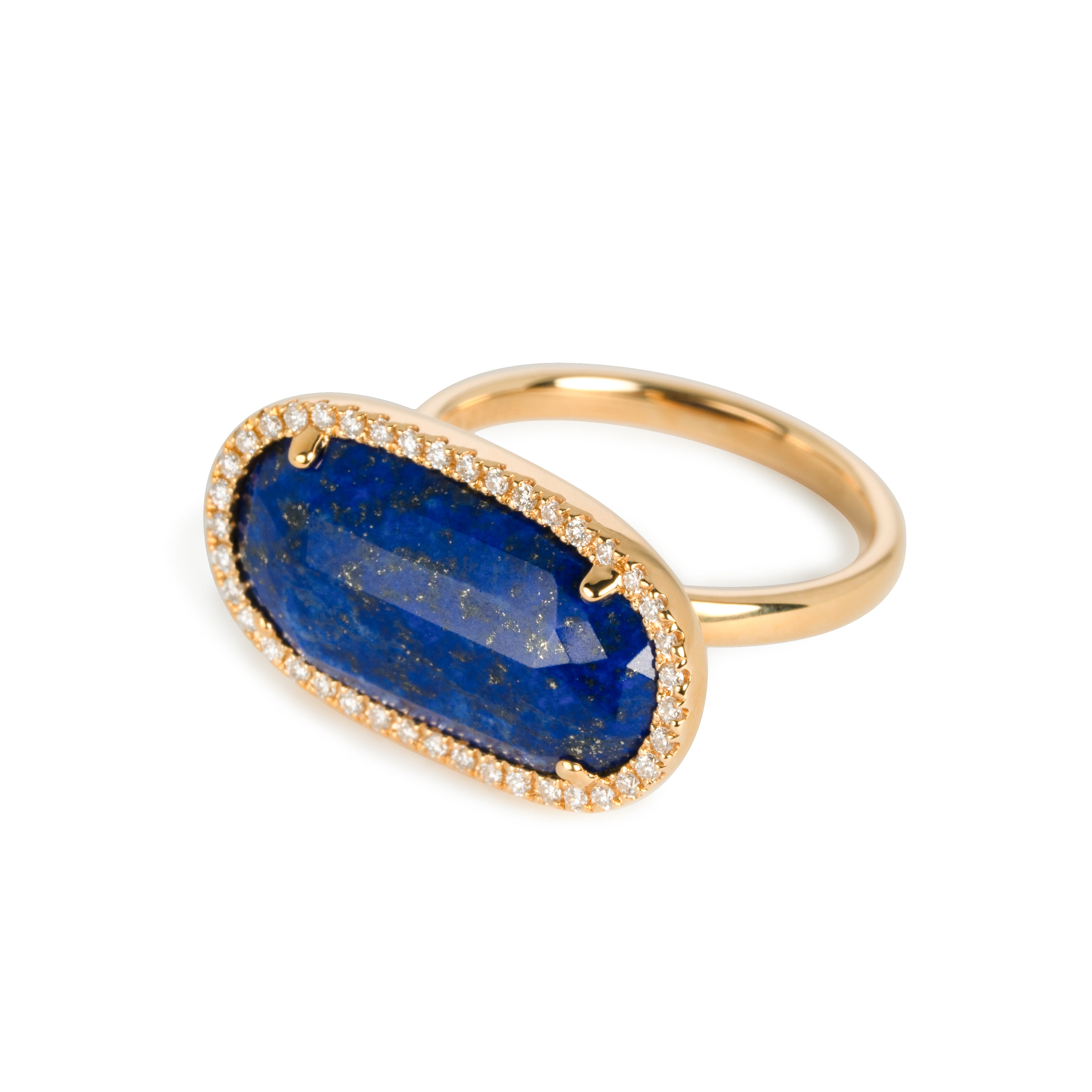 深海を思わせる深いブルーのラピスラズリと、繊細に輝くメレダイヤモンドのコントラストが美しいリングです。青の中に金色のチラチラと光るパイライトや異なる鉱物が自然の豊かさを表現しています。シンプルでいて、宝石のユニークな形が際立つデザイン。宝石の形に合わせ、一点ずつ丁寧にお作りしています。
